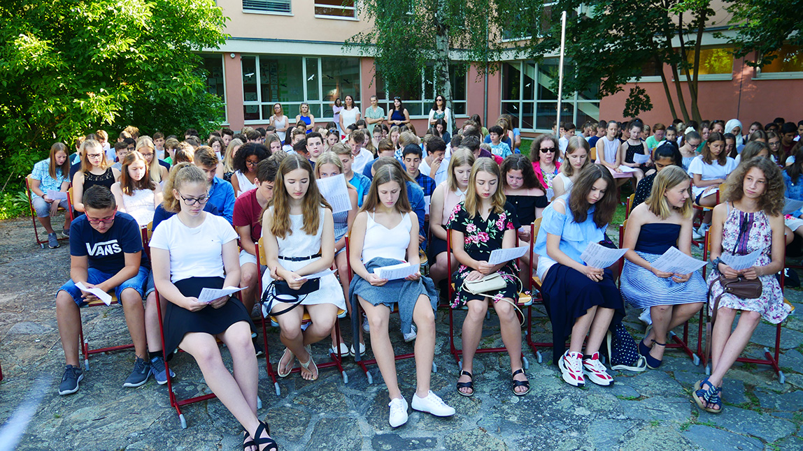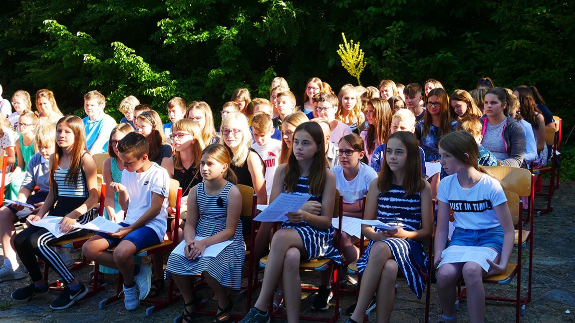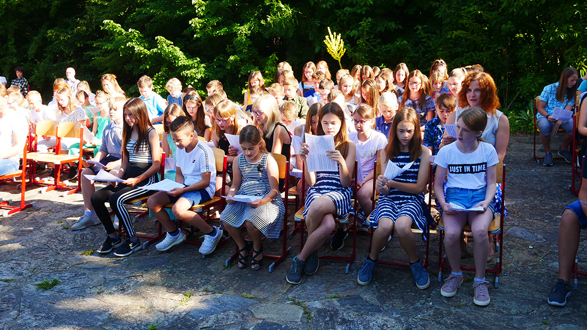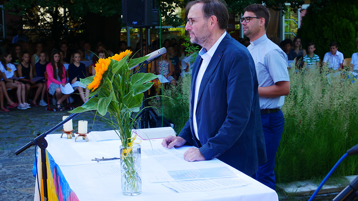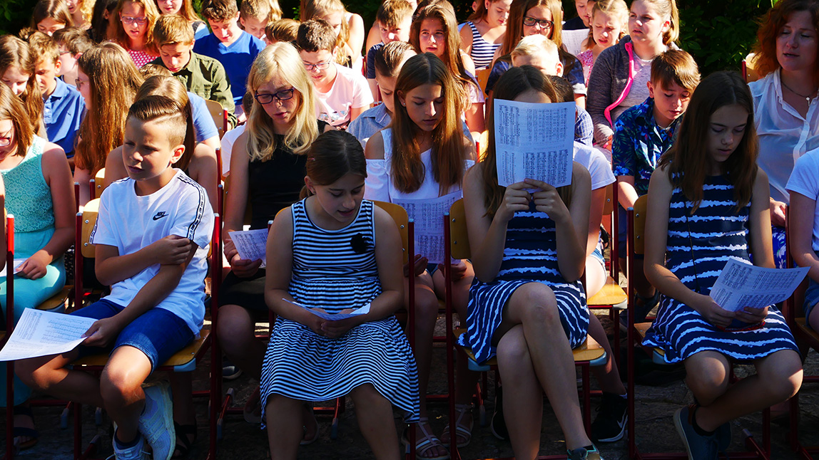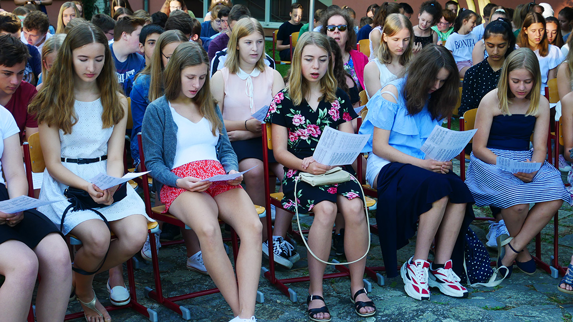 „Warum denn bauen wir nicht Brücken?“ wird in einem mit den Musiklehrerinnen gesungenen Lied der Wortgottesfeier am letzten Schultag gefragt. In den selbst verfassten Kyrierufen zeigten die Schüler und Schülerinnen Situationen auf, in denen sie sich von ihren Mitschülern abwendeten und sich Gräben zwischen ihnen bildeten. Die drei Religionslehrer und die Religionslehrerin stellten sich anschließend in ihrem „Predigtgespräch“ die Frage, was man am Tisch des Herrn wohl essen würde. Beharrte anfänglich jeder auf seiner Lieblingsspeise, so erkannten sie schließlich, dass ein gemeinsames Mahl eher nach ihrem Geschmack ist. Diesen Gedanken sollten die Schüler und Schülerinnen des BG Horn mit in die Ferien nehmen: Wenn man versucht Gemeinsamkeiten zu finden, eine Brücke zu anderen zu bauen, auch wenn diese am Anfang fremd wirken, ist es zu guter Letzt immer für alle das Beste.
