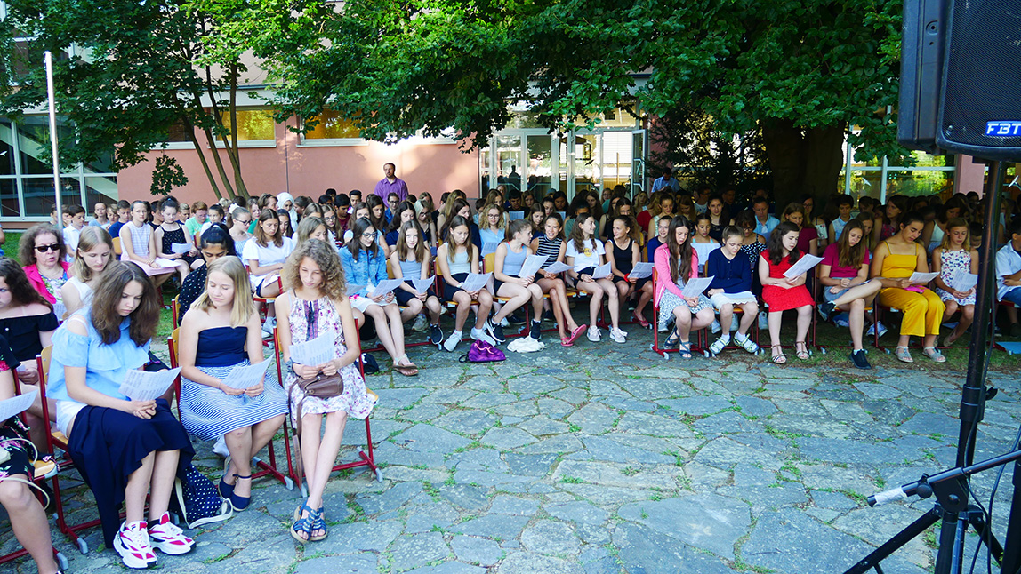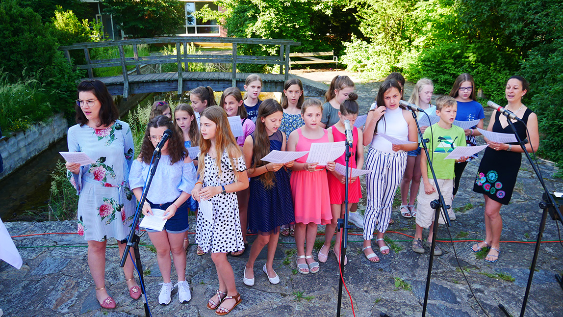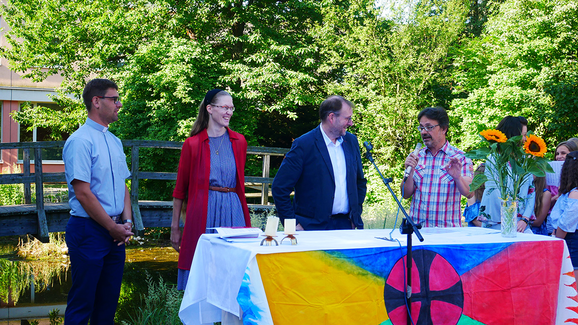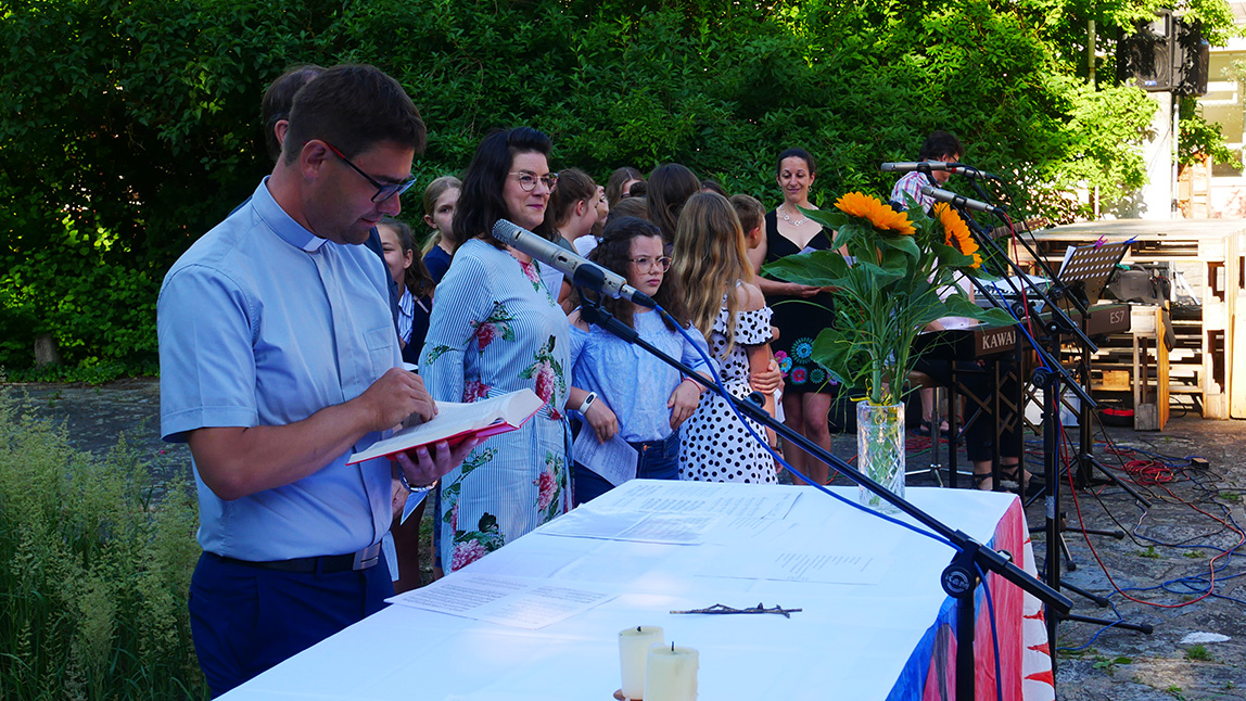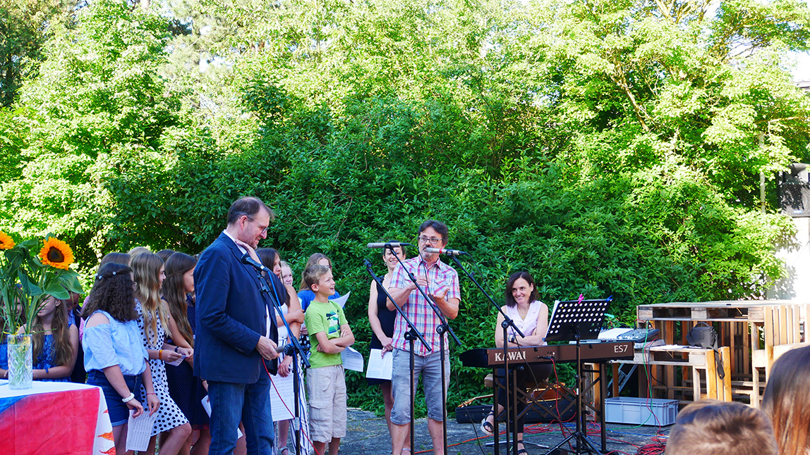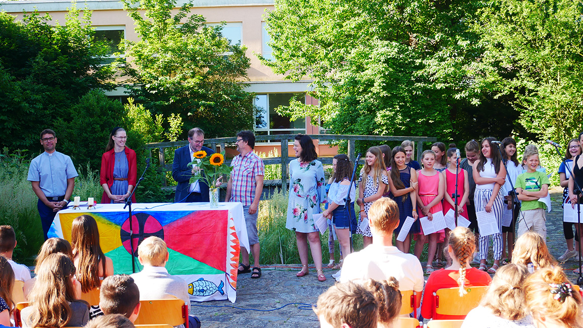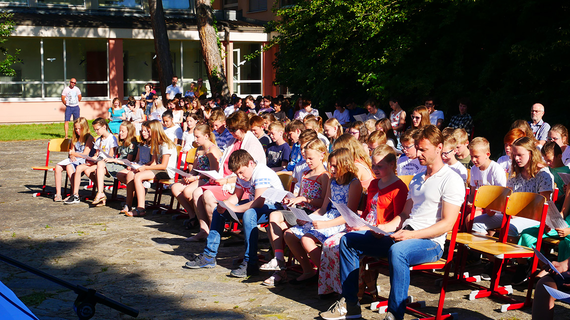 „Warum denn bauen wir nicht Brücken?“ wird in einem mit den Musiklehrerinnen gesungenen Lied der Wortgottesfeier am letzten Schultag gefragt. In den selbst verfassten Kyrierufen zeigten die Schüler und Schülerinnen Situationen auf, in denen sie sich von ihren Mitschülern abwendeten und sich Gräben zwischen ihnen bildeten. Die drei Religionslehrer und die Religionslehrerin stellten sich anschließend in ihrem „Predigtgespräch“ die Frage, was man am Tisch des Herrn wohl essen würde. Beharrte anfänglich jeder auf seiner Lieblingsspeise, so erkannten sie schließlich, dass ein gemeinsames Mahl eher nach ihrem Geschmack ist. Diesen Gedanken sollten die Schüler und Schülerinnen des BG Horn mit in die Ferien nehmen: Wenn man versucht Gemeinsamkeiten zu finden, eine Brücke zu anderen zu bauen, auch wenn diese am Anfang fremd wirken, ist es zu guter Letzt immer für alle das Beste.