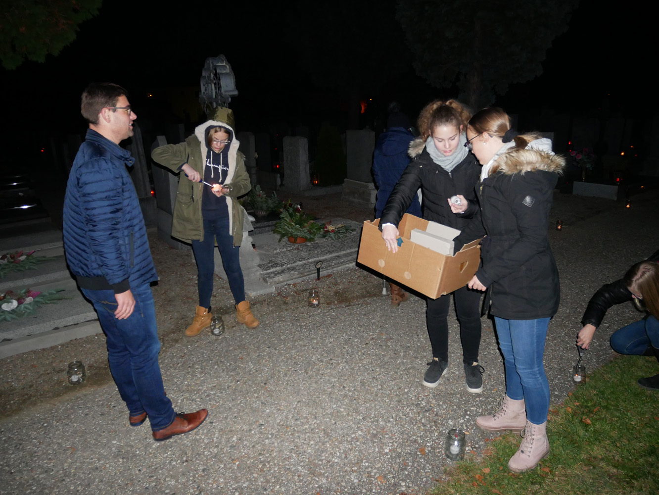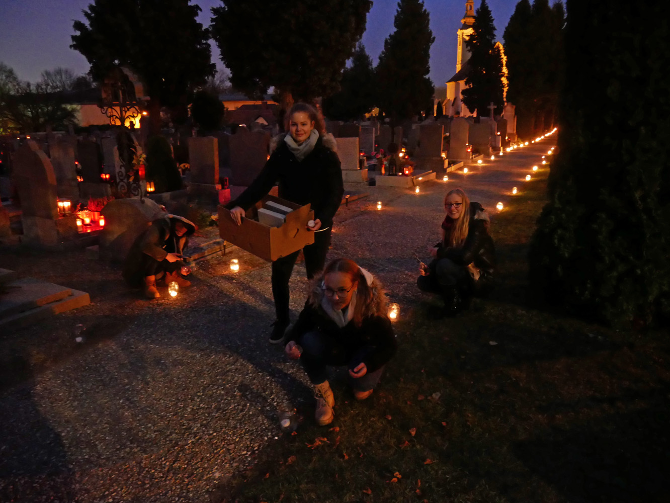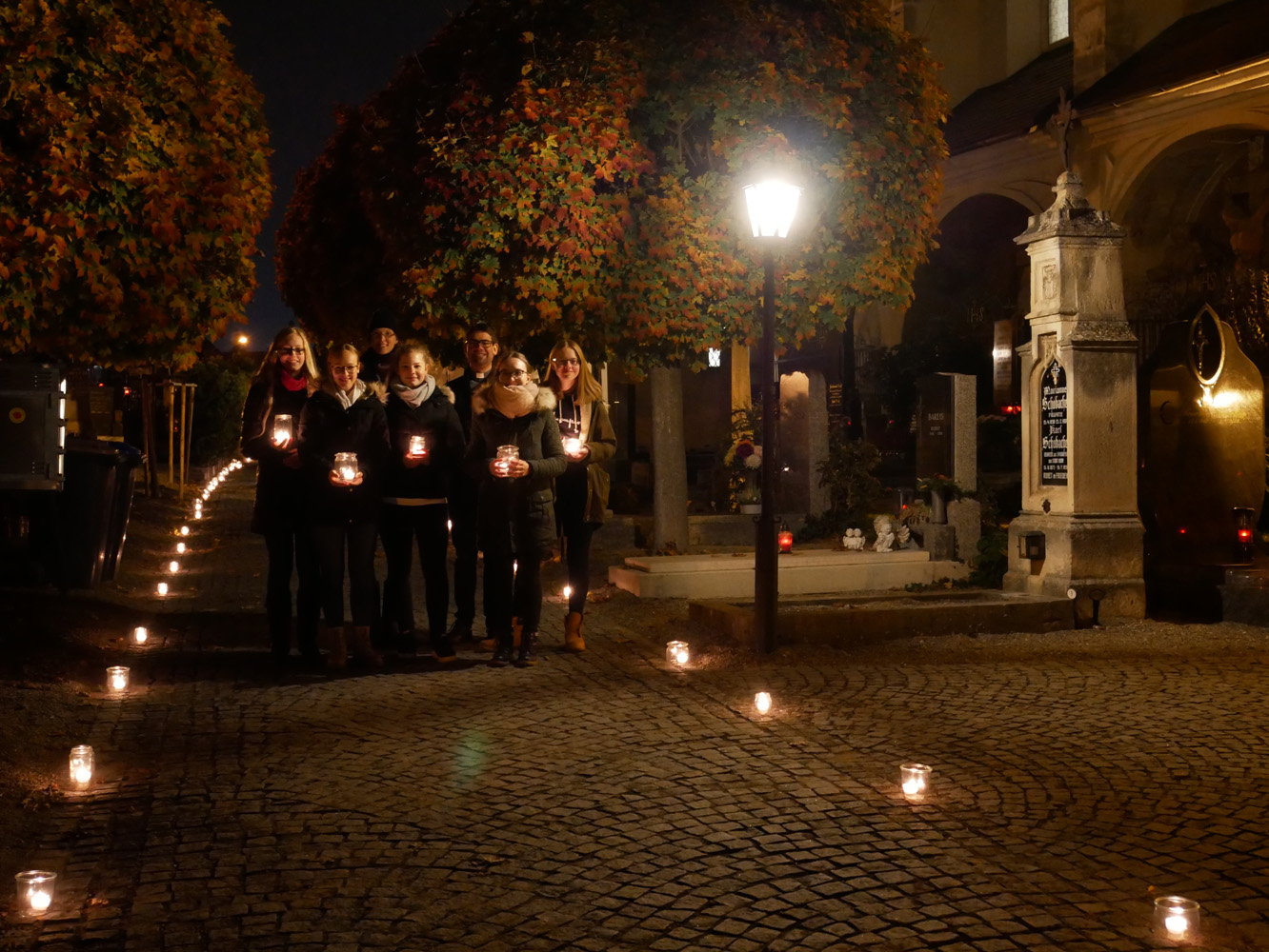 Auch Schülerinnen und Schüler des Gymnasiums waren dabei. Anabel Sprung, Angelina Groiß, Elena Halbrainer, Anna-Sophie Kalab und Sarah Ranftl (5A) bereiteten mit ihren Religionslehrern, Christian Jordan, Pater Clemens Hainzl und Manuela Kopper, eine Station auf dem Friedhof der Stefanskirche in Horn vor. Auch Valentin (2C) und Matthias Perneder (4B) halfen beim Aufbau. In der Leichenhalle stellten sie ein Labyrinth aus hunderten Lichtern auf und luden die Besucher ein, dieses zu durchwandern und dabei über ihr eigenes Leben nachzudenken. Zur weiteren Besinnung lasen die Jugendlichen zu leiser Musik Meditationsgedanken vor, die sie vorher im Religionsunterricht formuliert hatten. So konnte man zum Beispiel darüber sinnieren: „Ein Labyrinth hat immer eine Mitte, die das große Ziel im Leben darstellt. Was ist für Sie dieses große Ziel?“ oder „Sich auf den Weg machen ist etwas anderes, als über den Weg nachzudenken. Warum sind Sie heute hier auf den Friedhof gekommen?“