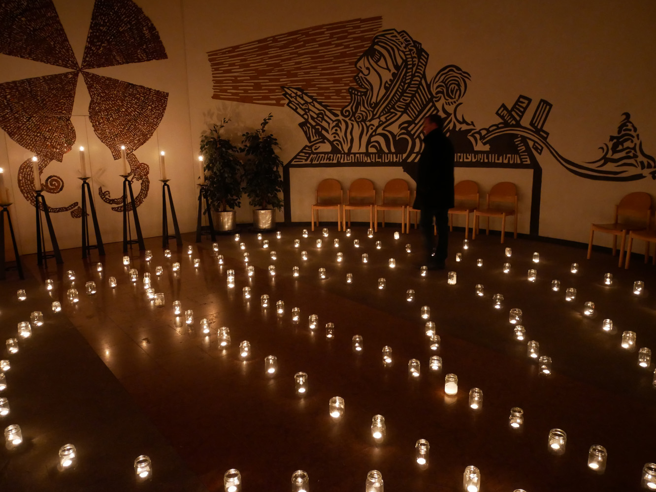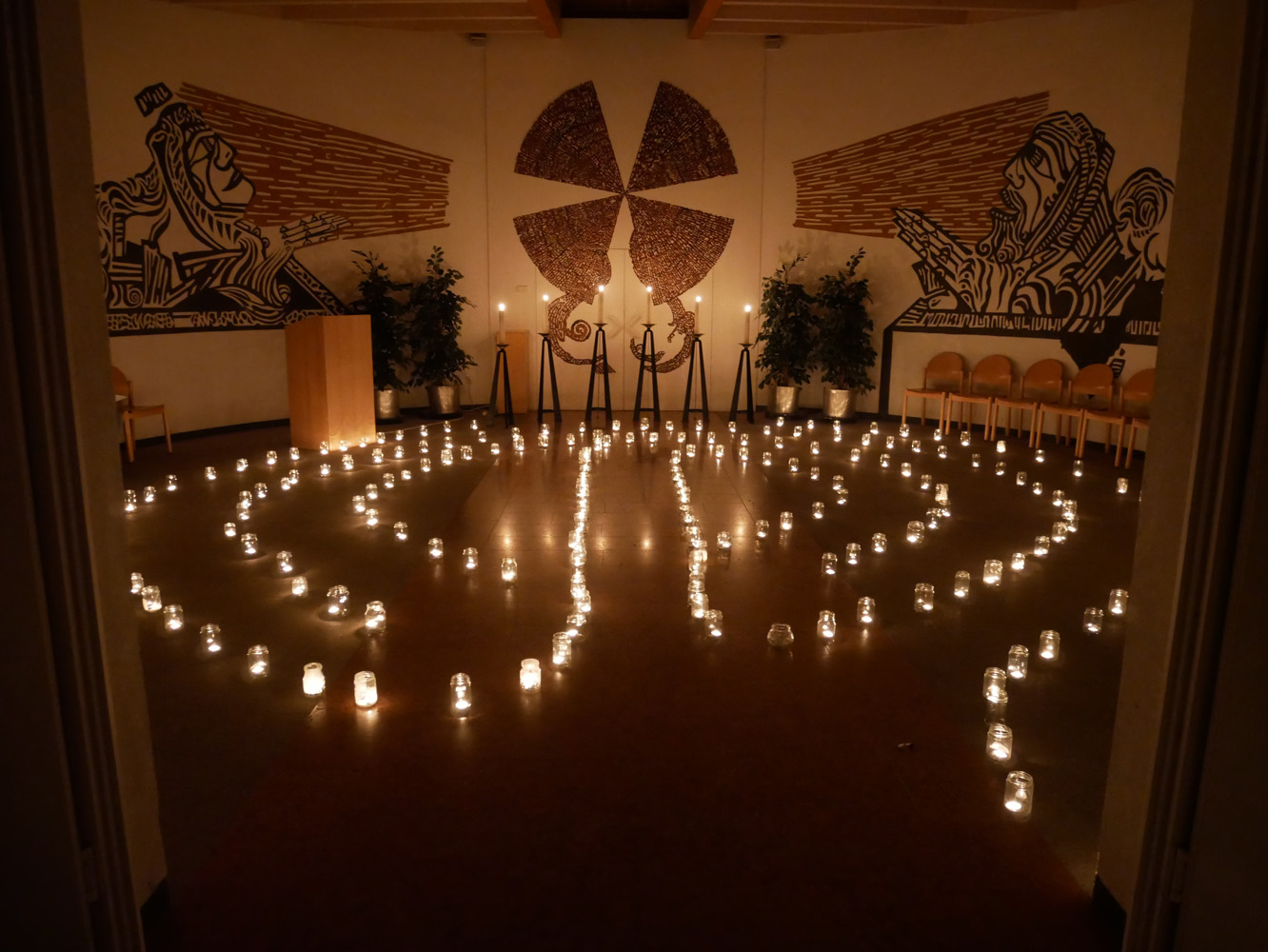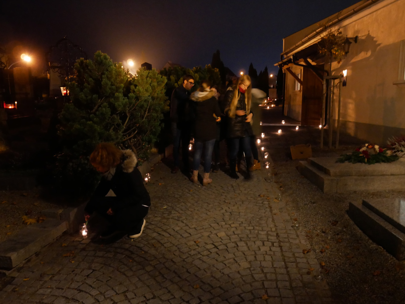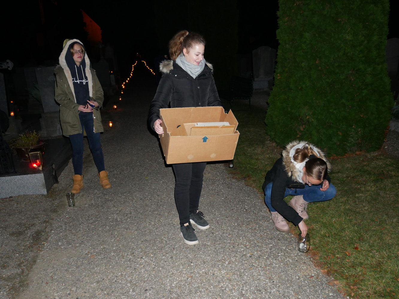 Auch Schülerinnen und Schüler des Gymnasiums waren dabei. Anabel Sprung, Angelina Groiß, Elena Halbrainer, Anna-Sophie Kalab und Sarah Ranftl (5A) bereiteten mit ihren Religionslehrern, Christian Jordan, Pater Clemens Hainzl und Manuela Kopper, eine Station auf dem Friedhof der Stefanskirche in Horn vor. Auch Valentin (2C) und Matthias Perneder (4B) halfen beim Aufbau. In der Leichenhalle stellten sie ein Labyrinth aus hunderten Lichtern auf und luden die Besucher ein, dieses zu durchwandern und dabei über ihr eigenes Leben nachzudenken. Zur weiteren Besinnung lasen die Jugendlichen zu leiser Musik Meditationsgedanken vor, die sie vorher im Religionsunterricht formuliert hatten. So konnte man zum Beispiel darüber sinnieren: „Ein Labyrinth hat immer eine Mitte, die das große Ziel im Leben darstellt. Was ist für Sie dieses große Ziel?“ oder „Sich auf den Weg machen ist etwas anderes, als über den Weg nachzudenken. Warum sind Sie heute hier auf den Friedhof gekommen?“