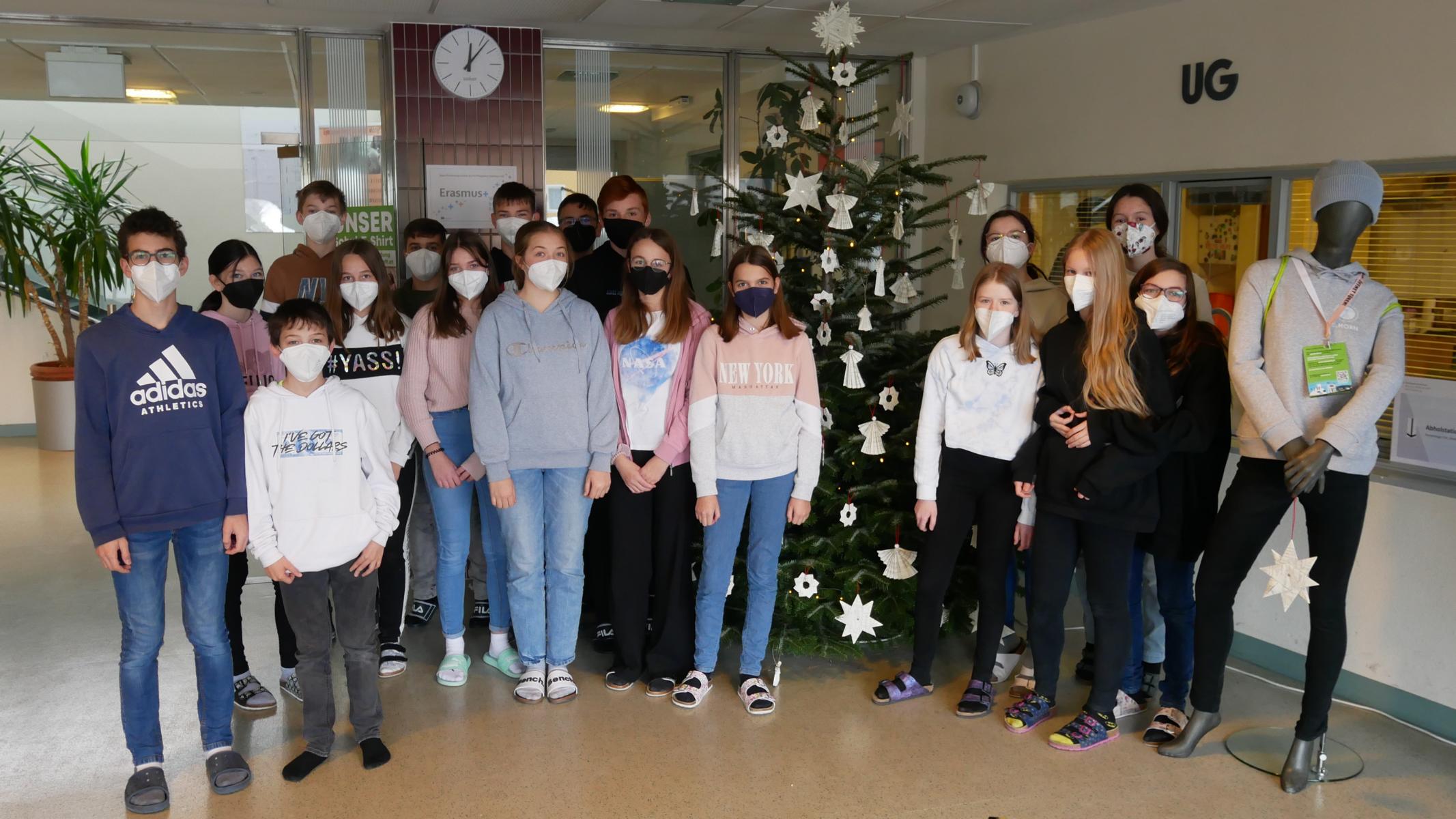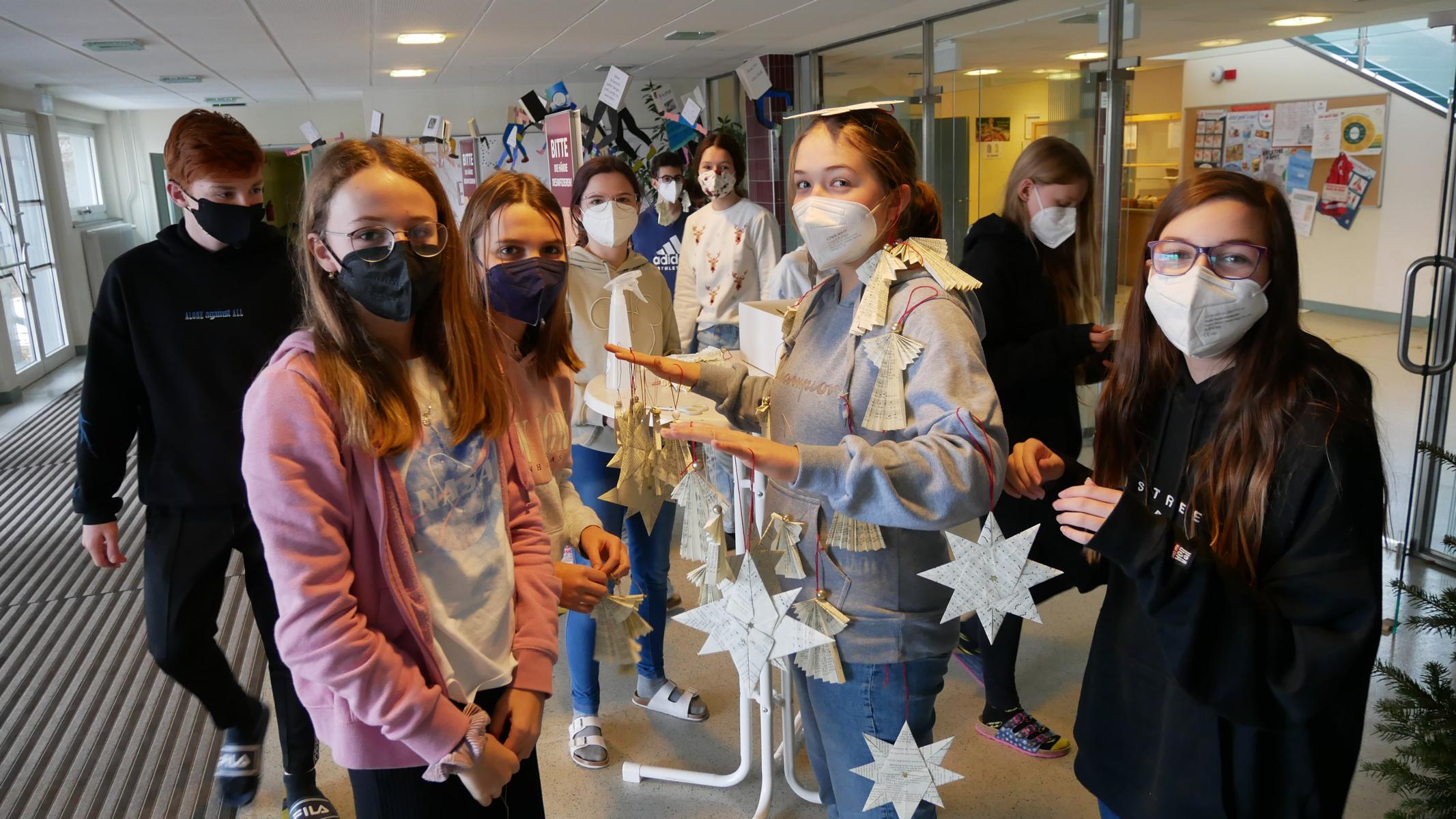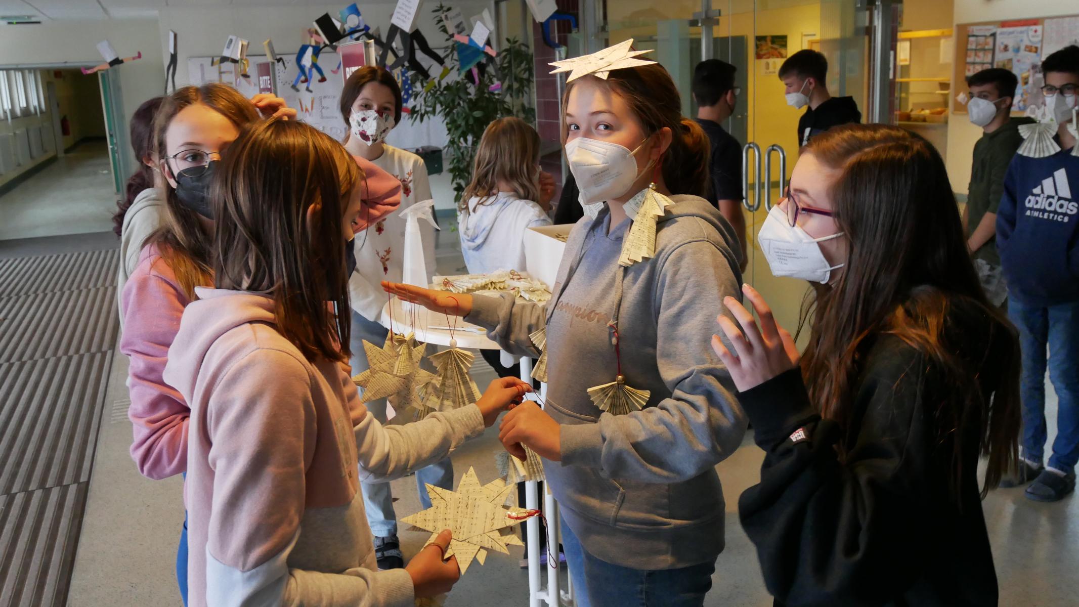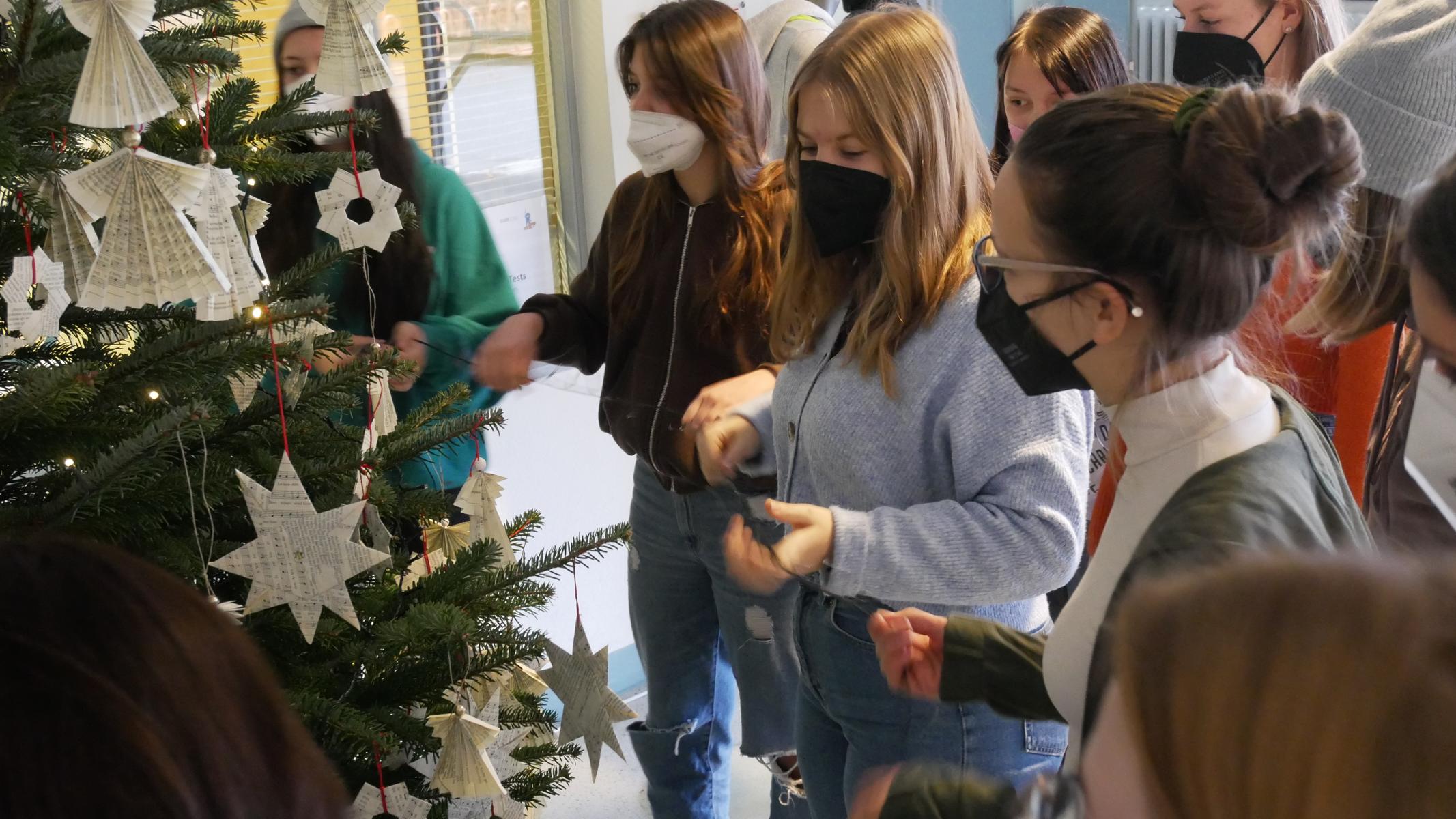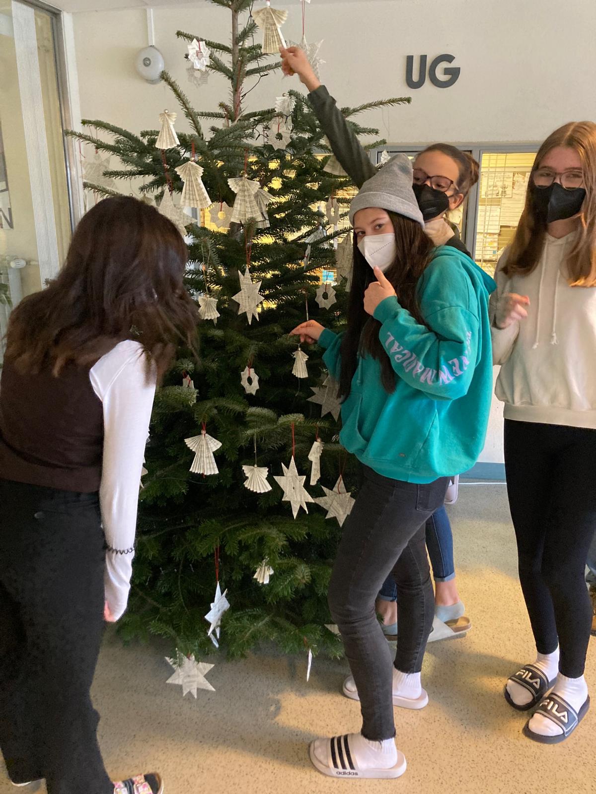 Die Religionslehrer*innen bastelten mit ihren Unterstufenklassen Sterne und Engel aus Seiten des alten Gotteslobes. So hat das alte Kirchengesangbuch noch eine Verwendung gefunden und die Jugendlichen hatten große Freude beim Basteln und auch beim Schmücken des Christbaums in der Eingangshalle des Gymnasiums.