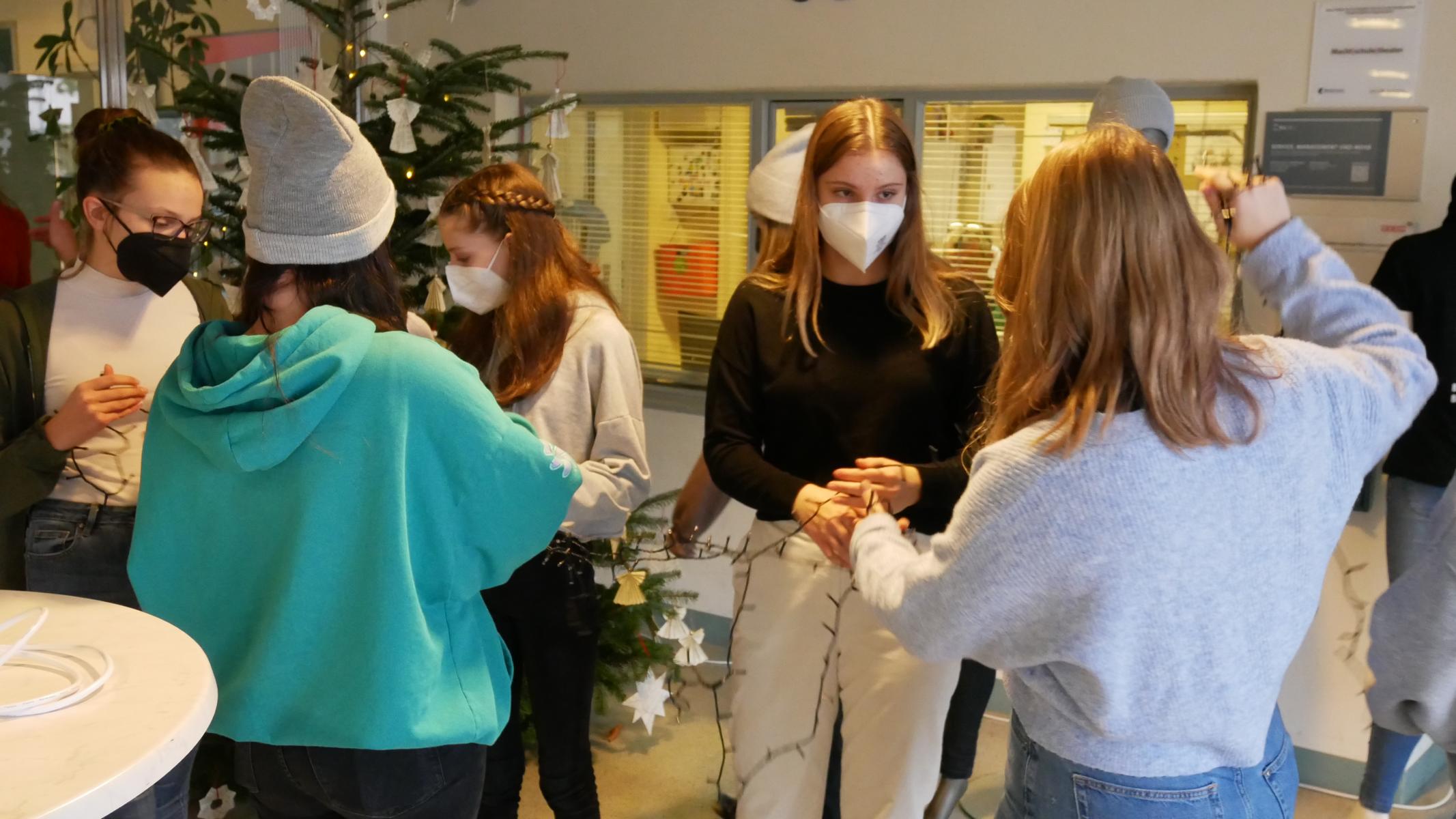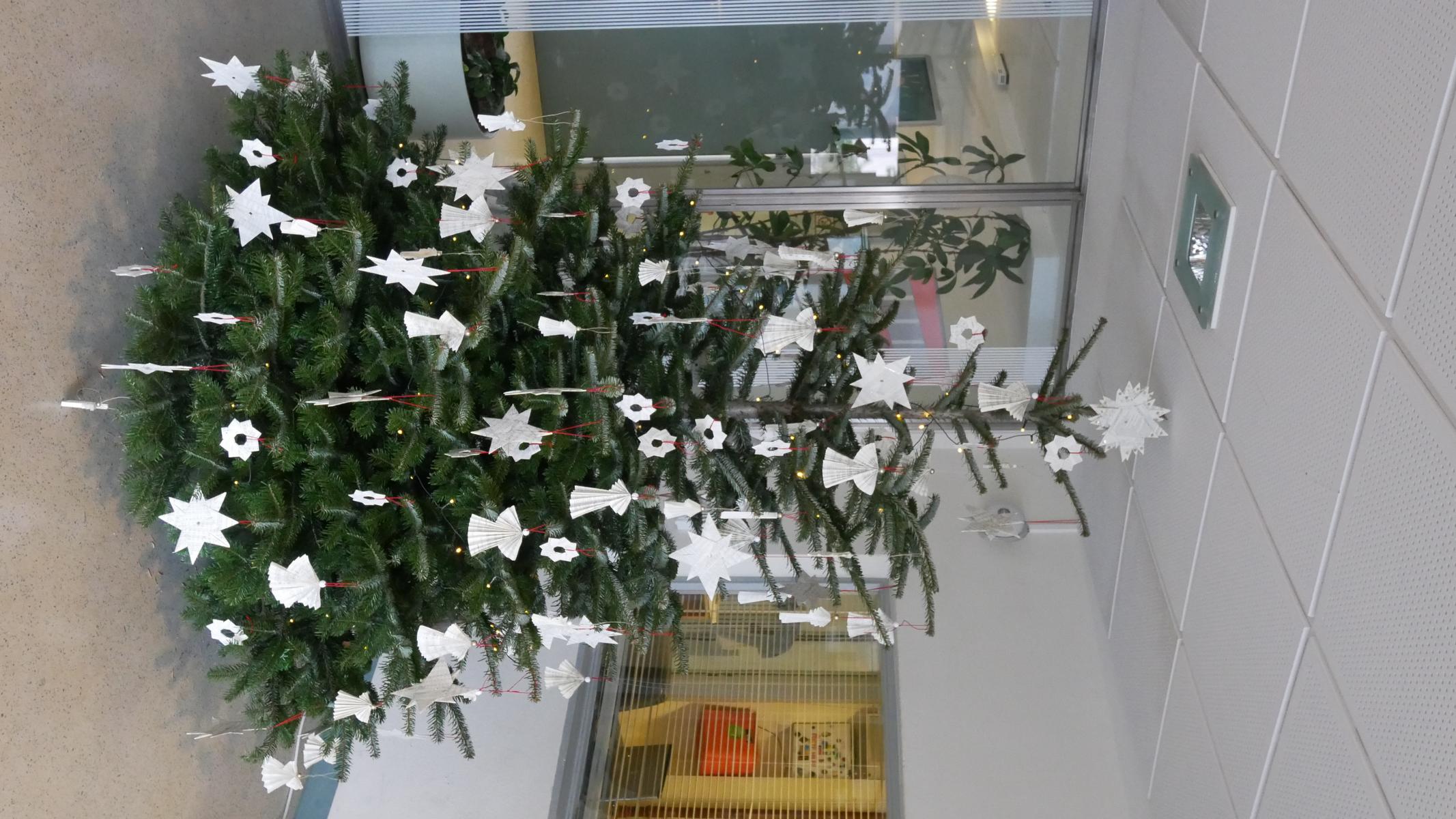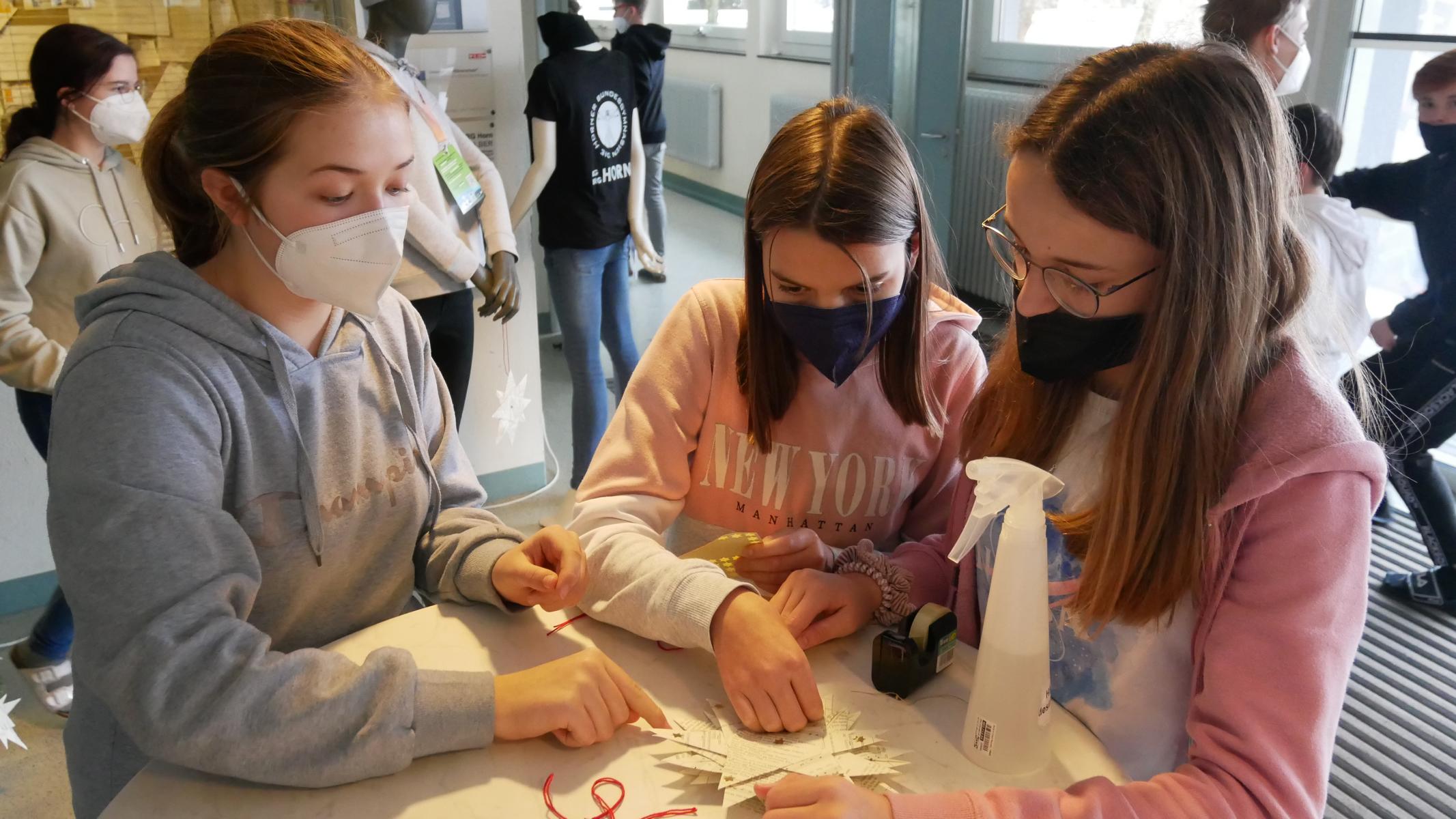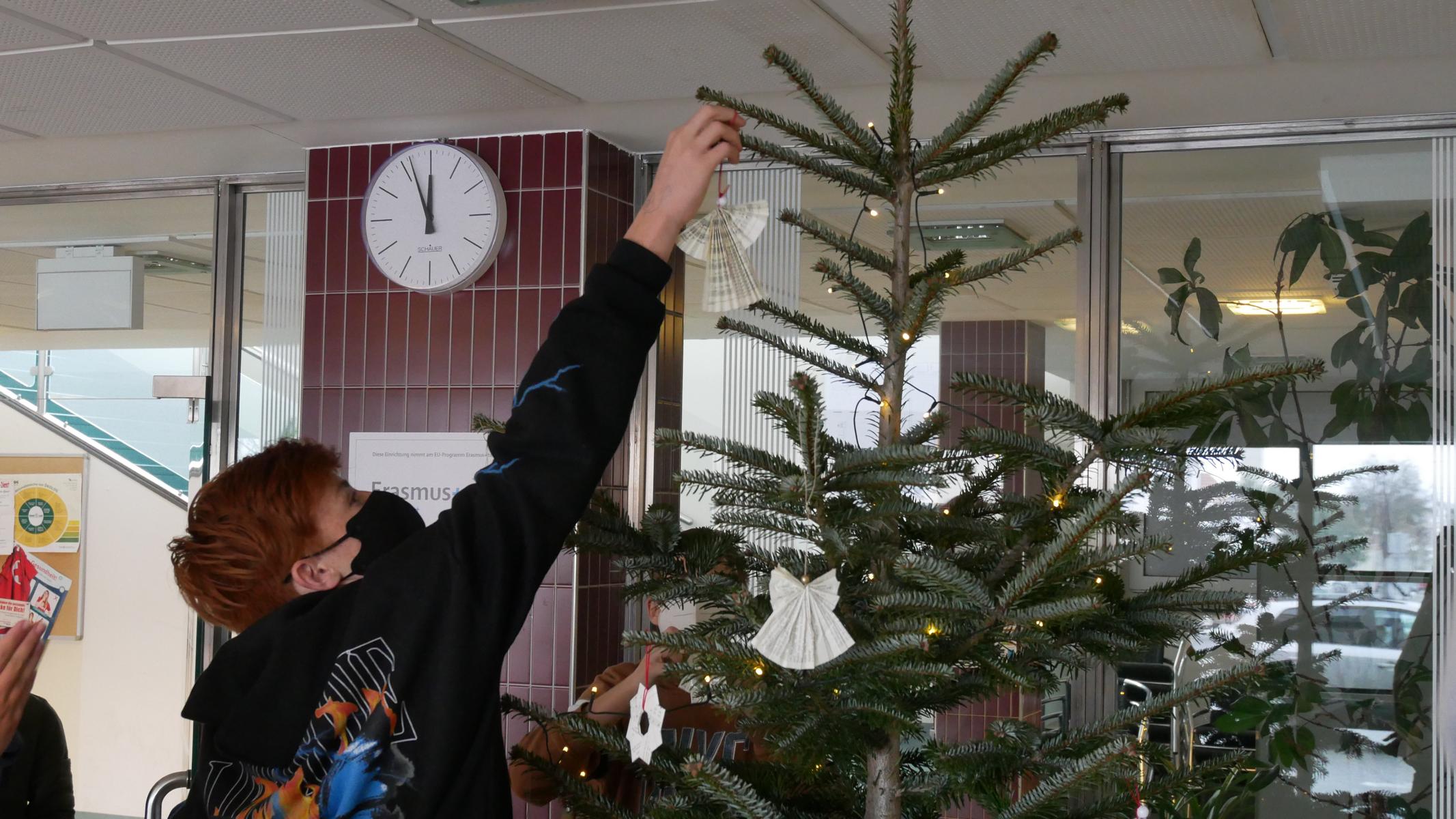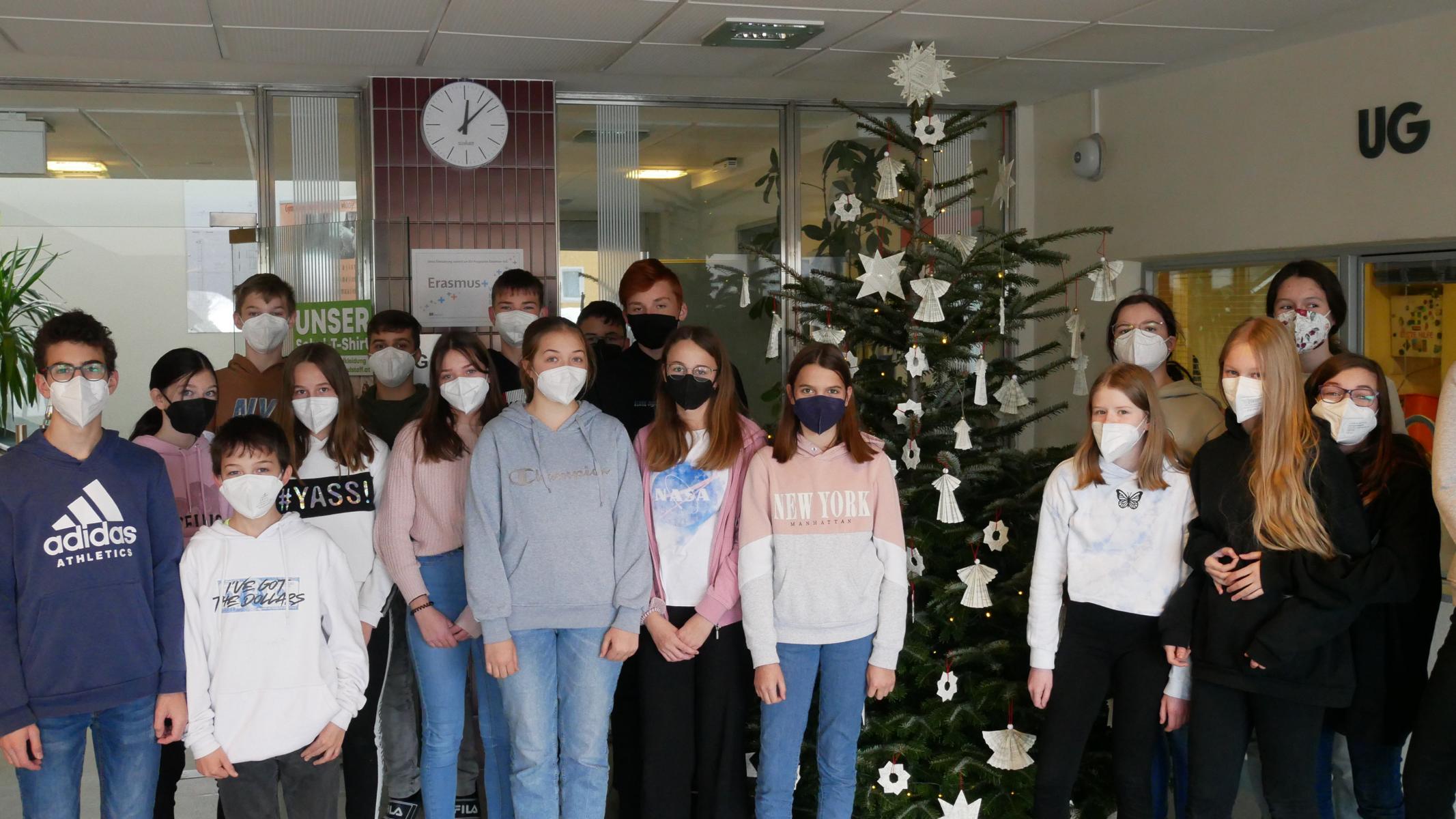 Die Religionslehrer*innen bastelten mit ihren Unterstufenklassen Sterne und Engel aus Seiten des alten Gotteslobes. So hat das alte Kirchengesangbuch noch eine Verwendung gefunden und die Jugendlichen hatten große Freude beim Basteln und auch beim Schmücken des Christbaums in der Eingangshalle des Gymnasiums.