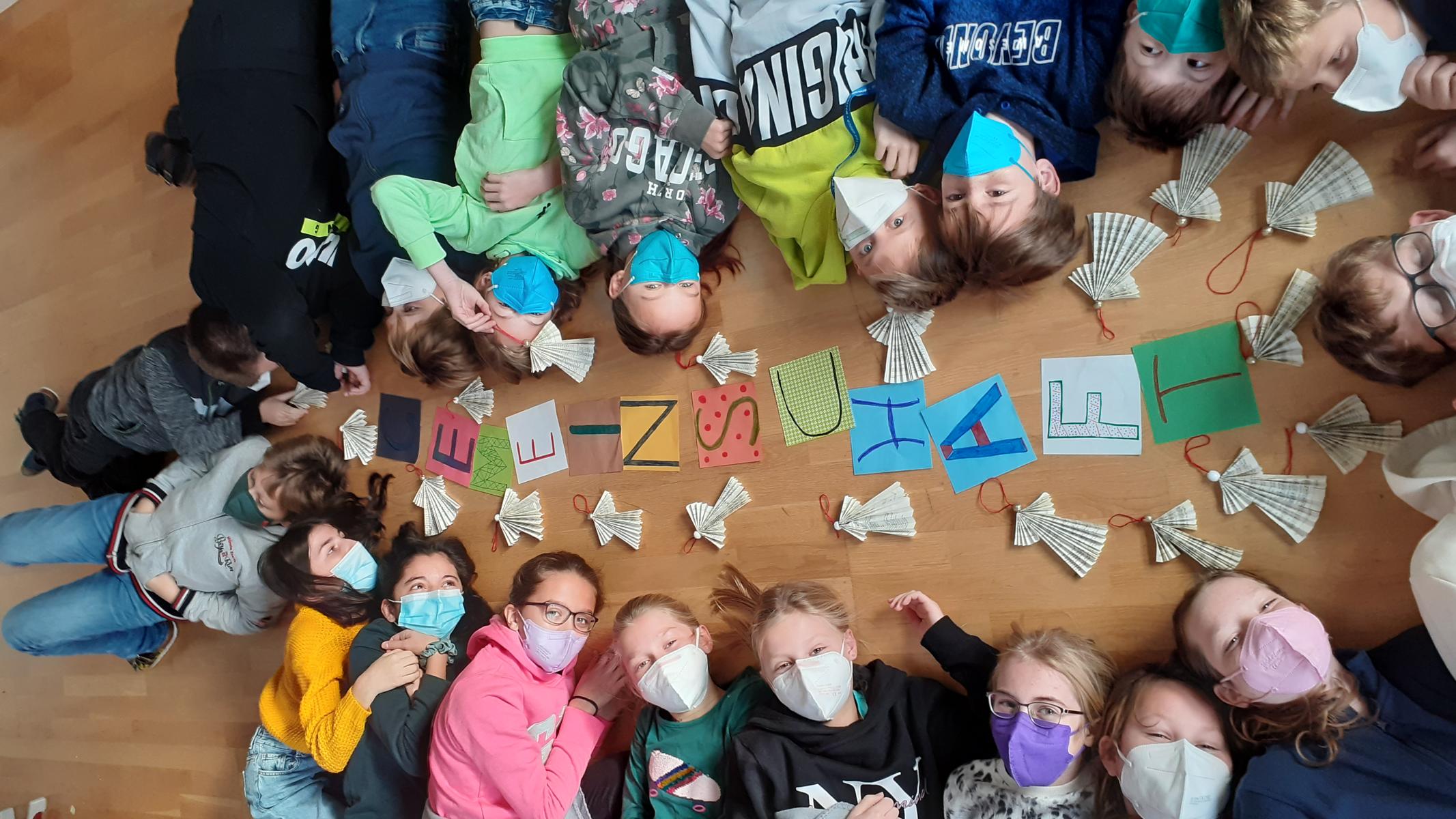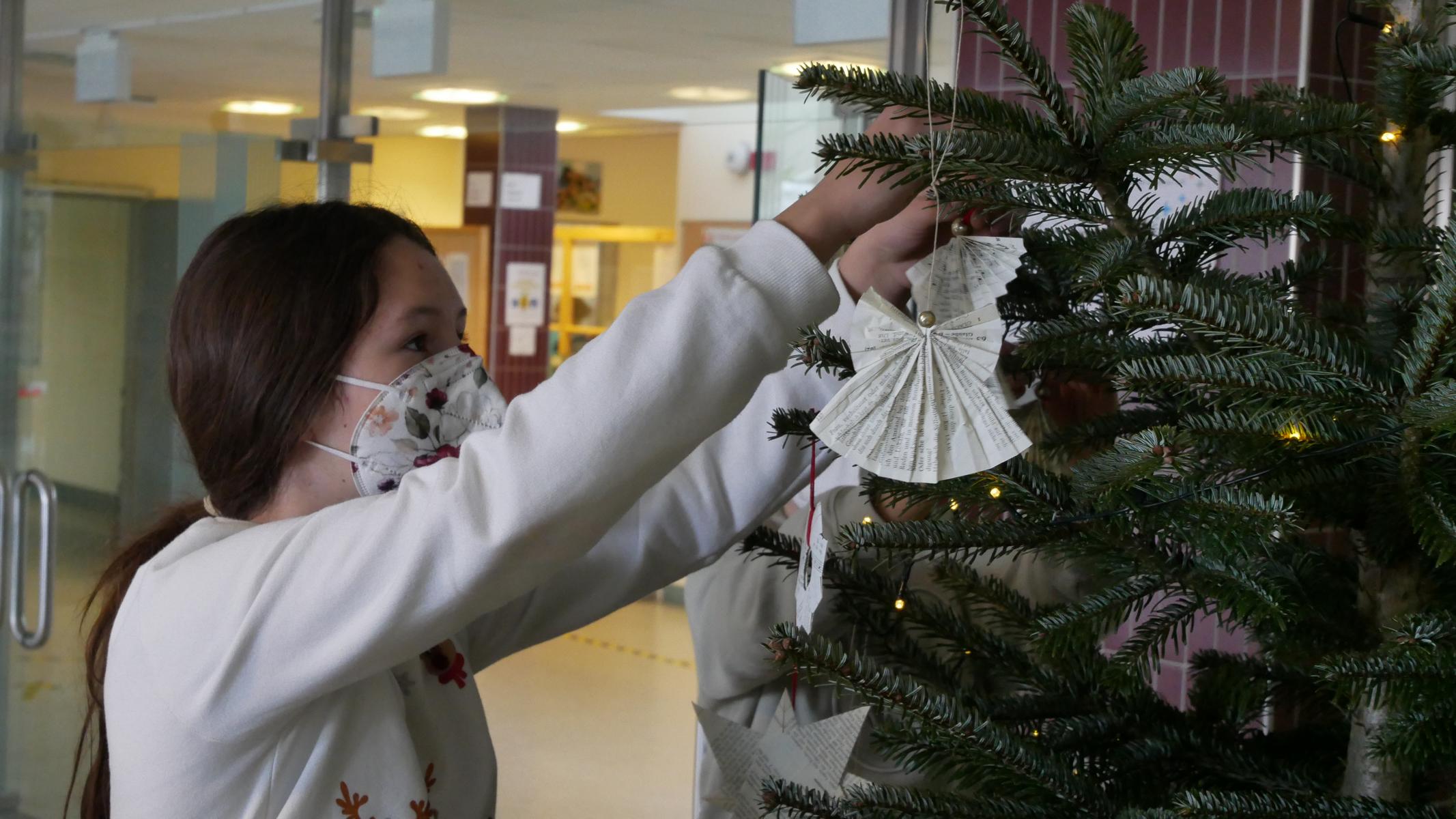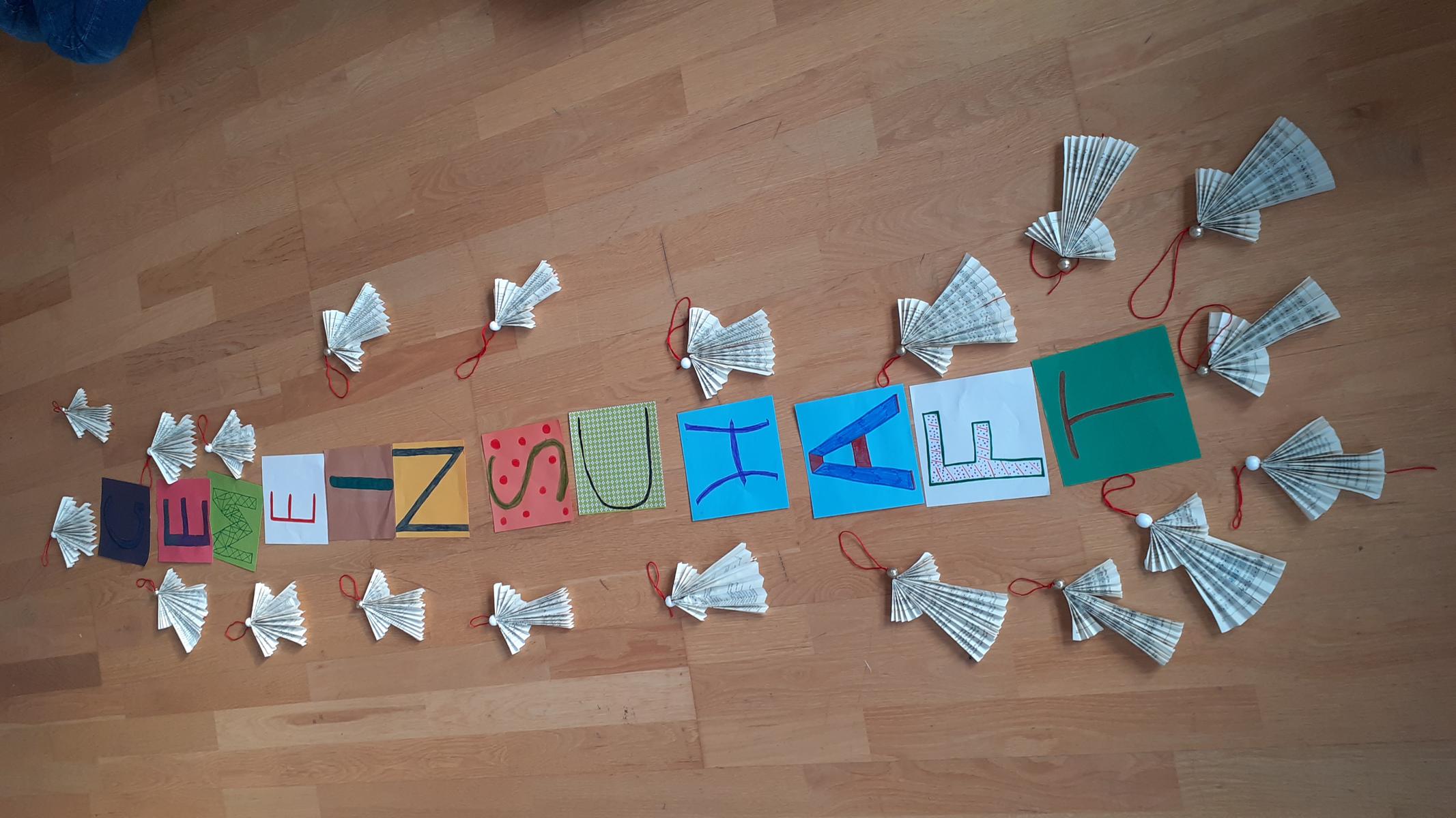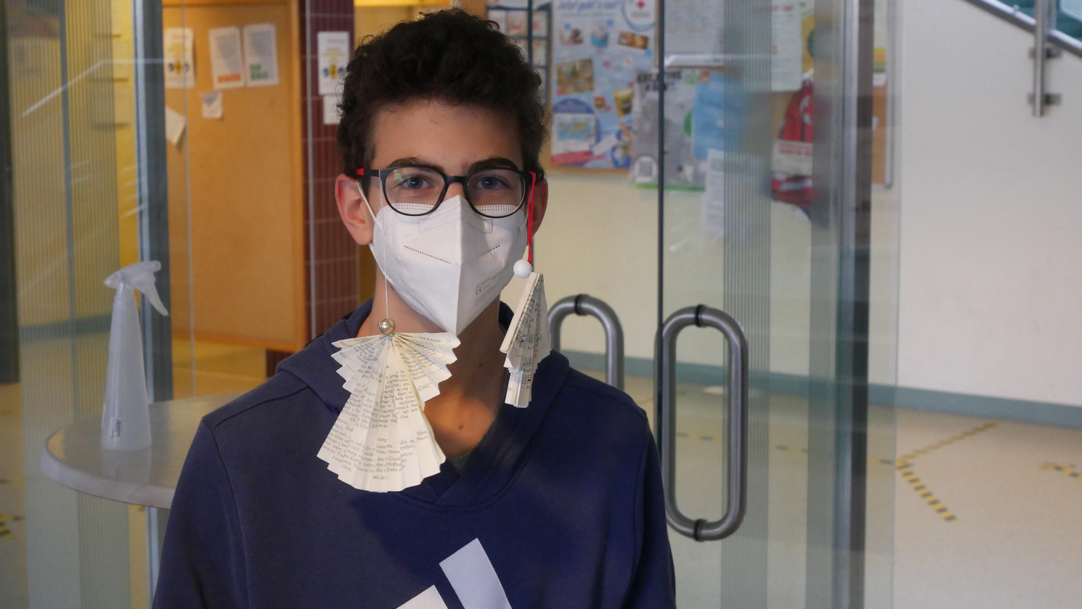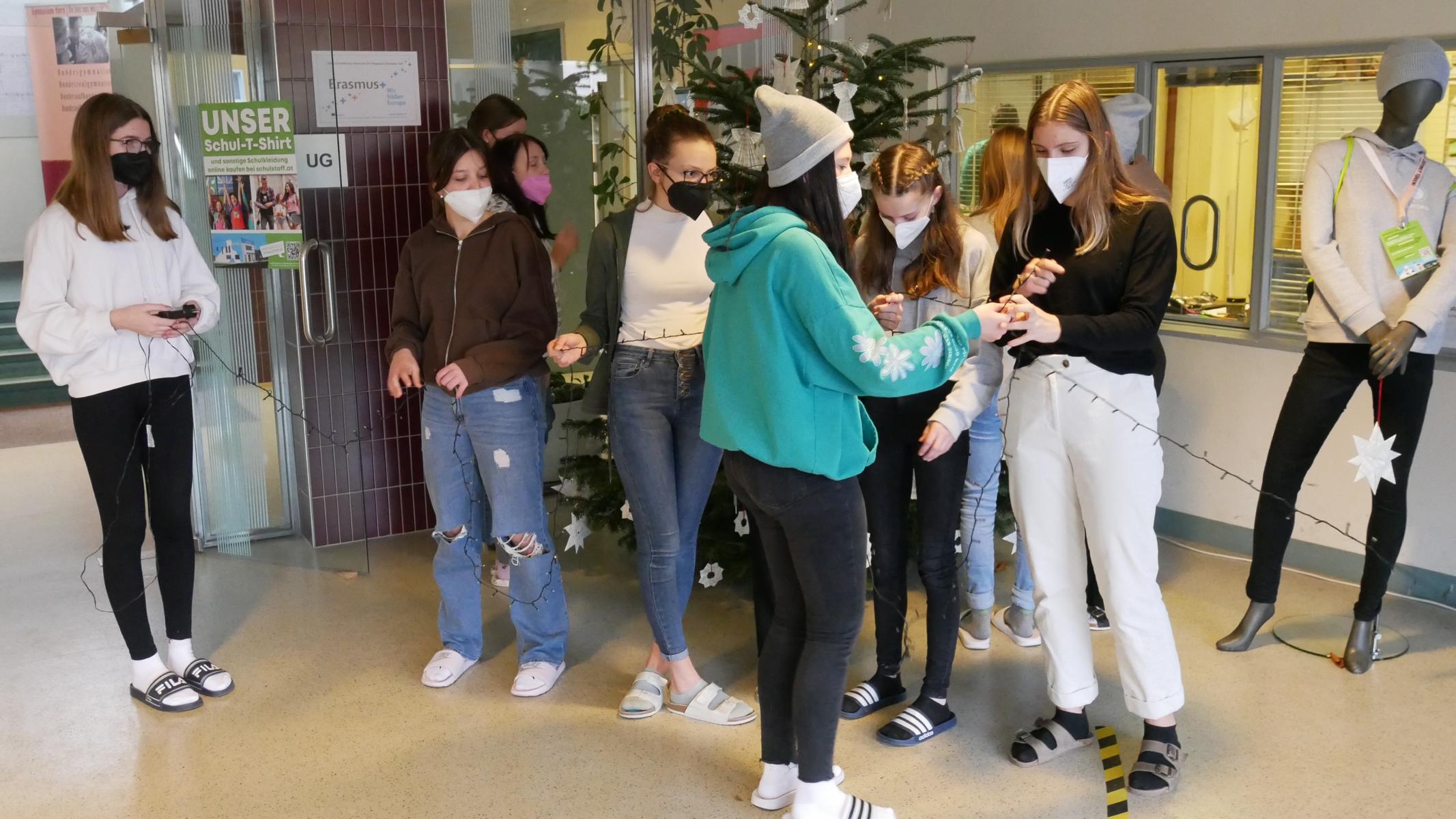 Die Religionslehrer*innen bastelten mit ihren Unterstufenklassen Sterne und Engel aus Seiten des alten Gotteslobes. So hat das alte Kirchengesangbuch noch eine Verwendung gefunden und die Jugendlichen hatten große Freude beim Basteln und auch beim Schmücken des Christbaums in der Eingangshalle des Gymnasiums.