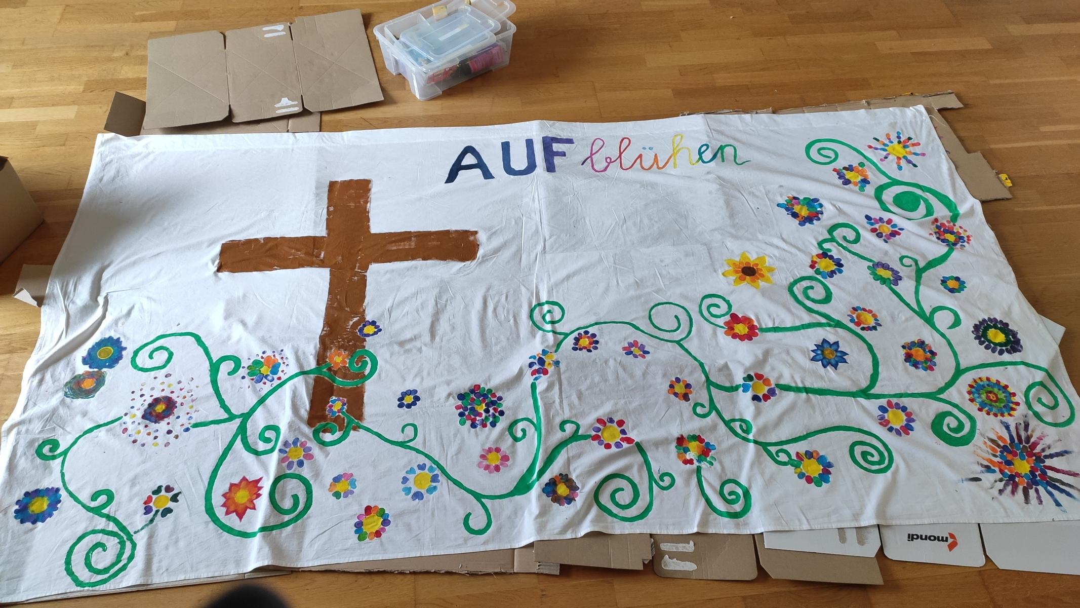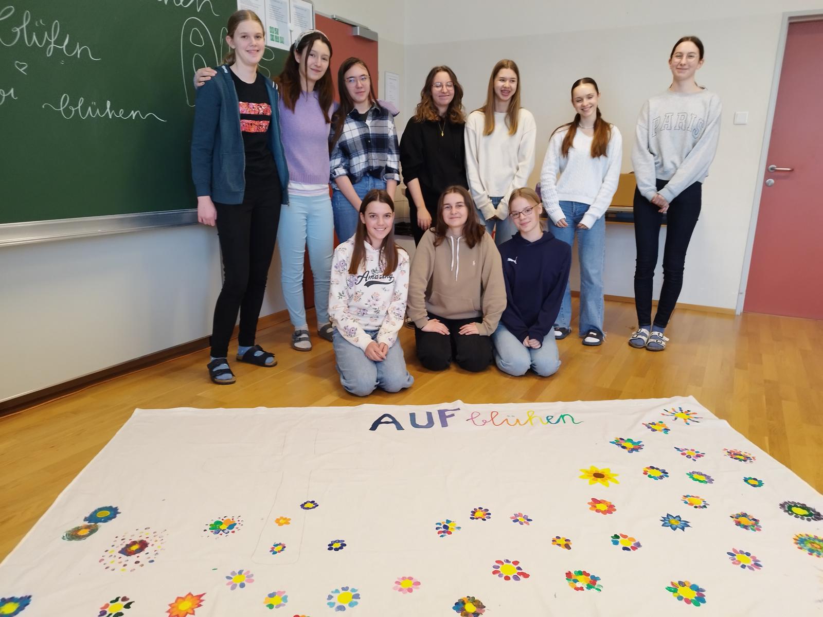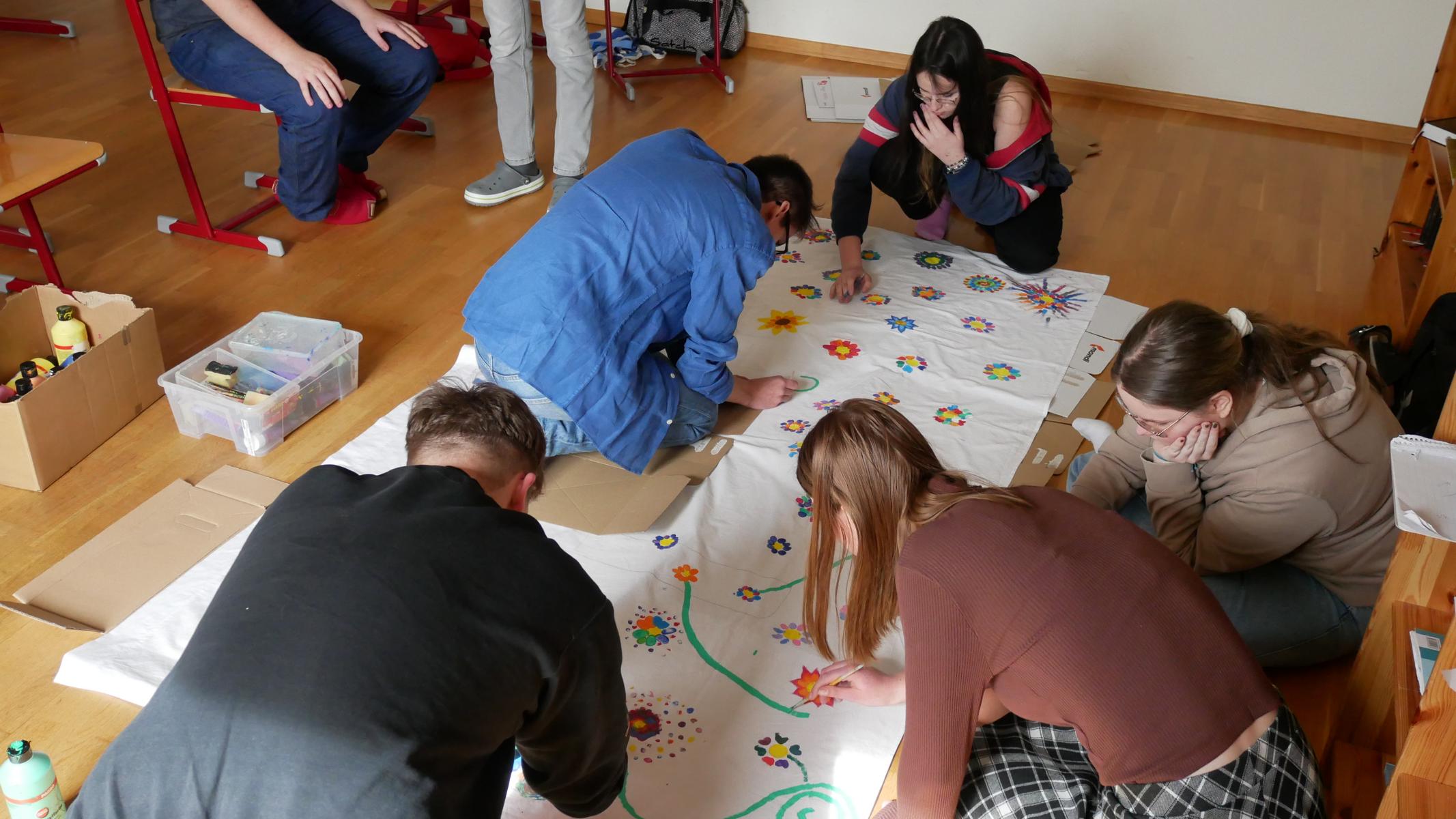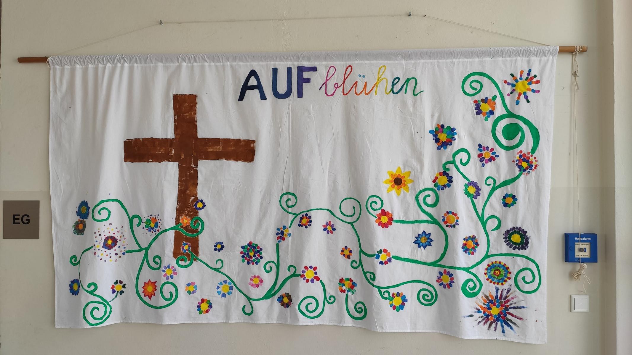 „Die aktuellen Entwicklungen in der Welt beschäftigen unsere Jugendlichen sehr und sie machen sich viele Gedanken über ihre Zukunft, die sie nicht immer rosig sehen. Wir haben daher das Thema „AUFblühen“ gewählt und mit dem Blick auf Ostern hin im Unterricht erarbeitet. Wir hoffen, so wieder etwas mehr Farbe und positive Gedanken in den Alltag und das Leben der Jugendlichen zu bringen“, erklärten die Religionslehrer ihre Motivation für das gemeinsame Fastentuch. Die Schüler*innen und Lehrer*innen des Gymnasiums waren also eingeladen, jeweils einen bunten Fingerabdruck als Blütenblatt zu hinterlassen und damit ein Teil des "AUFblühens" zu sein.