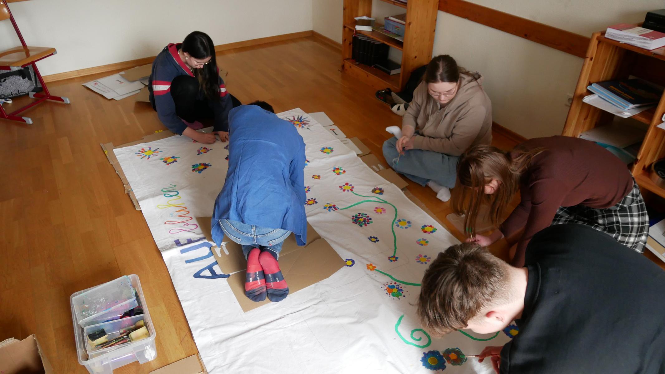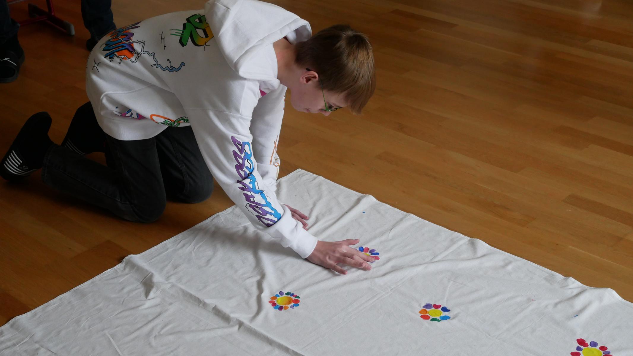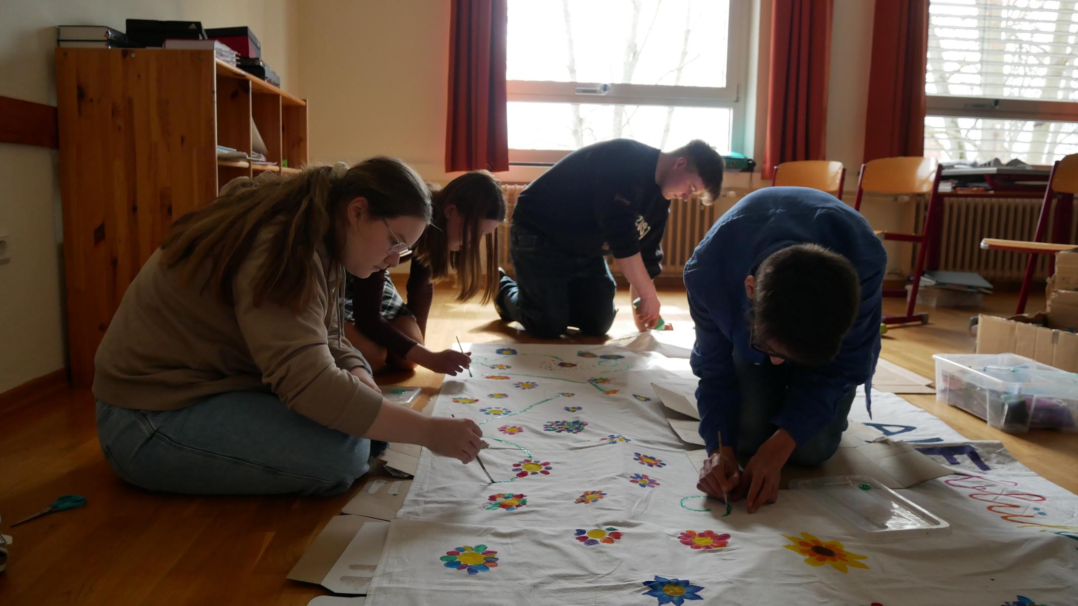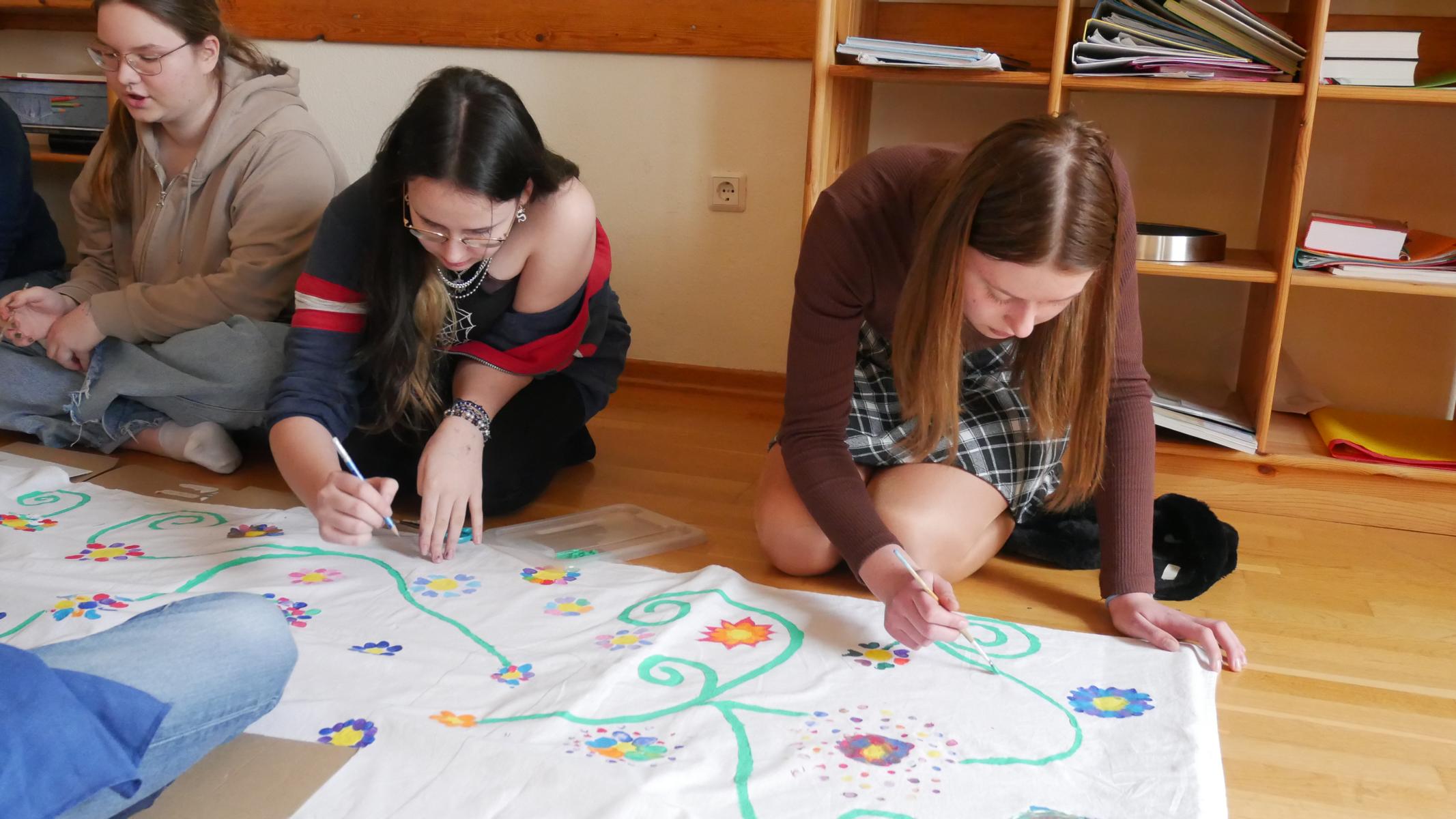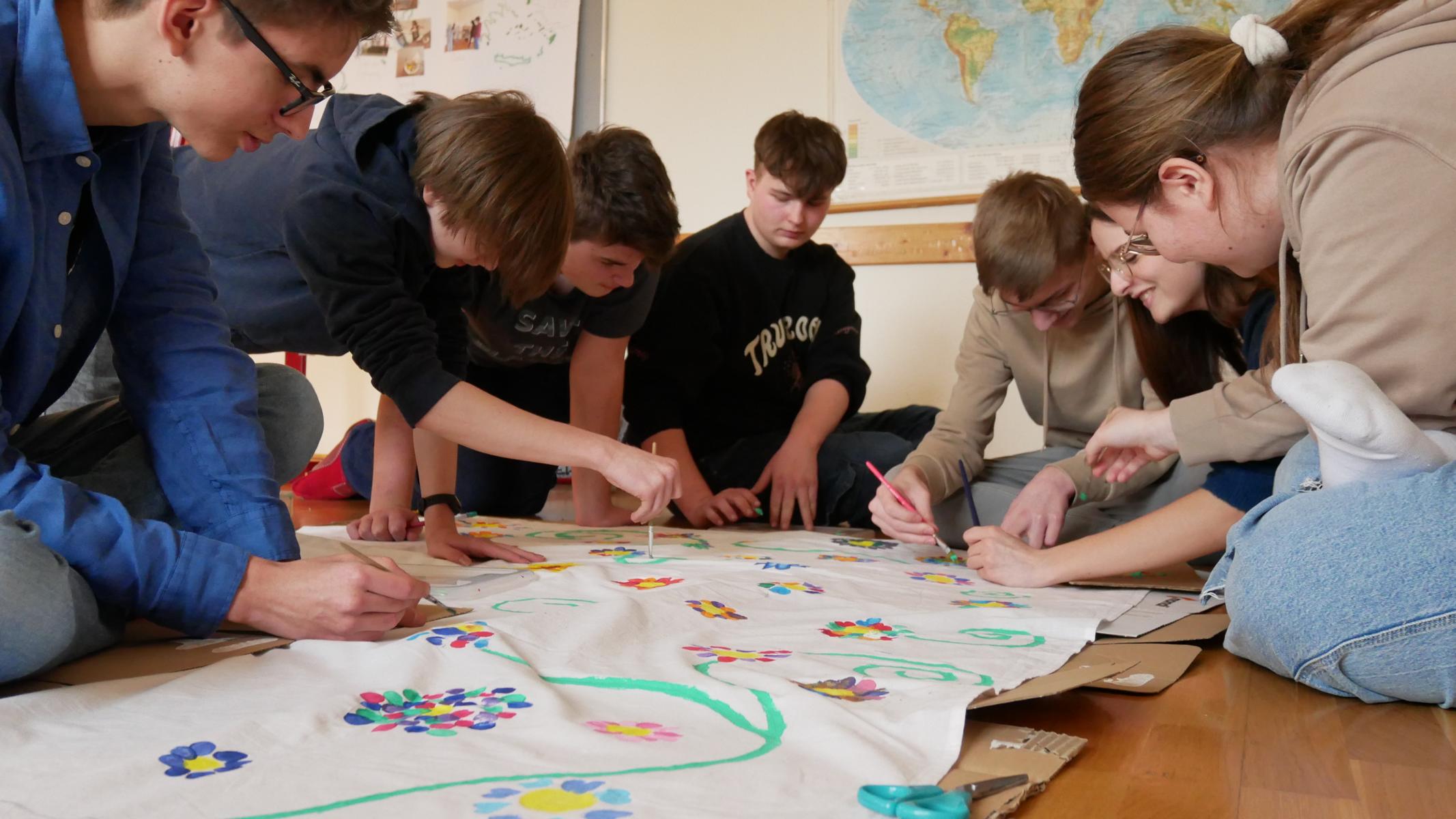 „Die aktuellen Entwicklungen in der Welt beschäftigen unsere Jugendlichen sehr und sie machen sich viele Gedanken über ihre Zukunft, die sie nicht immer rosig sehen. Wir haben daher das Thema „AUFblühen“ gewählt und mit dem Blick auf Ostern hin im Unterricht erarbeitet. Wir hoffen, so wieder etwas mehr Farbe und positive Gedanken in den Alltag und das Leben der Jugendlichen zu bringen“, erklärten die Religionslehrer ihre Motivation für das gemeinsame Fastentuch. Die Schüler*innen und Lehrer*innen des Gymnasiums waren also eingeladen, jeweils einen bunten Fingerabdruck als Blütenblatt zu hinterlassen und damit ein Teil des "AUFblühens" zu sein.