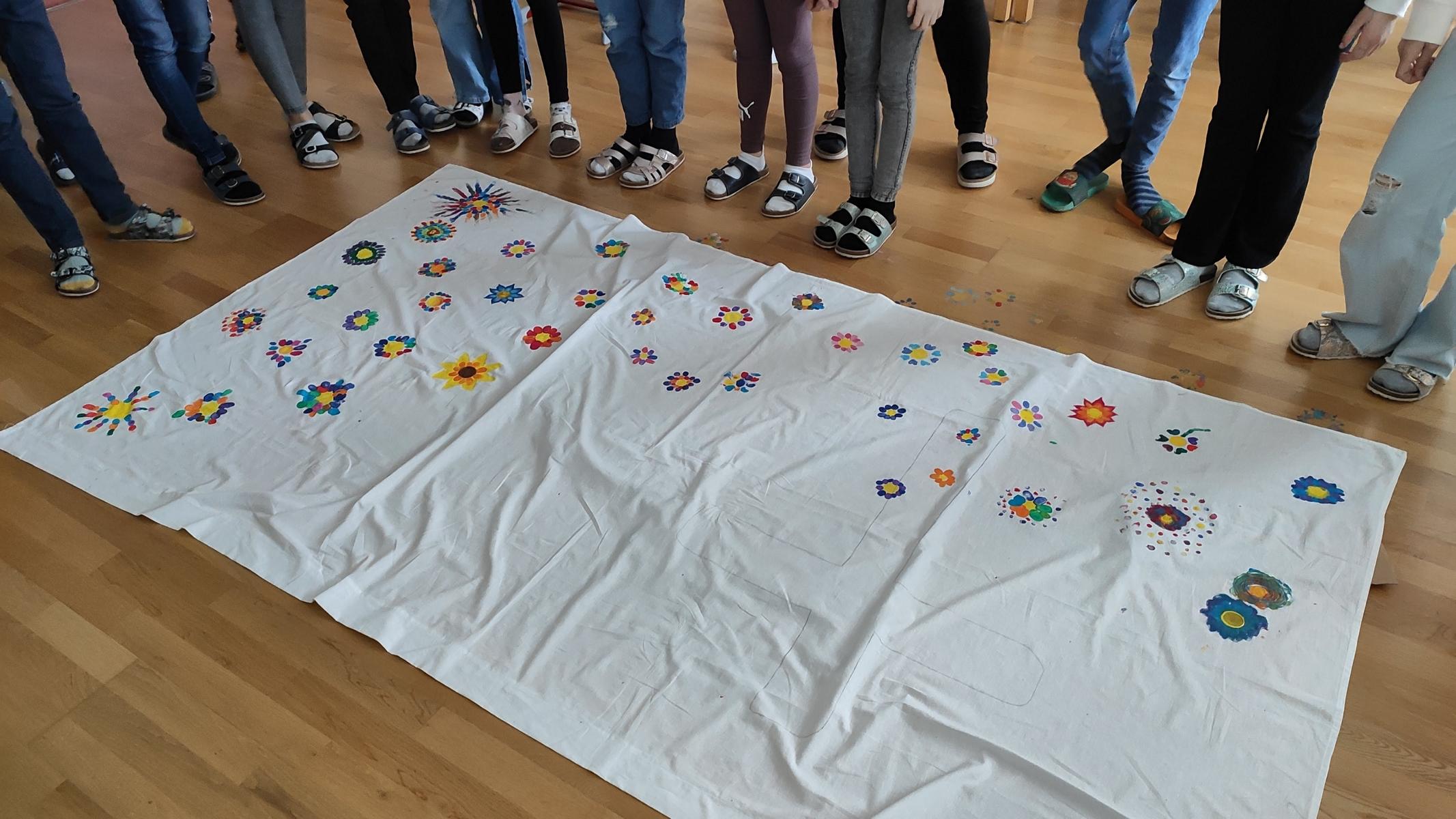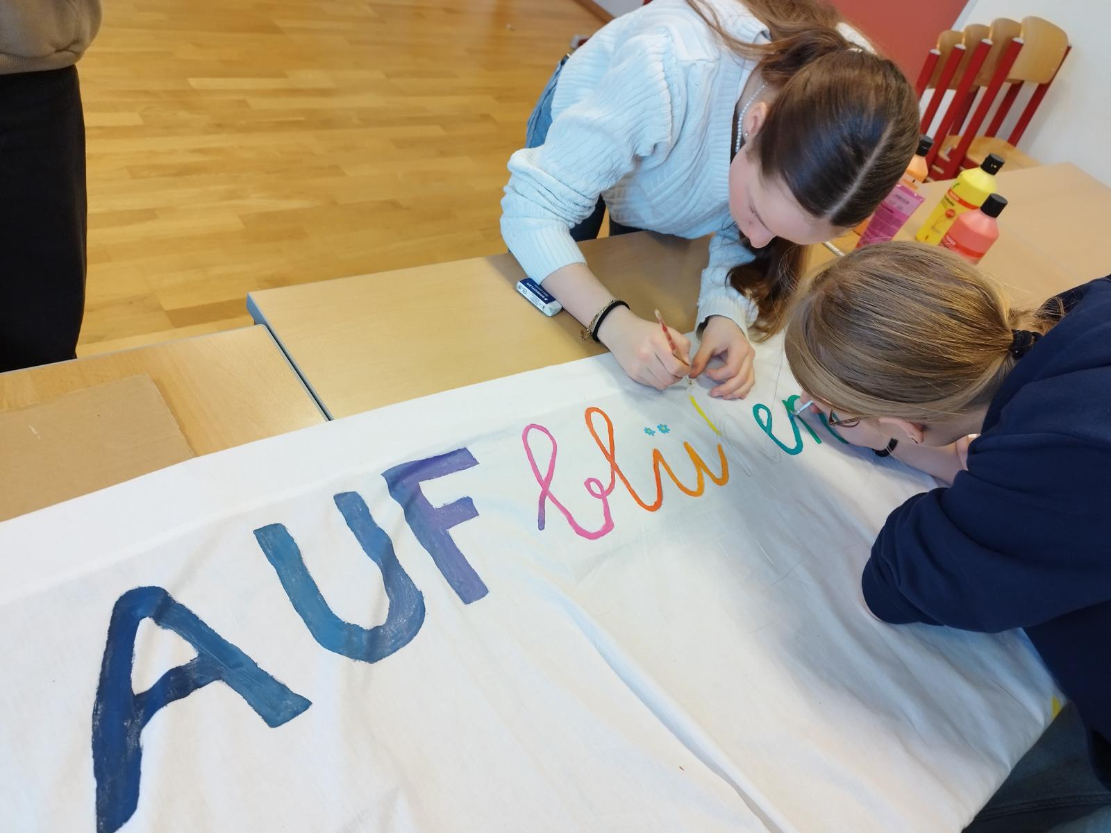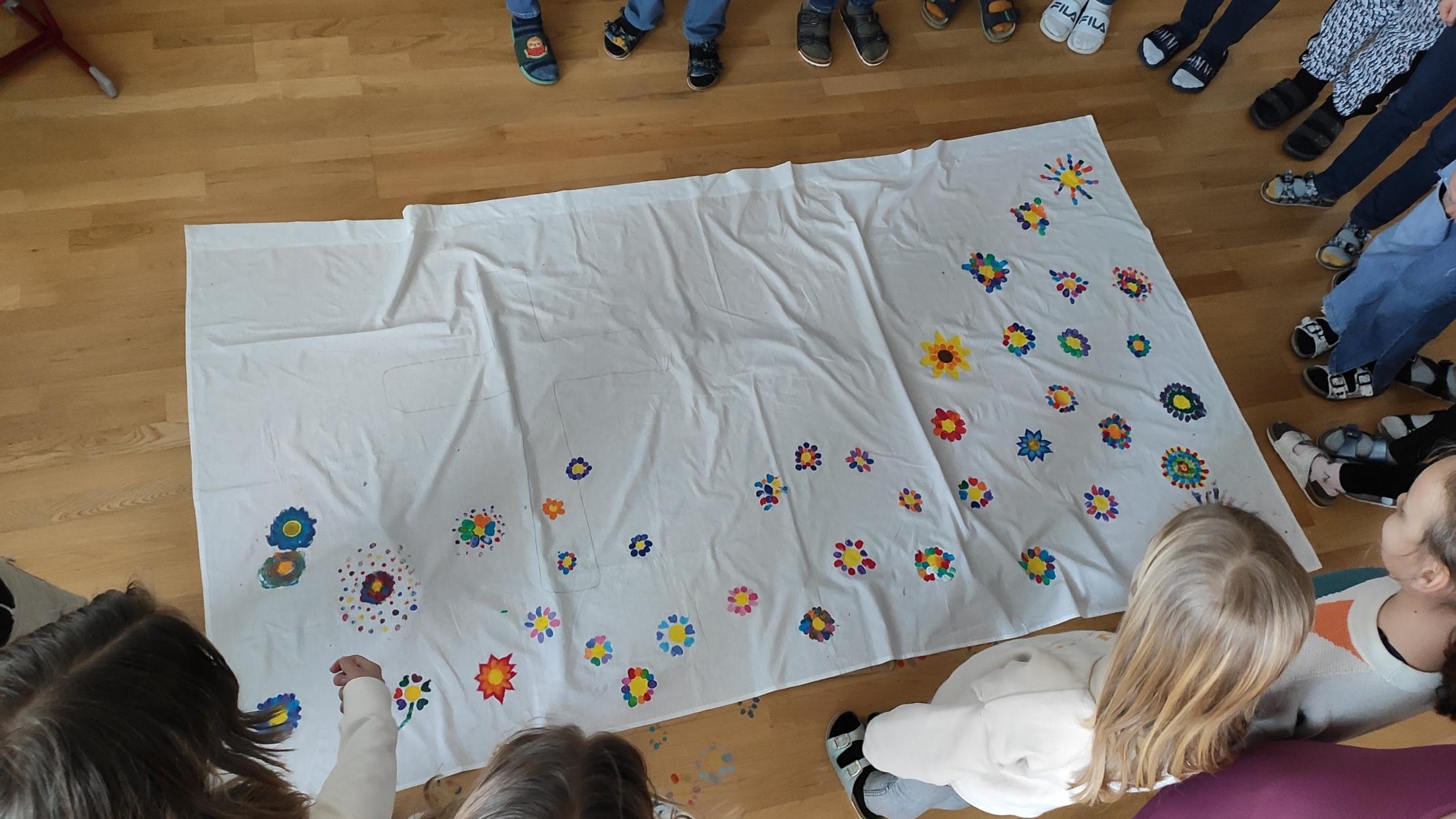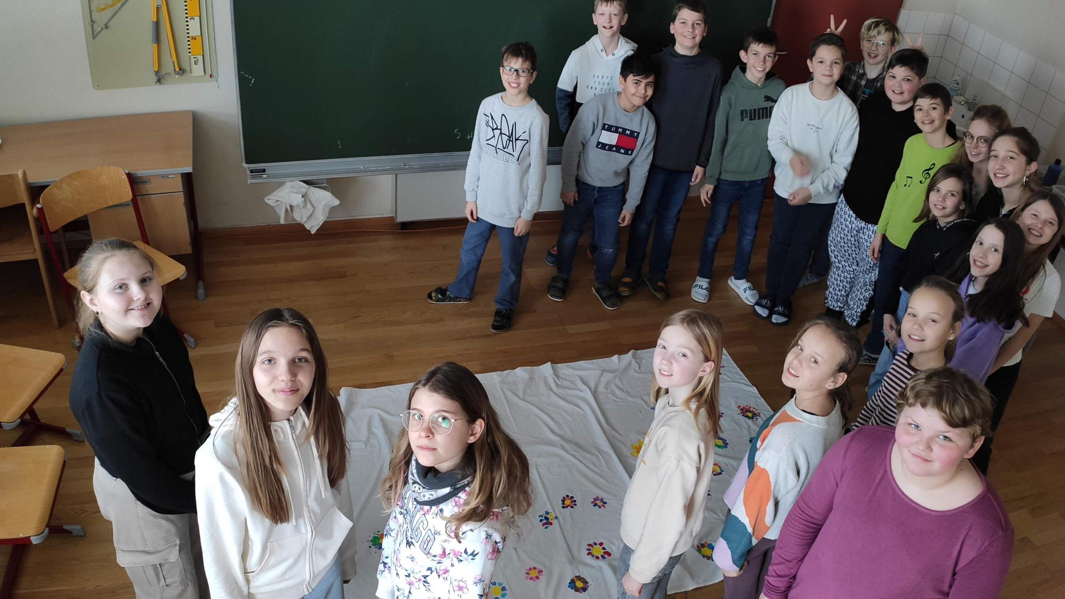 „Die aktuellen Entwicklungen in der Welt beschäftigen unsere Jugendlichen sehr und sie machen sich viele Gedanken über ihre Zukunft, die sie nicht immer rosig sehen. Wir haben daher das Thema „AUFblühen“ gewählt und mit dem Blick auf Ostern hin im Unterricht erarbeitet. Wir hoffen, so wieder etwas mehr Farbe und positive Gedanken in den Alltag und das Leben der Jugendlichen zu bringen“, erklärten die Religionslehrer ihre Motivation für das gemeinsame Fastentuch. Die Schüler*innen und Lehrer*innen des Gymnasiums waren also eingeladen, jeweils einen bunten Fingerabdruck als Blütenblatt zu hinterlassen und damit ein Teil des "AUFblühens" zu sein.