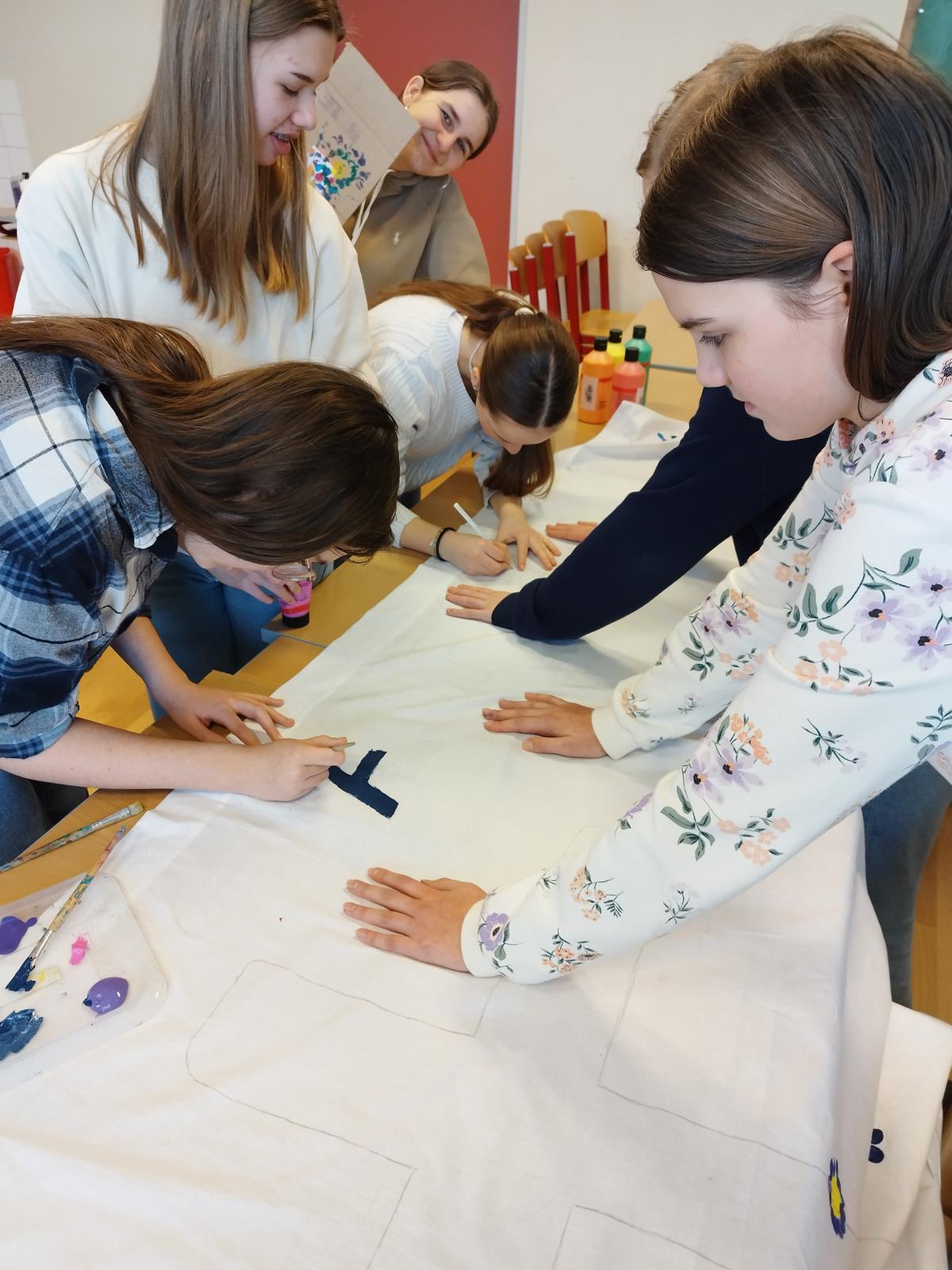 Unsere Religionslehrer*innen haben in den letzten Wochen ein Fastentuch mit ihren Schüler*innen gestaltet. Ursprünglich hatte ein Fastentuch die Aufgabe, in den Kirchen die Darstellungen Christi (am Kreuz) oder den Altar in der Fastenzeit zu verhüllen. Das war dann ein „Fasten mit den Augen“. In den letzten Jahren wurde es immer gebräuchlicher mit Jugendlichen ein solches Tuch (z.B. zu einem aktuellen Thema) zu gestalten.