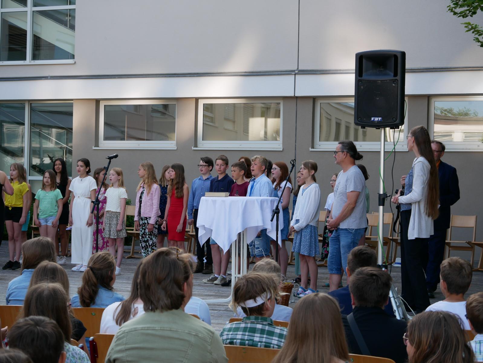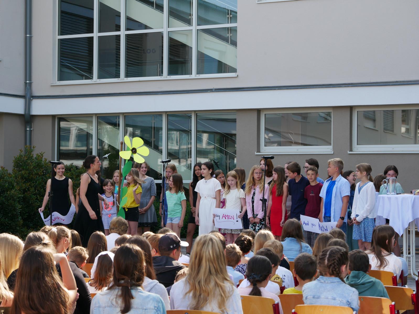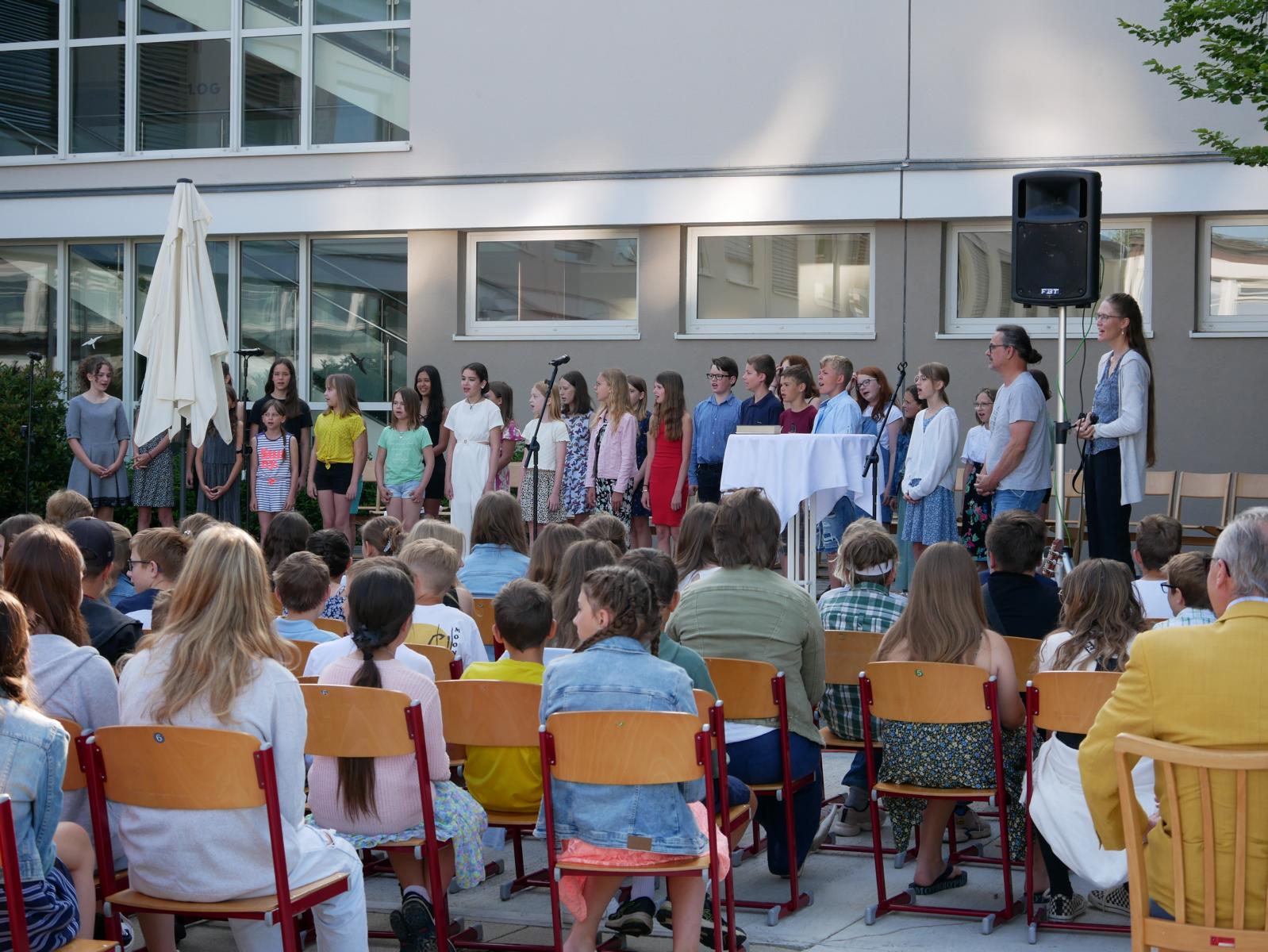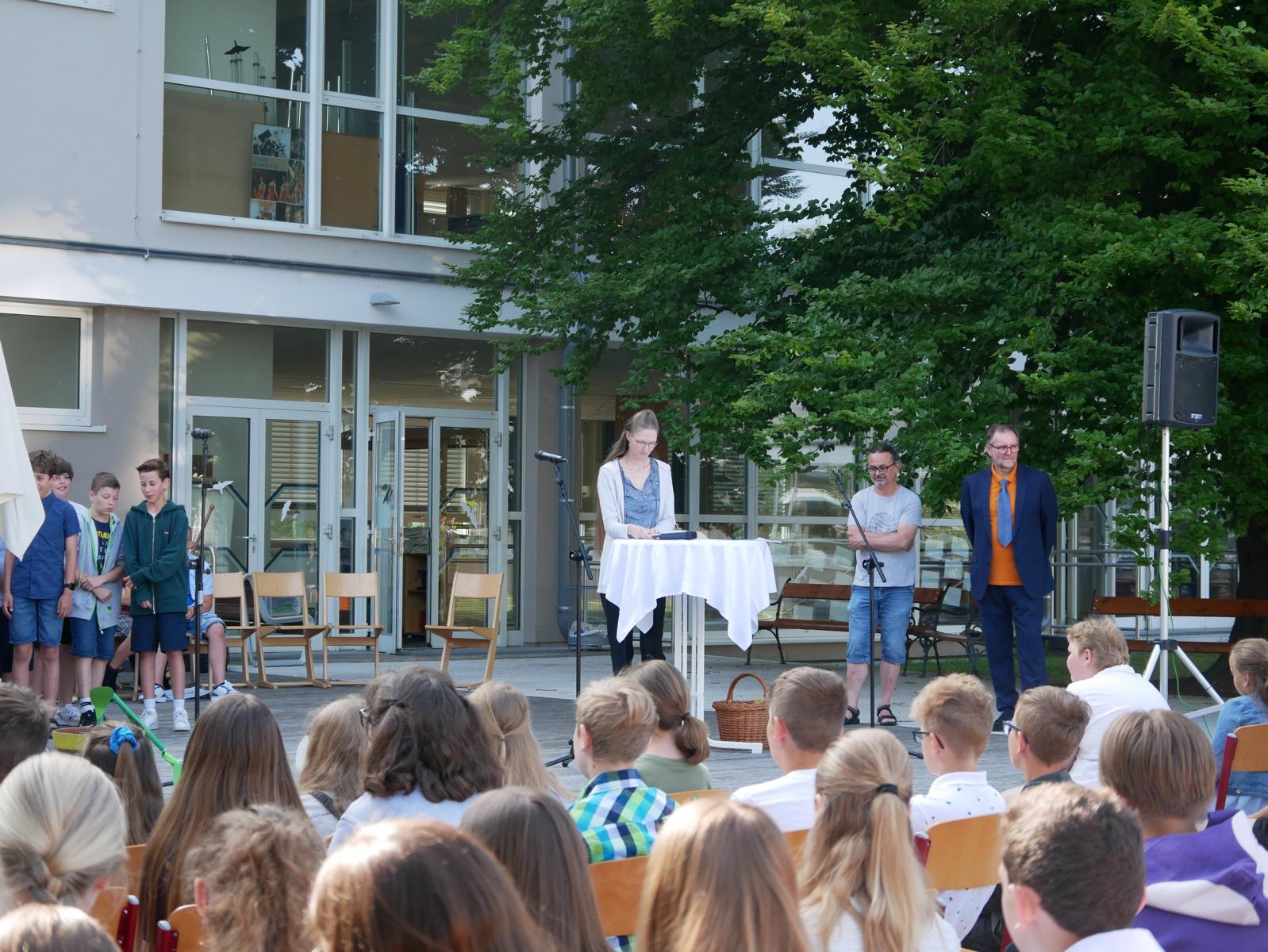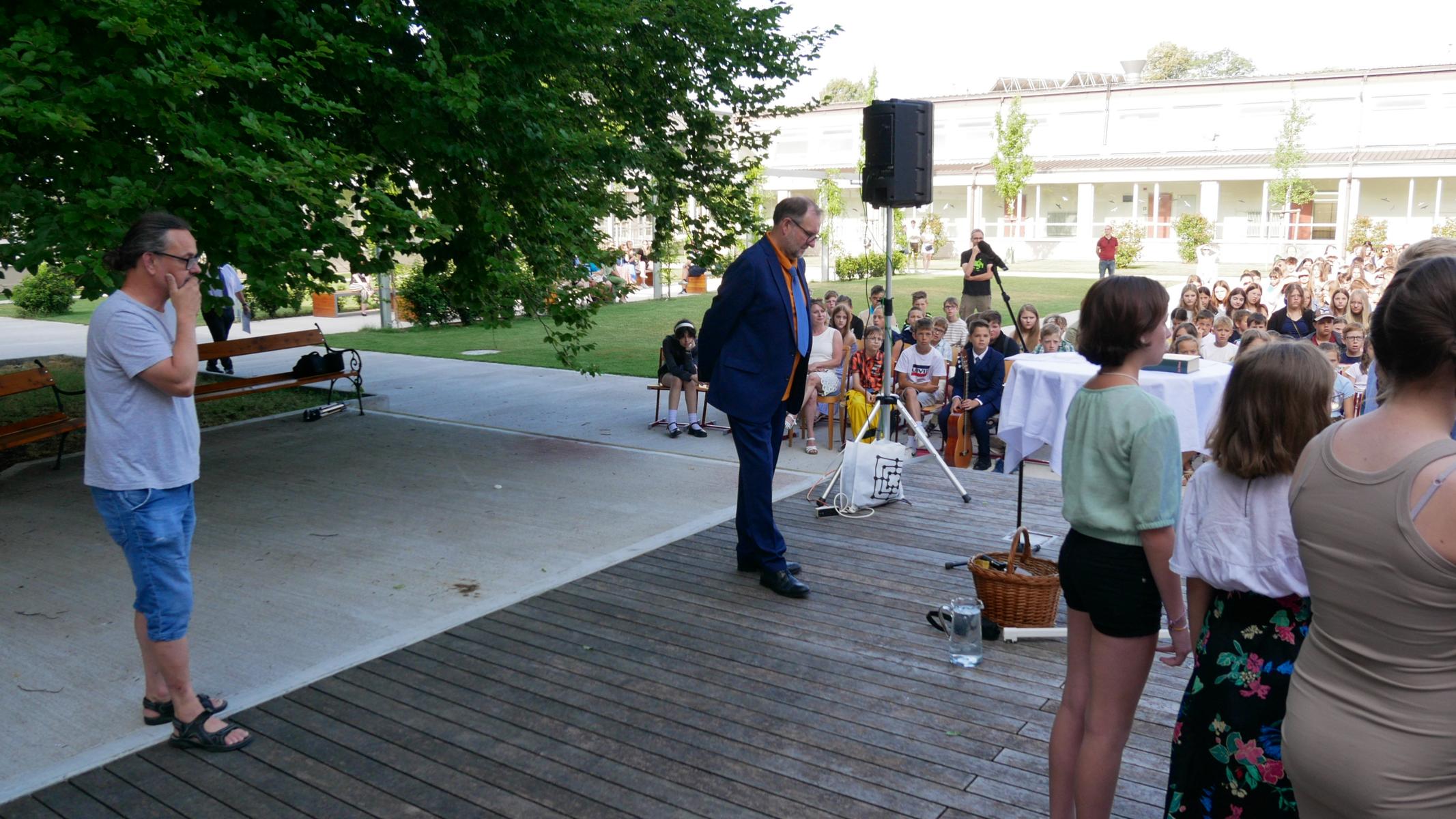 Dank des schönen Wetters konnte der Schulabschluss wieder draußen gefeiert werden. Mag. Theresa Gudenus kürte die Sieger der gestrigen Olympischen Spiele, Mag. Peter Schnaubelt und Mag. Brigitte Eschelmüller bedankten sich bei den fleißigen Schülern, die während des ganzen Schuljahres in der Bibliothek mithalfen und Direktor Ableidinger übergab die Urkunden zu den Teilprüfungen des Unternehmerführerscheins. MMag. Stephanie Sift gestaltete mit ihrem Schulchor den Gottesdienst.
