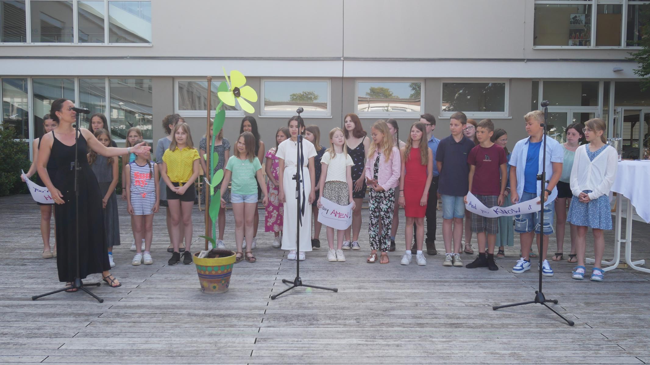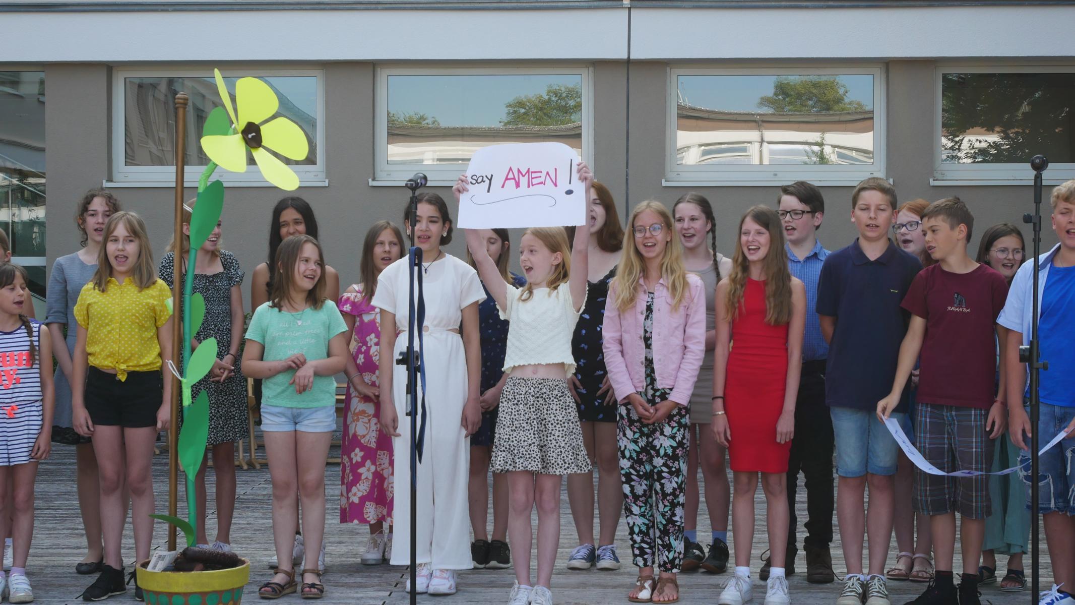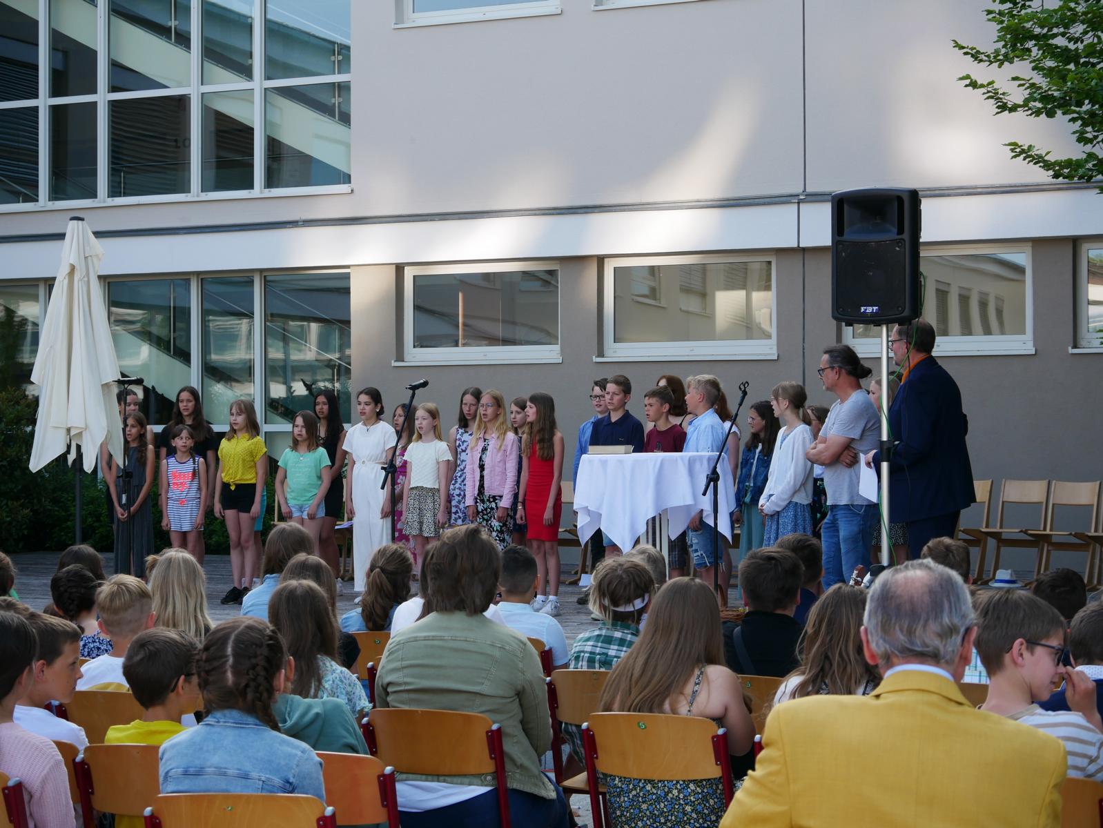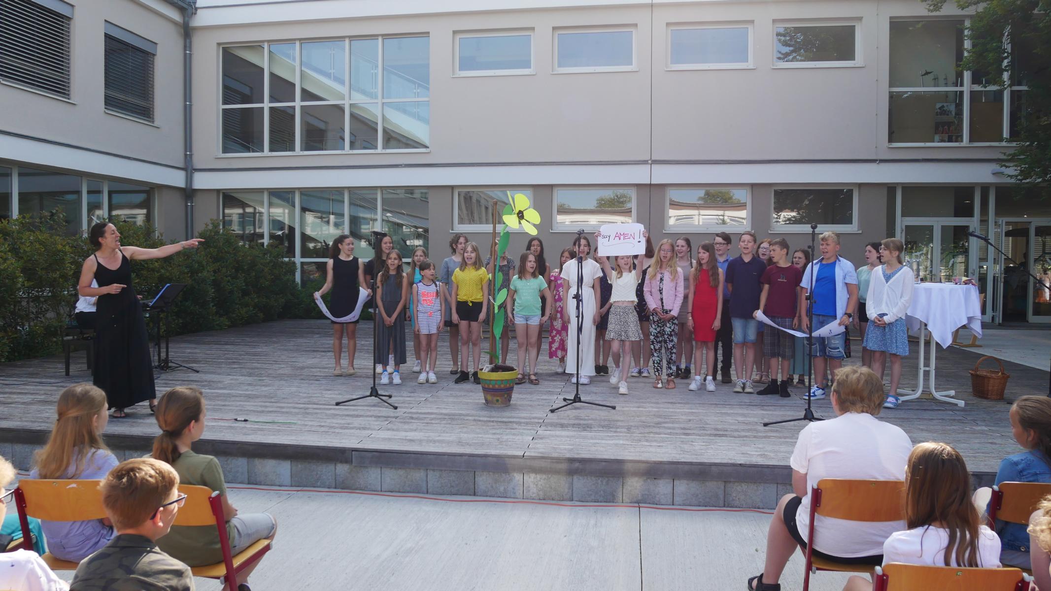 Dank des schönen Wetters konnte der Schulabschluss wieder draußen gefeiert werden. Mag. Theresa Gudenus kürte die Sieger der gestrigen Olympischen Spiele, Mag. Peter Schnaubelt und Mag. Brigitte Eschelmüller bedankten sich bei den fleißigen Schülern, die während des ganzen Schuljahres in der Bibliothek mithalfen und Direktor Ableidinger übergab die Urkunden zu den Teilprüfungen des Unternehmerführerscheins. MMag. Stephanie Sift gestaltete mit ihrem Schulchor den Gottesdienst.