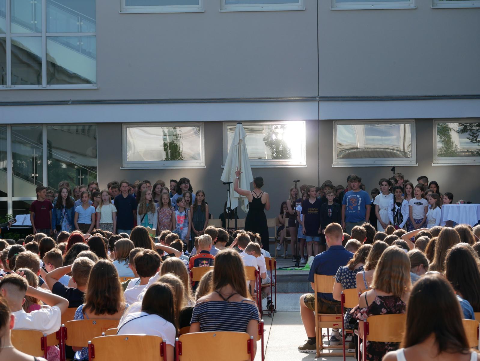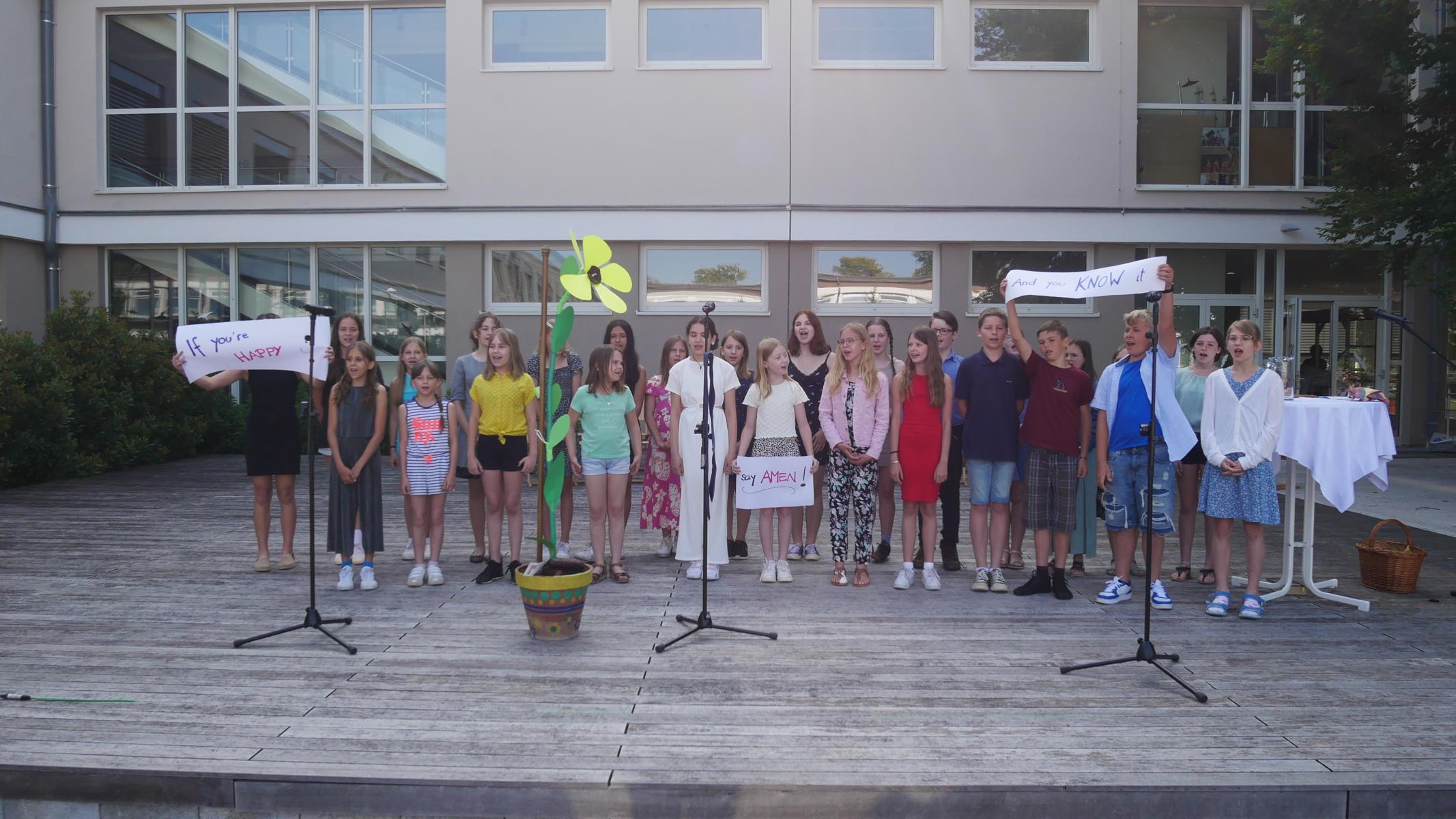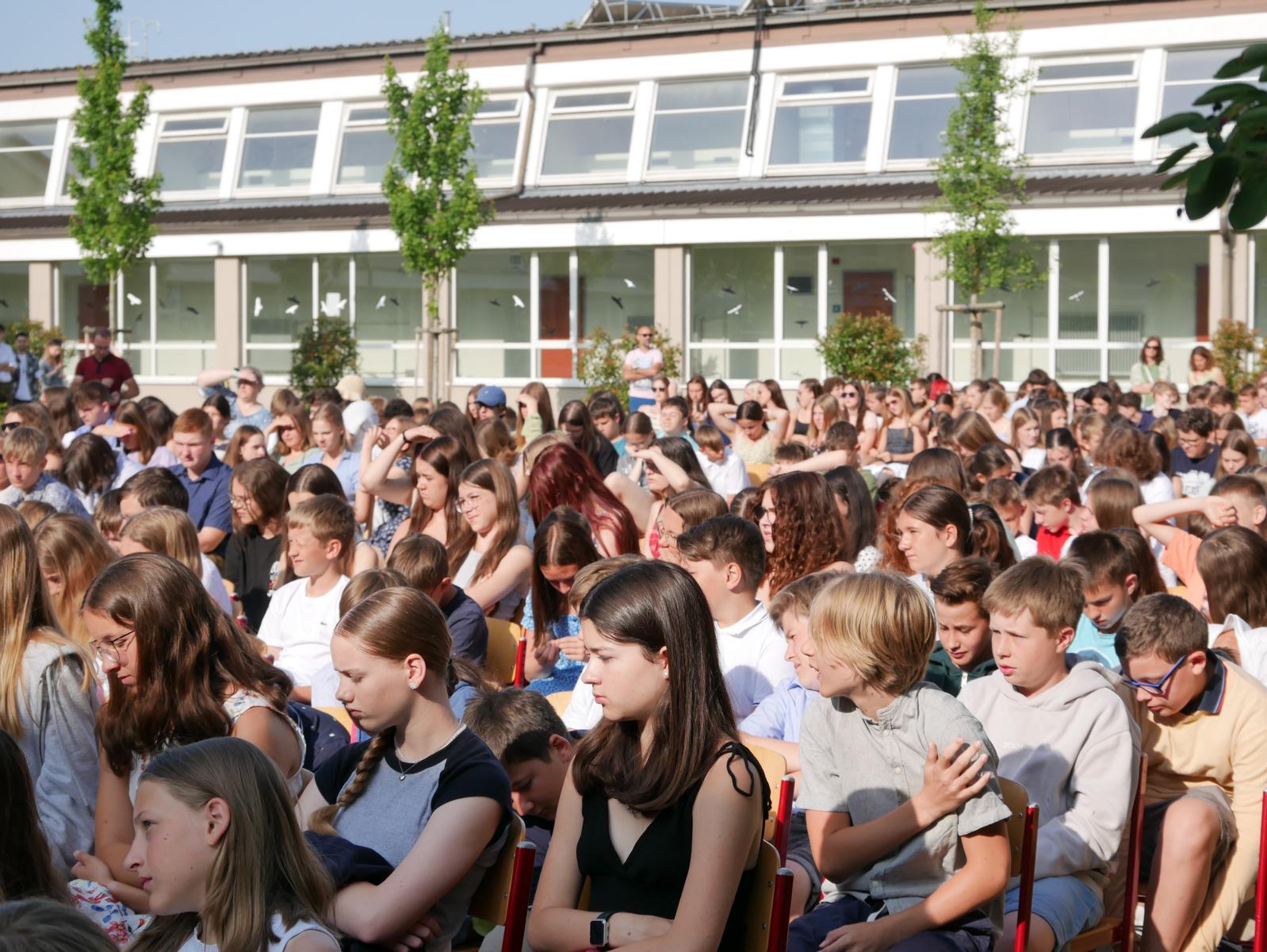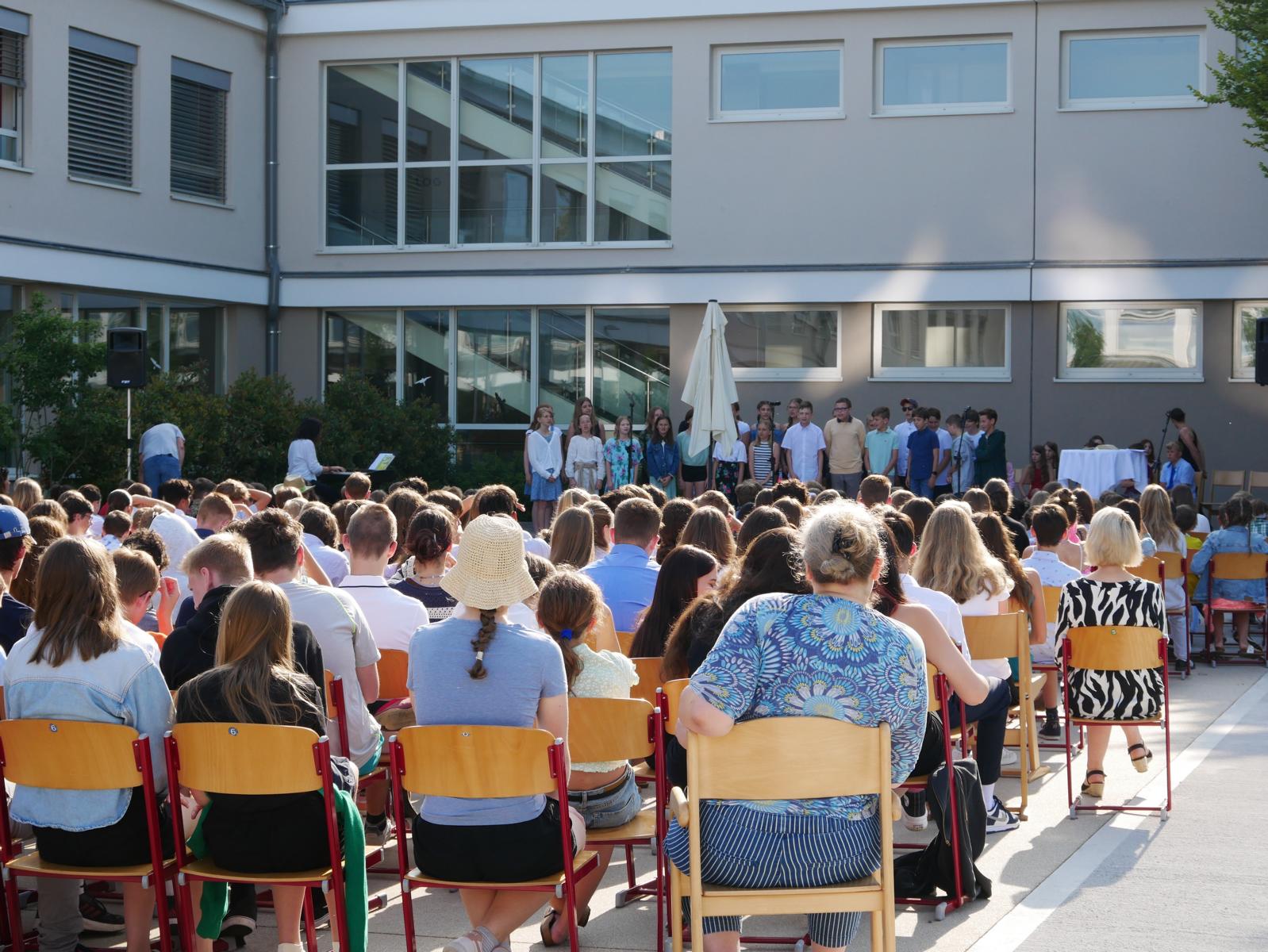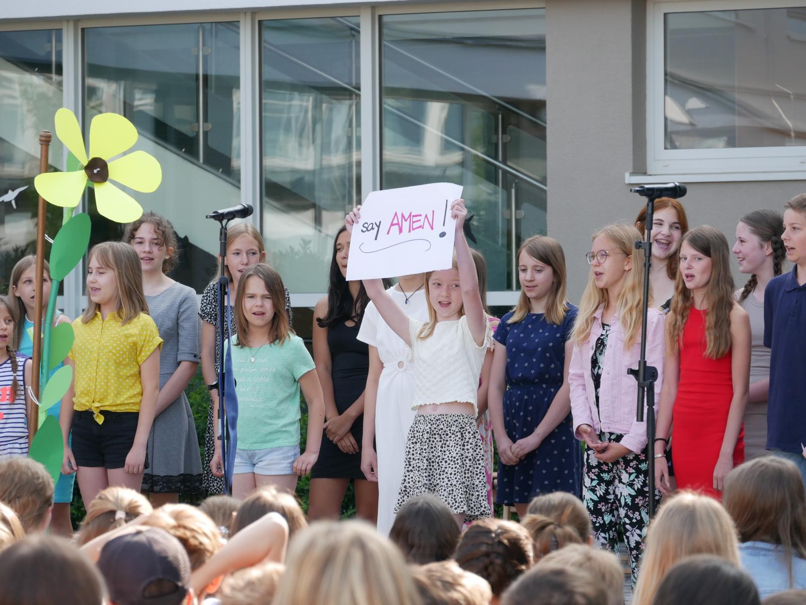 Dank des schönen Wetters konnte der Schulabschluss wieder draußen gefeiert werden. Mag. Theresa Gudenus kürte die Sieger der gestrigen Olympischen Spiele, Mag. Peter Schnaubelt und Mag. Brigitte Eschelmüller bedankten sich bei den fleißigen Schülern, die während des ganzen Schuljahres in der Bibliothek mithalfen und Direktor Ableidinger übergab die Urkunden zu den Teilprüfungen des Unternehmerführerscheins. MMag. Stephanie Sift gestaltete mit ihrem Schulchor den Gottesdienst.