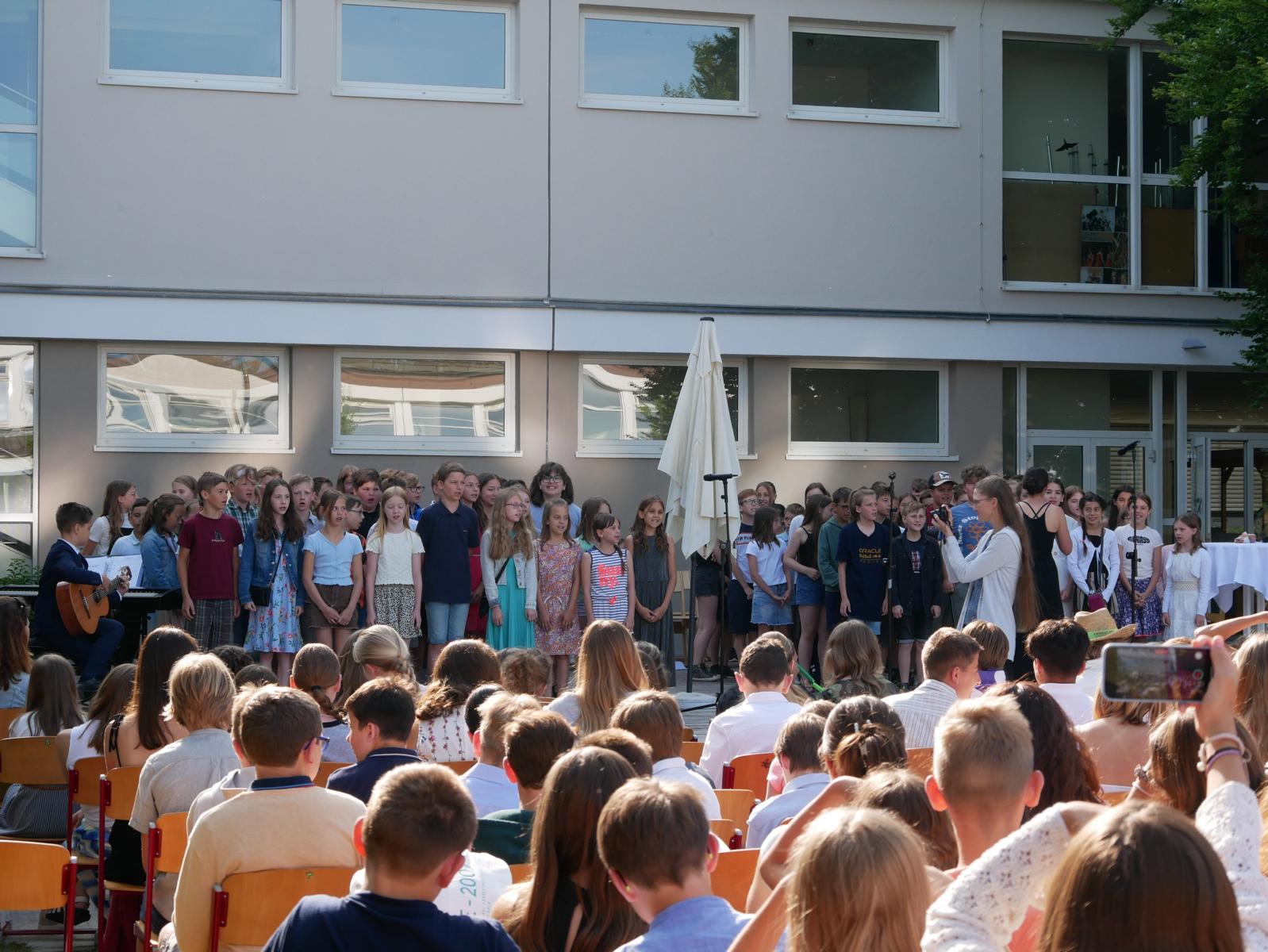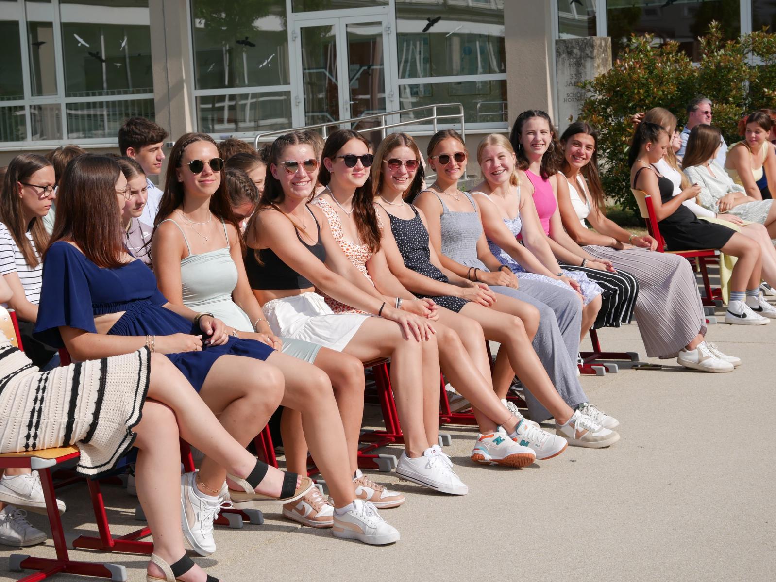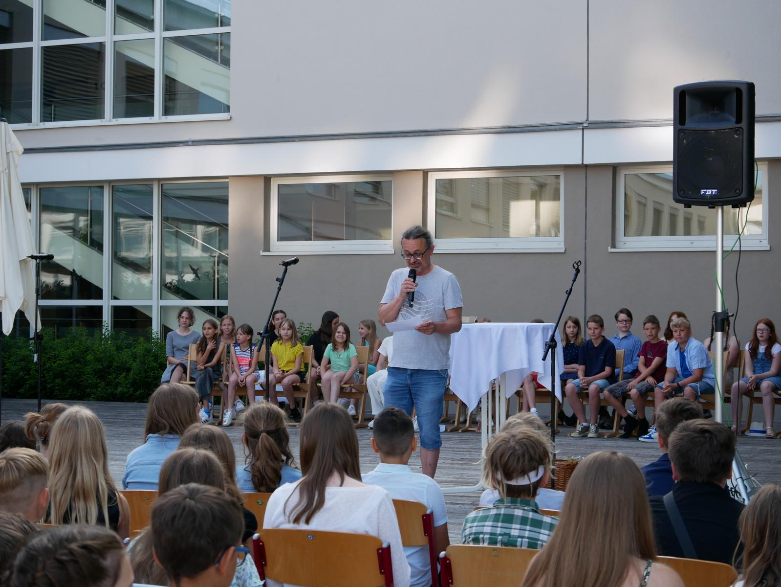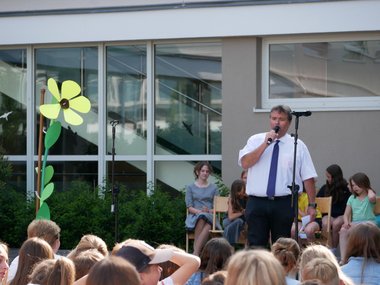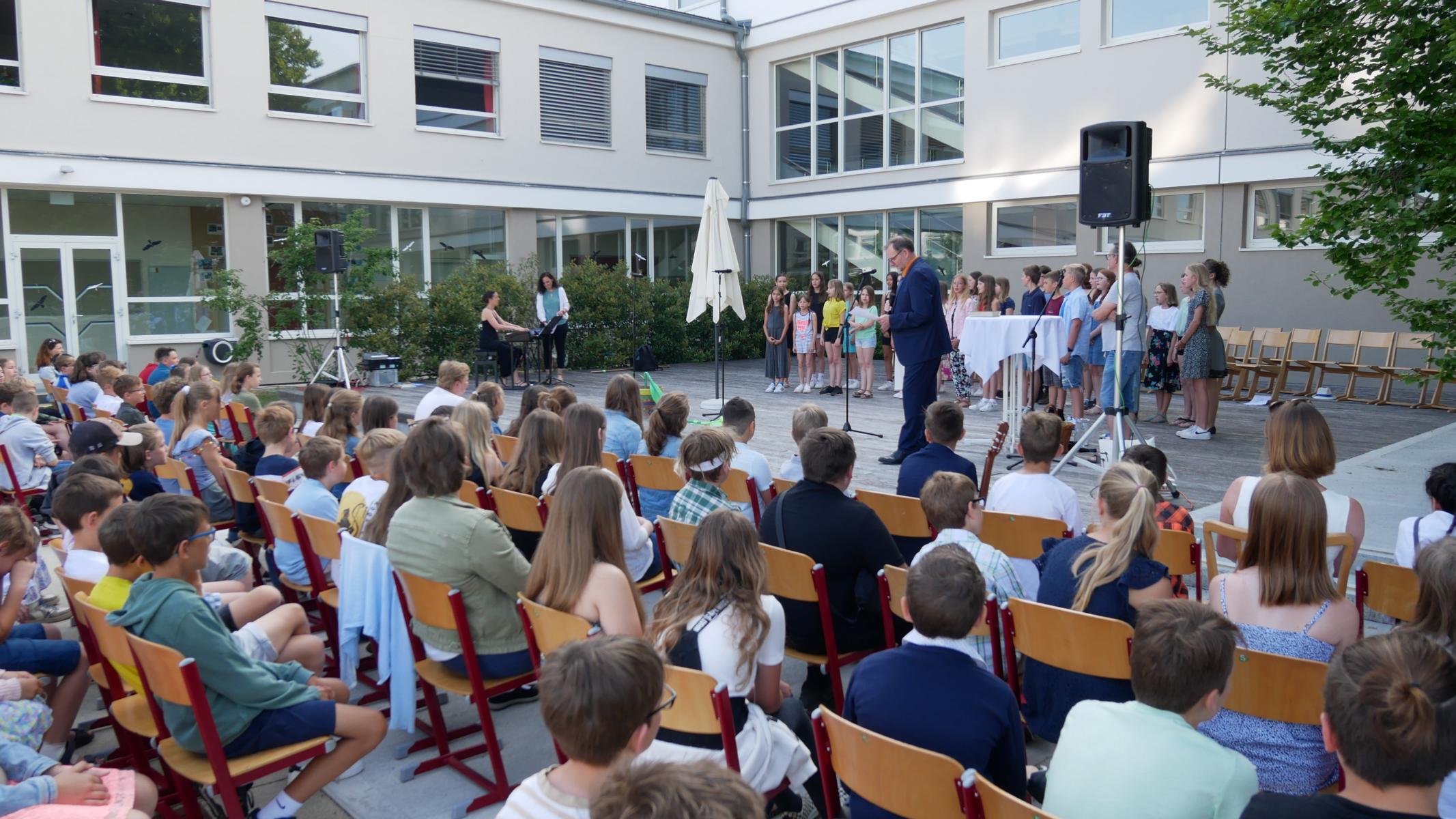 Dank des schönen Wetters konnte der Schulabschluss wieder draußen gefeiert werden. Mag. Theresa Gudenus kürte die Sieger der gestrigen Olympischen Spiele, Mag. Peter Schnaubelt und Mag. Brigitte Eschelmüller bedankten sich bei den fleißigen Schülern, die während des ganzen Schuljahres in der Bibliothek mithalfen und Direktor Ableidinger übergab die Urkunden zu den Teilprüfungen des Unternehmerführerscheins. MMag. Stephanie Sift gestaltete mit ihrem Schulchor den Gottesdienst.