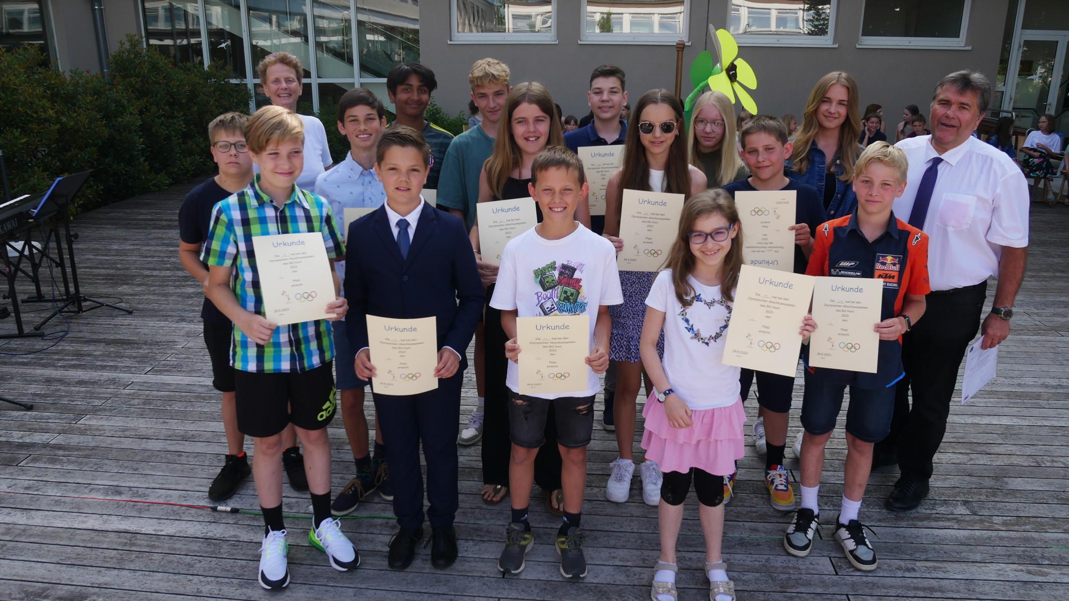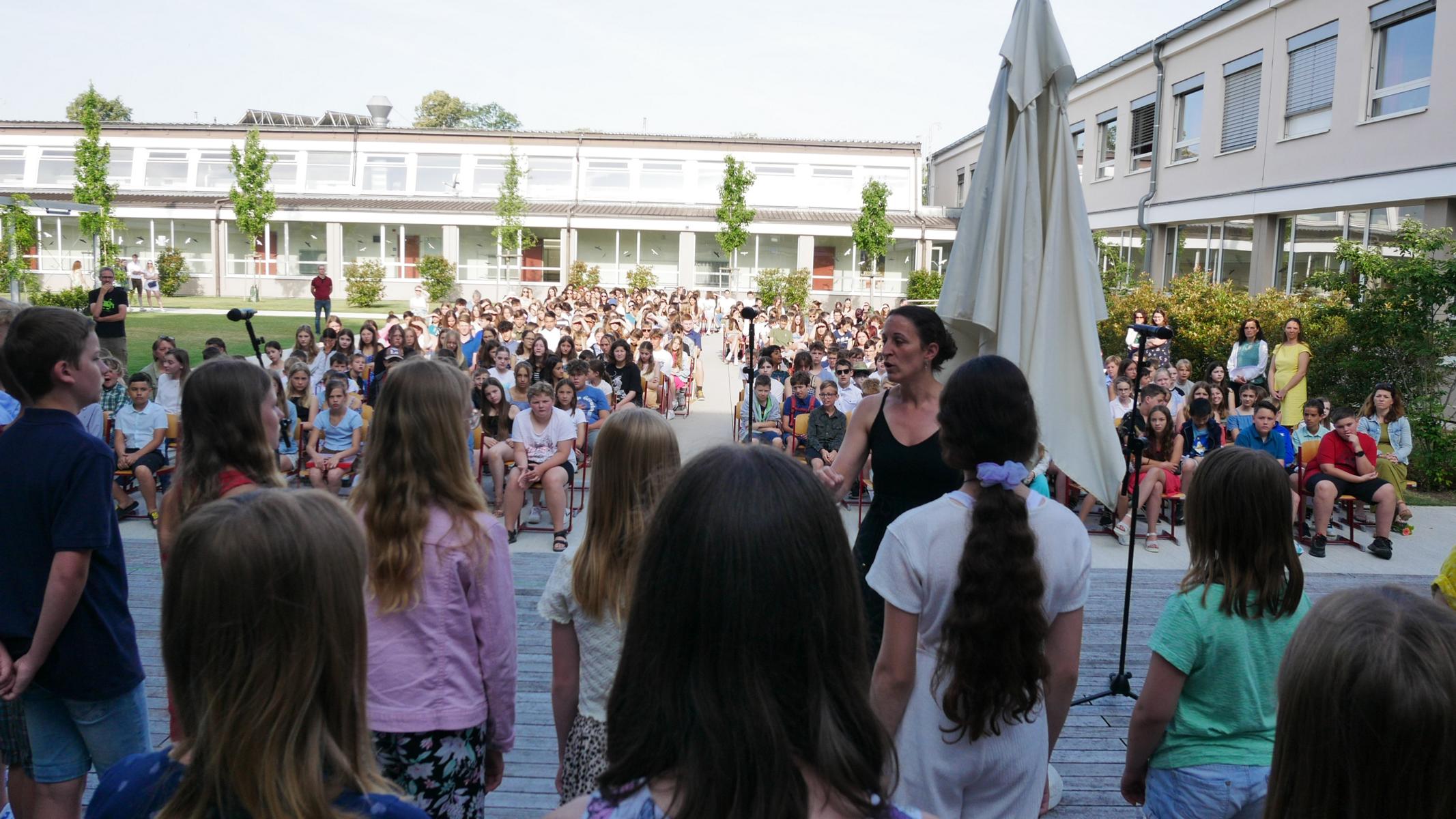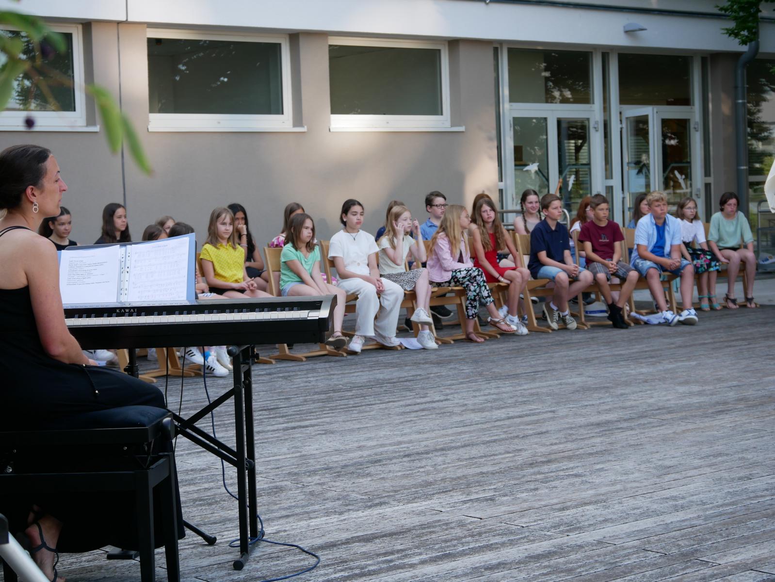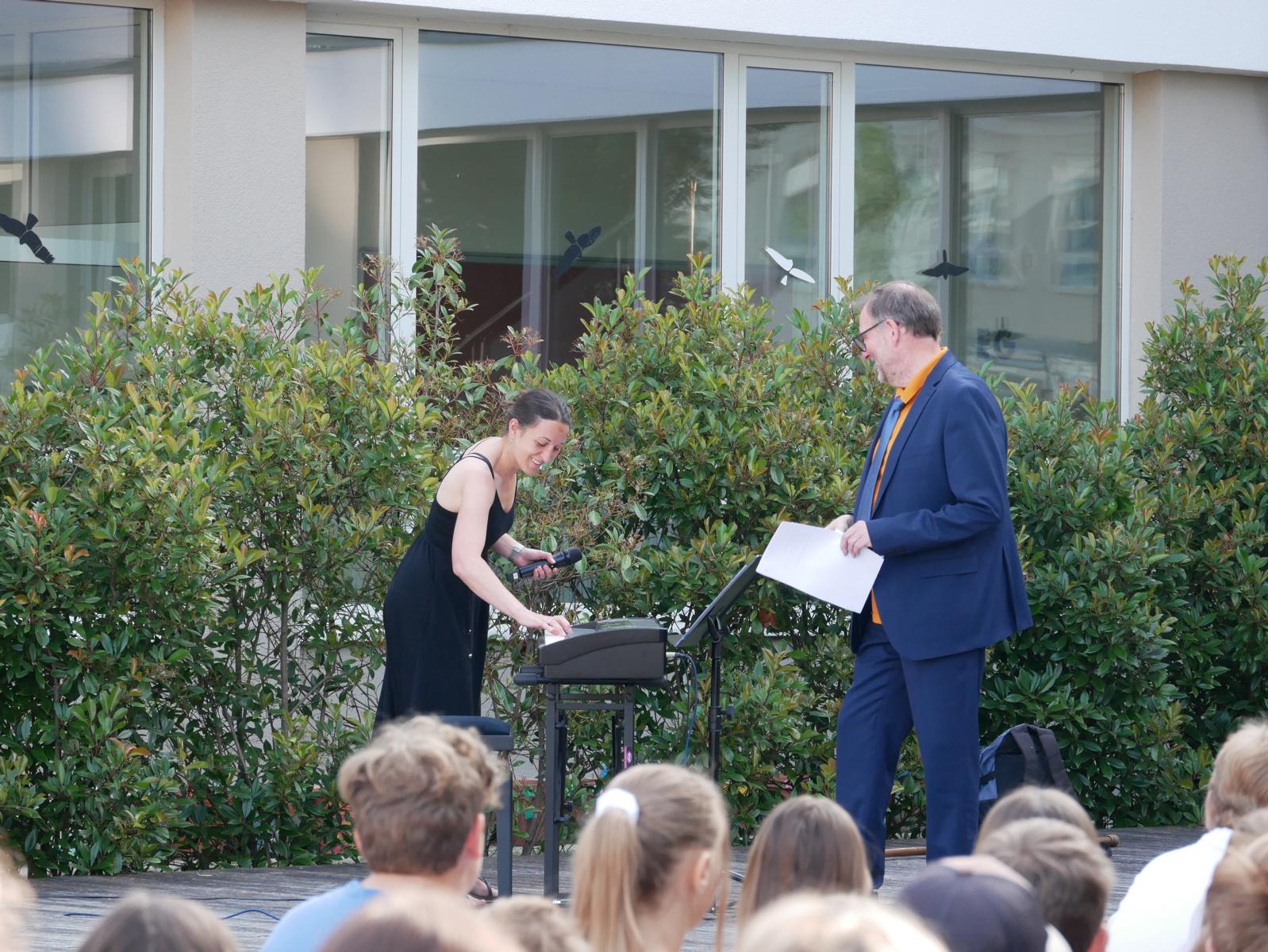 Dank des schönen Wetters konnte der Schulabschluss wieder draußen gefeiert werden. Mag. Theresa Gudenus kürte die Sieger der gestrigen Olympischen Spiele, Mag. Peter Schnaubelt und Mag. Brigitte Eschelmüller bedankten sich bei den fleißigen Schülern, die während des ganzen Schuljahres in der Bibliothek mithalfen und Direktor Ableidinger übergab die Urkunden zu den Teilprüfungen des Unternehmerführerscheins. MMag. Stephanie Sift gestaltete mit ihrem Schulchor den Gottesdienst.