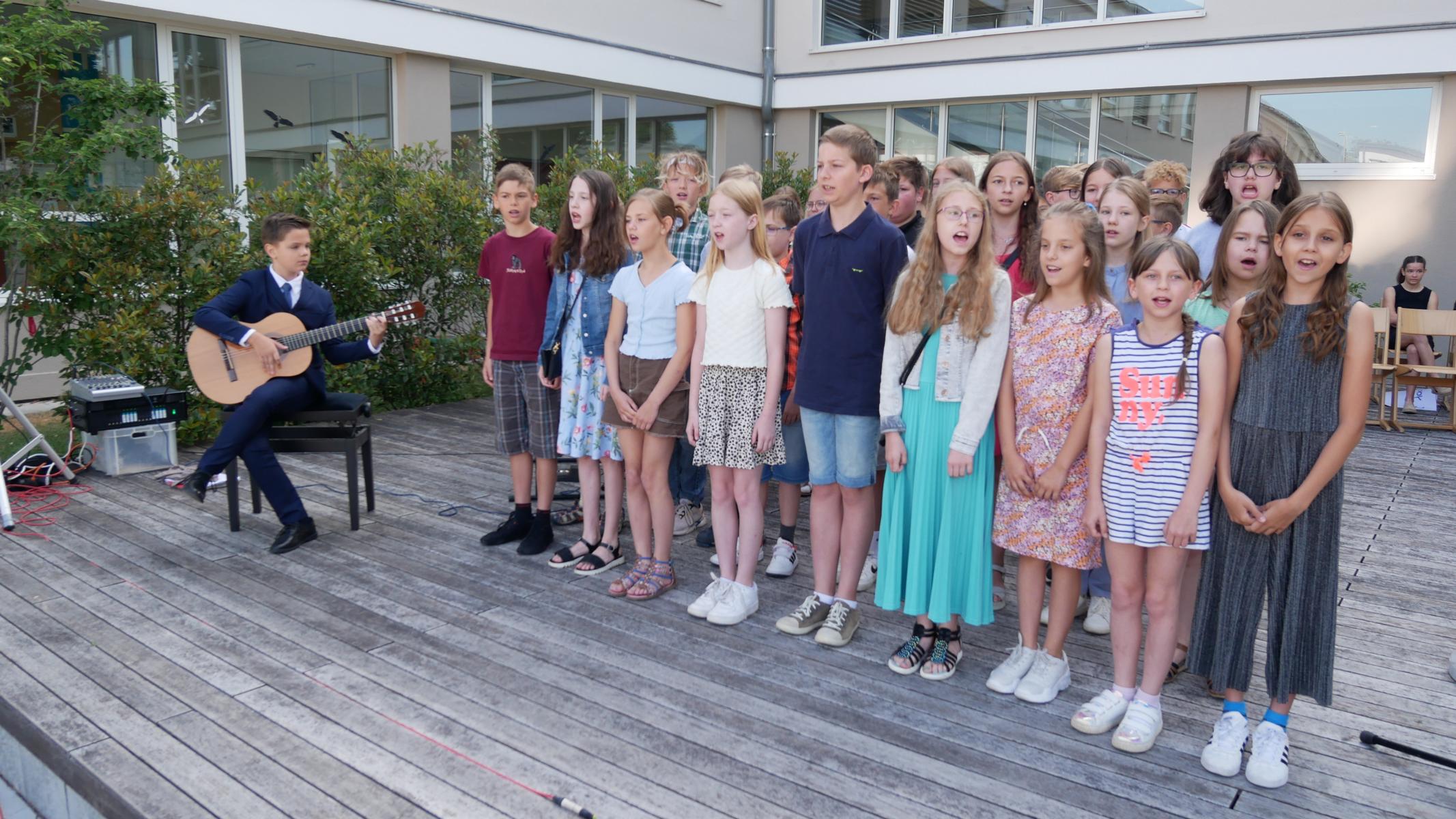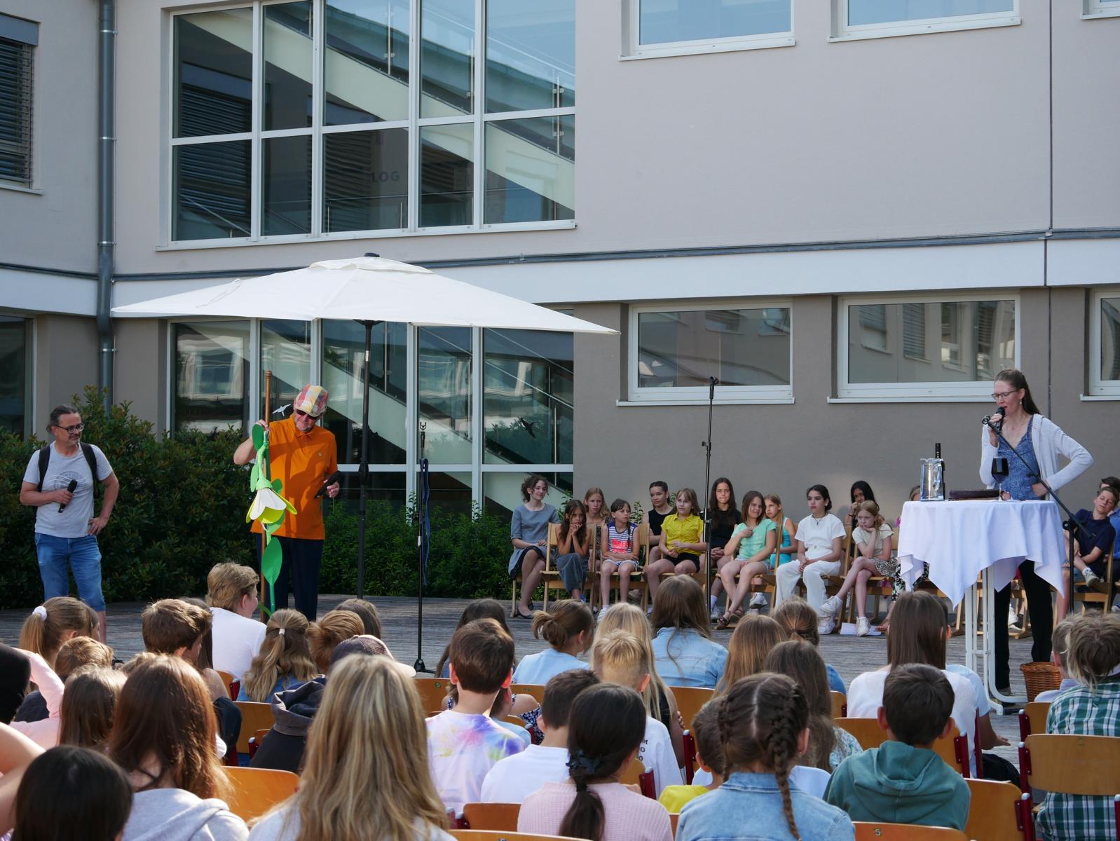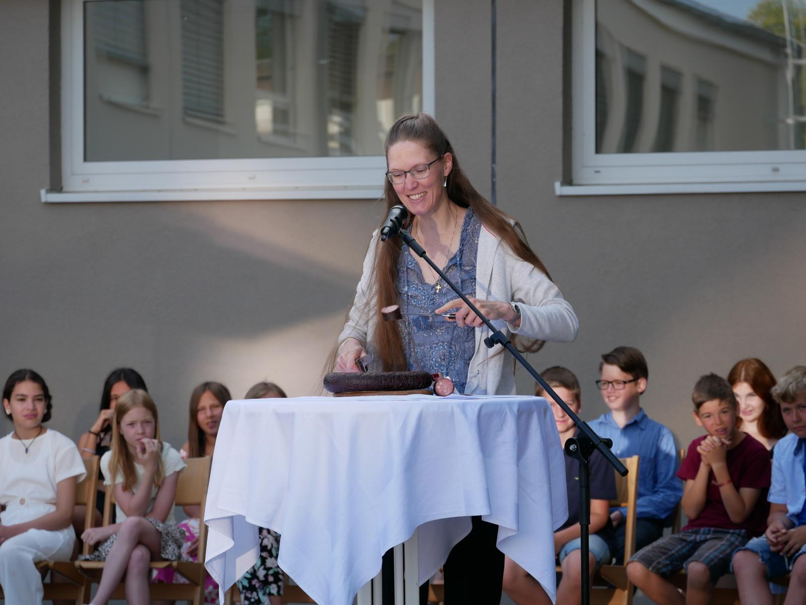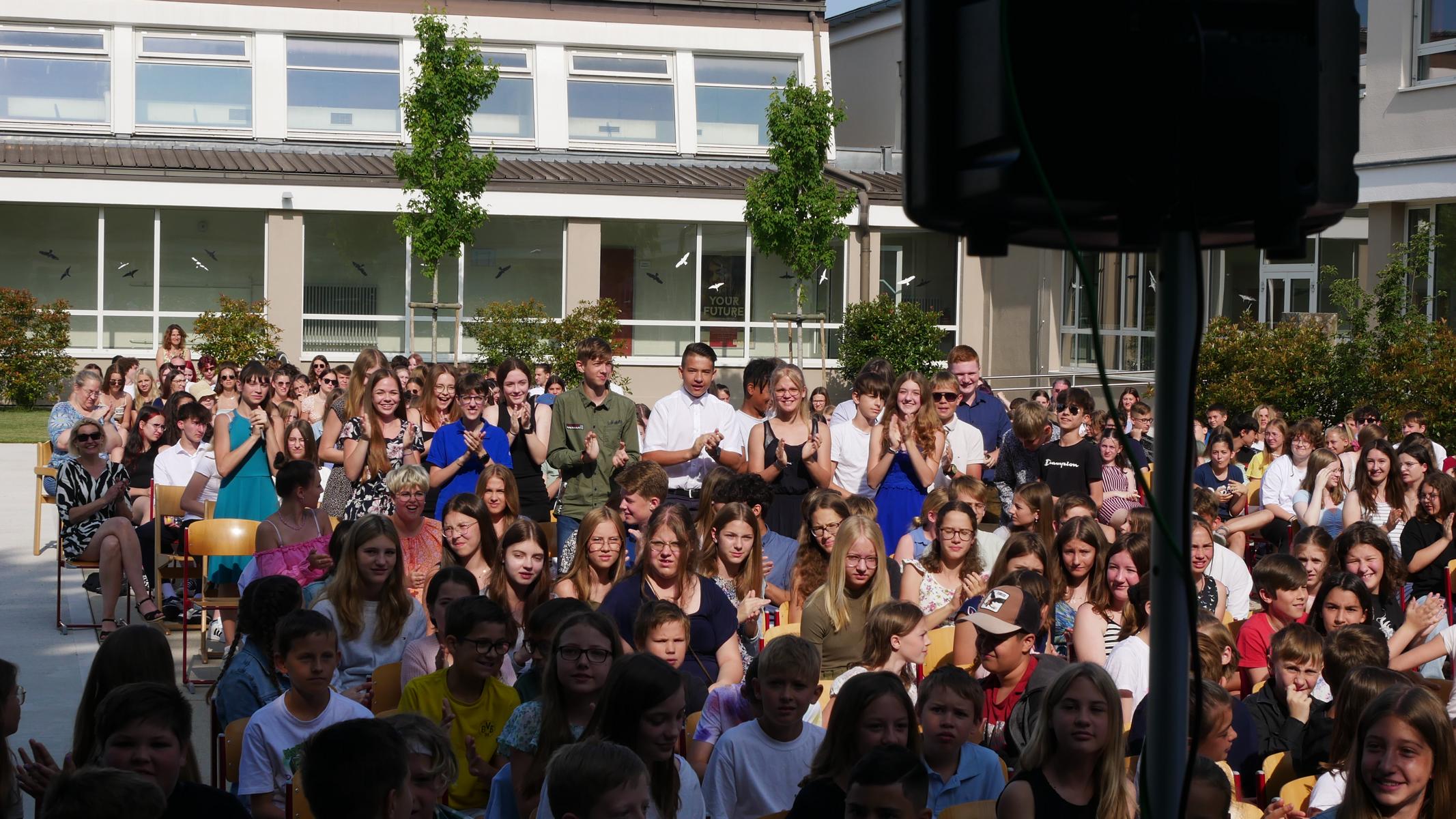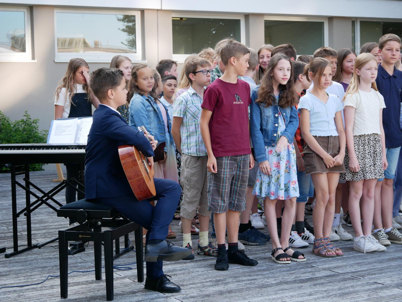 Dank des schönen Wetters konnte der Schulabschluss wieder draußen gefeiert werden. Mag. Theresa Gudenus kürte die Sieger der gestrigen Olympischen Spiele, Mag. Peter Schnaubelt und Mag. Brigitte Eschelmüller bedankten sich bei den fleißigen Schülern, die während des ganzen Schuljahres in der Bibliothek mithalfen und Direktor Ableidinger übergab die Urkunden zu den Teilprüfungen des Unternehmerführerscheins. MMag. Stephanie Sift gestaltete mit ihrem Schulchor den Gottesdienst.