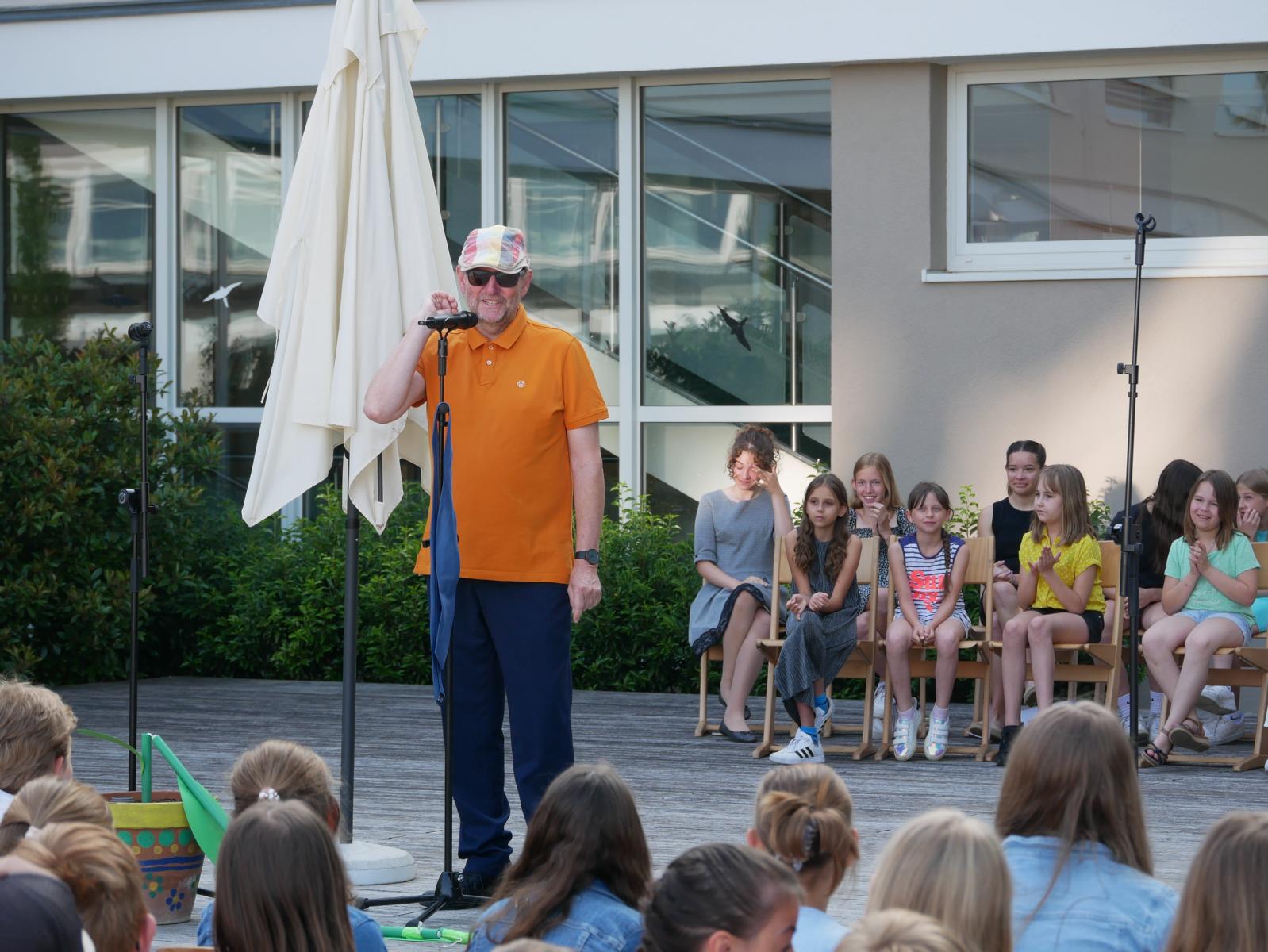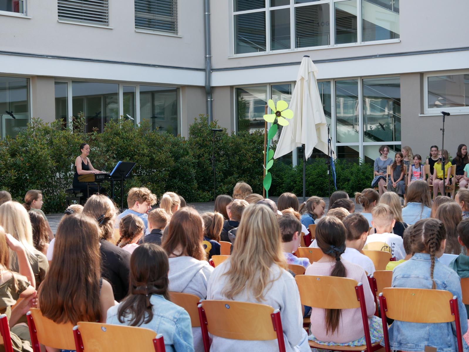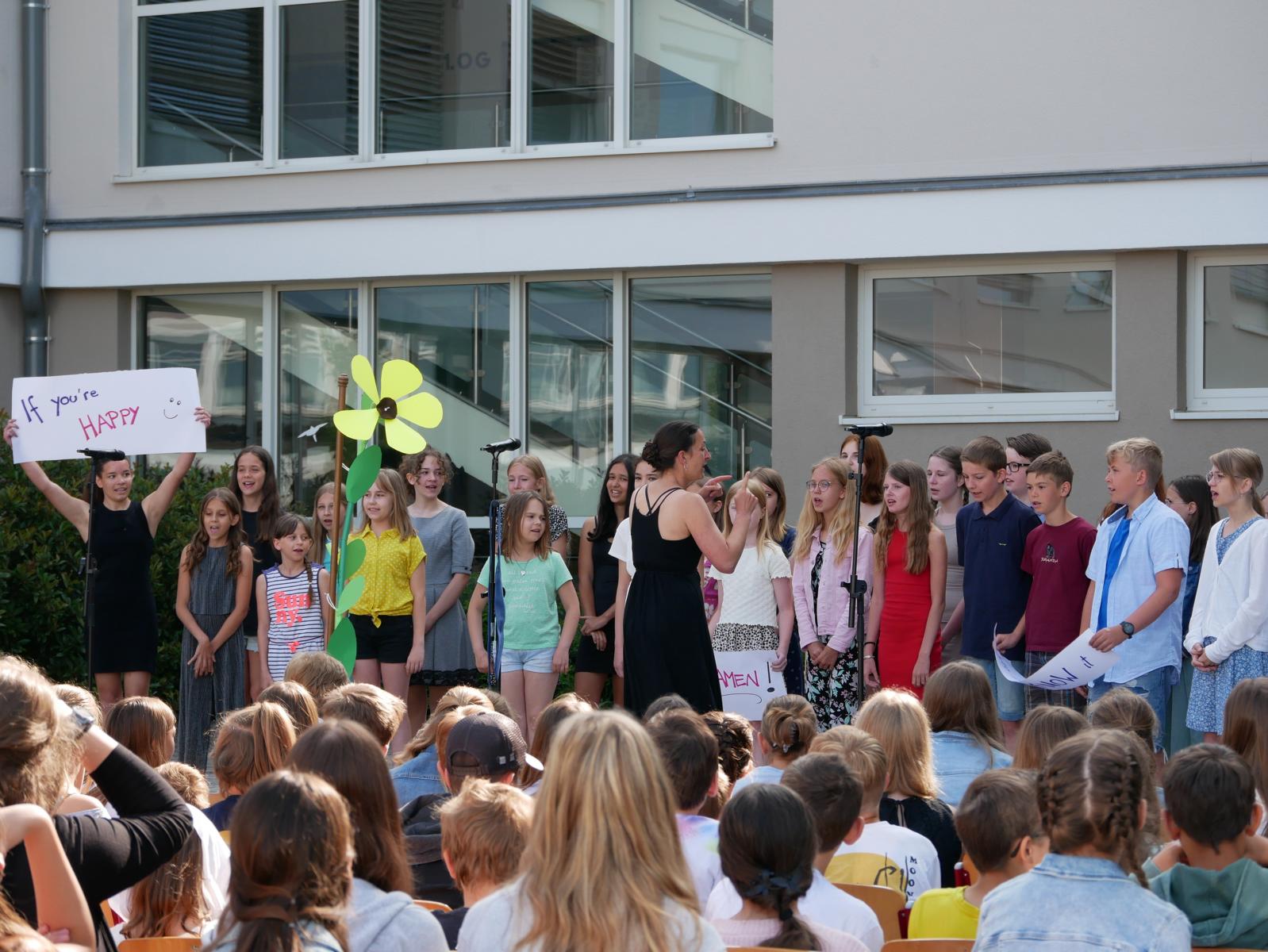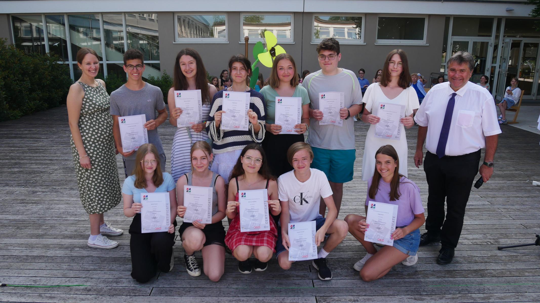 Dank des schönen Wetters konnte der Schulabschluss wieder draußen gefeiert werden. Mag. Theresa Gudenus kürte die Sieger der gestrigen Olympischen Spiele, Mag. Peter Schnaubelt und Mag. Brigitte Eschelmüller bedankten sich bei den fleißigen Schülern, die während des ganzen Schuljahres in der Bibliothek mithalfen und Direktor Ableidinger übergab die Urkunden zu den Teilprüfungen des Unternehmerführerscheins. MMag. Stephanie Sift gestaltete mit ihrem Schulchor den Gottesdienst.