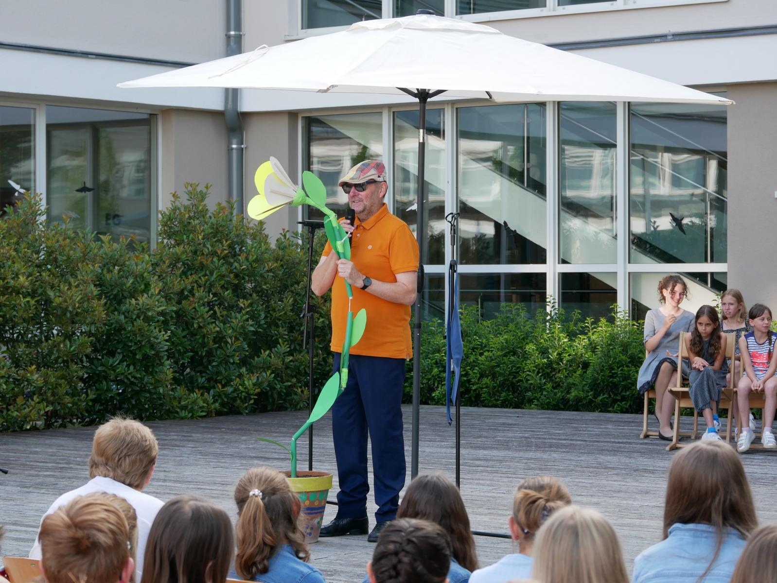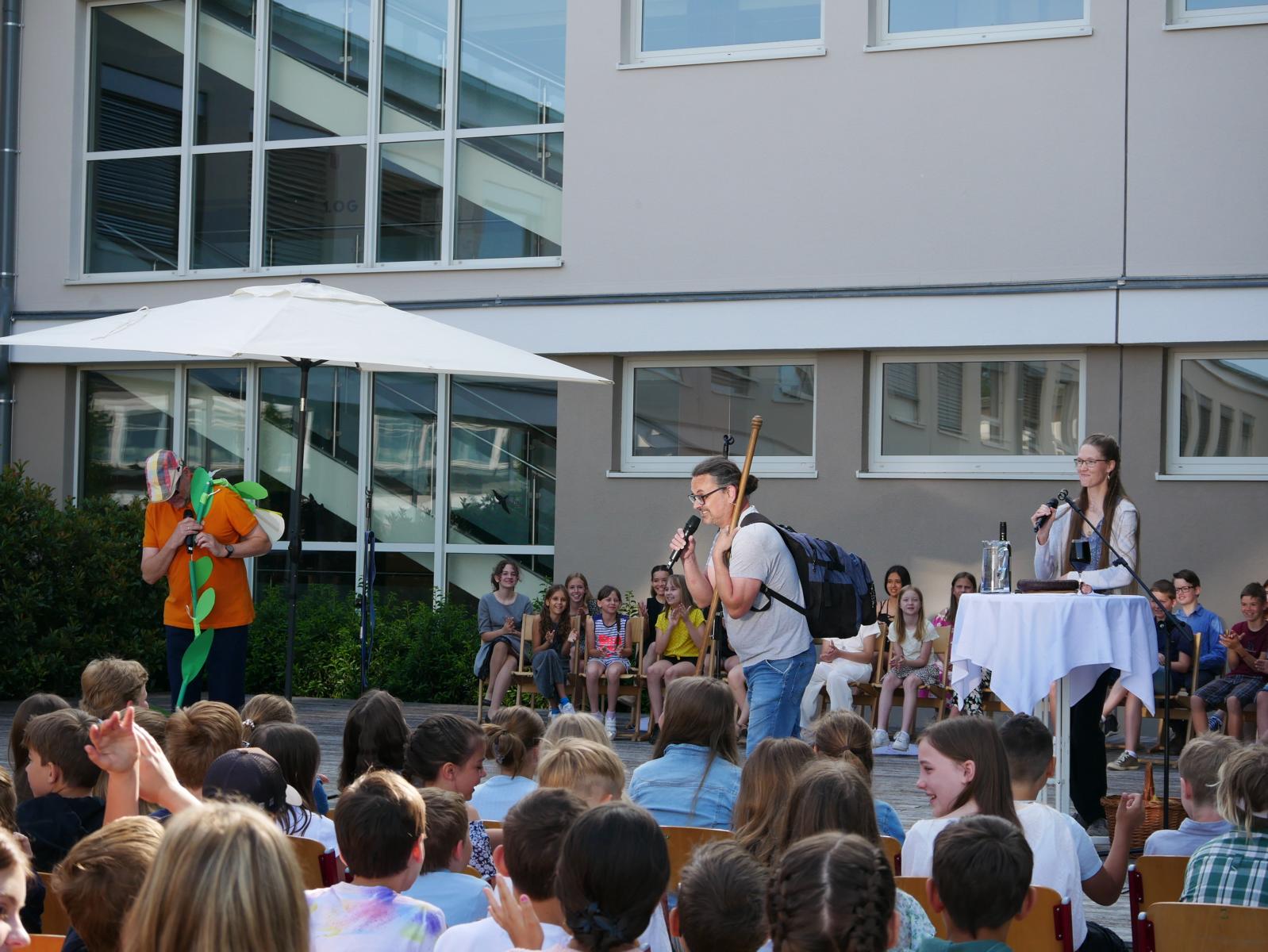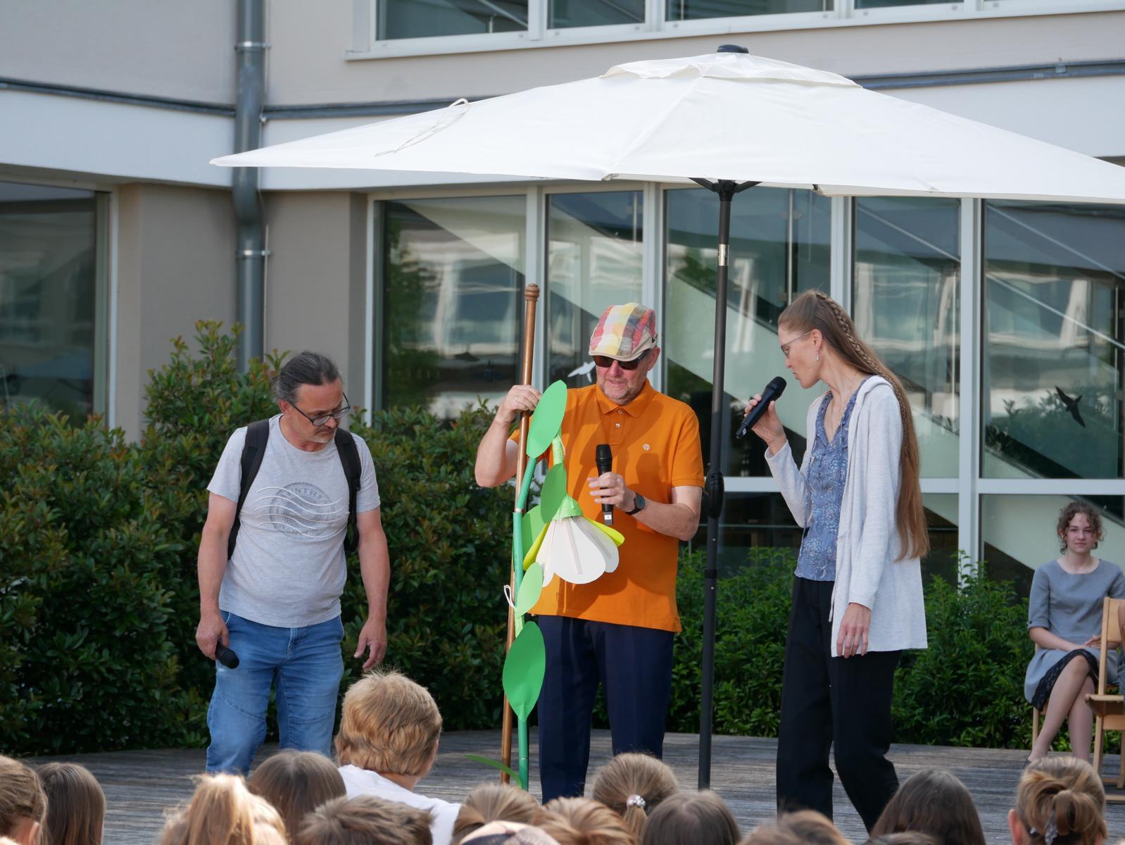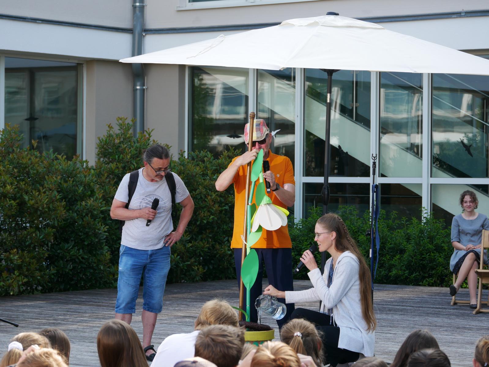 „Meine Blume ist mir das Wichtigste im Leben“ – „Für mich gibt’s eigentlich nur das eine: Essen.“ – „Und ich bin am liebsten allein unterwegs zu meinem Pilgerziel.“ So begann der „spirituelle Sketch“ der drei Religionslehrer Mag. Christan Jordan, MMag. Manuela Kopper und Mag. Jürgen Reiter beim heurigen Schulgottesdienst. Schließlich kamen die drei aber dann doch zum Schluss, dass es zusammen schöner ist und man mehr schafft, wenn jeder einbringt, was er kann und was er hat. So konnte die erst am Boden liegende Blume doch noch gemeinsam aufgerichtet werden. Und als sie dann noch Licht dran ließen, konnten sie sie sogar zum Erblühen bringen. Helft zusammen und vertraut auf euch selbst, war die Botschaft, mit der sie unsere Jugendlichen in die Ferien schickten.