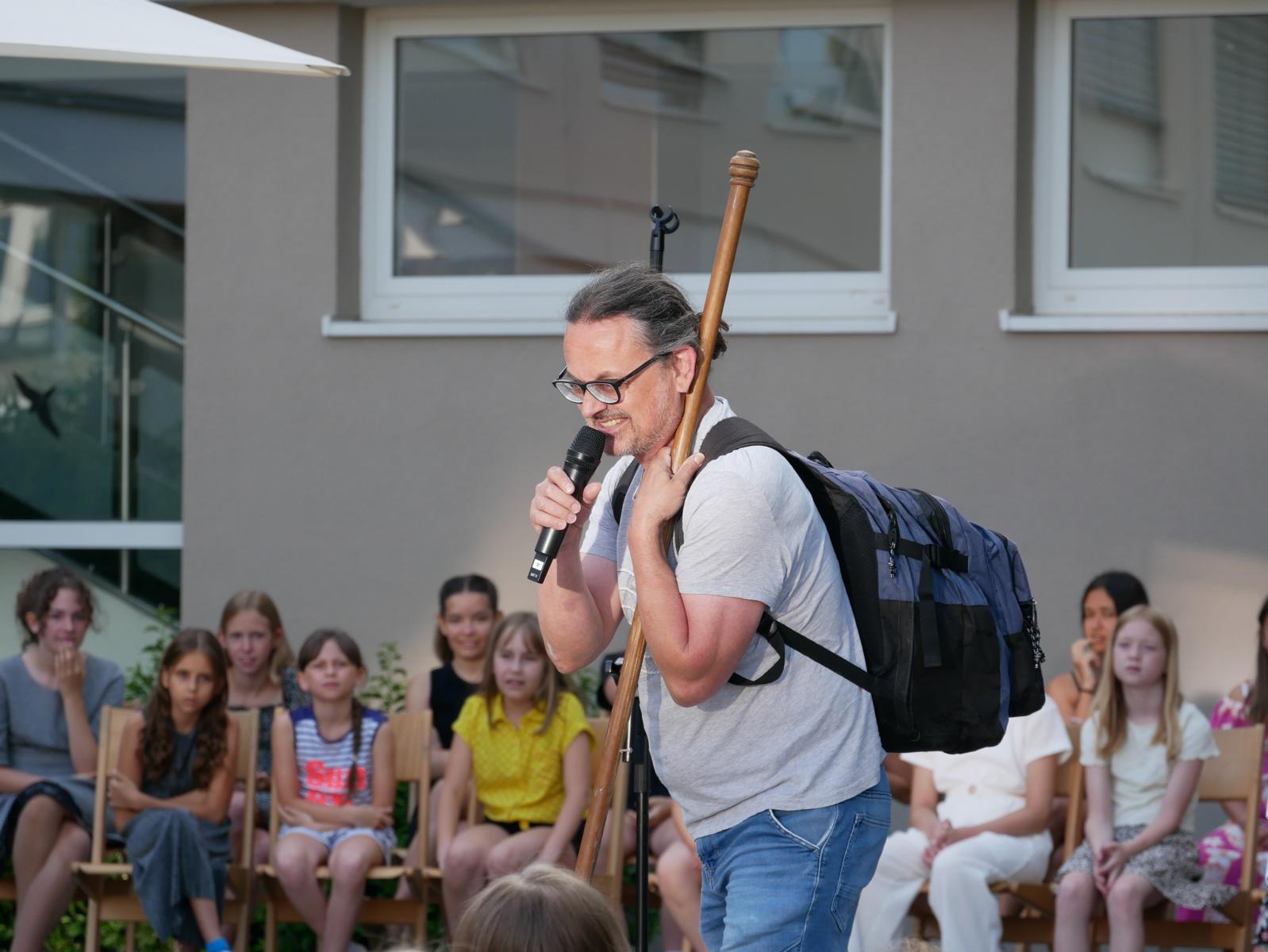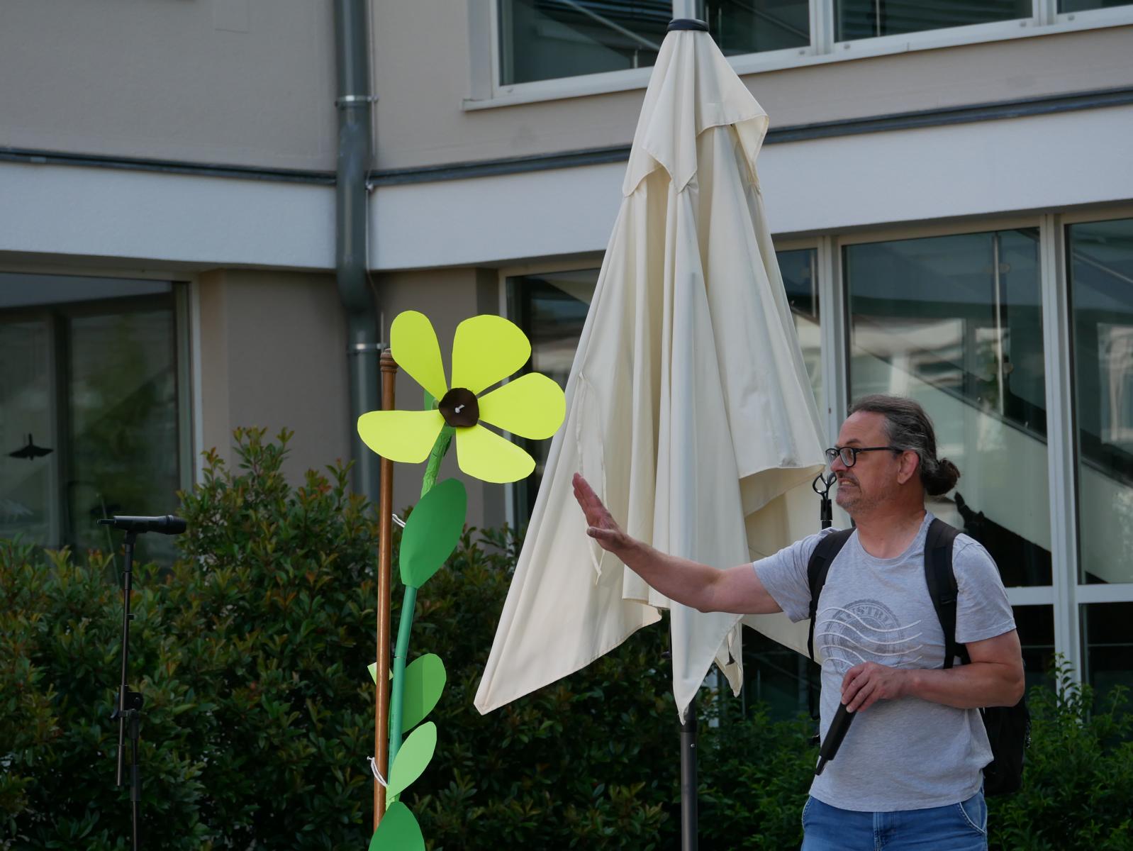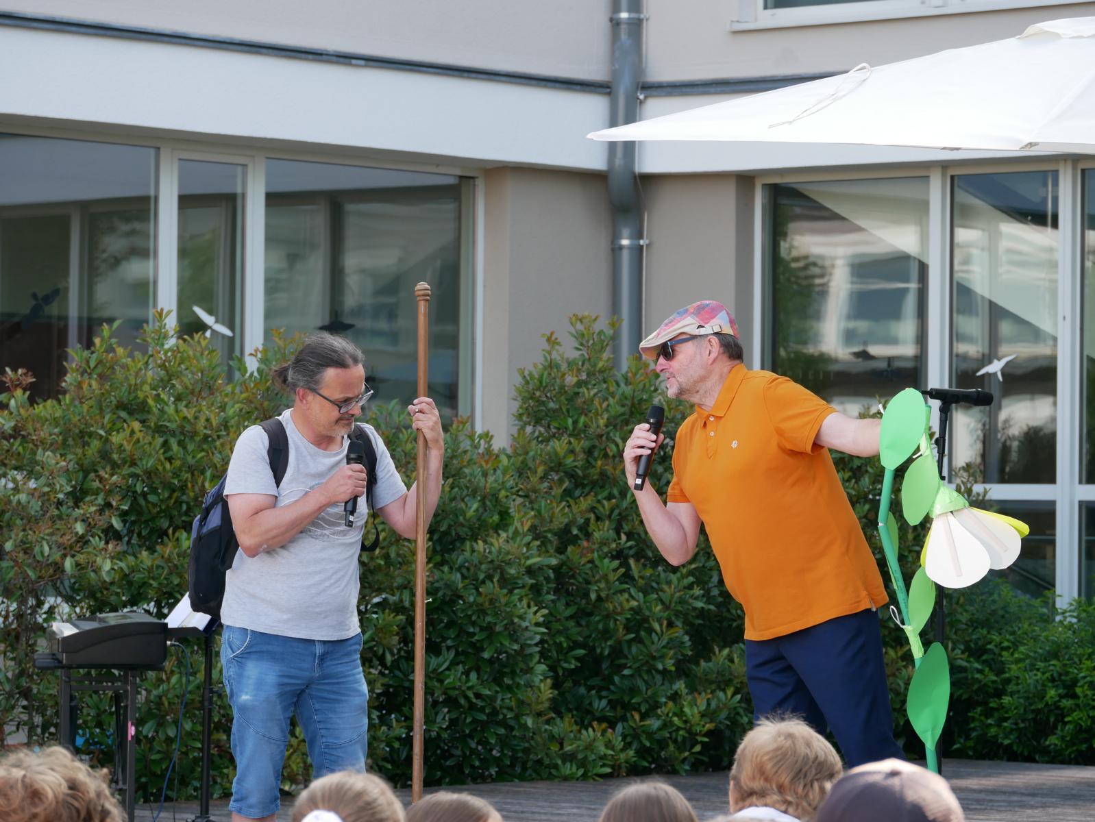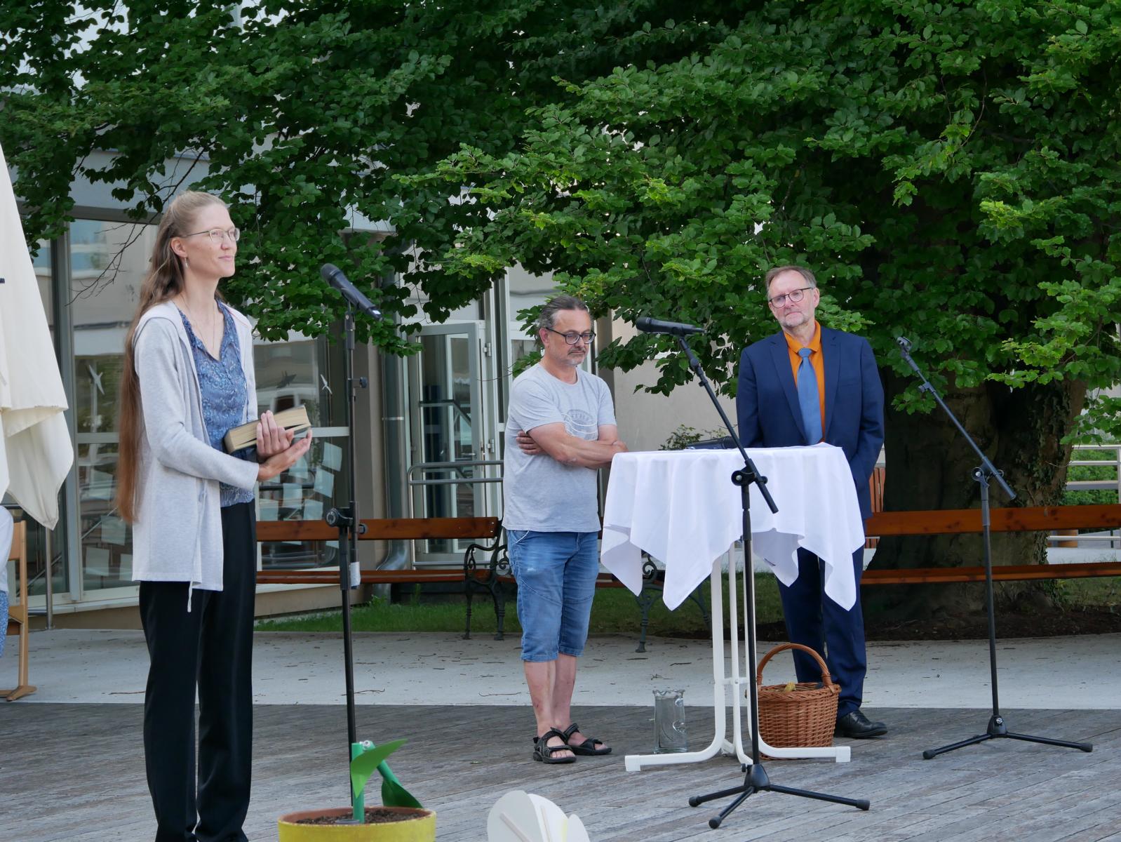 „Meine Blume ist mir das Wichtigste im Leben“ – „Für mich gibt’s eigentlich nur das eine: Essen.“ – „Und ich bin am liebsten allein unterwegs zu meinem Pilgerziel.“ So begann der „spirituelle Sketch“ der drei Religionslehrer Mag. Christan Jordan, MMag. Manuela Kopper und Mag. Jürgen Reiter beim heurigen Schulgottesdienst. Schließlich kamen die drei aber dann doch zum Schluss, dass es zusammen schöner ist und man mehr schafft, wenn jeder einbringt, was er kann und was er hat. So konnte die erst am Boden liegende Blume doch noch gemeinsam aufgerichtet werden. Und als sie dann noch Licht dran ließen, konnten sie sie sogar zum Erblühen bringen. Helft zusammen und vertraut auf euch selbst, war die Botschaft, mit der sie unsere Jugendlichen in die Ferien schickten.