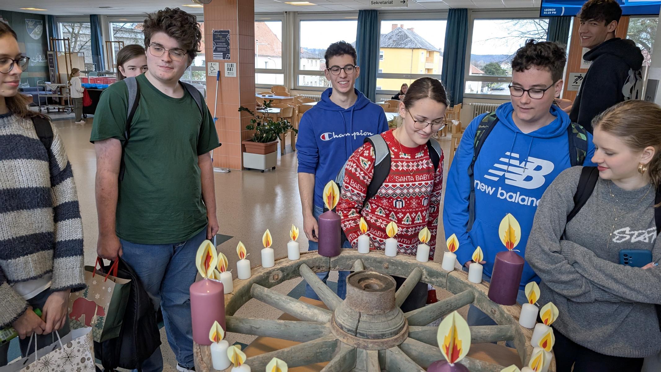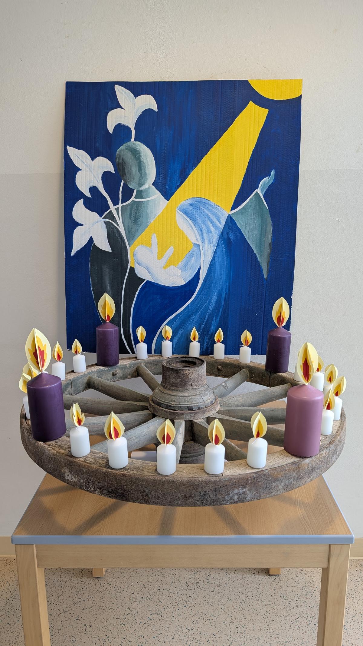 Mit jeder Klasse bastelten wir in den Wochen vor Weihnachten eine kleine Flamme und an jedem Dezembertag durfte eine Klasse mit ihrer Flamme eine Kerze an einem Wagenrad-Adventkalender „entzünden“, der dem allerersten Adventkranz von vor fast 100 Jahren nachempfunden ist, auf dem für jeden Adventsonntag eine große und für die Tage dazwischen eine kleine Kerze angebracht war. Diesen Adventkranz wählten wir auch als Mittelpunkt für unsere beiden Weihnachtsstunden.