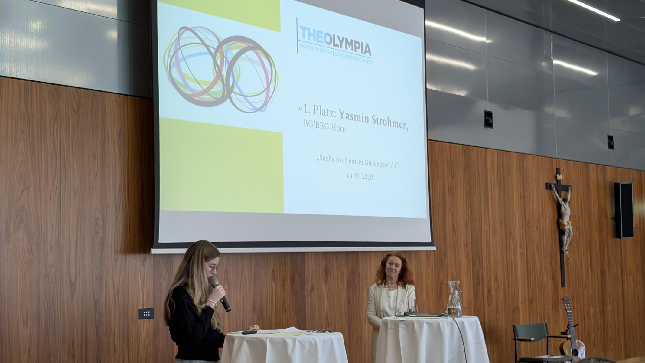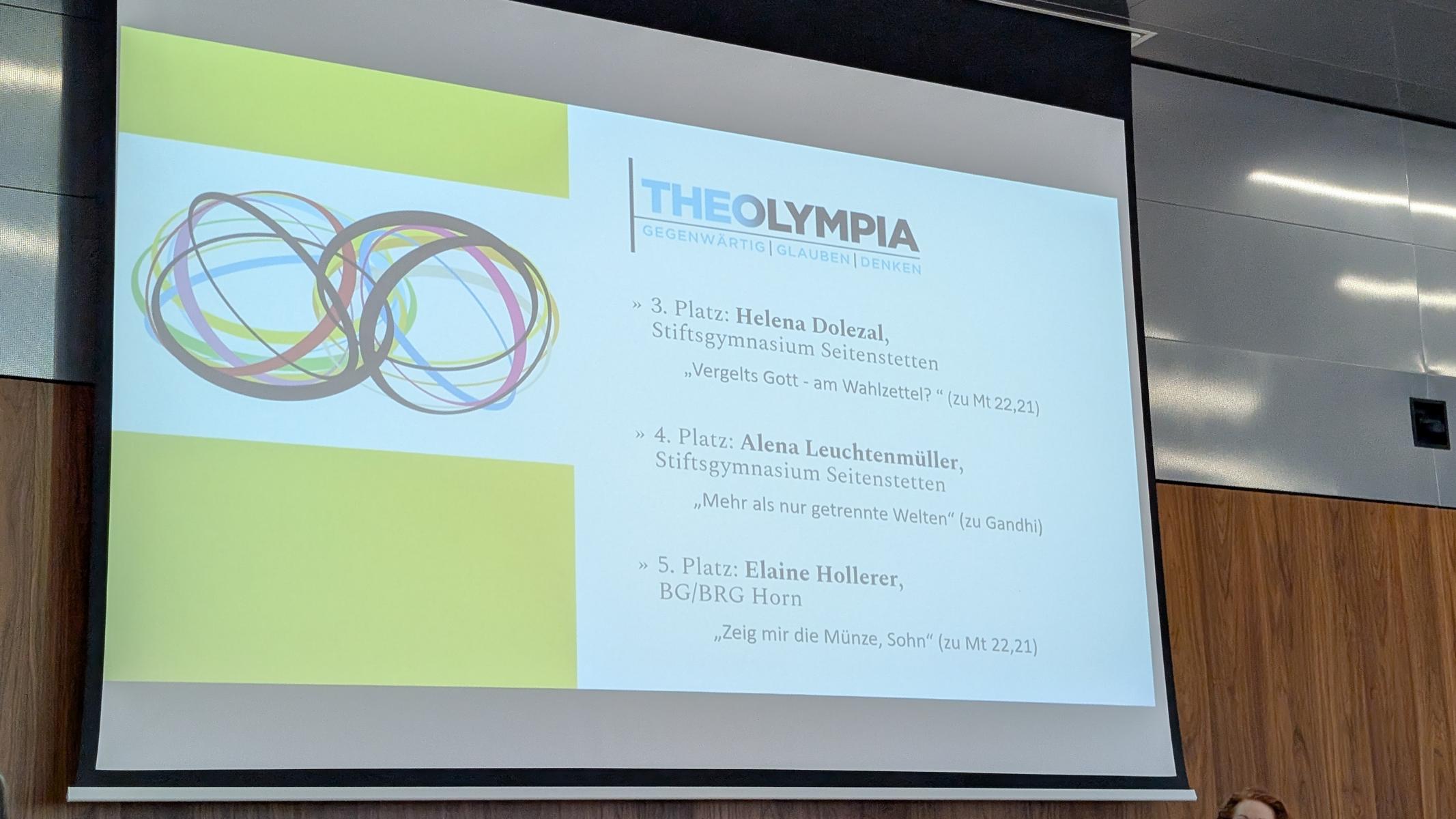Noch erfolgreicher schnitt das Gymnasium beim Essaywettbewerb Theolympia ab, der unter dem Motto „Unheilige Allianz oder heilige Pflicht – Religion und Politik“ stand. In der Diözese St. Pölten erreichte Elaine Hollerer den fünften Platz, Johanna Reiter belegte Rang zwei und Yasmin Strohmer (alle 8a) wurde für ihren Essay sogar mit dem ersten Platz ausgezeichnet. Ihre Religionslehrerin war Manuela Kopper.