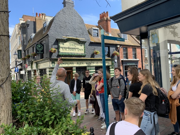 Um 14 Uhr, nach einem „ambulanten“ Mittagssnack treffen wir wieder Simon. Mit seinem lustigen südamerikanischen Akzent führt er uns mit vielen unterhaltsamen Insidergeschichten, zum Beispiel warum das dreimalige Berühren einer zugemauerten Tür in den „Lanes“ ewige Liebe bzw Freundschaft bringen soll, durch Brighton. Natürlich dürfen da der Pier und der Royal Pavilion nicht fehlen. Wow, sind die drei Stunden schnell vergangen!