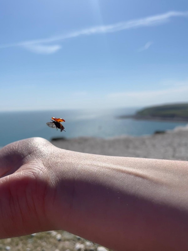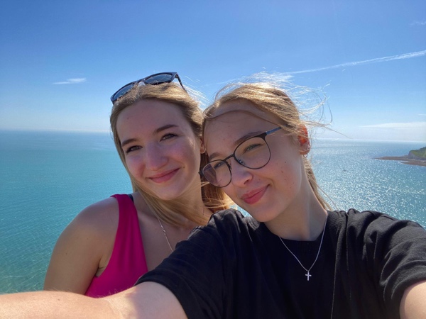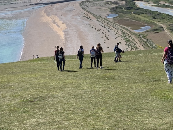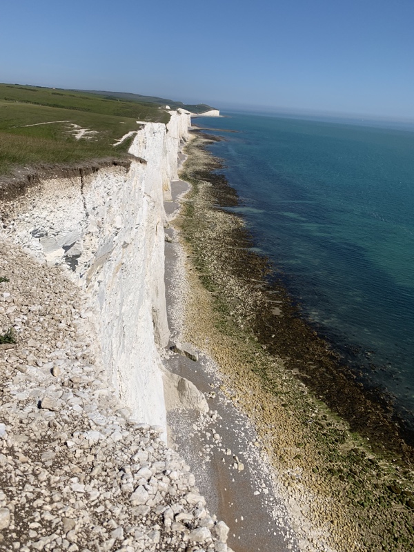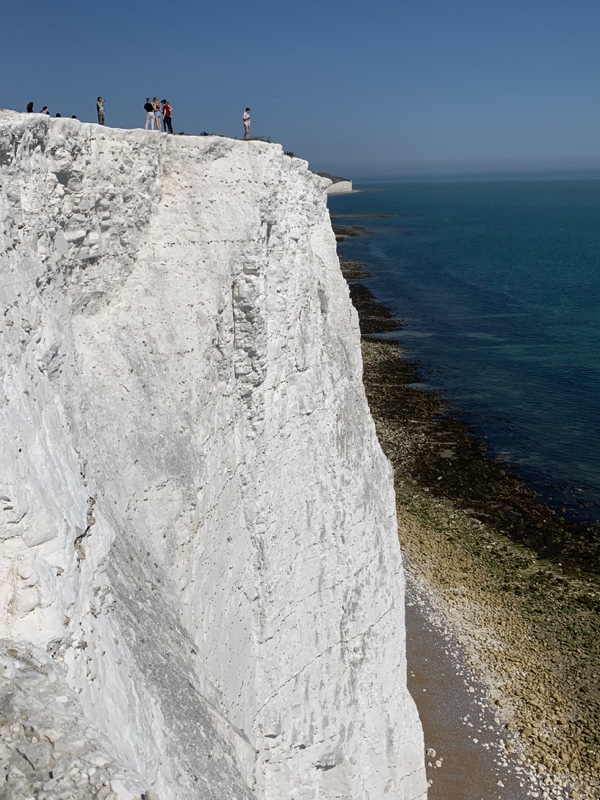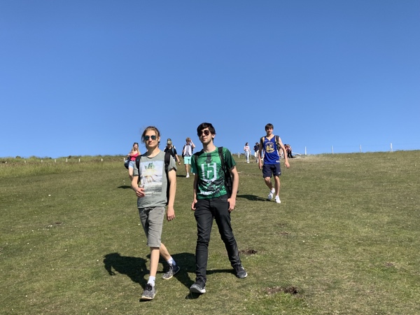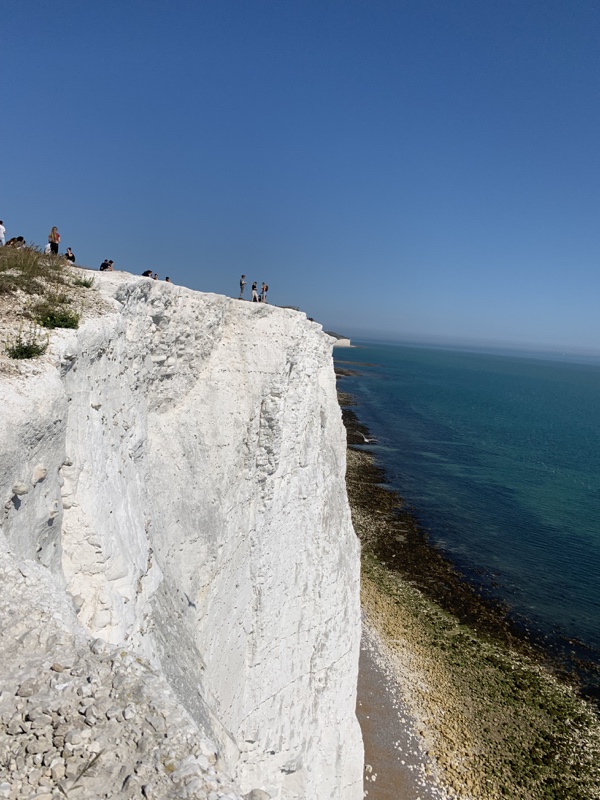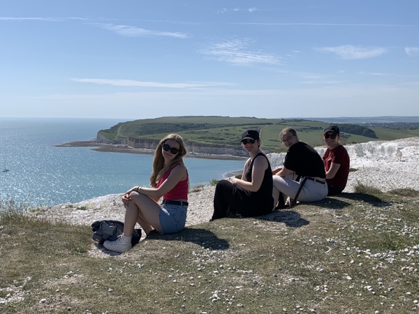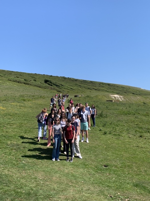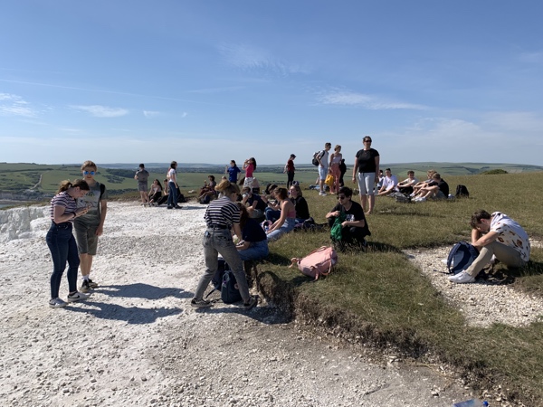 Am Nachmittag ist eine Wanderung zu den „Seven Sisters“ geplant. Um nicht alle 33km von Brighton zu Fuß gehen zu müssen, zwängen wir uns in einen überhitzten öffentlichen Doppeldeckerbus und fahren ein Stunde durch die malerische Landschaft der South Downs. Die letzten ca 2 km bewältigen wir bei doch recht hohen Temperaturen und strahlendem Sonneschein zu Fuß. Oben angekommen werden wir durch den beeindruckenden Ausblick auf die Klippen, das Meer und die Landschaft belohnt. Auch für die Mädels ist dies eine willkommene Gelegenheit sich ins Bild zu setzen.