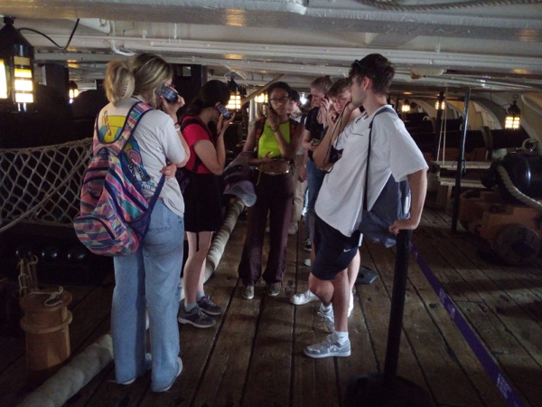 Aufgrund von Restaurierungsarbeiten ist die HMS Victory leider hinter einem Gerüst versteckt aber mit dem Audioguide ausgestattet, erfahren wir viel Interessantes über das Schiff und seine berühmteste Schlacht bei Trafalgar unter Admiral Nelson. Wir können uns jetzt besser vorstellen, wie die Lebensbedingungen unter Deck im frühen 18. Jht gewesen sein müssen – für unsere großgewachsenen Mitschüler ist die Besichtigung eine echte Herausforderung!