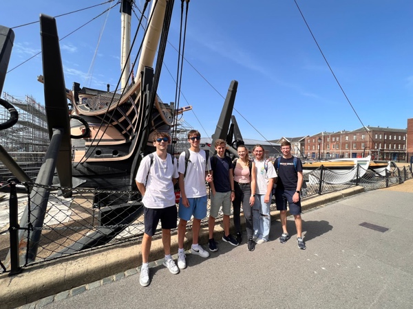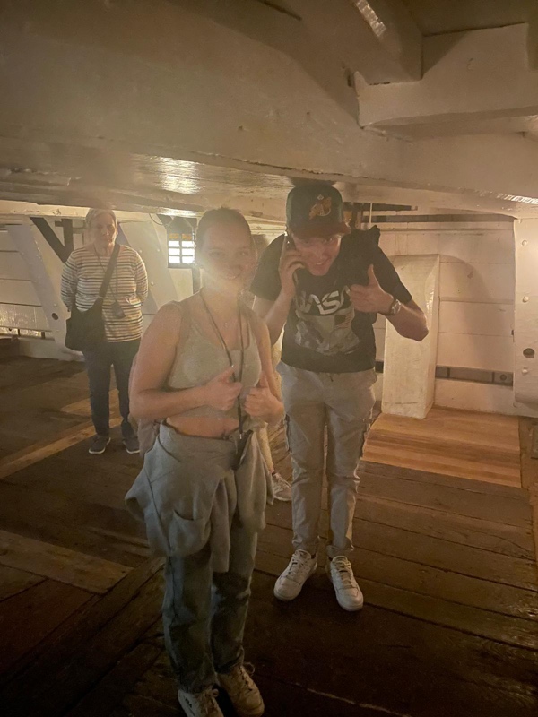 Tag 4. Der letzte Tag in der Schule muss heute „leider“ um eine Stunde verkürzt werden. Wieder lockt eine Gruppe von uns das schöne Wetter während des Unterrichts hinaus an den Strand. Schließlich bekommen wir alle für unsere tollen Englischkenntnisse ein Zertifikate der Schule. Jetzt geht’s ab nach Portsmouth mit dem Zug von Hove Station. Nach etwas mehr als einer Stunde durch die südenglische Landschaft, kommen wir dann in Portsmouth Harbour an. Um in die Dock Yards zu gelangen wo die HMS Victory und weitere historische Schiffe der Britischen Marine liegen, werden unsere Rucksäcke penibel untersucht.