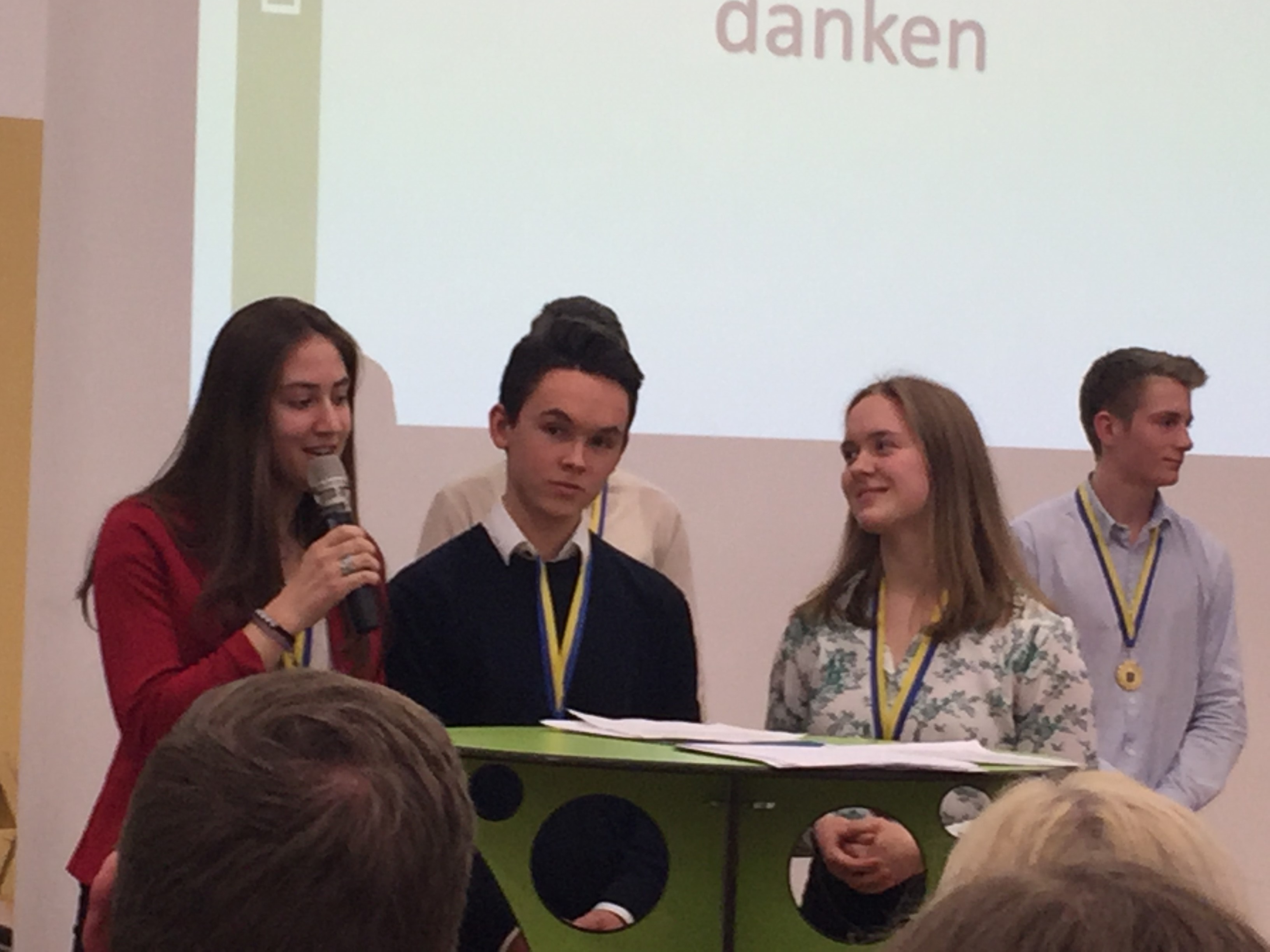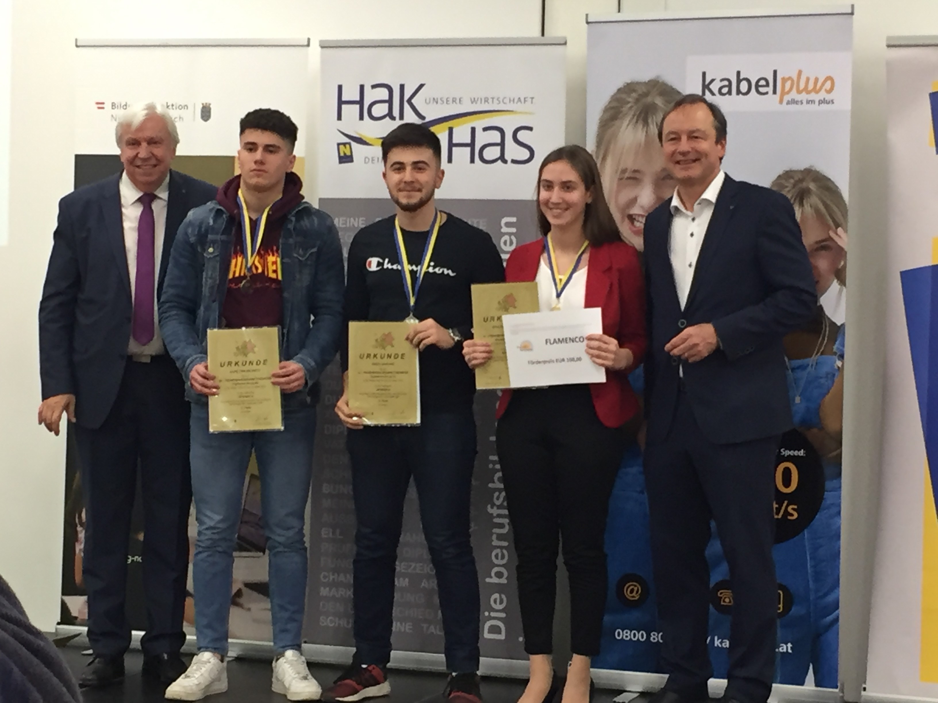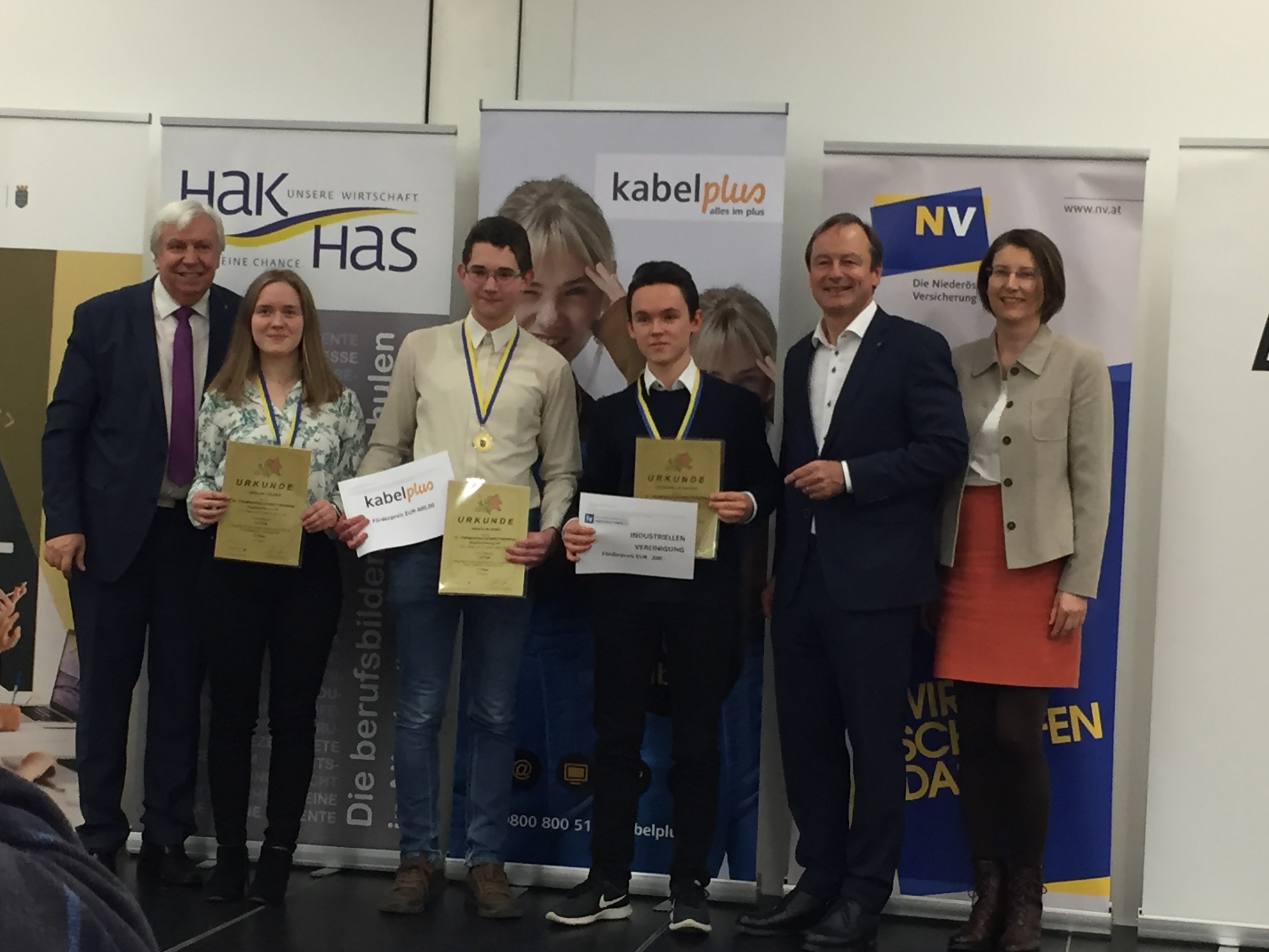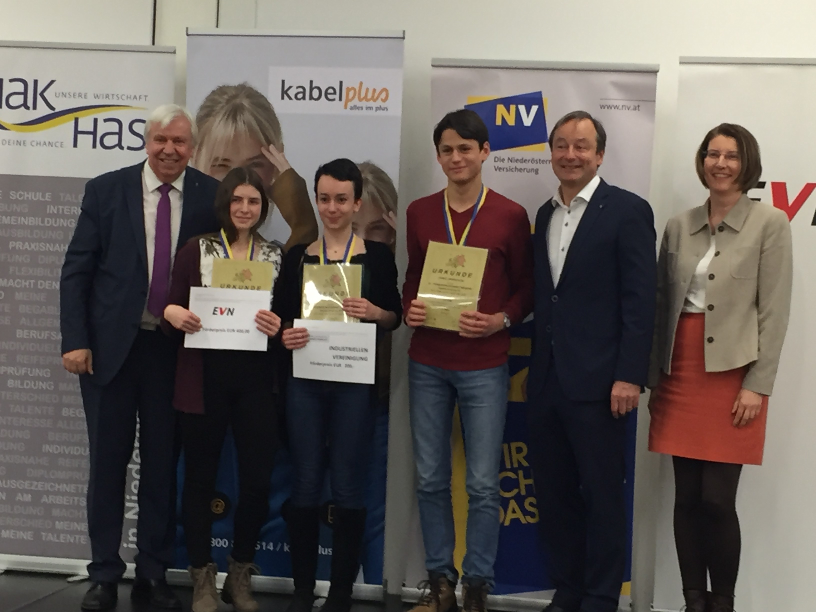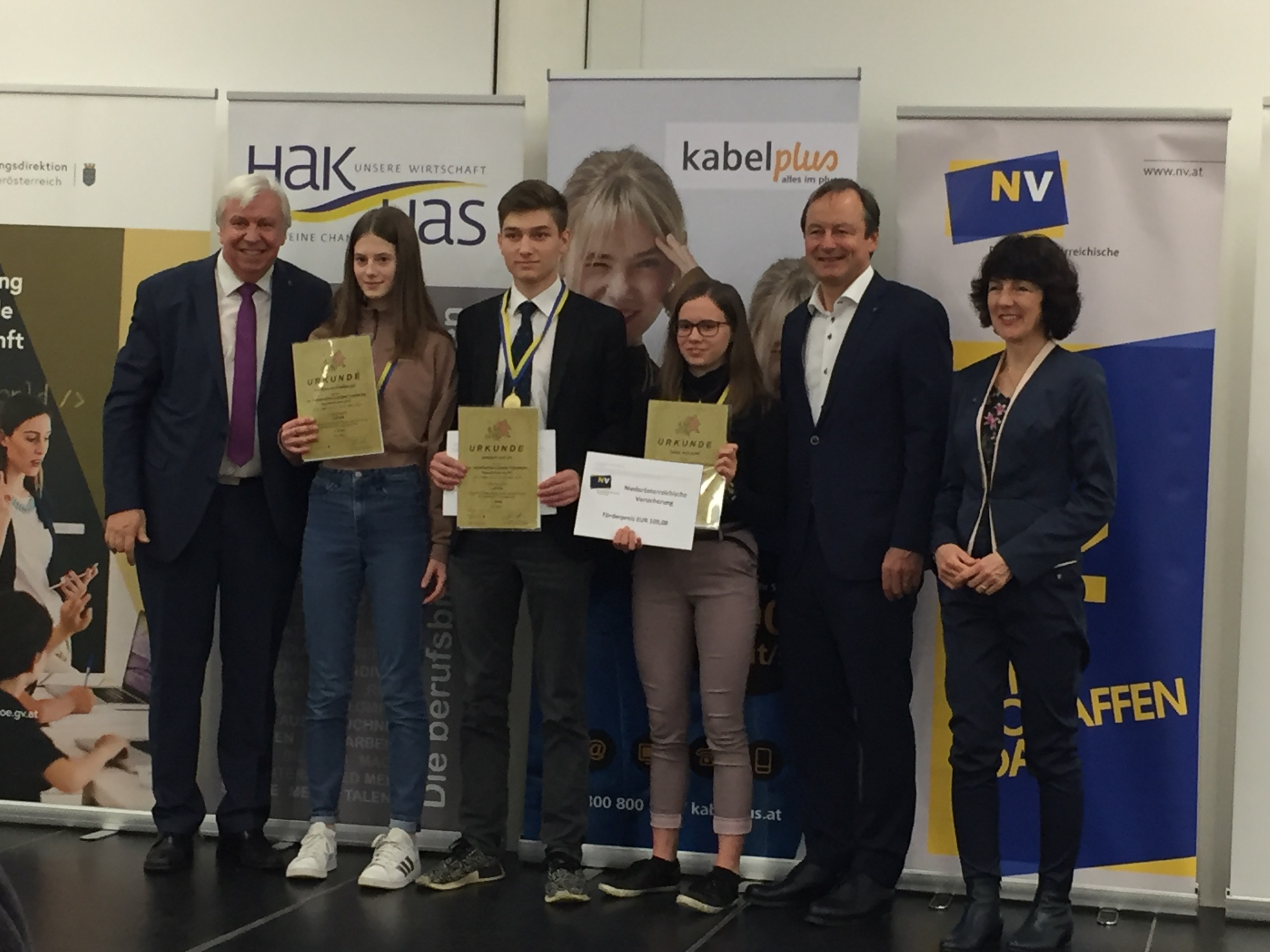 Am 5. 3. 2020 fand die Siegerehrung im Beisein von Hofrat Mag. Johann Heuras im Bundesschulzentrum St. Pölten statt. In seiner Rede zeichnete der Bildungsdirektor für Niederösterreich folgendes Bild: „Jede und jeder erhält am Tag seiner/ihrer Geburt Zettel und Bleistift mit auf den Lebensweg. Was man im Laufe seiner Ausbildung darauf schreibt, was man im Leben daraus macht, liegt an jeder/jedem Einzelnen.“ Auch die Rolle der Lehrerinnen und Lehrer wurde betont. Caroline Gruber, Leonhard Patoschka und Marlene Wazlawik waren gebeten worden, bei den Dankesworten der Schülerinnen und Schüler eine kurze Rede zu halten. Fließend zwischen fünf Sprachen (Deutsch, Engl., Lat., Franz., Span.) hin und her wechselnd lieferten sie einen sehr beeindruckenden Auftritt ab, der mit viel Applaus bedacht wurde. Begleitet vom Direktor und den Professorinnen konnten unsere Siegerinnen und Sieger beachtliche Geld- und Sachpreise in Empfang nehmen. Die Schulgemeinschaft des BG Horn gratuliert herzlich.