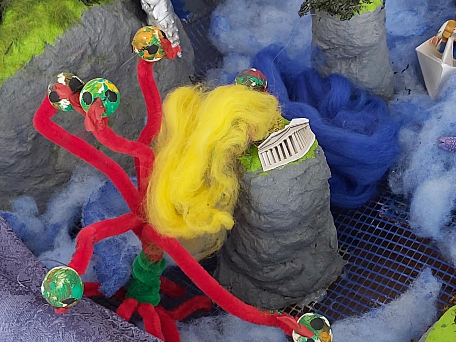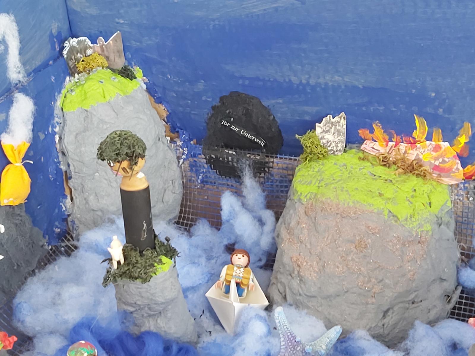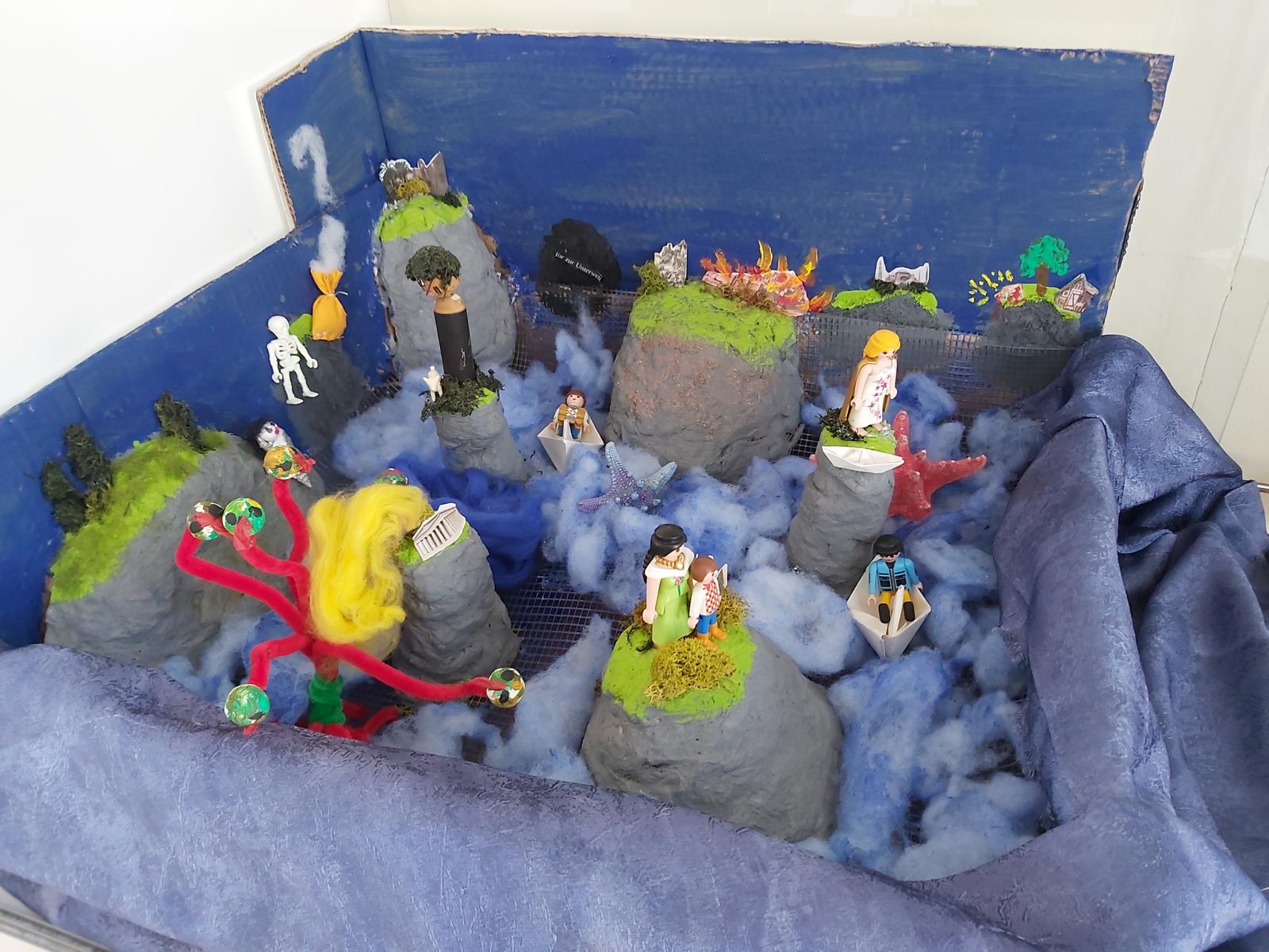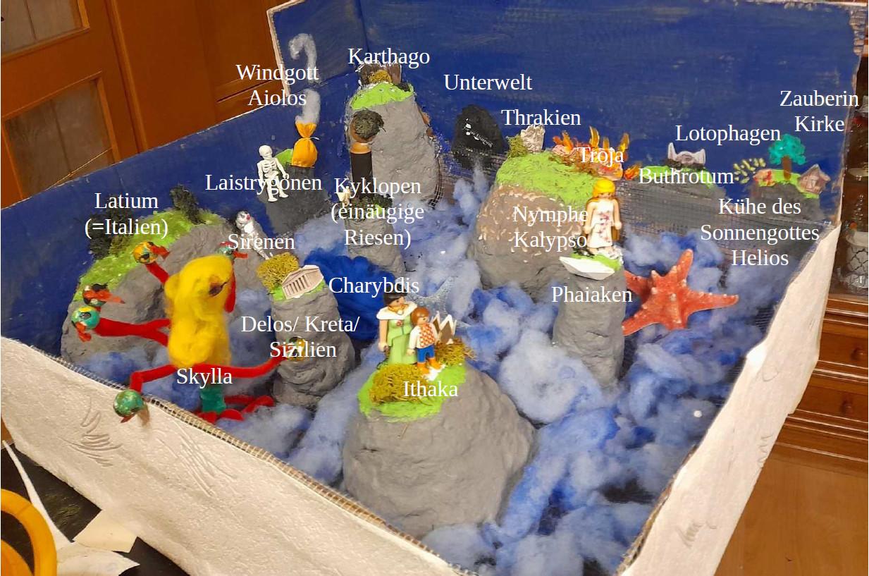 Im ersten Moment erzeugt der geforderte „Wow-Effekt“ bei mancher und manchem Stirnrunzeln, aber sobald man der Phantasie freien Lauf lässt, entstehen unglaubliche Projekte. Jedes Jahr bin ich vom kreativen Potenzial unserer Schülerinnen und Schüler aufs Neue begeistert. Jedes Jahr ist die eine oder andere Präsentationsform dabei, die bisher noch niemand eingefallen ist. Heuer zum Beispiel eine juristische Anklageschrift, mit der Hera/Iuno die Scheidung von ihrem chronisch untreuen Ehemann Zeus/Jupiter einreicht, oder die ganze Odyssee kompakt in einer großen Schachtel mit den Stationen der Irrfahrten (siehe Bilder).