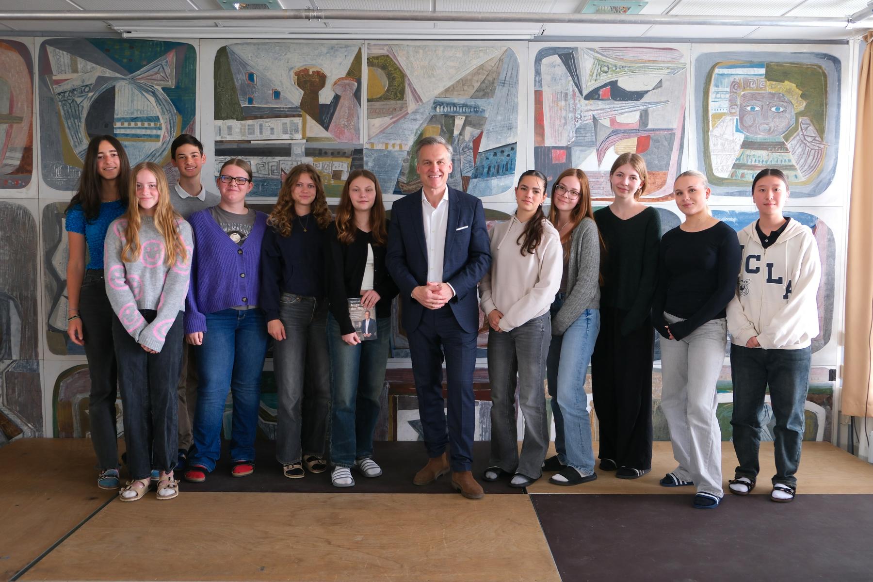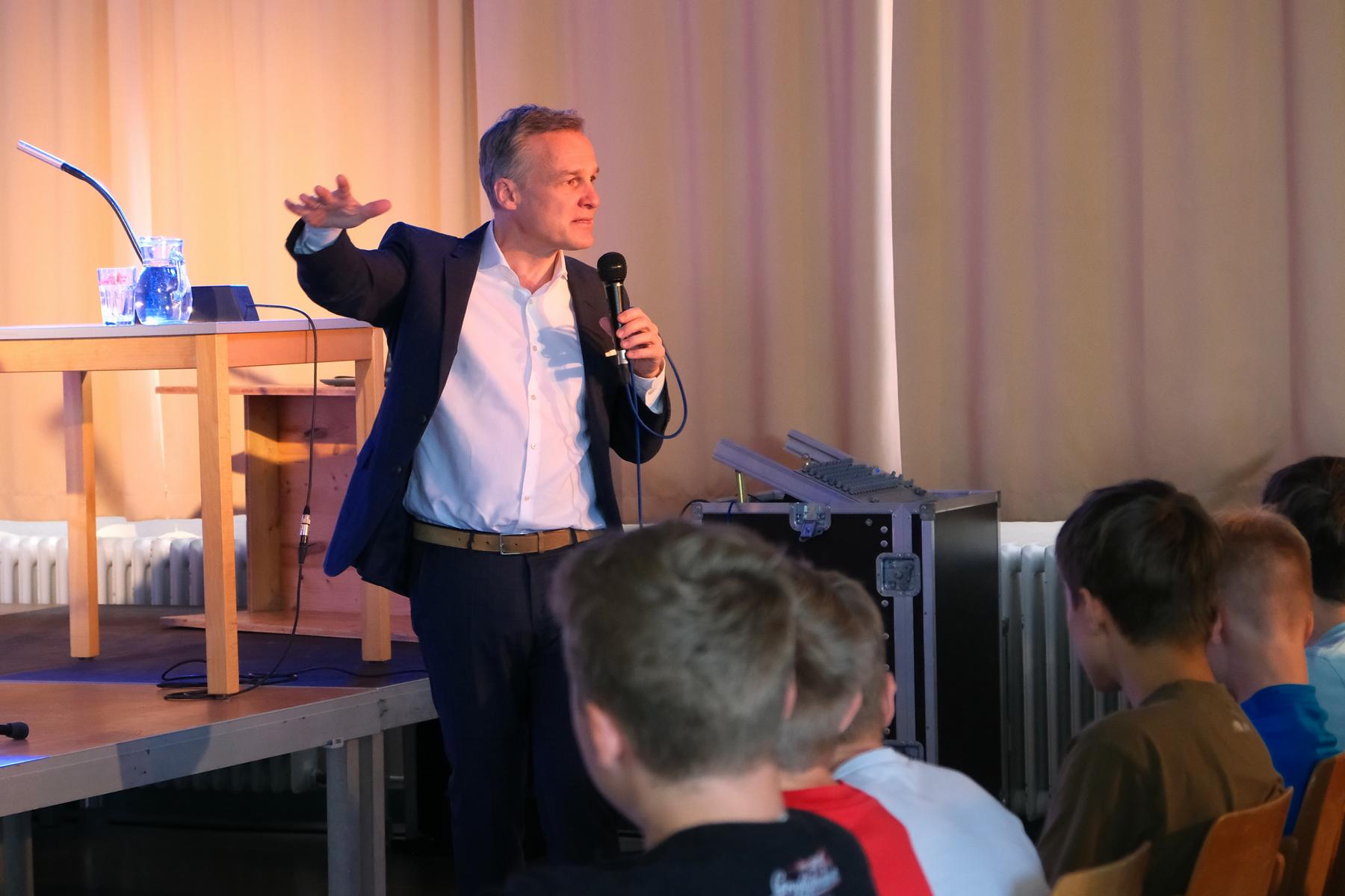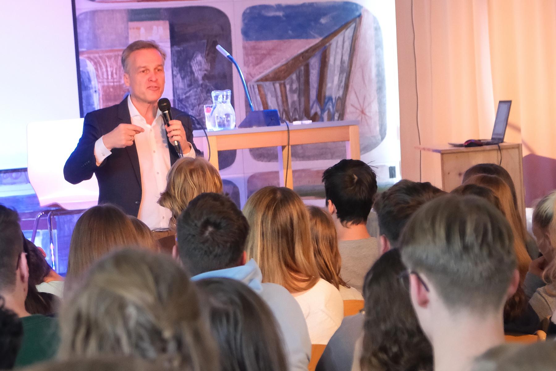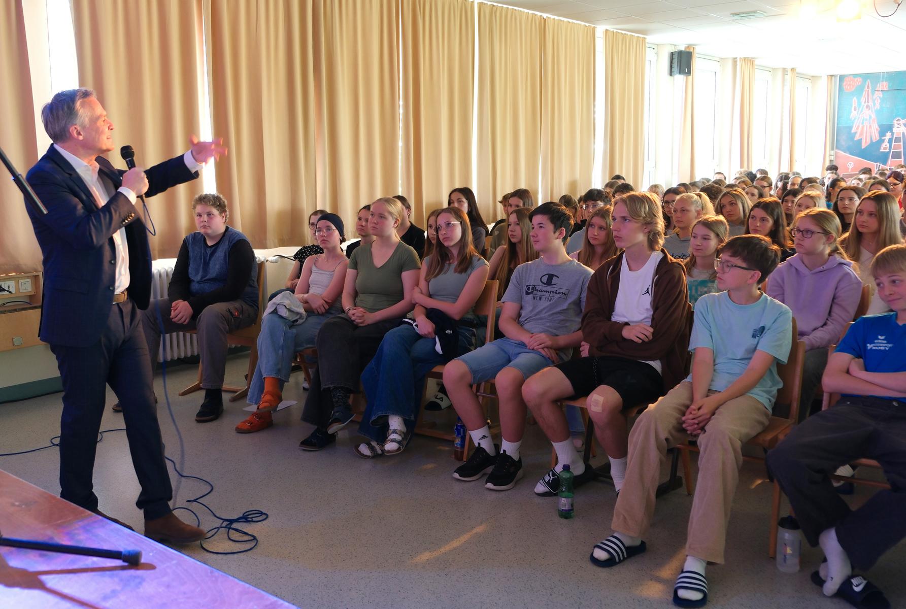 Mittlerweile ist es zu einer guten Tradition geworden, dass ich nicht nur literarische Lesungen für die verschiedenen Schulstufen organisiere, sondern einen zweiten Schwerpunkt auch auf die politische Bildung lege. Nach Armin Wolf, Miriam Beller und Paul Krisaj in den letzten beiden Jahren war diesmal der ZiB 1-Moderator, Journalist und Autor Tarek Leitner an unserer Schule zu Gast. Er hielt eingangs einen Vortrag voller Beispiele aus seiner reichen Erfahrung zum Thema der Rolle der Medien in der heutigen Zeit, um sich anschließend den zahlreichen Fragen unserer 4. bis 7. Klassen zu stellen.