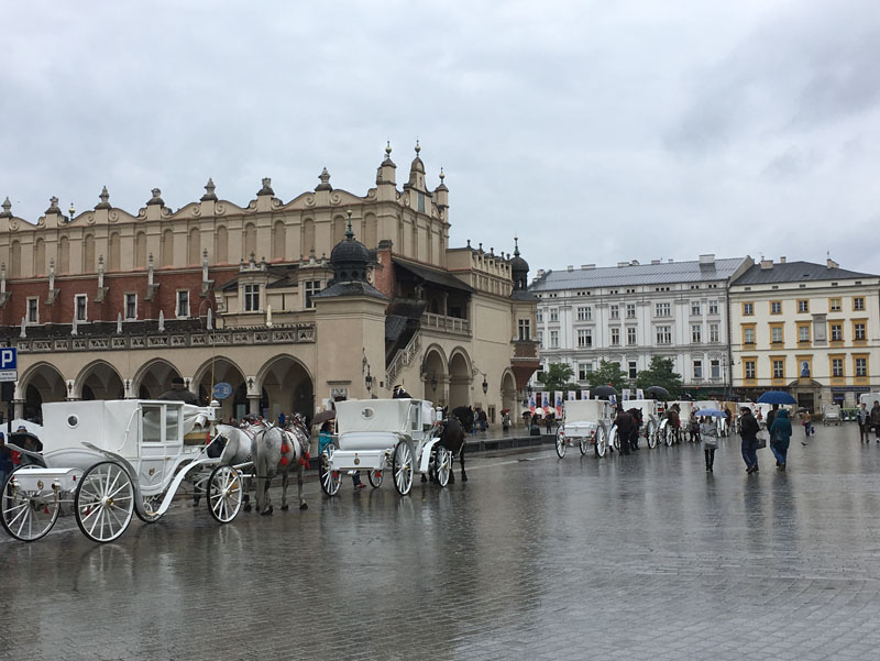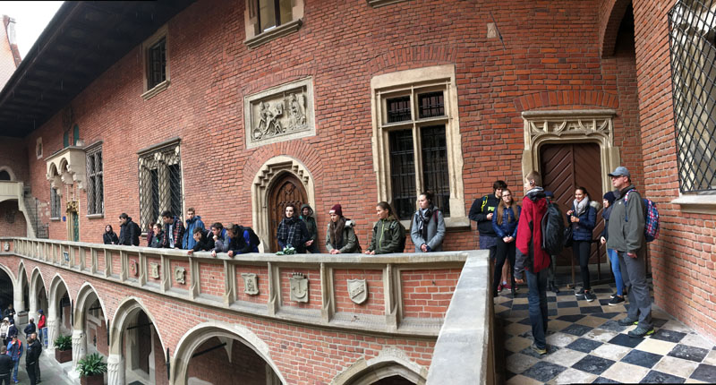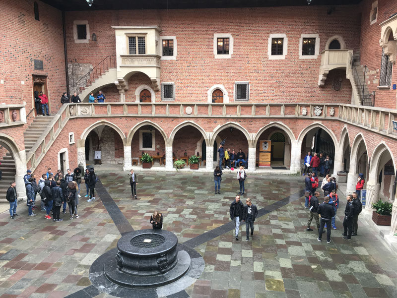 Am Morgen des fünften Oktobers hatten wir erstmals das Vergnügen, das deftige Frühstück im Hotel Piast genießen zu dürfen. Nach Schinken, Bratwurst, Müsli und/oder Gebäck ging es sofort zur Straßenbahnstation, die nicht allzu weit vom Hotel entfernt war. Etwa eine halbe Stunde später fanden wir uns dann auf dem Krakauer Marktplatz wieder, dem Zentrum der Krakauer Altstadt. Dort trafen wir unseren Tourguide, der uns im Laufe dieses Tages die wichtigsten Sehenswürdigkeiten zeigen sollte. Doch zunächst bekam jeder ein kleines Gerät mit Kopfhörern. Dank dieser Ausstattung hatte jeder Teilnehmer zu jeder Zeit und an jedem Ort den unaufhörlichen, aber dennoch angenehmen Plauderton des Guides im Ohr, der nicht müde wurde, die interessierten Zuhörer mit Informationen zu versorgen. Unser Weg führte uns unter anderem durch die Krakauer Tuchhallen. Wie der Name schon vermuten lässt, dienten sie vor allem dem Handel mit Stoffen, einer der wichtigsten Handelswaren in der Vergangenheit dieser Stadt. Heute werden hier Souvenirs wie zum Beispiel Bernsteinschmuck oder traditionelle Schnitzereien angeboten. Danach besuchten wir die Franziskanerkirche mit der, für die Zeit ihrer Erbauung überaus modernen Gestaltung. Für Staunen sorgte auch der wunderschöne Innenhof des „Collegium Maius“, welches das älteste Gebäude der Universität in Krakau ist. Nach einer kurzen Besichtigung des Papstfensters wurden wir in die Mittagspause entlassen, um uns eigenständig „auf Nahrungssuche“ zu begeben. Egal in welche Restaurants und Imbisse es dabei ging, für die meisten endete diese Pause entweder bei Starbucks oder in einem Costa-Café bei einem wärmenden Kaffee oder Tee. Wie durch ein Wunder fanden sich fast alle rechtzeitig am vereinbarten Treffpunkt ein und unser Guide führte uns heiteren Gemütes zum Wawelhügel, auf dem sich unter anderem die Wawel-Kathedrale und das Wawelschloss befinden. Zunächst widmeten wir unsere Aufmerksamkeit der Kathedrale, welche als polnisches Nationalheiligtum gilt. Hier liegen nicht nur viele polnische Könige, sondern auch etliche Geistliche sowie polnische Künstler und Nationalhelden begraben. Beim Schloss angekommen versuchte unser Guide uns von einer Stärkung der spirituellen Kräfte beim Chakra-Stein im Schlossinnenhof zu überzeugen. Nach einer weiteren Pause, die wir entweder auf der Suche nach Souvenirs oder abermals im einen oder anderen Café verbrachten, marschierte die Klasse zum gemeinsamen Abendessen ins Restaurant Dorota. Nicht nur die traditionelle polnische Küche, die an jenem Abend von süßen Pierogi über deftiges Gulasch bis hin zu herzhaften Kartoffelpuffern alles zu bieten hatte, überzeugte uns vom erfolgreichen Ausklang dieses Tages, es waren vor allem die rhythmischen polnischen Lieder, von unserem Guide auf der Gitarre begleitet, die beinahe jeden zum Mitsingen bewegten und die Stimmung in dem ohnehin schon gemütlichen Ambiente noch mehr hoben.