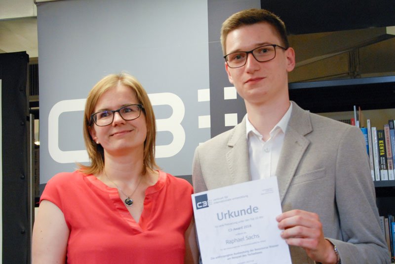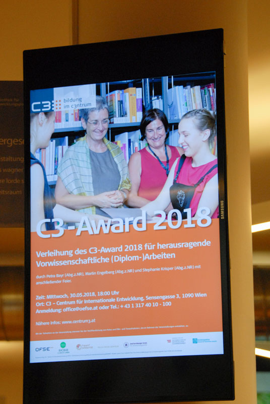 Am Mittwoch, 30.05.2018 fand die Verleihung des C3-Award im Zentrum für internationale Entwicklung in Wien statt. Raphaels VWA schaffte es von 150 eingereichten Arbeiten bis in die Endrunde der Top 9. Mit ihm freuten sich seine Eltern, Direktor Mag. Michael Ableidinger, Mag. Tina Leutgeb (Betreuerin der VWA) und Mag. Charlotte Stöger (Klassenvorstand).