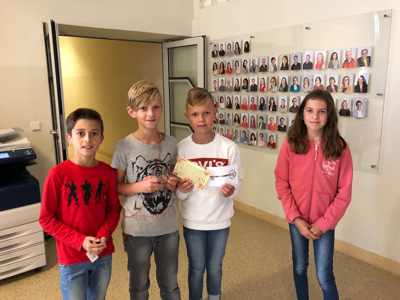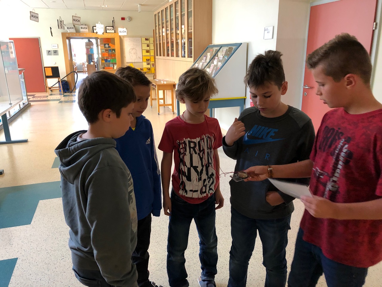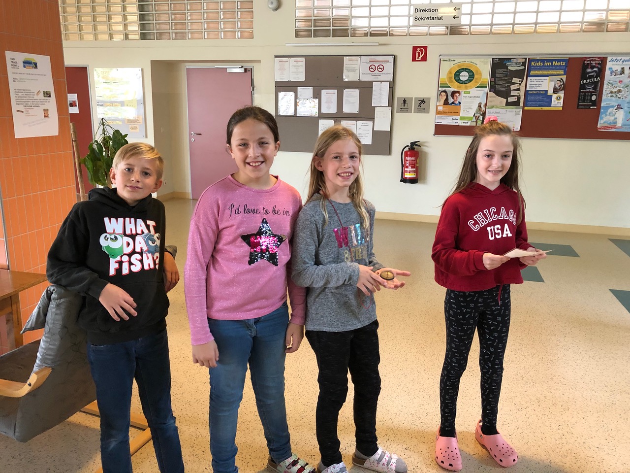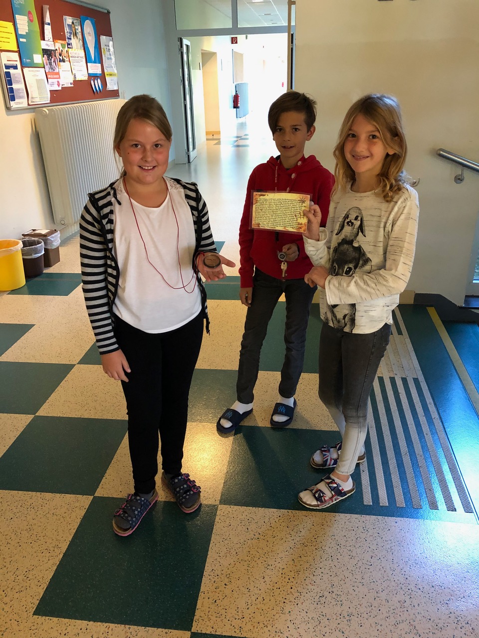 In der 1. Klasse lernen die Schülerinnen und Schüler im GWK-Unterricht über die Orientierung auf der Erde. Um die Theorie auch in der Praxis anzuwenden, nahmen die 1a und 1b an einer Kompassrallye durch das Schulgebäude teil. Mit Hilfe des Kompasses konnten die Angaben auf der Schatzkarte richtig interpretiert werden und schlussendlich wurden die Schlüssel zur gut gefüllten Schatzkiste entdeckt.