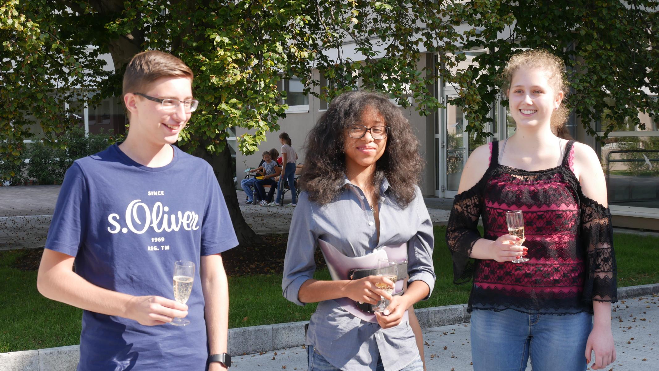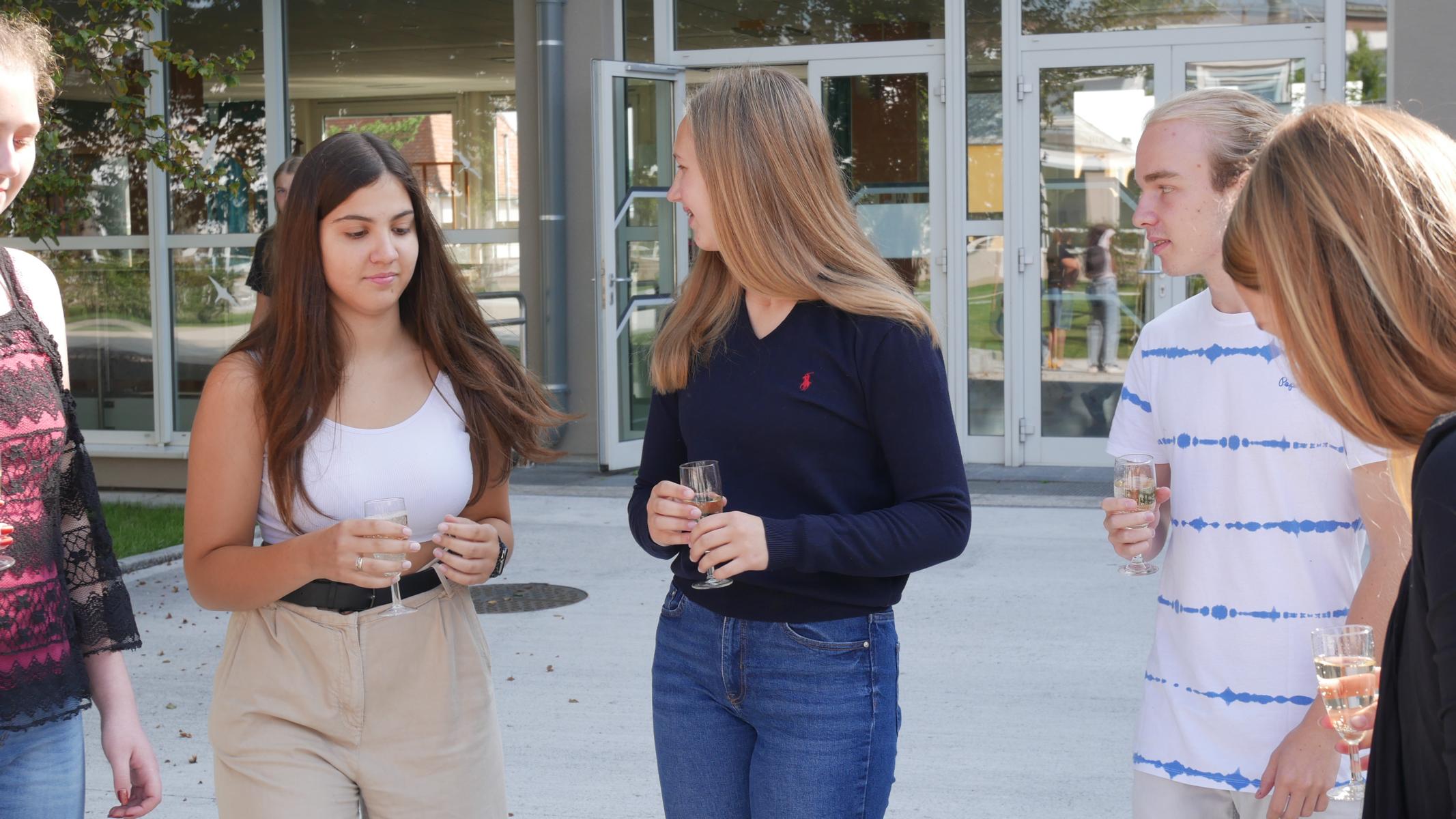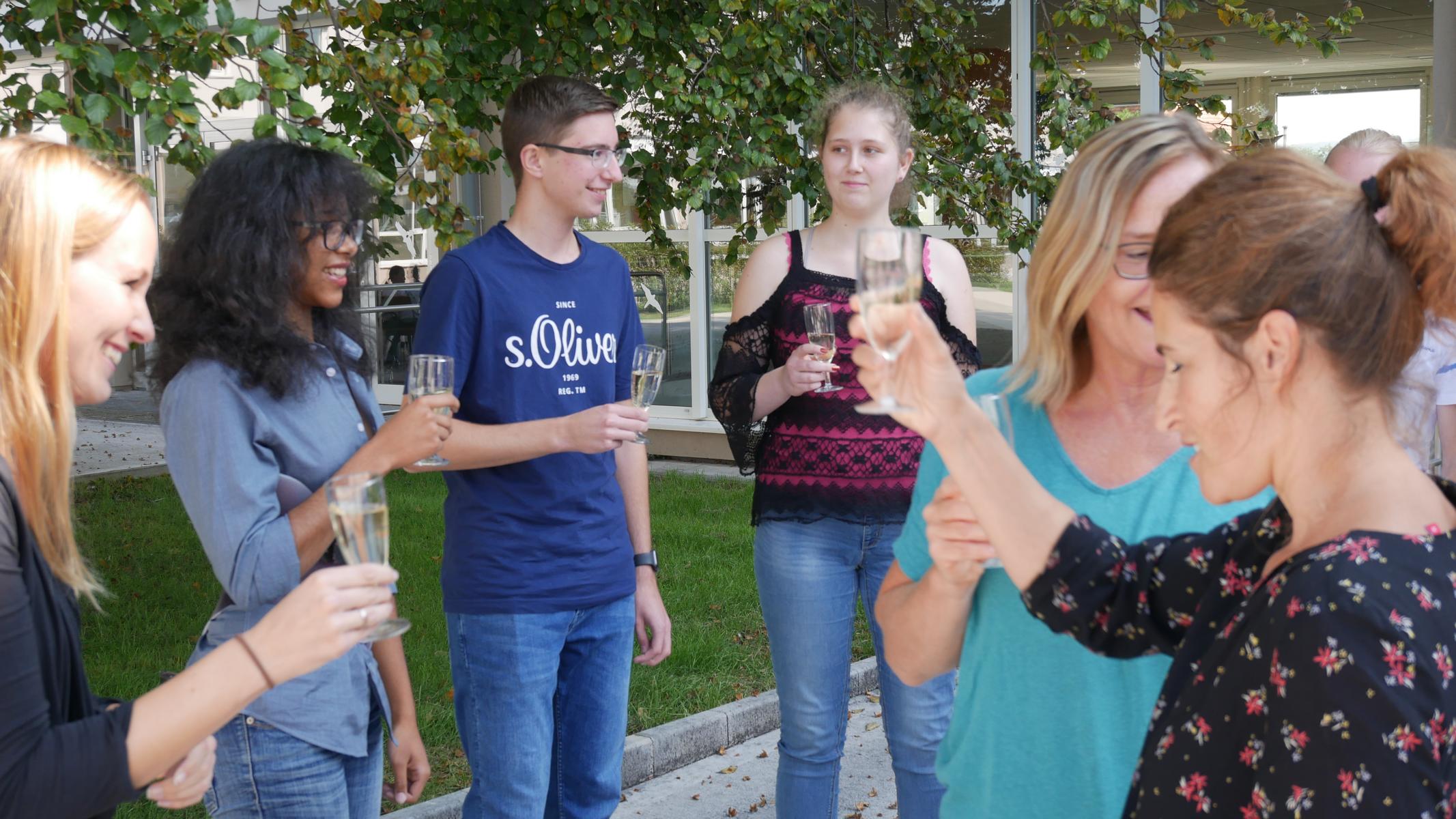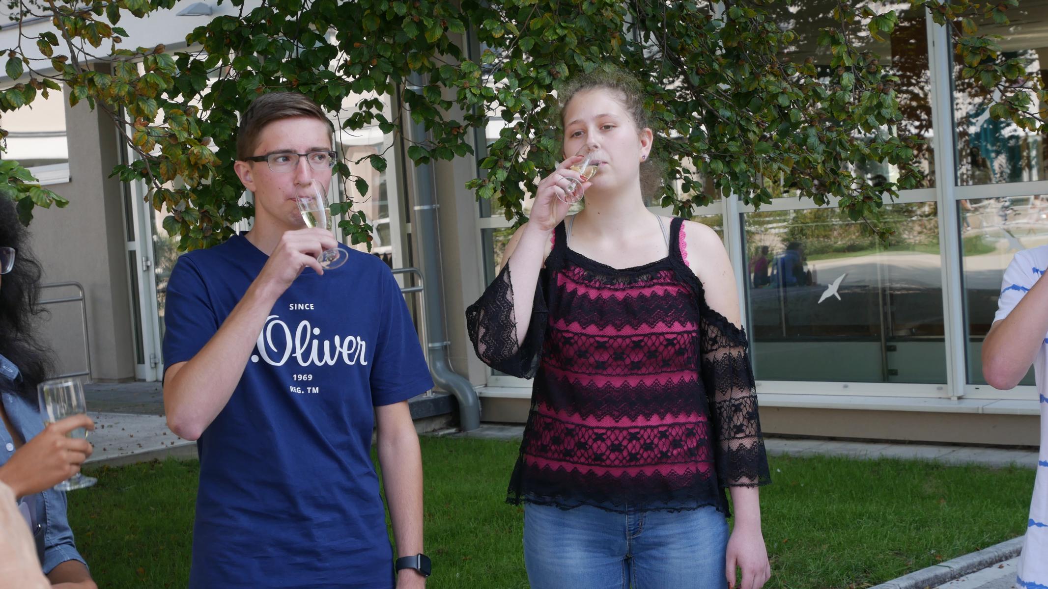 Auf die erfolgreichen Jungunternehmerinnen und Jungunternehmer wurde am nächsten Tag im Schulhof mit einem Gläschen alkoholfreiem Sekt angestoßen.