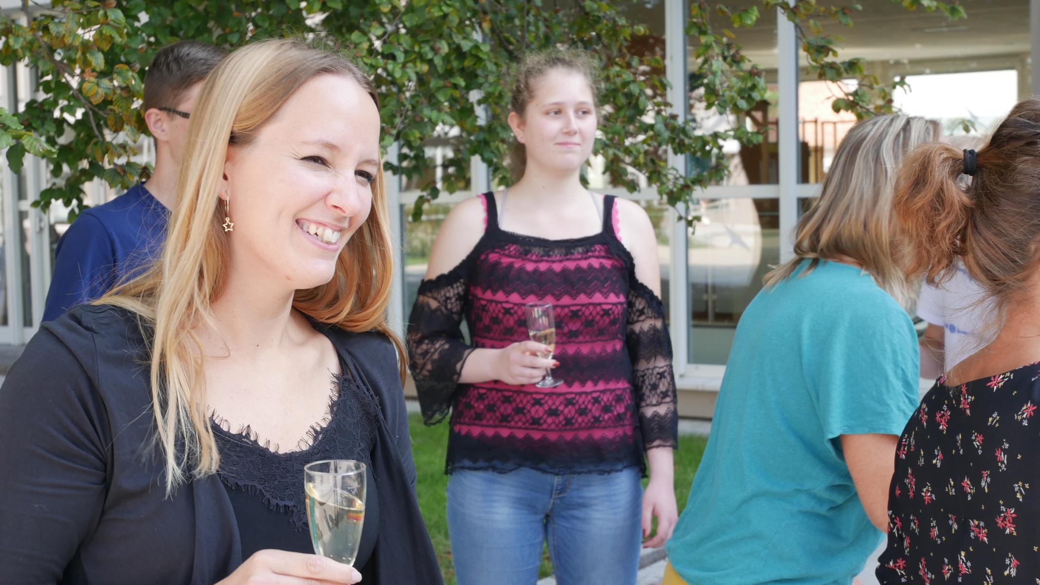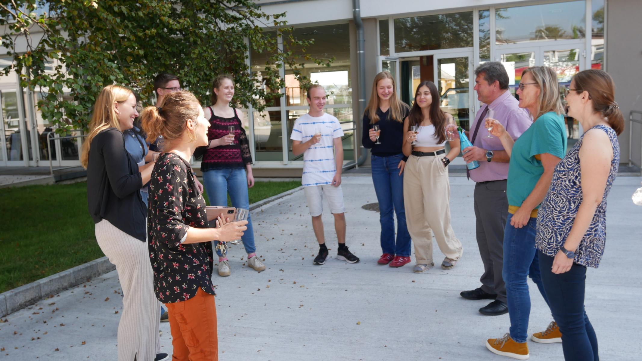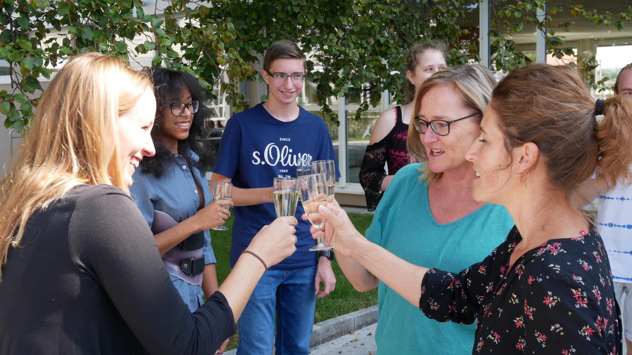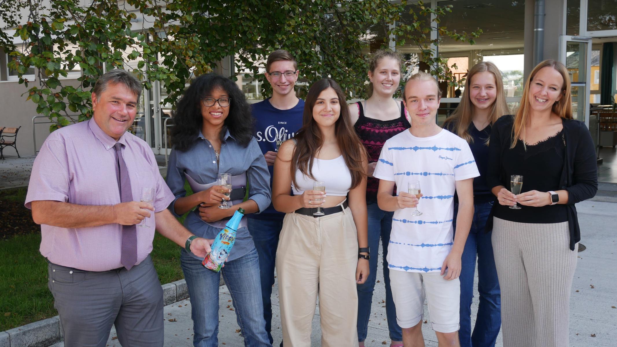 Auf die erfolgreichen Jungunternehmerinnen und Jungunternehmer wurde am nächsten Tag im Schulhof mit einem Gläschen alkoholfreiem Sekt angestoßen.