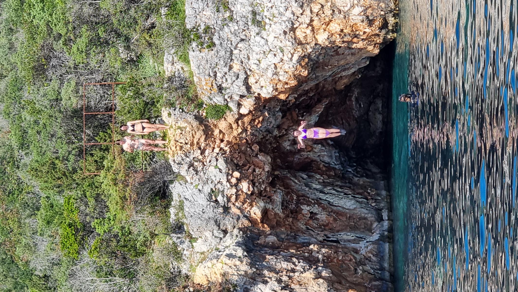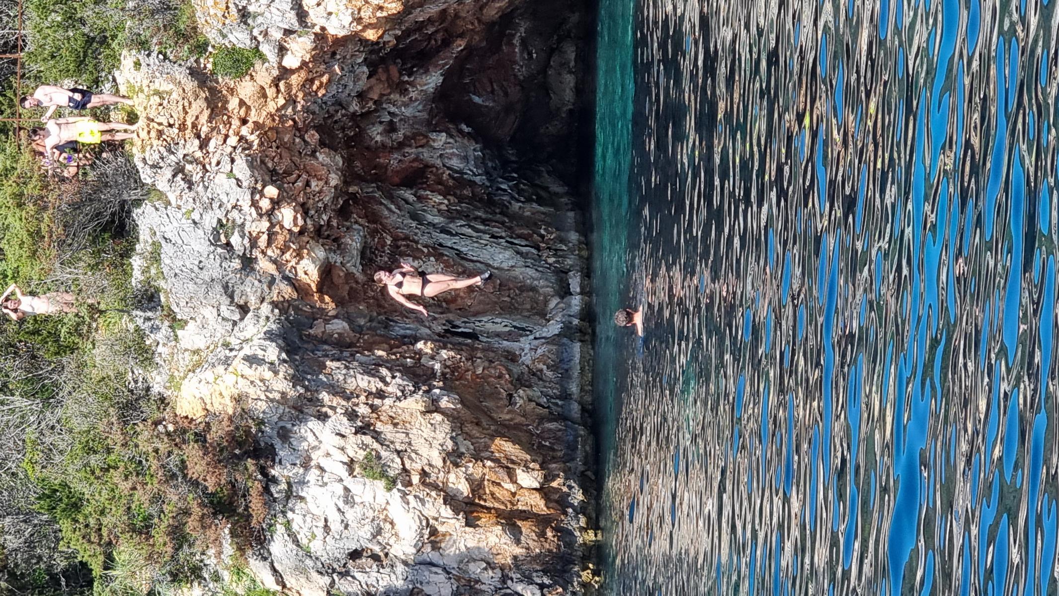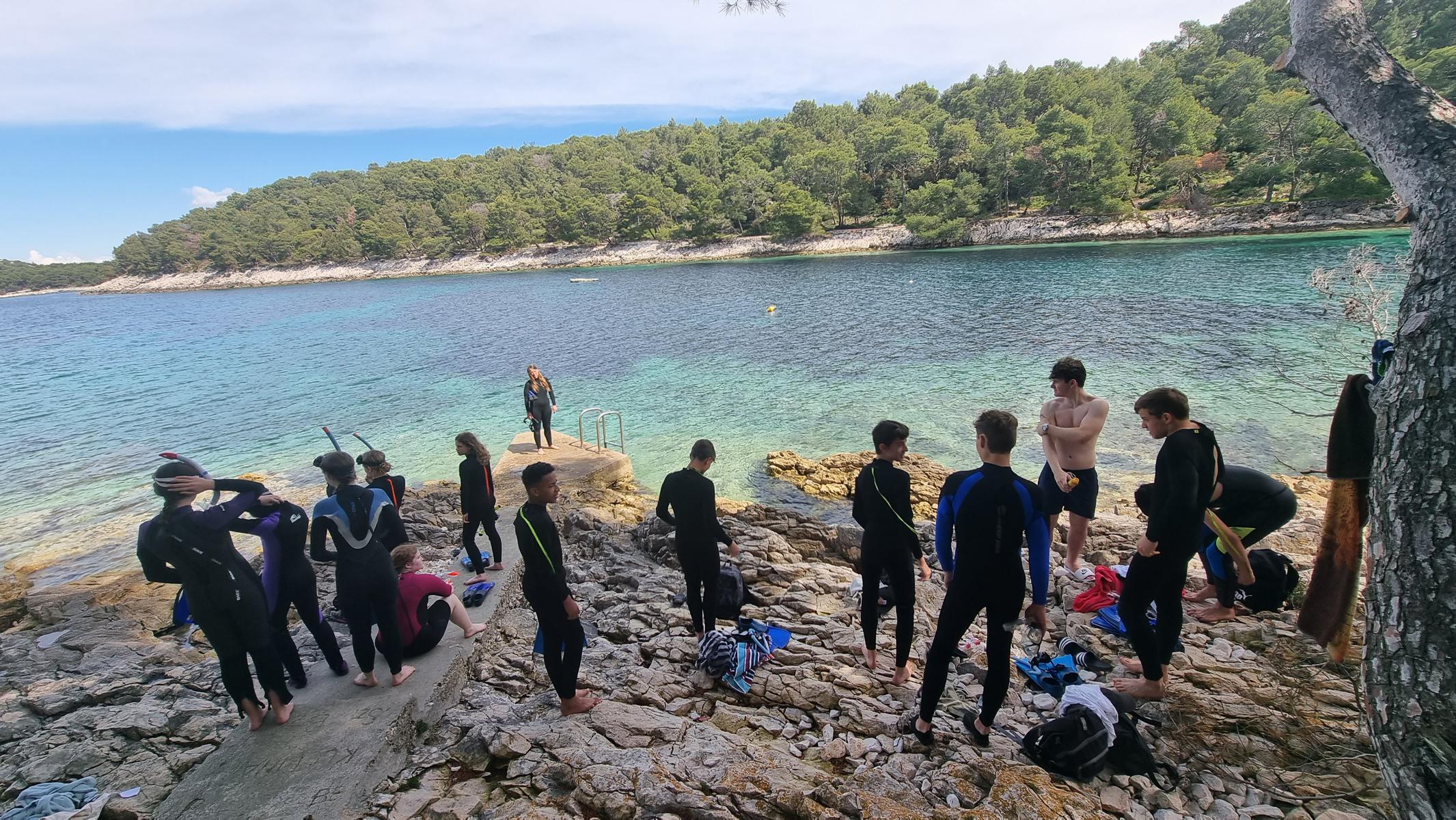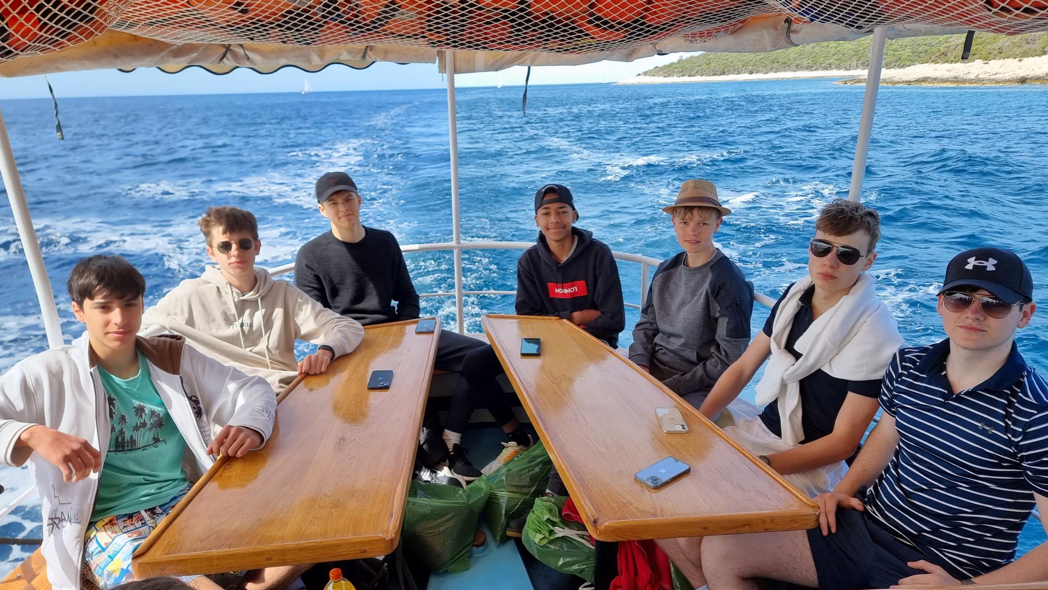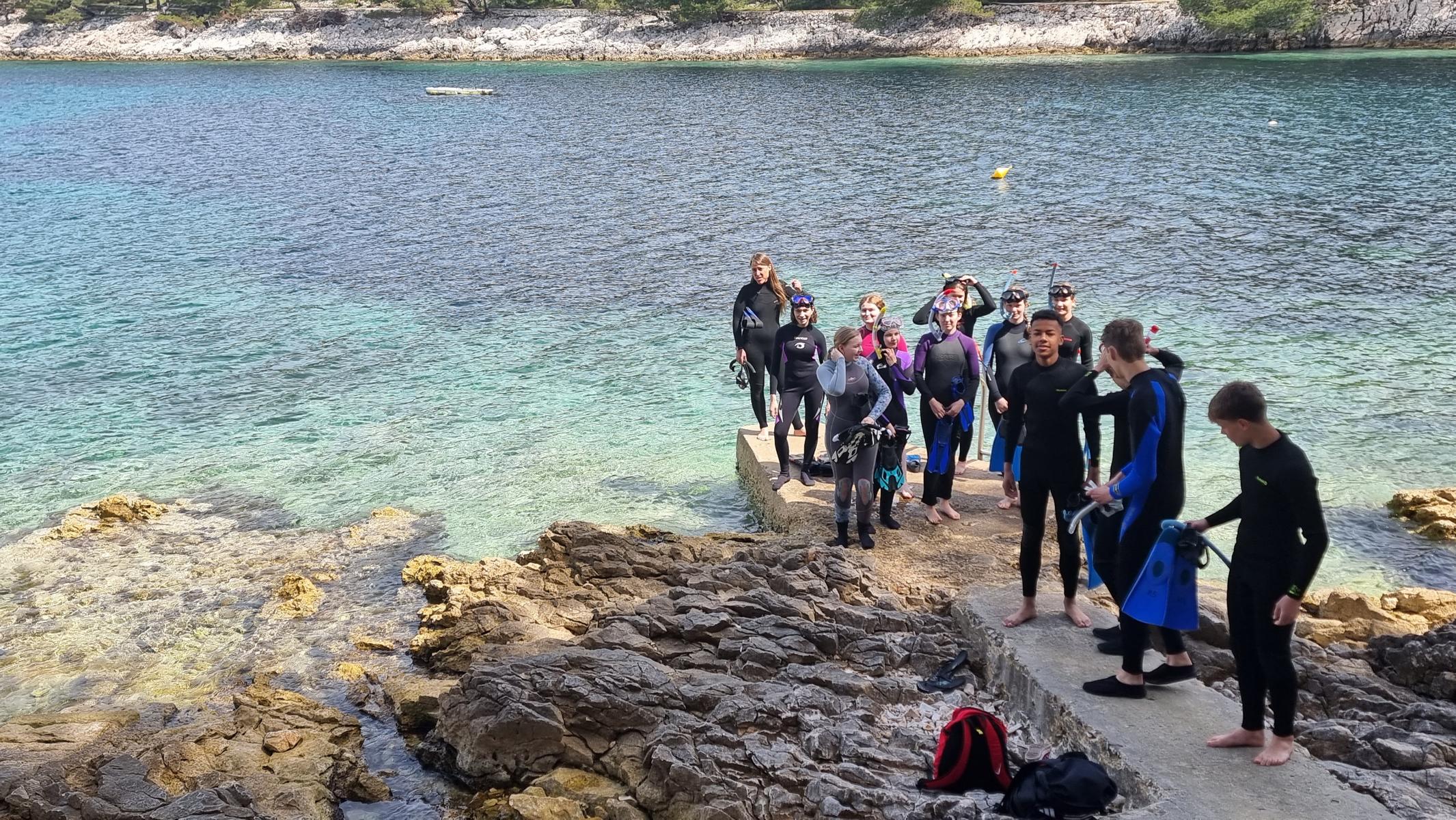 Am dritten Kurstag stand für uns Jugendlichen wie auch für die Lehrerinnen ein spannendes Erlebnis bevor, ein ganztägiger Bootsausflug. Der erste Stopp der Bootsfahrt war die sogenannte „Kroatische Karibik“, die diesen Namen trägt, da das Wasser dort so blau wie in der Karibik ist. Hier durften wir wieder Schnorcheln und sichteten viele Tiere wie Muscheln, Fische und Schnecken. Zurück an Bord, ging es weiter zu der „Blumeninsel“ Ilovik. Dort verbrachte unsere Reisegruppe die Mittagspause und genoss das schöne Wetter. Nach der Pause ging es weiter zu einer Grotte. Wir tasteten uns hier an den Wänden entlang und konnten etwa Schwämme und Nesseltiere entdecken. Anschließend hatten die ganz Mutigen noch die Möglichkeit, von den Wänden der Grotte zu springen.