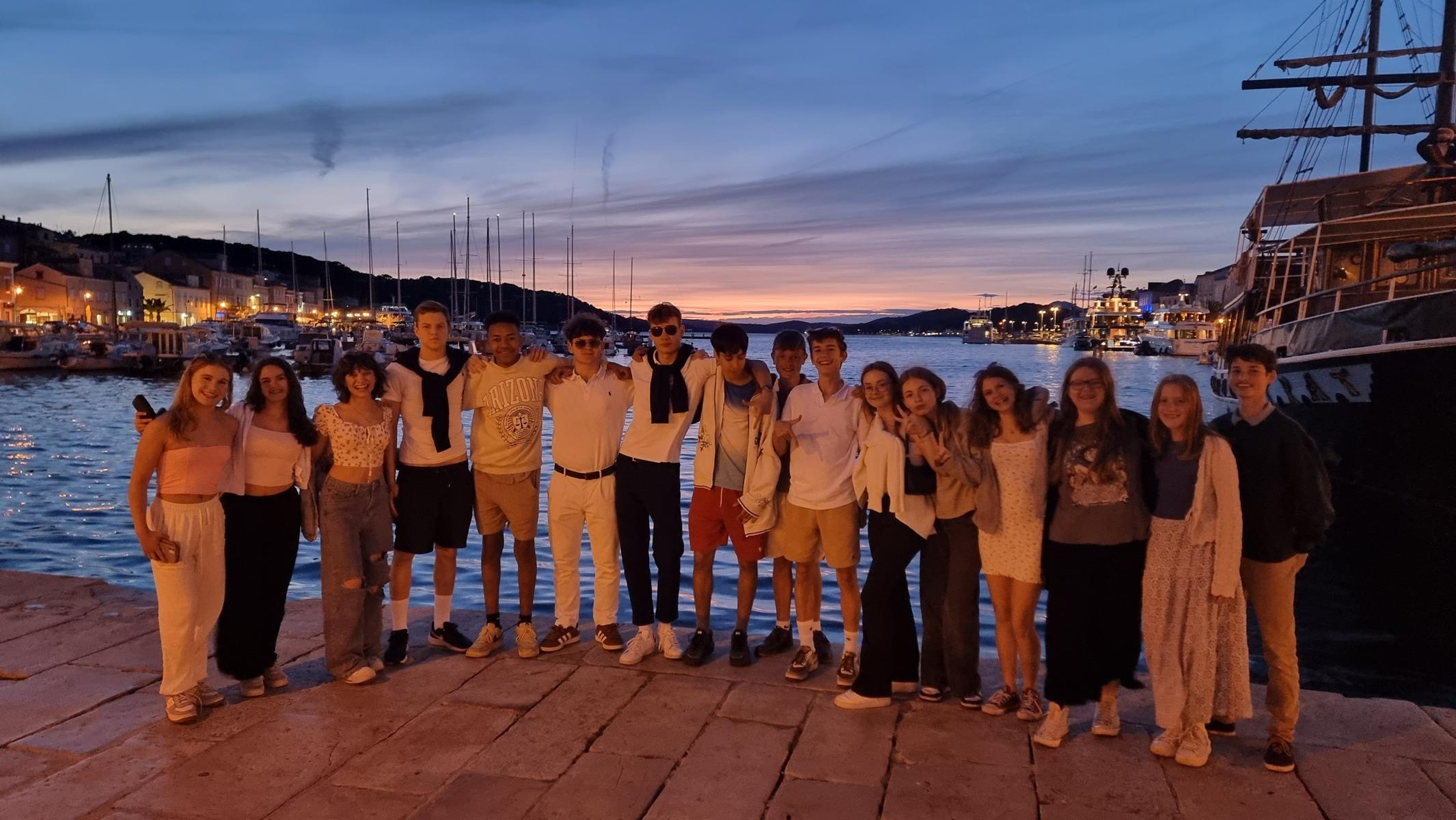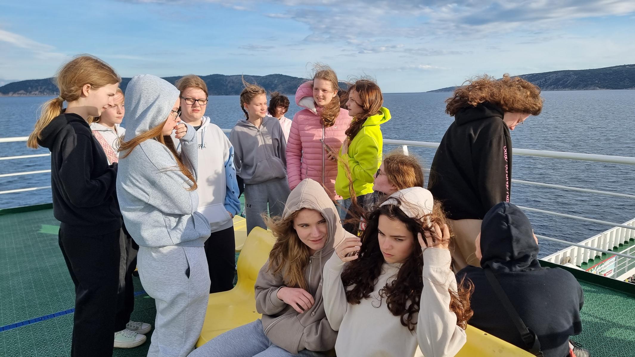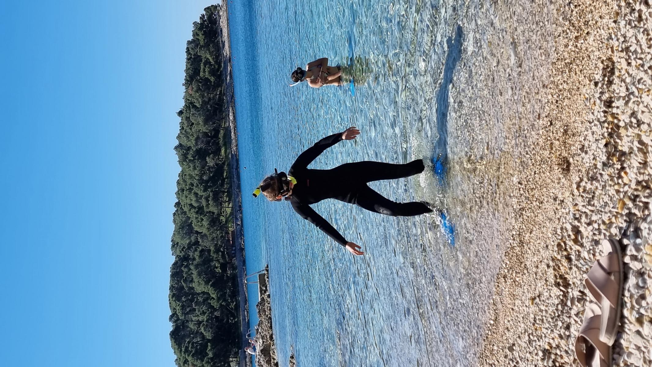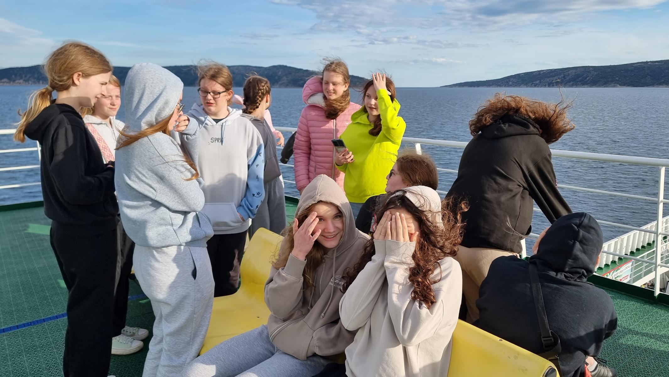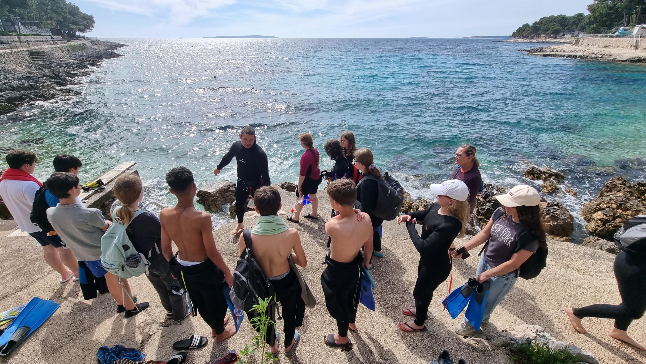 Am dritten Kurstag stand für uns Jugendlichen wie auch für die Lehrerinnen ein spannendes Erlebnis bevor, ein ganztägiger Bootsausflug. Der erste Stopp der Bootsfahrt war die sogenannte „Kroatische Karibik“, die diesen Namen trägt, da das Wasser dort so blau wie in der Karibik ist. Hier durften wir wieder Schnorcheln und sichteten viele Tiere wie Muscheln, Fische und Schnecken. Zurück an Bord, ging es weiter zu der „Blumeninsel“ Ilovik. Dort verbrachte unsere Reisegruppe die Mittagspause und genoss das schöne Wetter. Nach der Pause ging es weiter zu einer Grotte. Wir tasteten uns hier an den Wänden entlang und konnten etwa Schwämme und Nesseltiere entdecken. Anschließend hatten die ganz Mutigen noch die Möglichkeit, von den Wänden der Grotte zu springen.