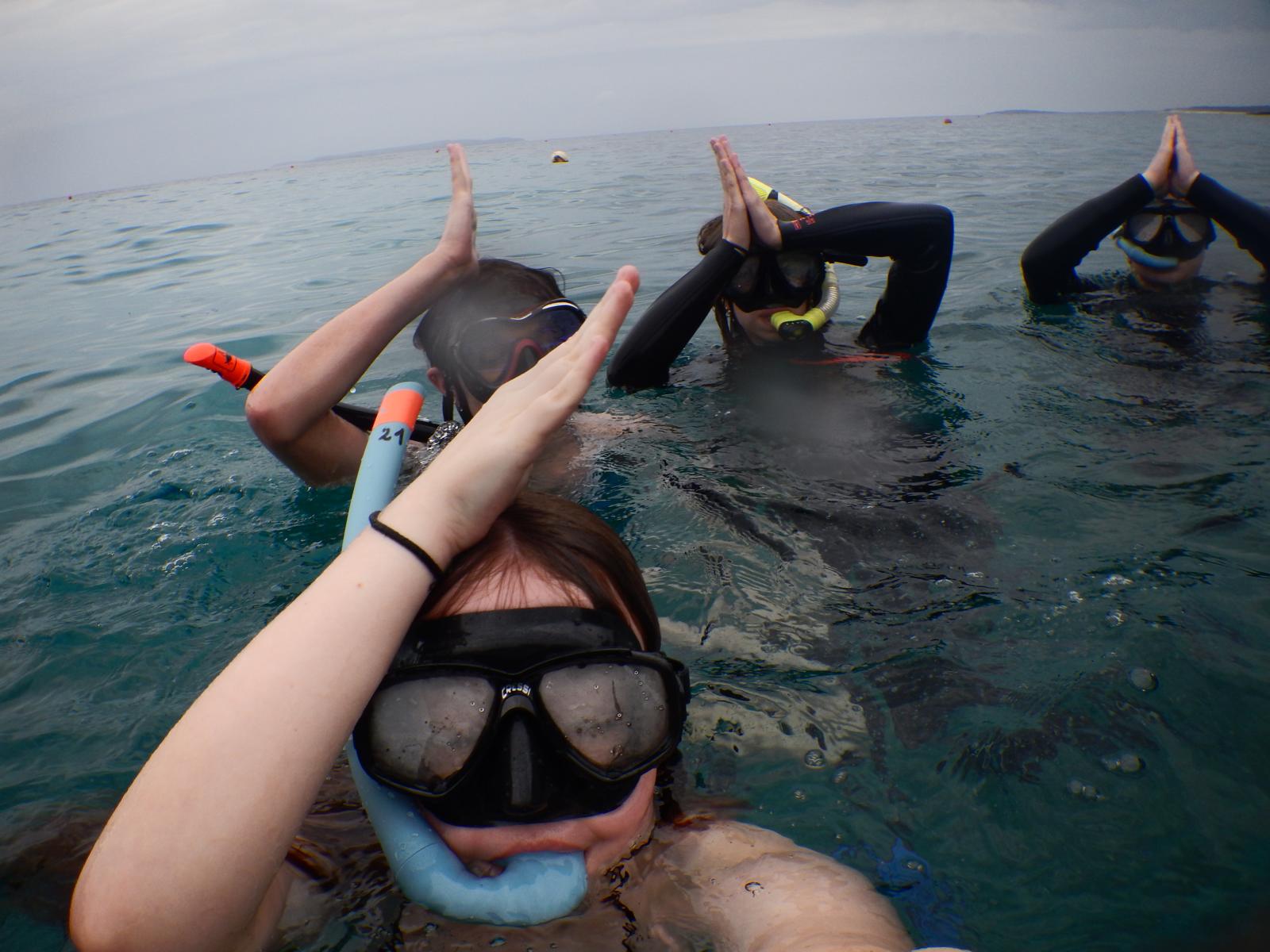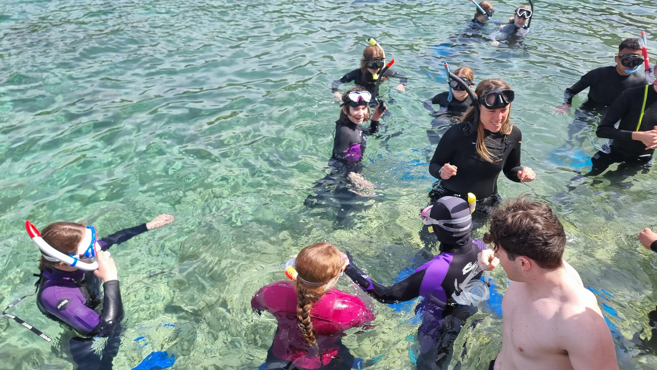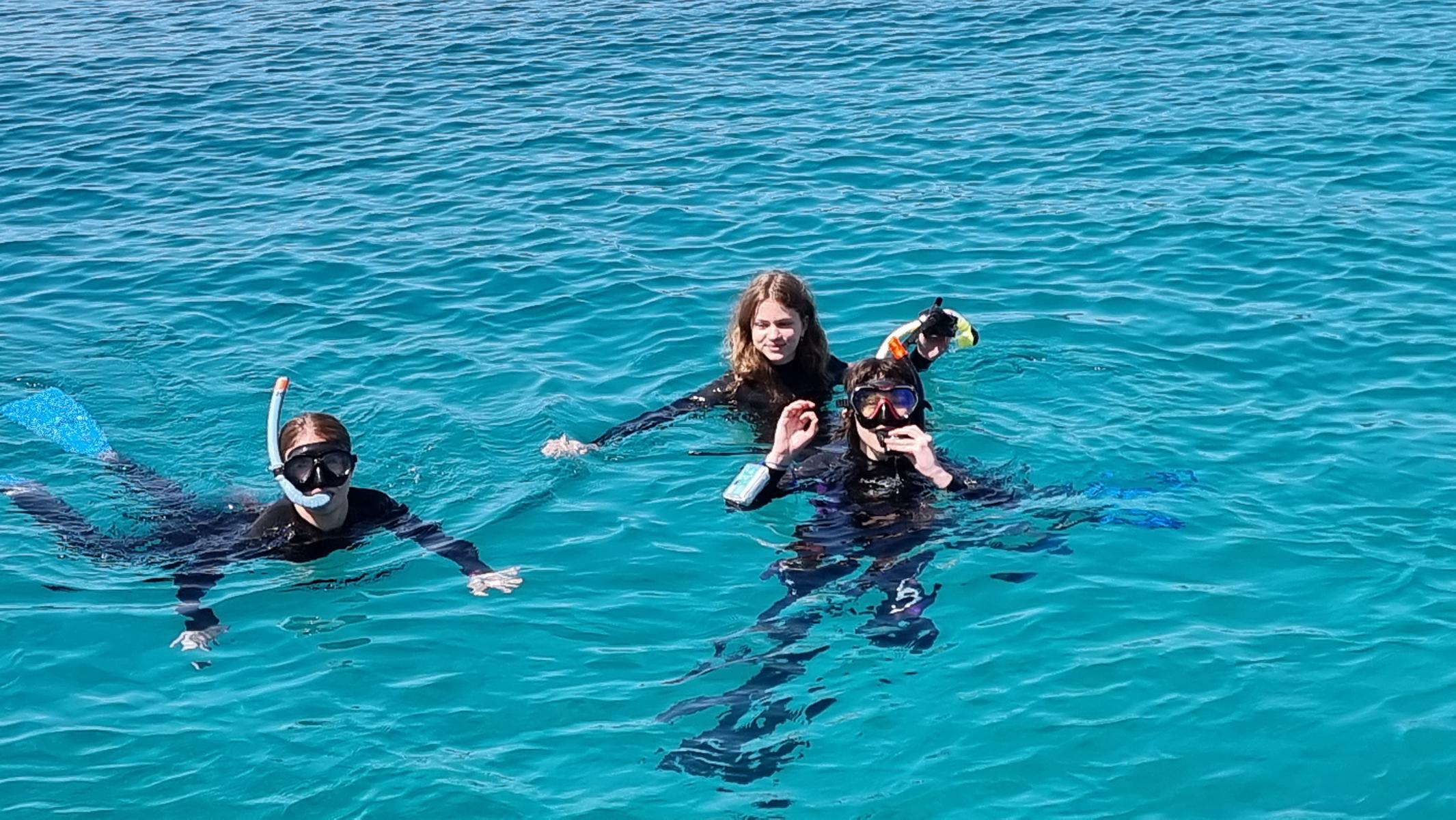 Der erste Kurstag startete vormittags mit einer Probensammlung an der Küste. Die Fundstücke wurden am Nachmittag mit Hilfe von Christian und Margit, den beiden Biolog:innen der Station, bestimmt. Darunter befanden sich Krebse, Garnelen, Schnecken und weitere marine Lebewesen. Mit dem Nachmittag bot sich für die vom Schnorcheln Begeisterten erstmals die Chance, ins Wasser zu tauchen. Obwohl die Temperatur des Wassers im Meer etwas frisch war, ließen wir uns dank Neoprenanzügen nicht abschrecken; einige trauten sich auch ohne diese ins kalte Wasser.