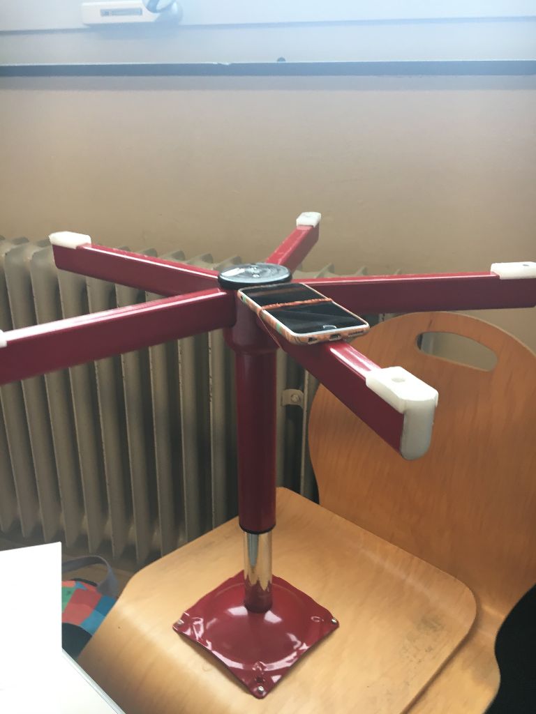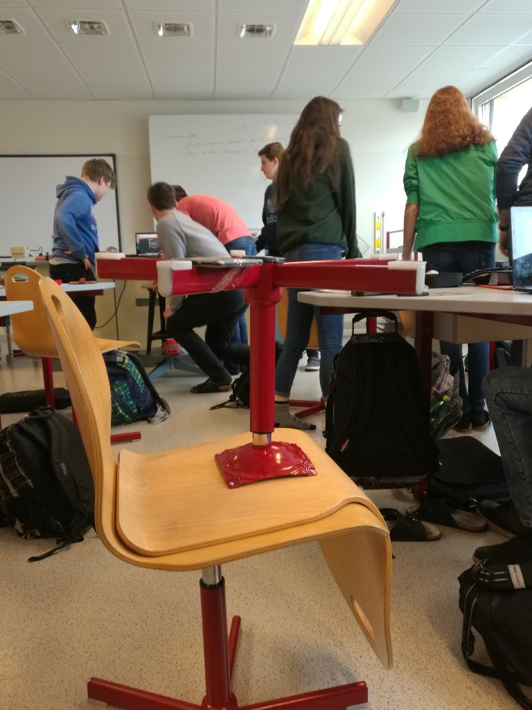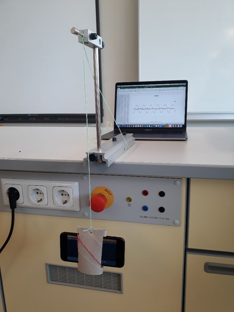 Bei dem Experiment „Fadenpendel mit phyphox“ und „Zentripetalbeschleunigung mit phyphox“ musste das Handy verwendet werden. phyphox ist eine App, welche zum Beispiel die Erdbeschleunigung, die Geschwindigkeit eines Aufzuges oder eine Beschleunigung messen kann. In dieser zusätzlichen und vertiefenden Physik-Doppelstunde, musste man als erstes eine Handyhalterung aus einer alten Klopapier-Rolle basteln und dann mit einem Faden an dem Stativ befestigen.
