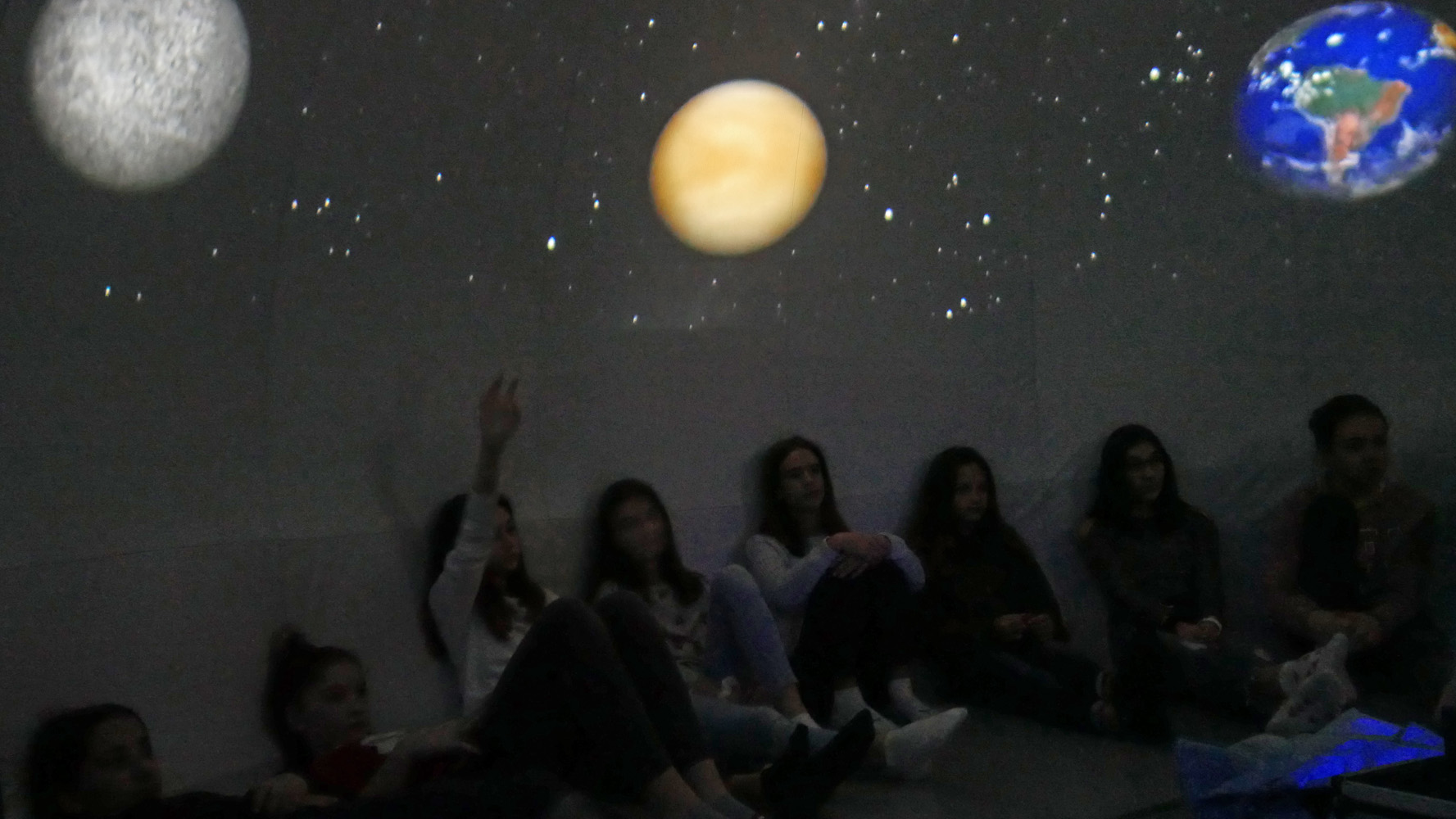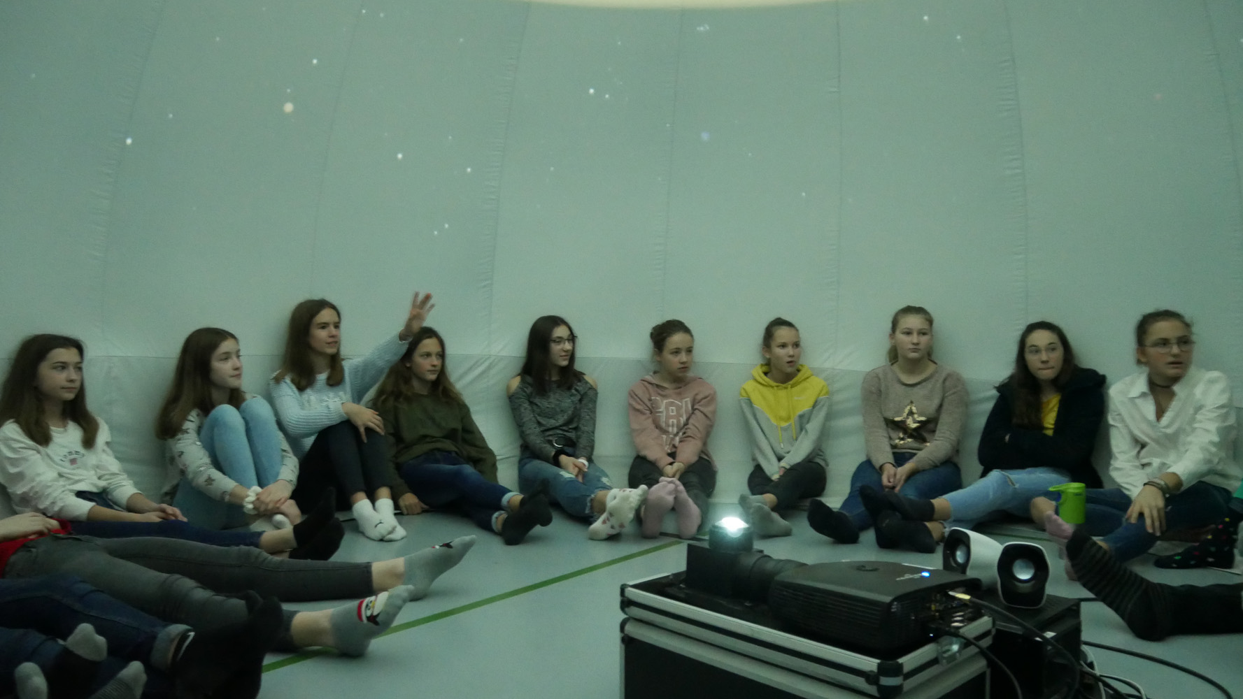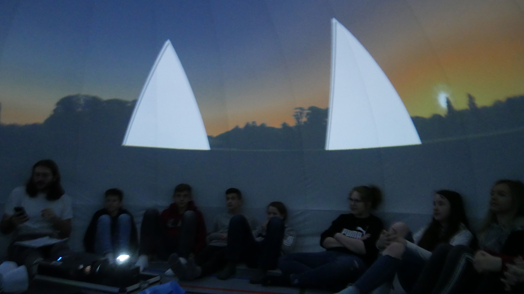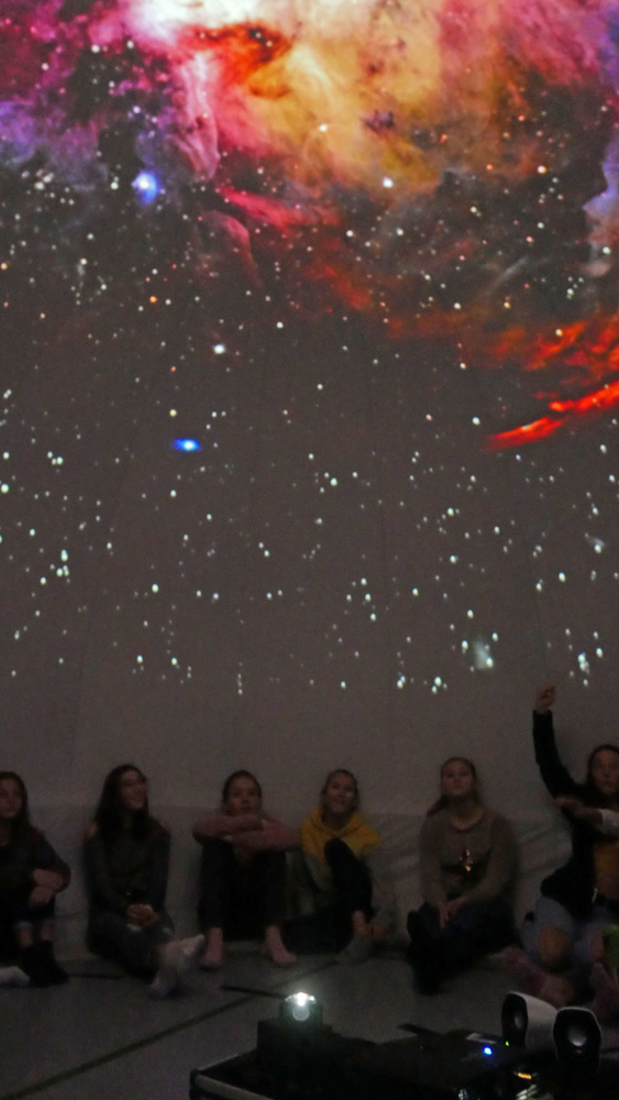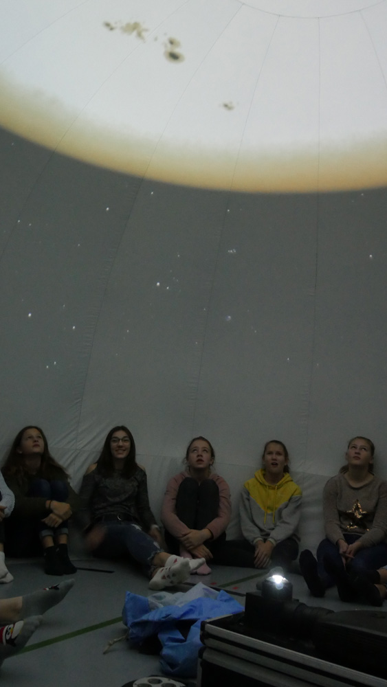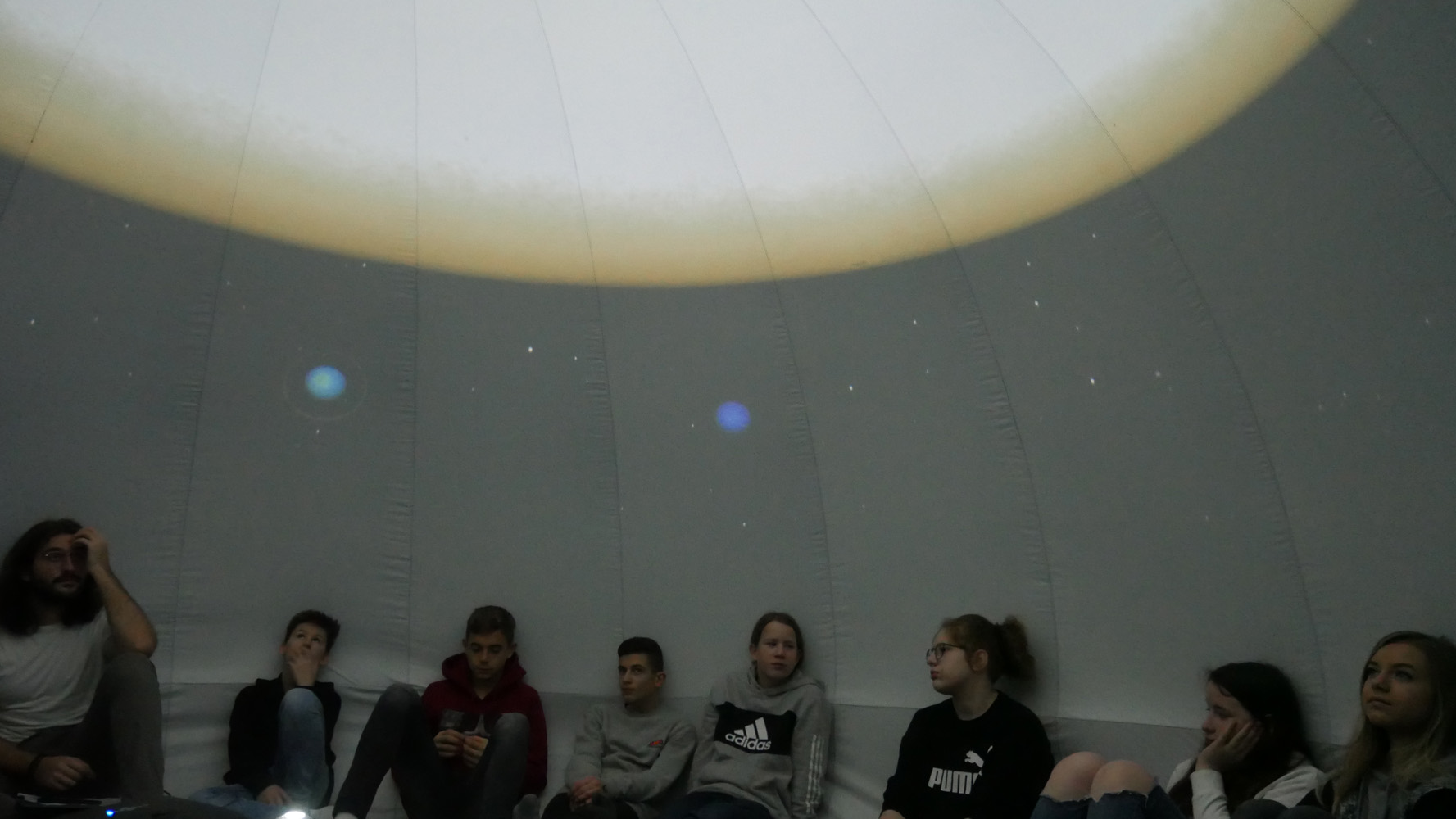 Zwei Tage lang besuchten Astronomen der Universität Wien mit einem mobilen Planetarium das Gymnasium Horn. Damit setzte sich der astronomische Schwerpunkt des Gymnasiums im Fachbereich Physik fort, nachdem im Vorjahr ein Sternenfest abgehalten und diesen November ein Merkurtransit beobachtet wurde. Alle zweiten, dritten und vierten Klassen begaben sich je eine Unterrichtsstunde lang in ein mehr als drei Meter hohes aufblasbares Planetarium. Darin wurde ein Sternenhimmel an die Decke der Kuppel projiziert und schließlich eine virtuelle Reise durch das Sonnensystem unternommen. „Es war, als würde man in einer Rakete sitzen und alles in Echt anschauen“, schwärmte Emilia aus der zweiten Klasse. Auch auf die begeisterten Fragen der Jugendlichen wurde eingegangen und so ergab sich für jede Gruppe je nach ihren Interessen eine eigene Show, in der sie mit einem Rover auf dem Mars landeten oder gezeigt wurde, wie ein schwarzes Loch entsteht. „Ich würde so gerne nochmal reingehen,“ resümierte Konstanze, die am liebsten den ganzen Schultag unter dem Sternenhimmel verbracht hätte.