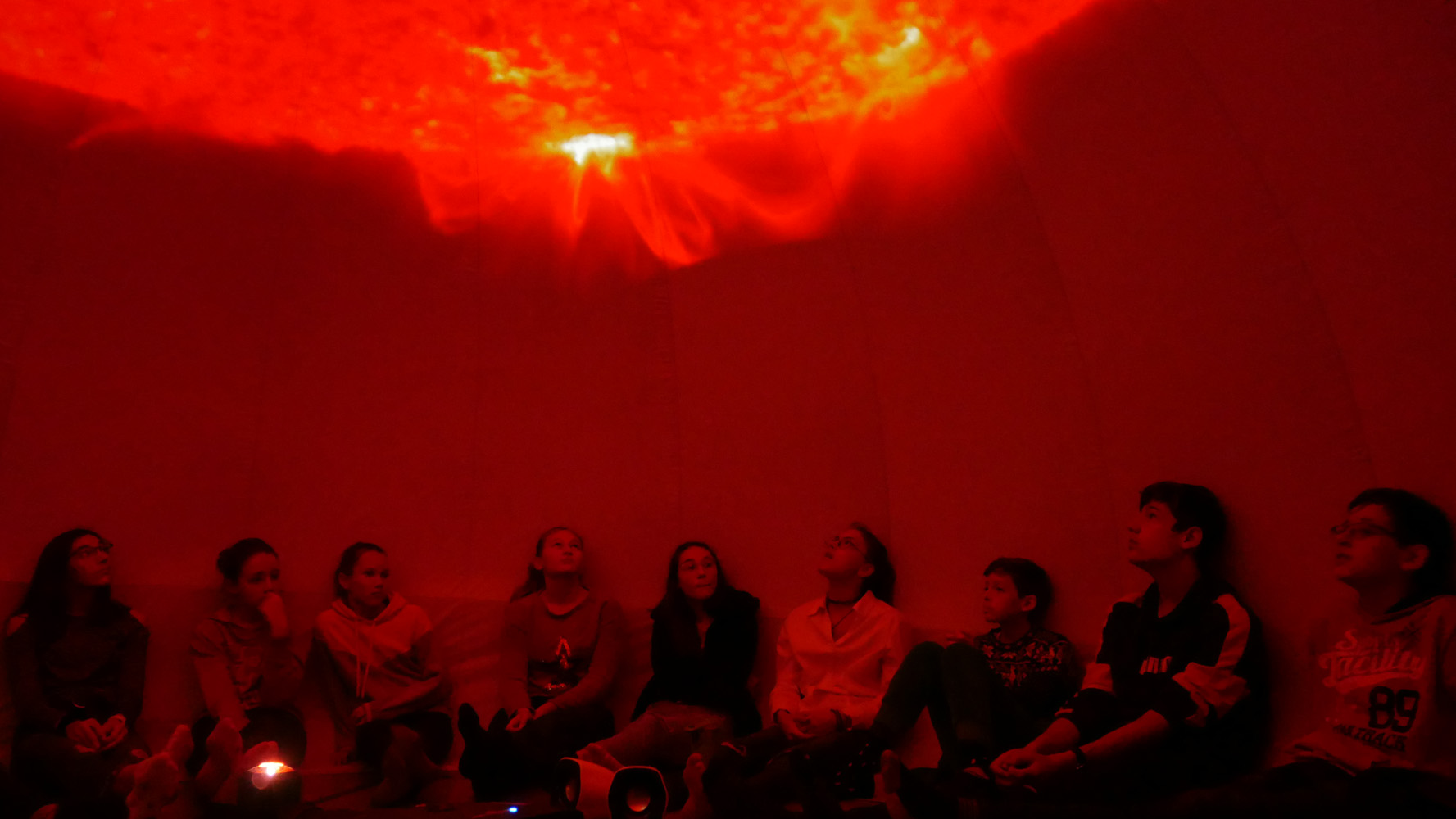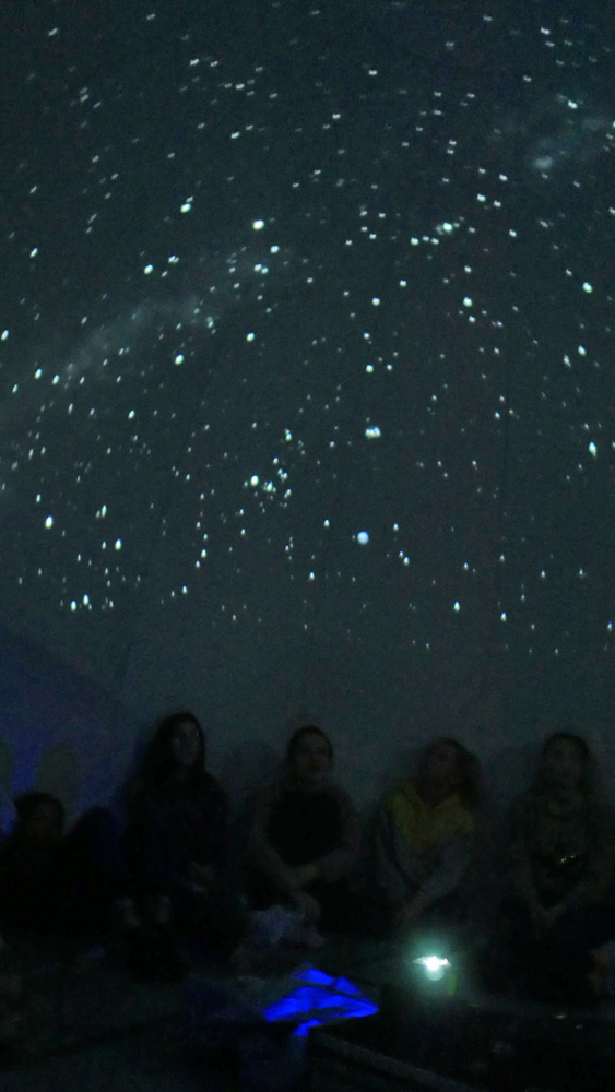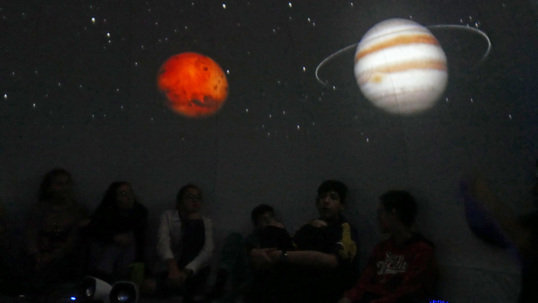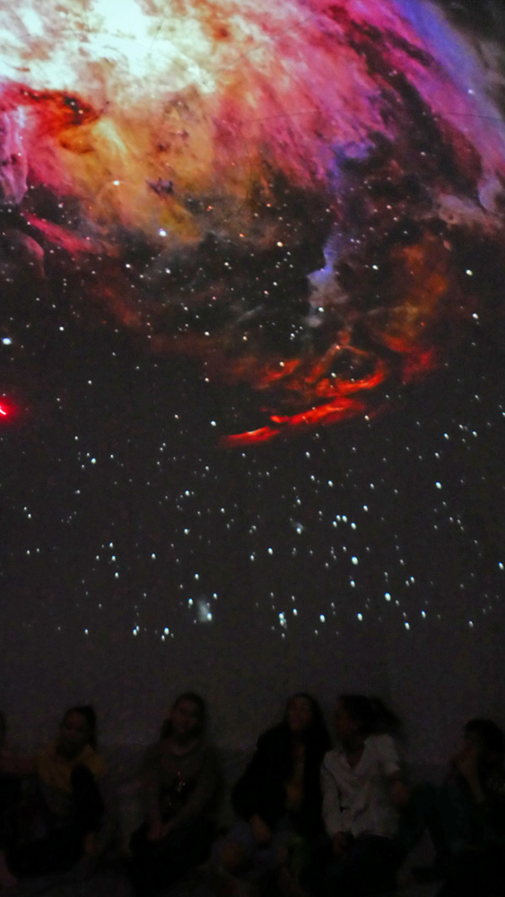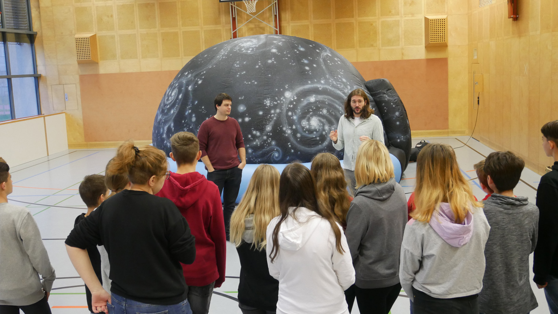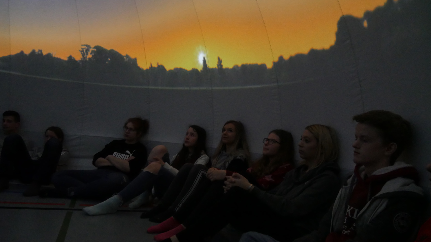Zwei Tage lang besuchten Astronomen der Universität Wien mit einem mobilen Planetarium das Gymnasium Horn. Damit setzte sich der astronomische Schwerpunkt des Gymnasiums im Fachbereich Physik fort, nachdem im Vorjahr ein Sternenfest abgehalten und diesen November ein Merkurtransit beobachtet wurde. Alle zweiten, dritten und vierten Klassen begaben sich je eine Unterrichtsstunde lang in ein mehr als drei Meter hohes aufblasbares Planetarium. Darin wurde ein Sternenhimmel an die Decke der Kuppel projiziert und schließlich eine virtuelle Reise durch das Sonnensystem unternommen. „Es war, als würde man in einer Rakete sitzen und alles in Echt anschauen“, schwärmte Emilia aus der zweiten Klasse. Auch auf die begeisterten Fragen der Jugendlichen wurde eingegangen und so ergab sich für jede Gruppe je nach ihren Interessen eine eigene Show, in der sie mit einem Rover auf dem Mars landeten oder gezeigt wurde, wie ein schwarzes Loch entsteht. „Ich würde so gerne nochmal reingehen,“ resümierte Konstanze, die am liebsten den ganzen Schultag unter dem Sternenhimmel verbracht hätte.