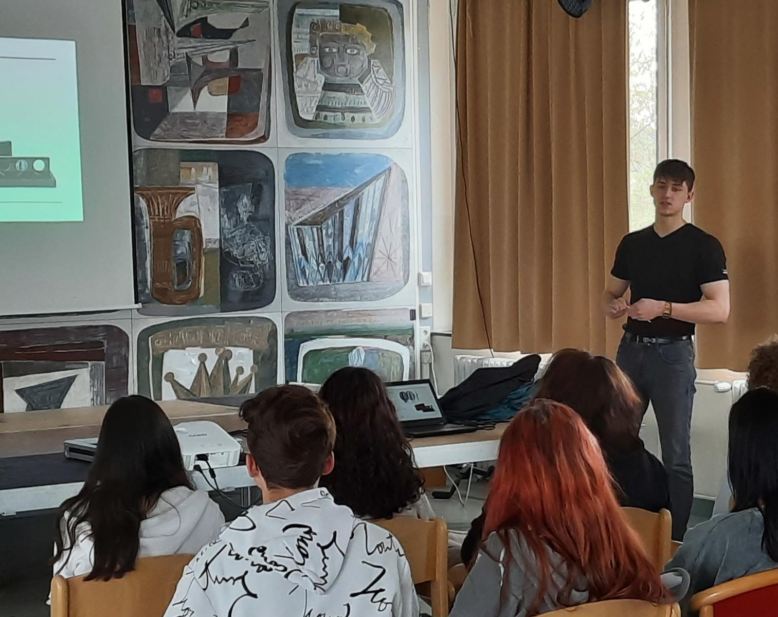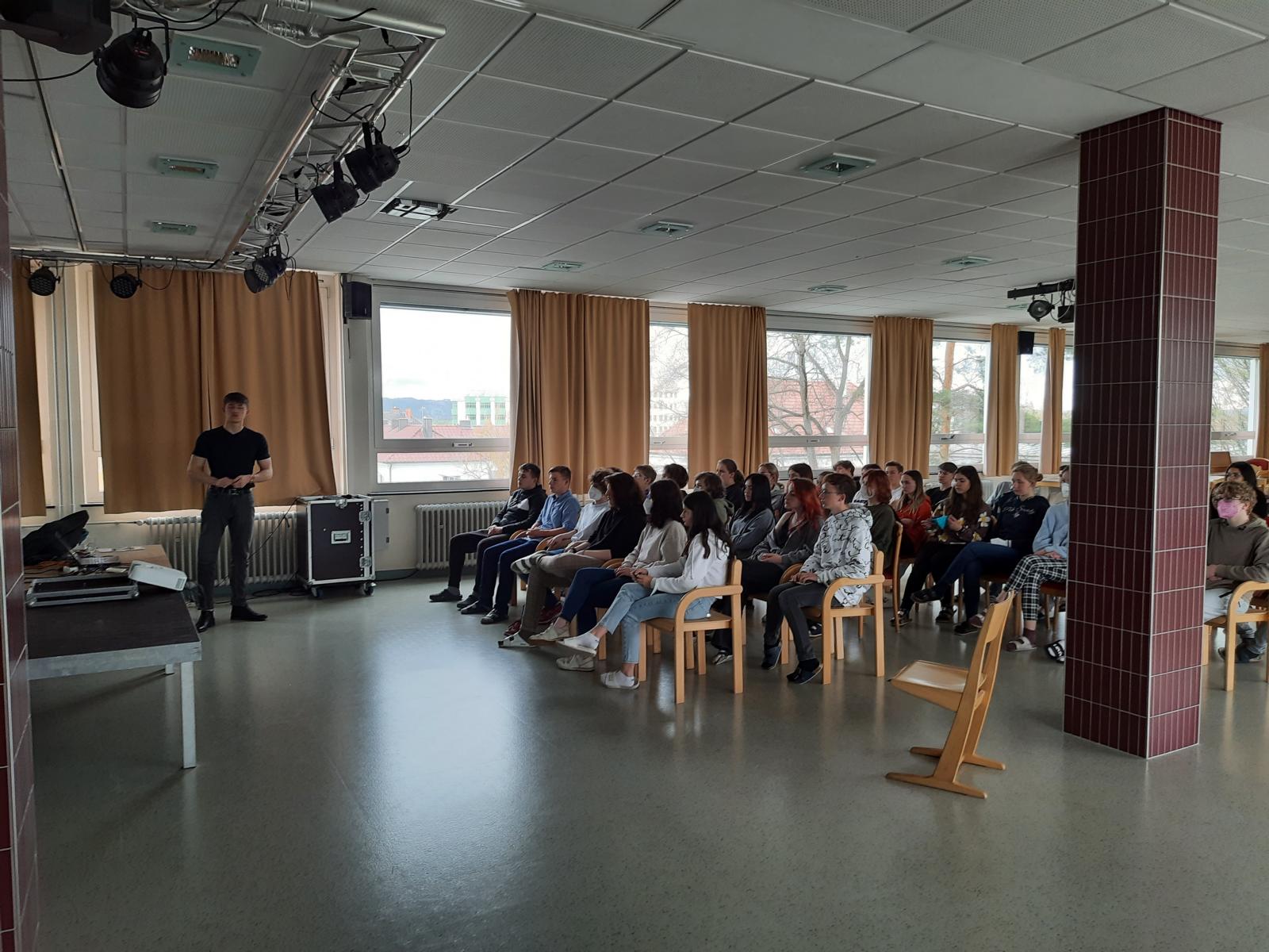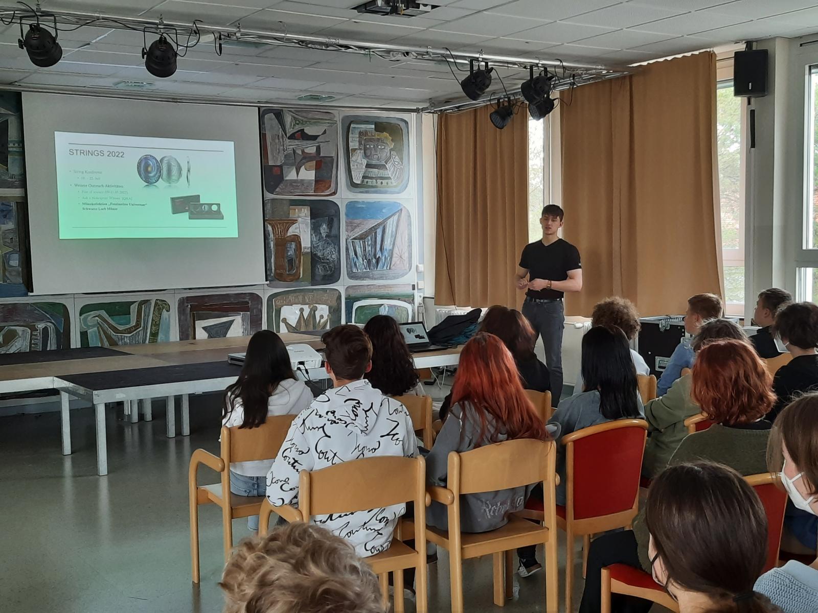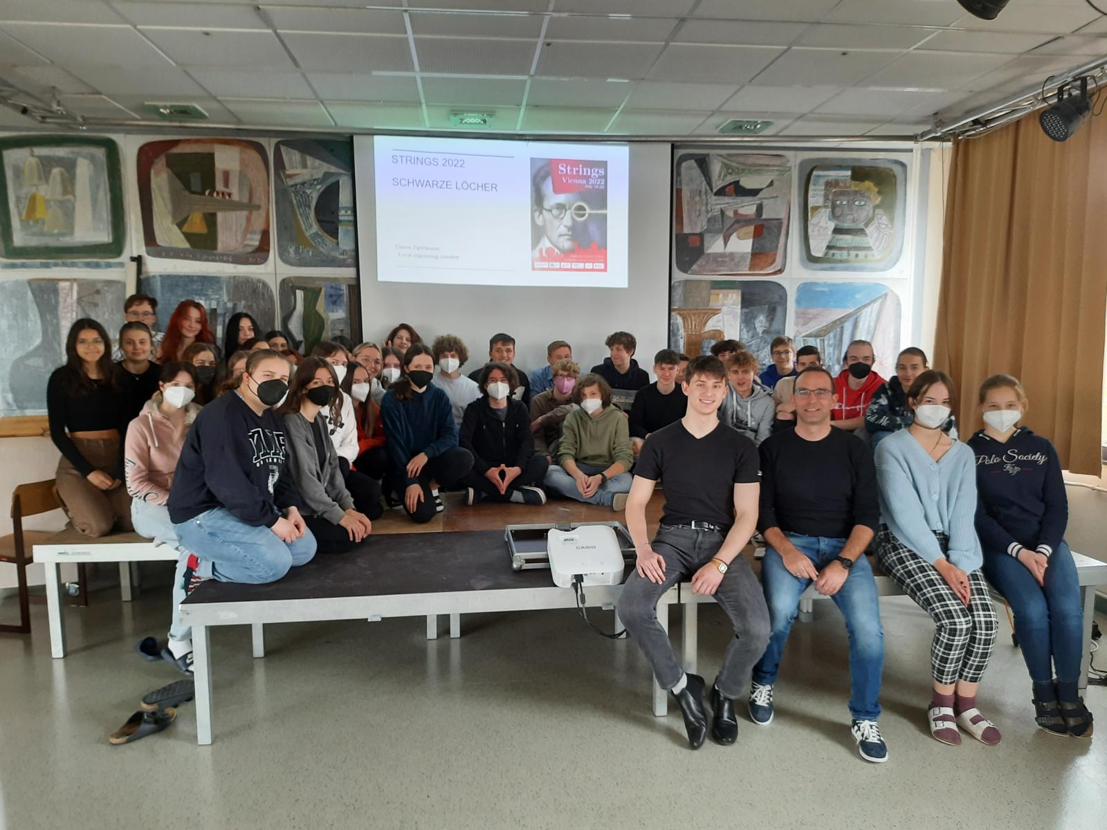 An einem Montag kam Timon Zipfelmaier, ein junger Physikstudent, an unsere Schule. Er ist Mitglied des „Local organizing comittee“ der Strings-Konferenz 2022, die dieses Jahr im Juli in Wien stattfinden wird. Im Zuge dieses großen Ereignisses kommen Physiker und Physikerinnen aus der ganzen Welt zusammen, um ihre neusten Forschungserkenntnisse zu teilen. Zipfelmaier hielt den 6. und 7. Klassen einen Vortrag, in dem er von Strings erzählte und außerdem über schwarze Löcher sprach. Wir lernten dabei zum Beispiel über die Entstehung von schwarzen Löchern, die verschiedenen Arten und wie diese wieder verschwinden können. Der Physikstudent bereitete uns eine interessante Stunde und wir freuten uns sehr über seinen Besuch.