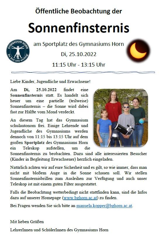 An diesem Tag hat das Gymnasium schulautonom frei. Einige Lehrende und Jugendliche des Gymnasiums werden dennoch von 11:15 Uhr bis 13:15 Uhr auf dem großen Sportplatz des Gymnasiums Horn ein Teleskop aufstellen, um die Sonnenfinsternis zu beobachten. Dazu sind alle interessierten Besucher (Kinder in Begleitung Erwachsener) herzlich eingeladen.