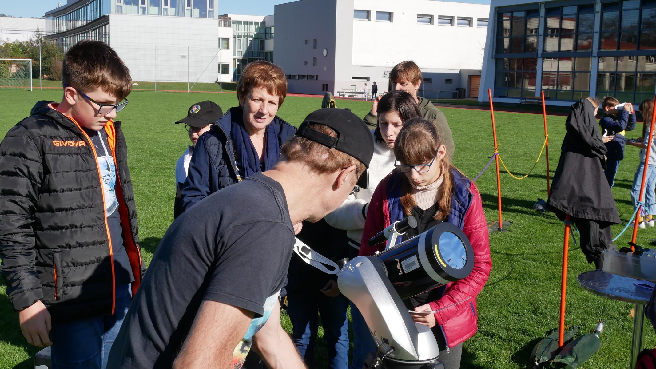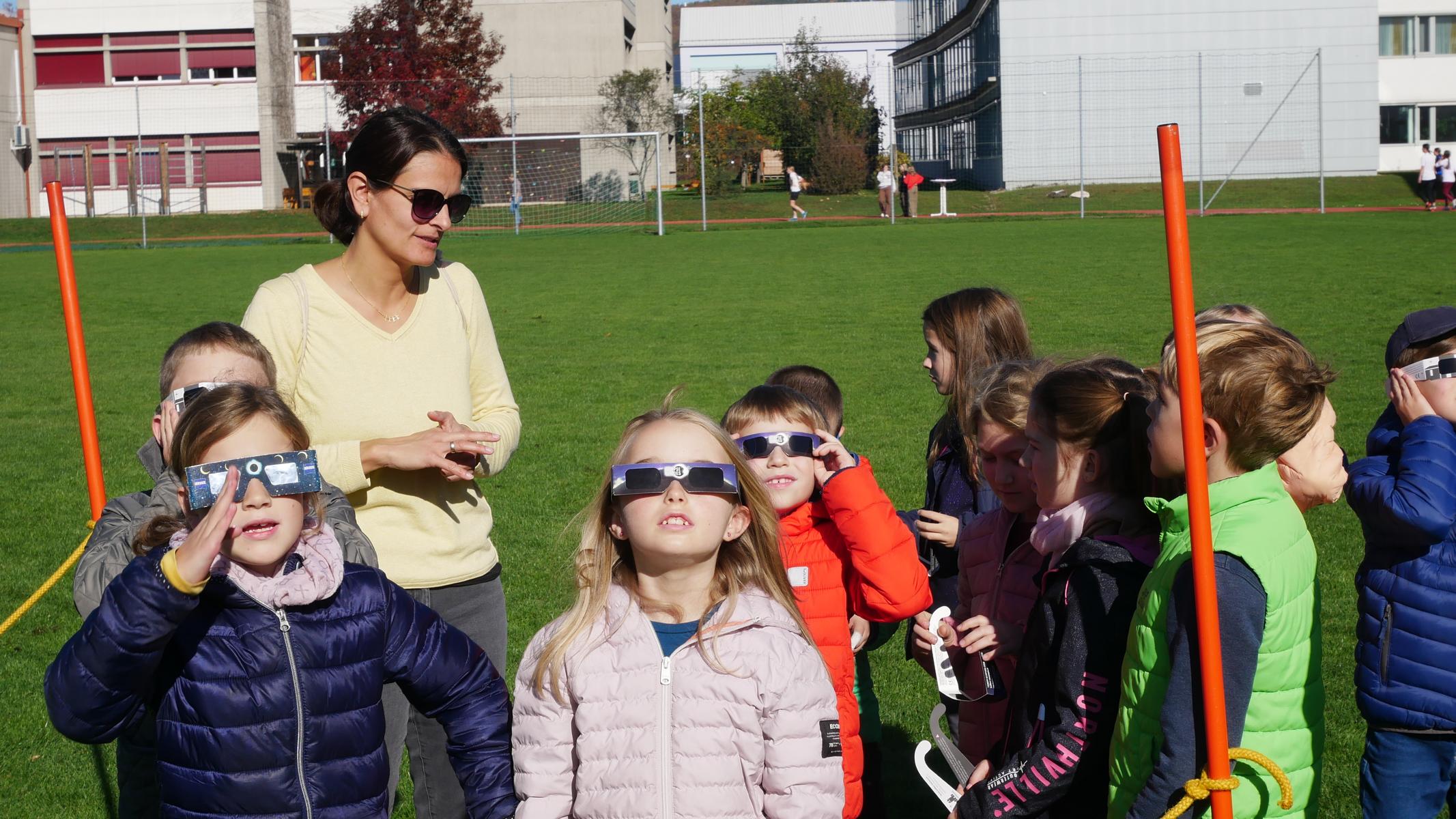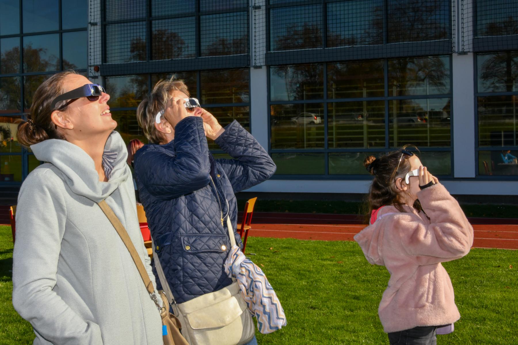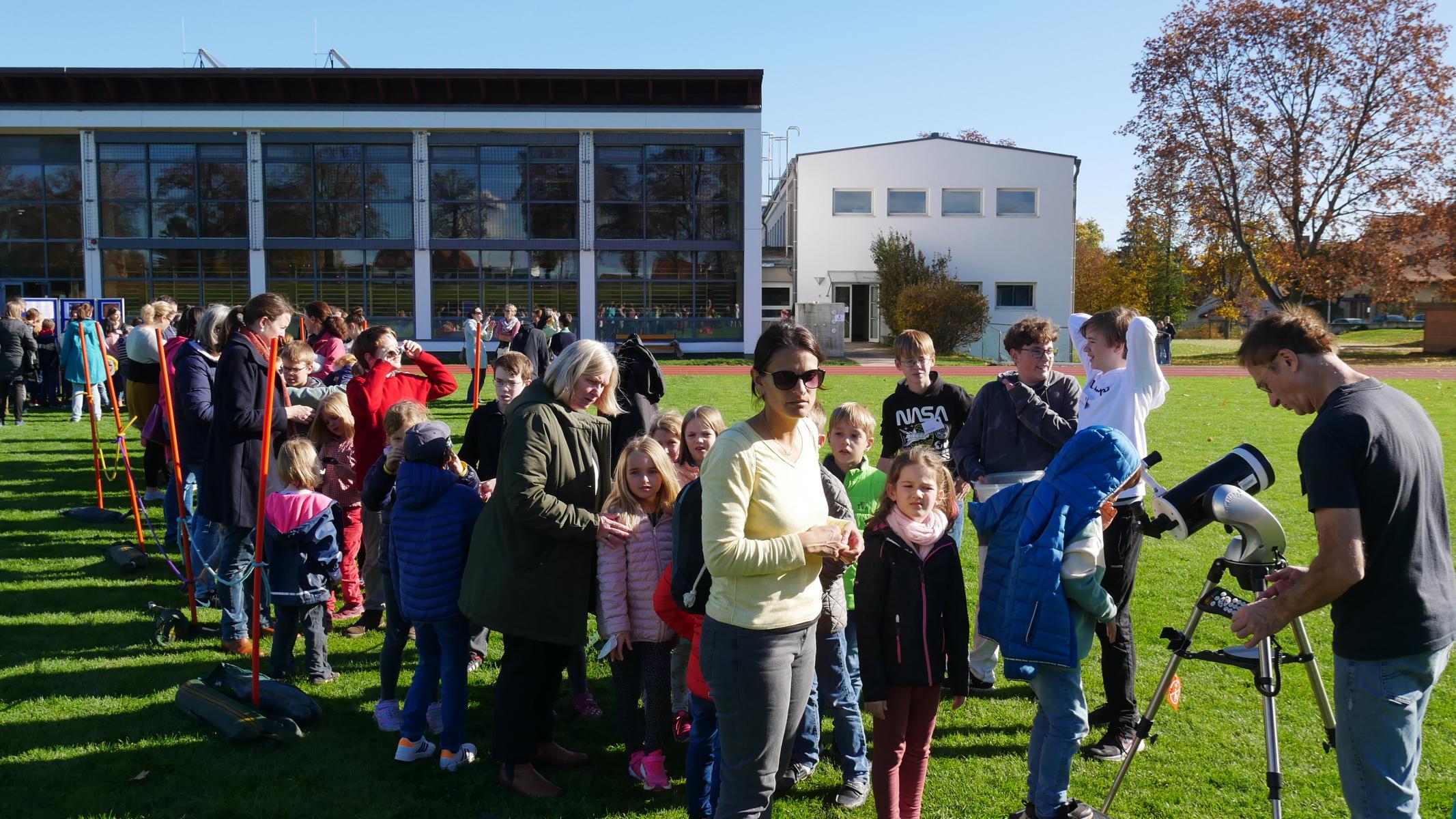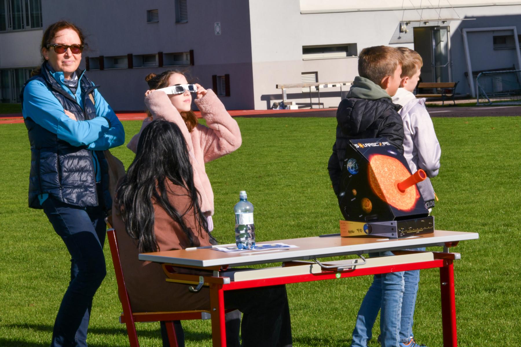 Die Sonnenfinsternisbeobachtung am BG Horn war ein voller Erfolg! 350 interessierte Besucher folgten bei perfektem Beobachtungswetter der Einladung des Gymnasiums, wobei zwei Drittel davon Kinder waren. Obwohl an diesem Tag das Gymnasium schulfrei hatte, meldeten sich 15 Schüler*innen und einige Lehrer*innen freiwillig, die Beobachtung mit Physiklehrerin Manuela Kopper zu organisieren.
