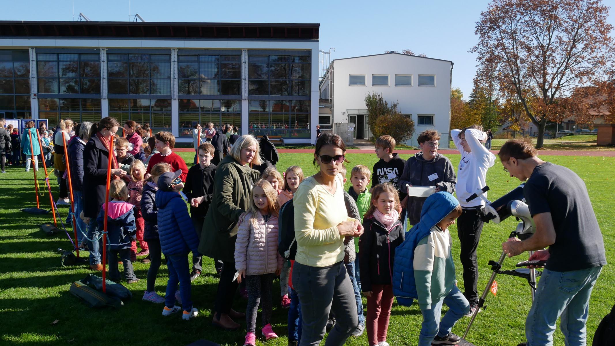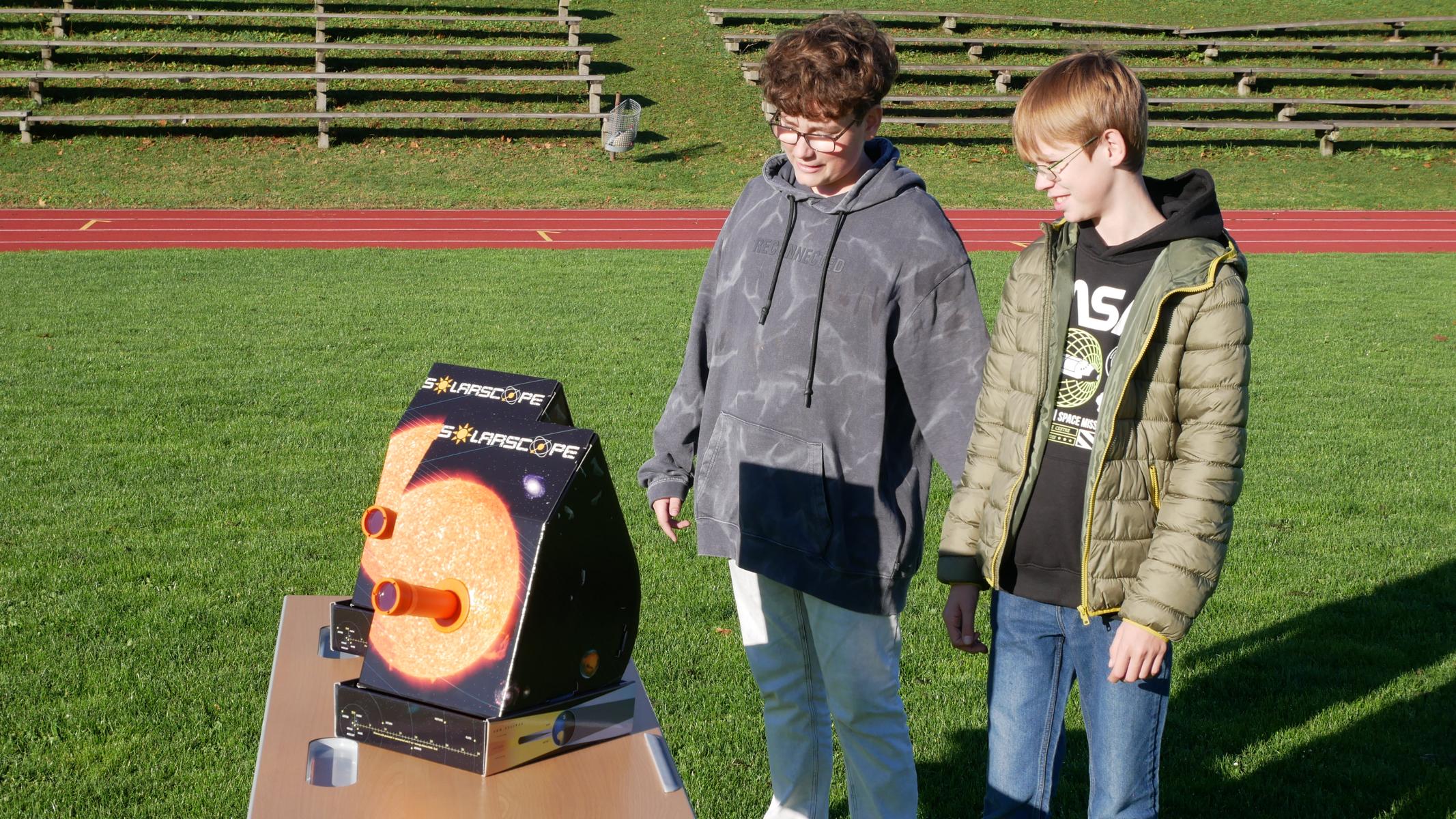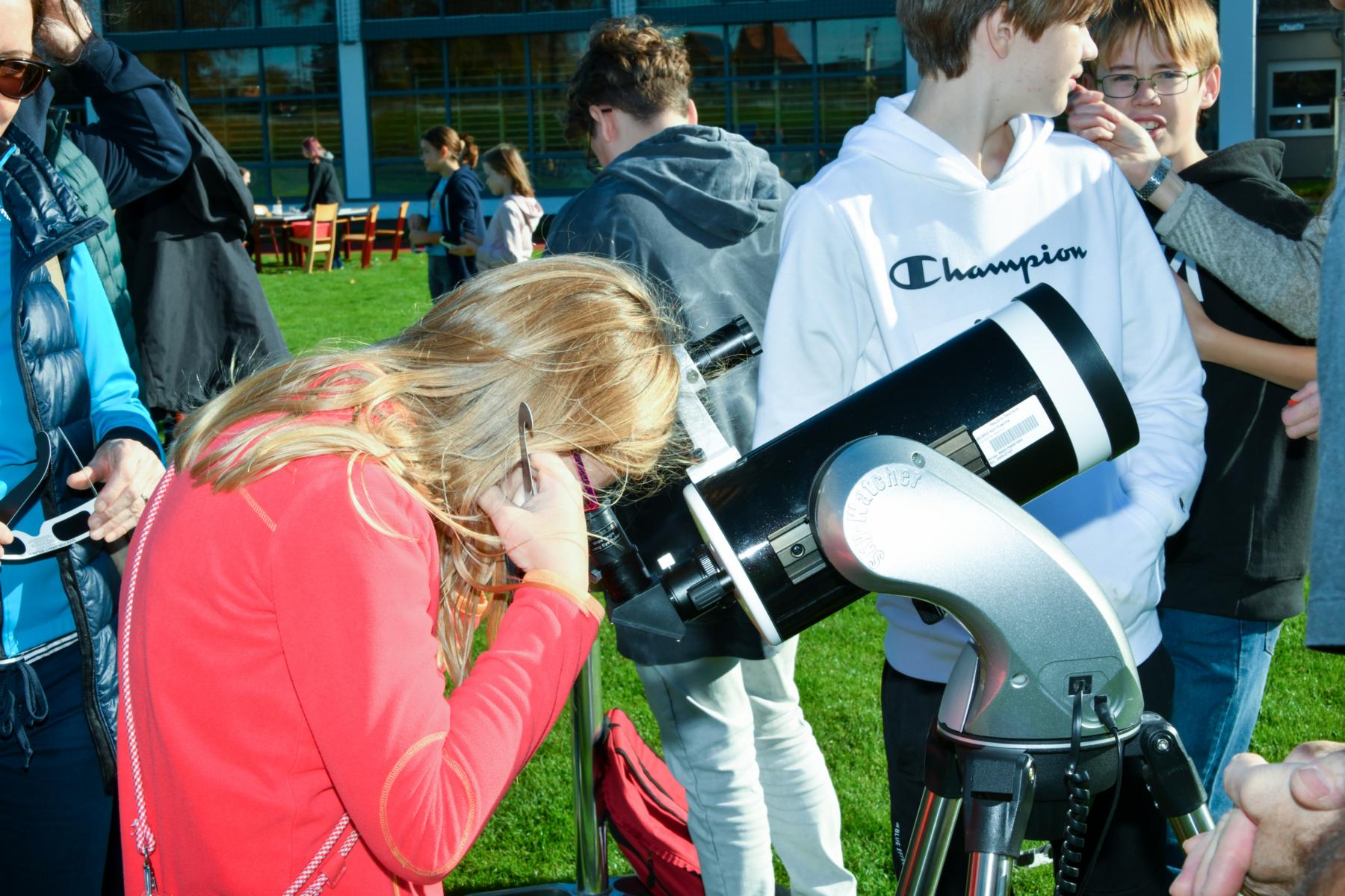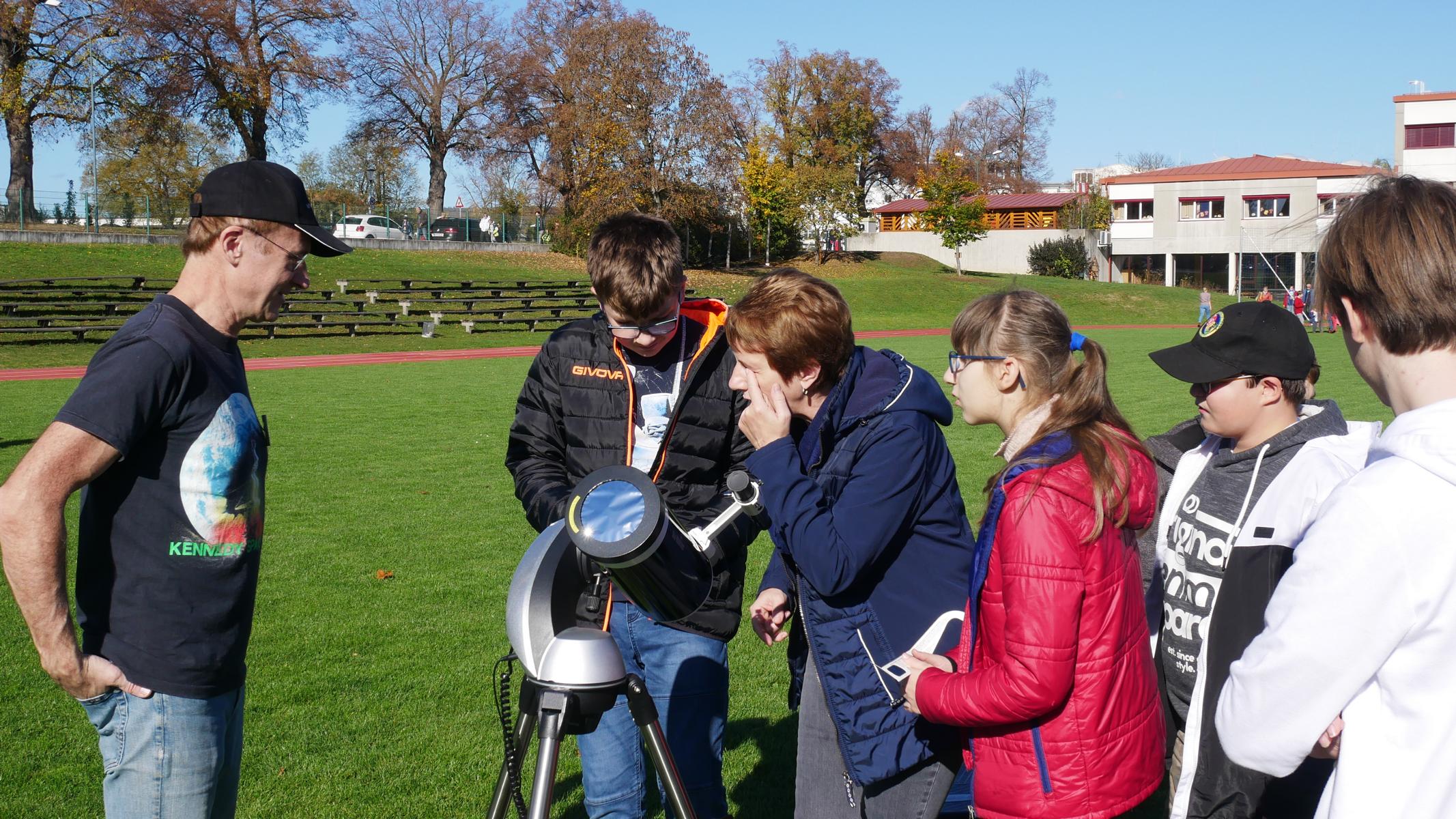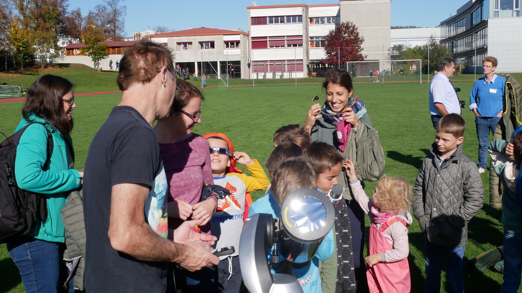 Die Sonnenfinsternisbeobachtung am BG Horn war ein voller Erfolg! 350 interessierte Besucher folgten bei perfektem Beobachtungswetter der Einladung des Gymnasiums, wobei zwei Drittel davon Kinder waren. Obwohl an diesem Tag das Gymnasium schulfrei hatte, meldeten sich 15 Schüler*innen und einige Lehrer*innen freiwillig, die Beobachtung mit Physiklehrerin Manuela Kopper zu organisieren.