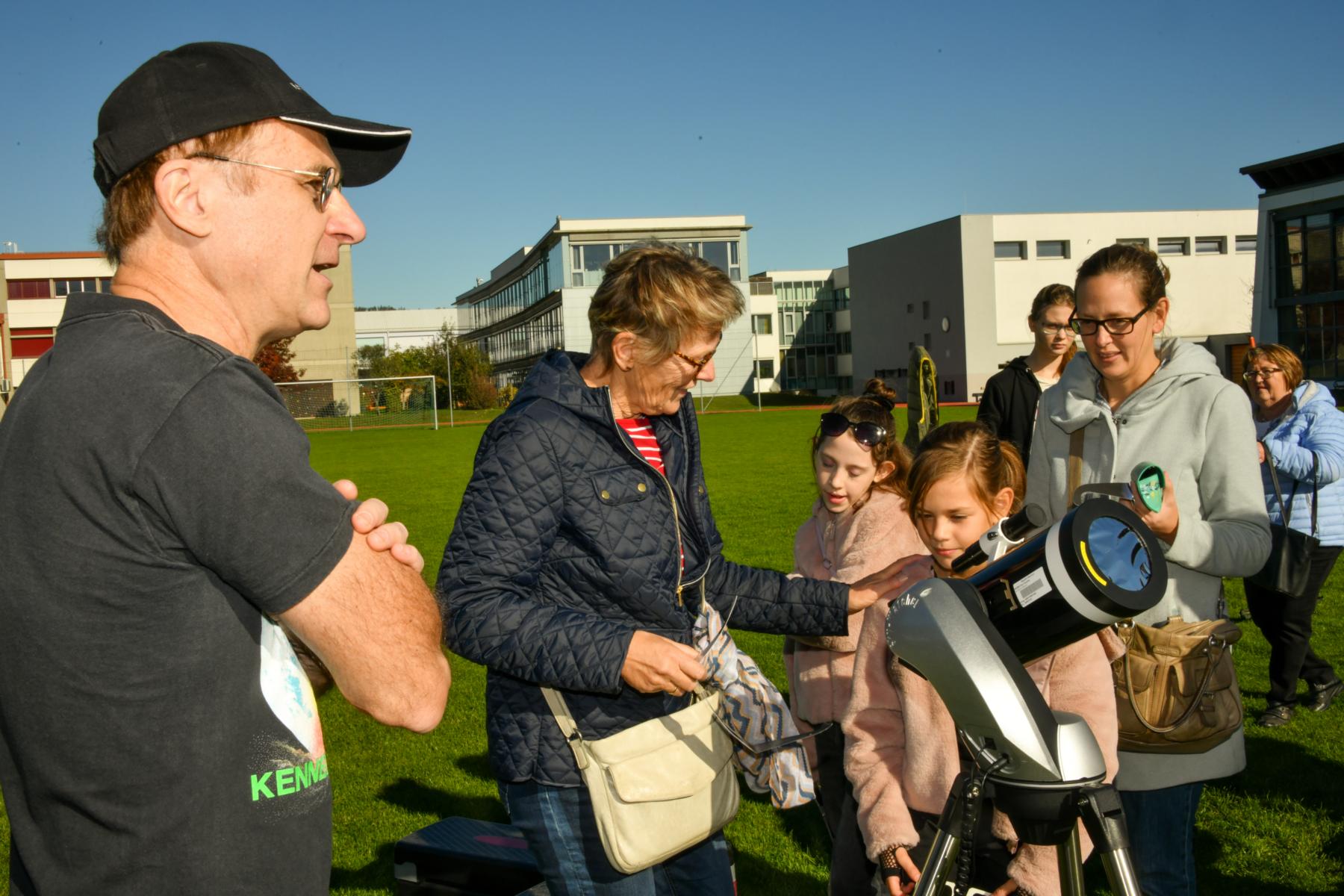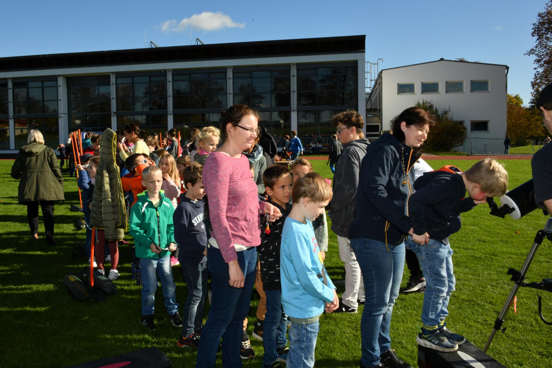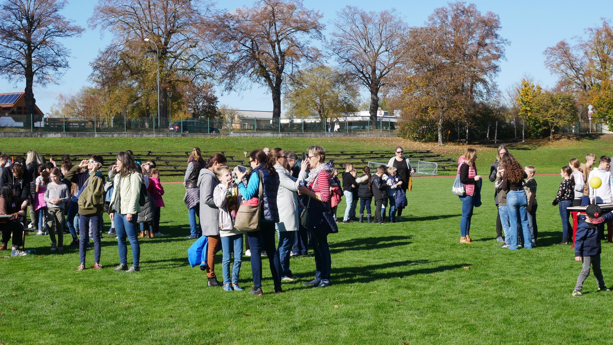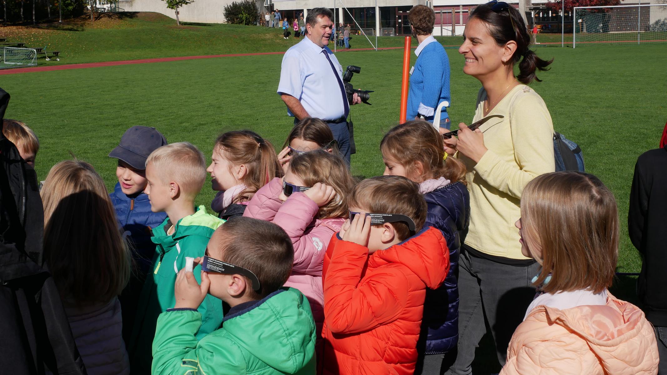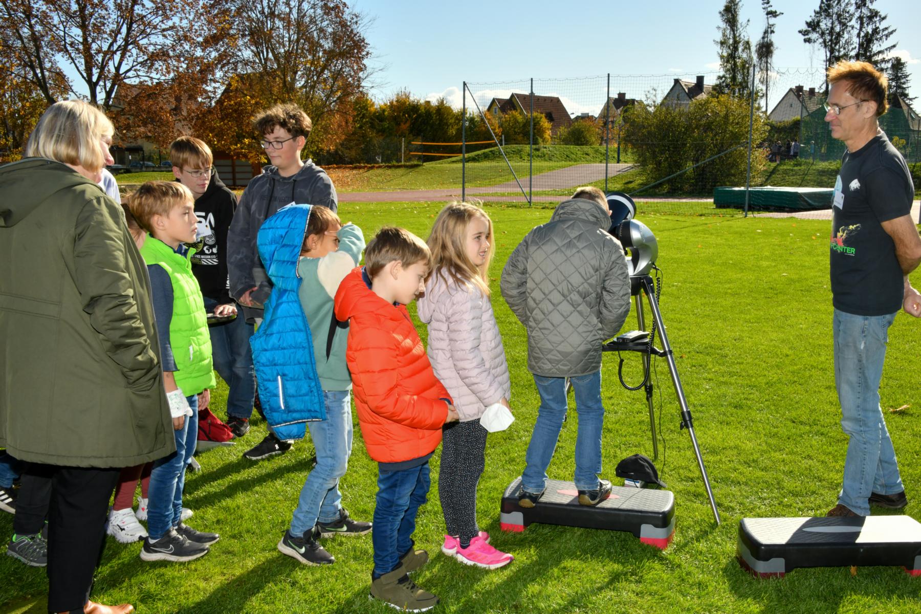 Die Sonnenfinsternisbeobachtung am BG Horn war ein voller Erfolg! 350 interessierte Besucher folgten bei perfektem Beobachtungswetter der Einladung des Gymnasiums, wobei zwei Drittel davon Kinder waren. Obwohl an diesem Tag das Gymnasium schulfrei hatte, meldeten sich 15 Schüler*innen und einige Lehrer*innen freiwillig, die Beobachtung mit Physiklehrerin Manuela Kopper zu organisieren.