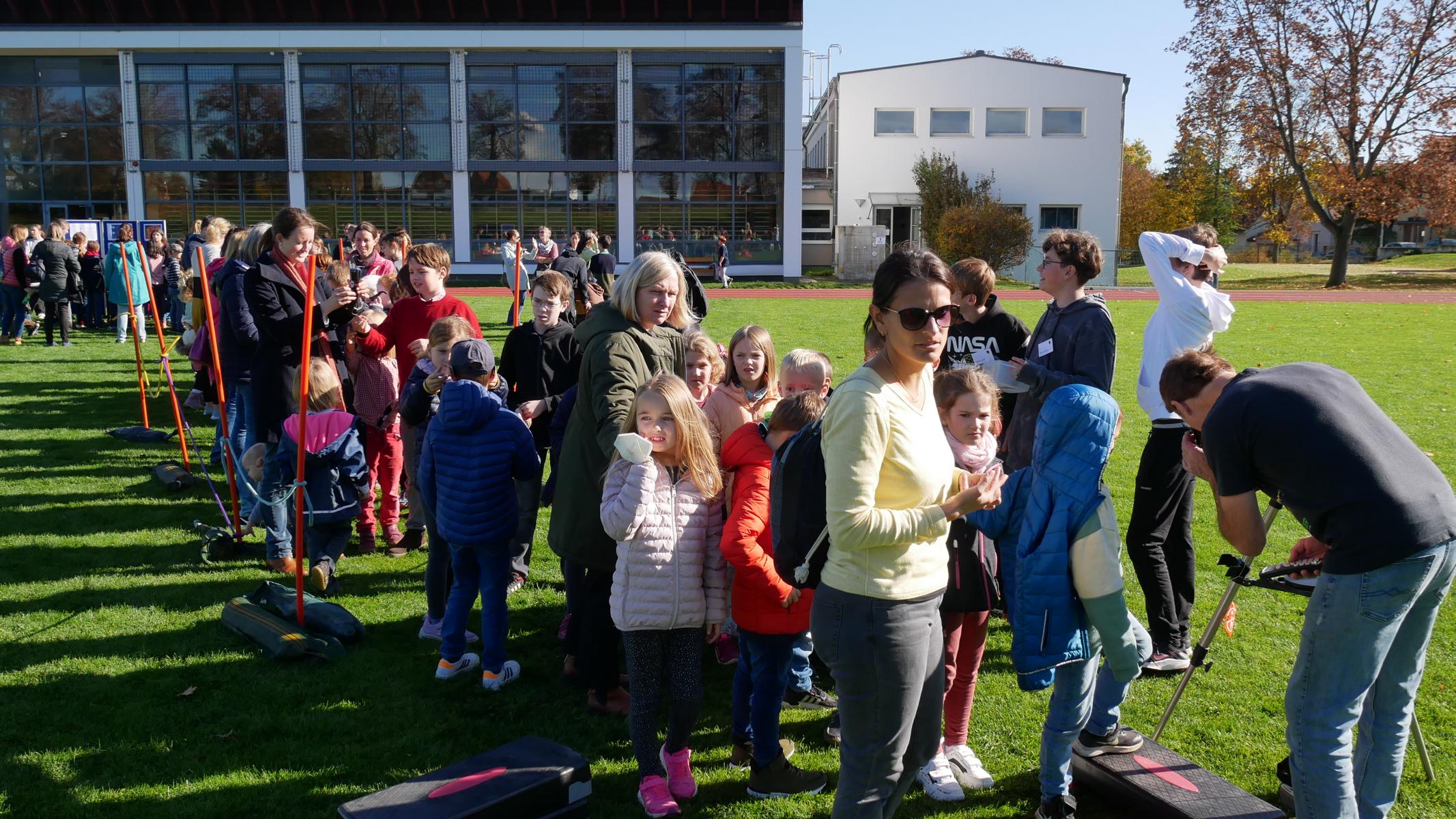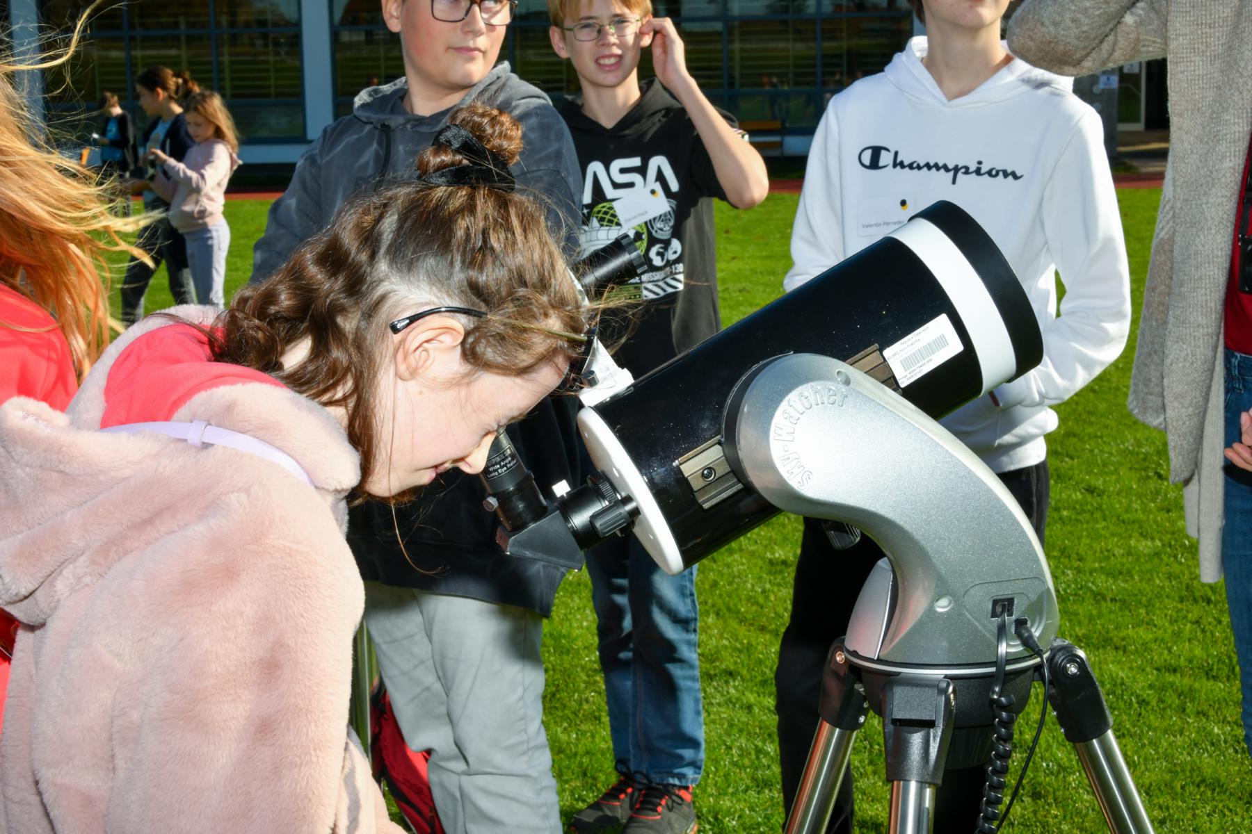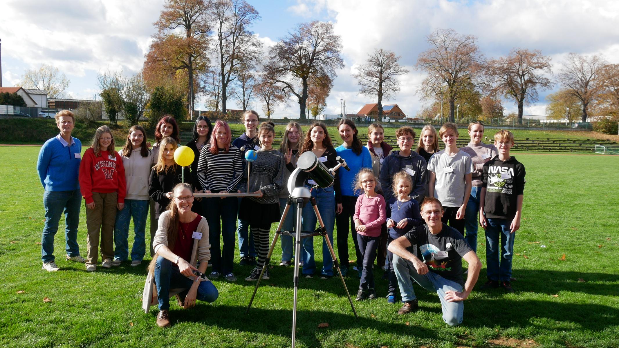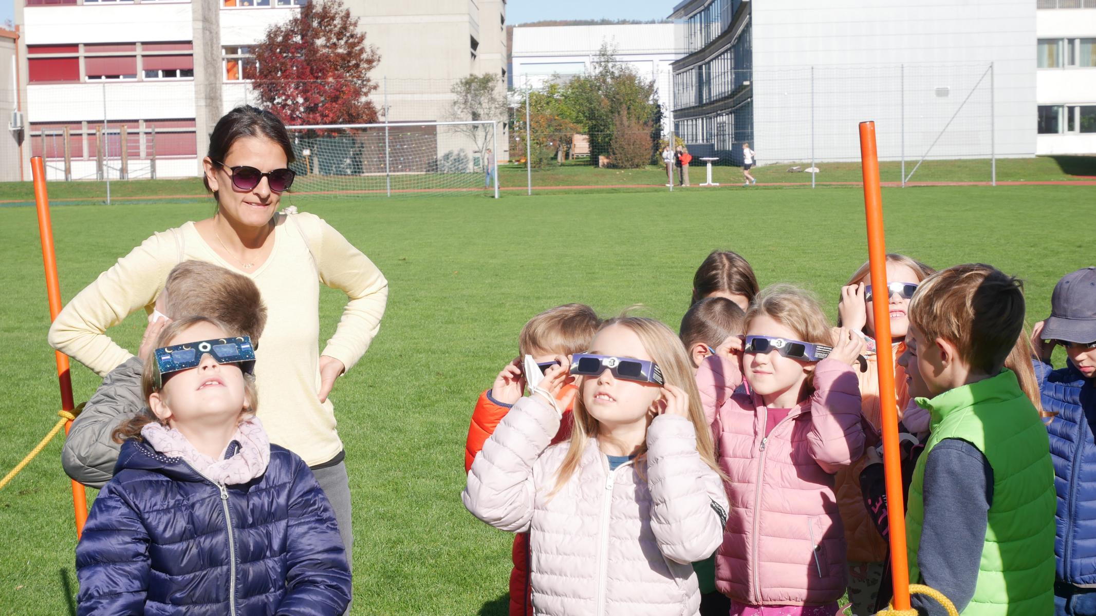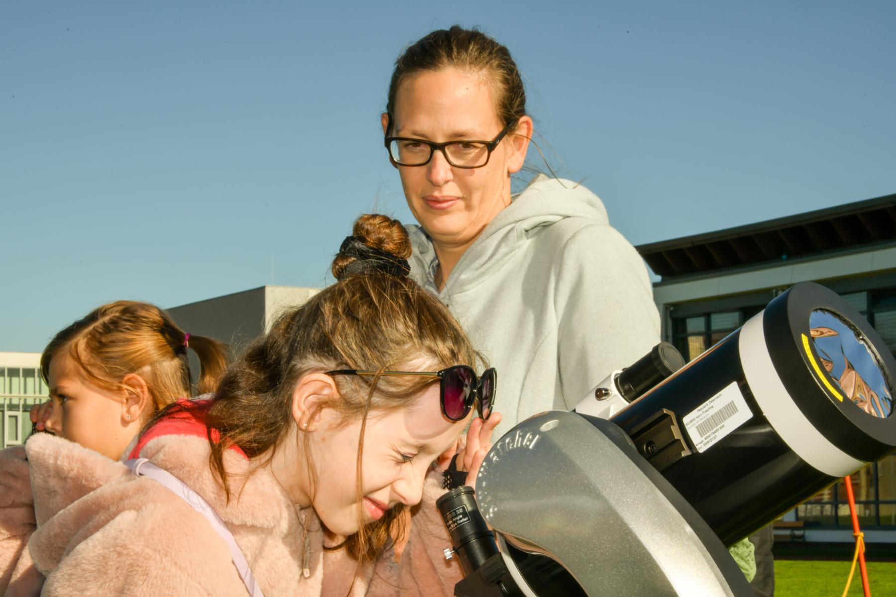 Die Sonnenfinsternisbeobachtung am BG Horn war ein voller Erfolg! 350 interessierte Besucher folgten bei perfektem Beobachtungswetter der Einladung des Gymnasiums, wobei zwei Drittel davon Kinder waren. Obwohl an diesem Tag das Gymnasium schulfrei hatte, meldeten sich 15 Schüler*innen und einige Lehrer*innen freiwillig, die Beobachtung mit Physiklehrerin Manuela Kopper zu organisieren.