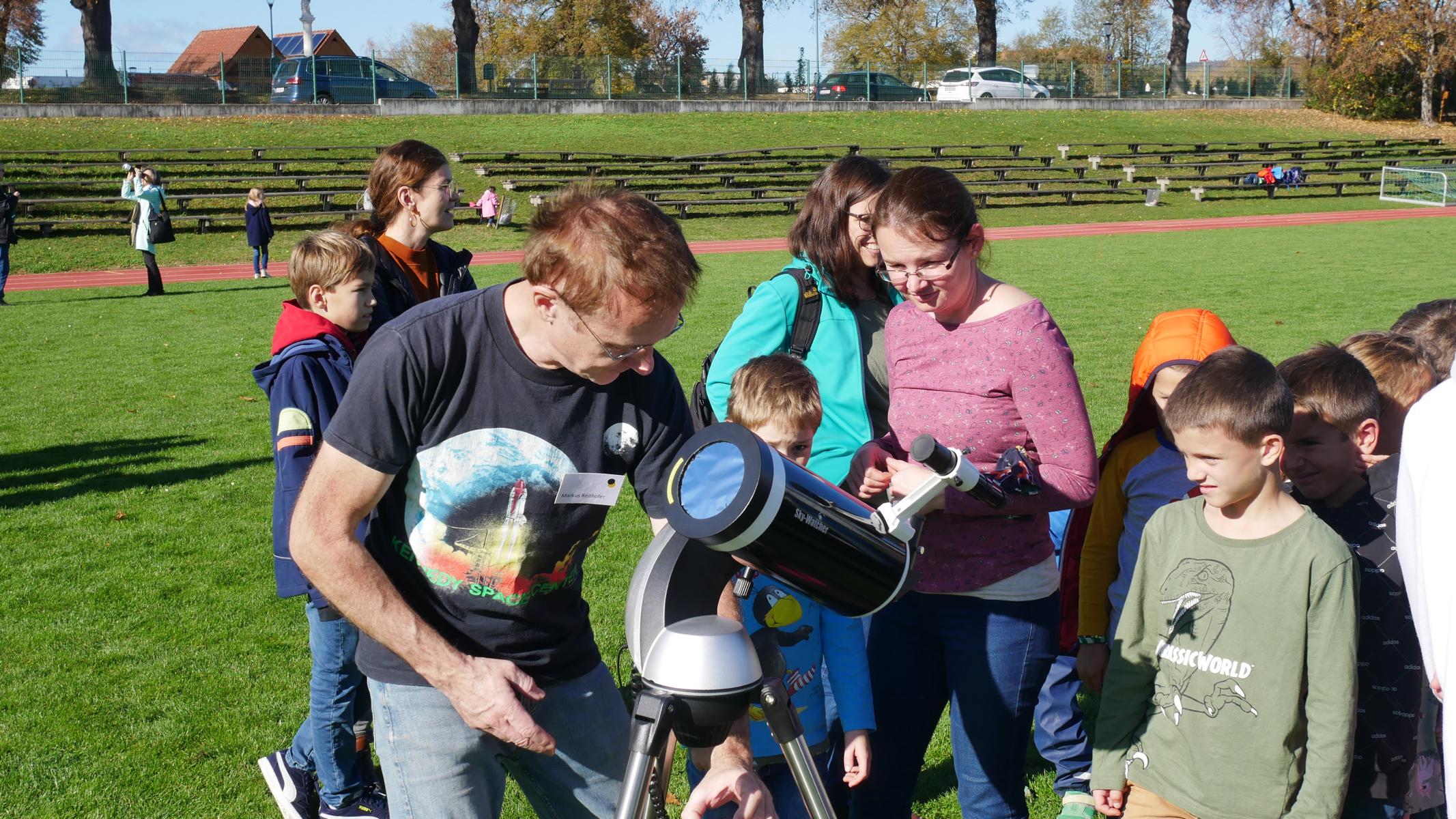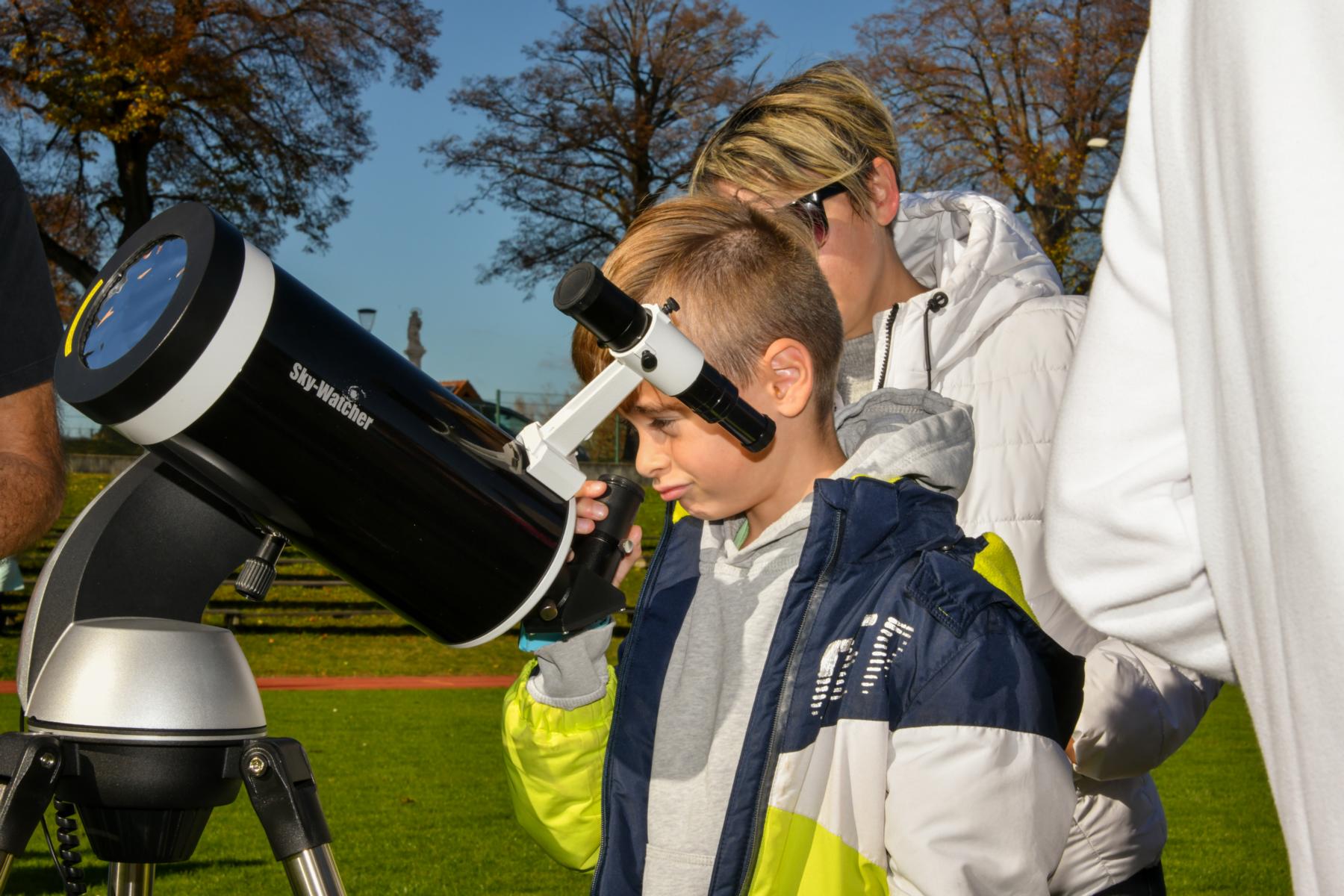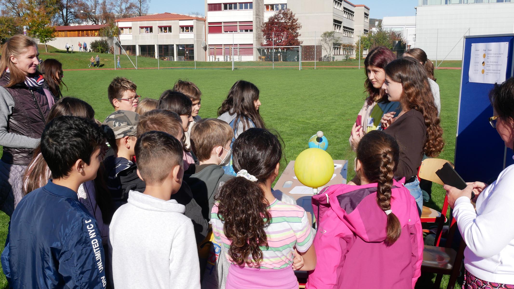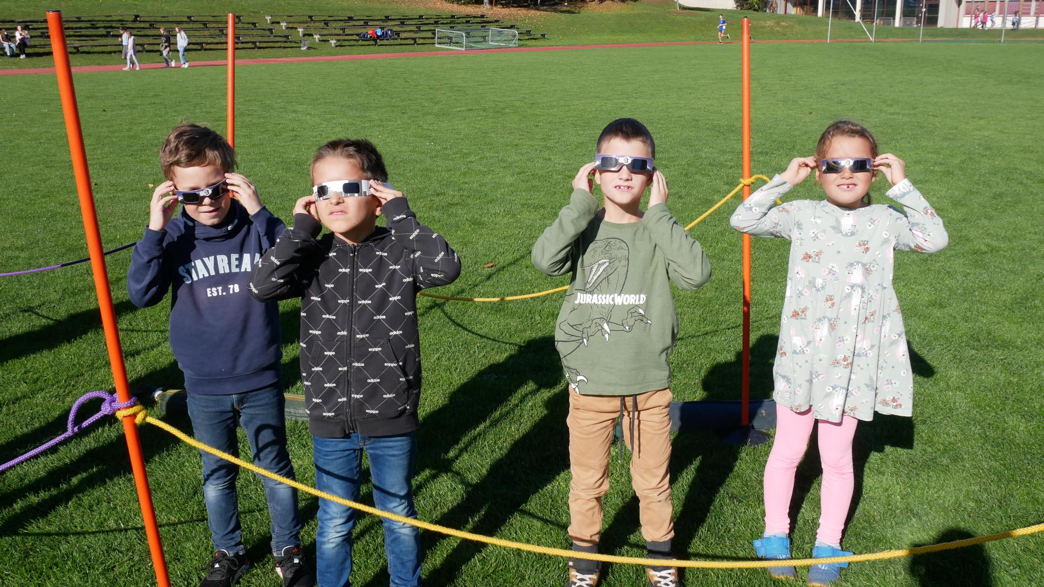 Die Sonnenfinsternisbeobachtung am BG Horn war ein voller Erfolg! 350 interessierte Besucher folgten bei perfektem Beobachtungswetter der Einladung des Gymnasiums, wobei zwei Drittel davon Kinder waren. Obwohl an diesem Tag das Gymnasium schulfrei hatte, meldeten sich 15 Schüler*innen und einige Lehrer*innen freiwillig, die Beobachtung mit Physiklehrerin Manuela Kopper zu organisieren.
