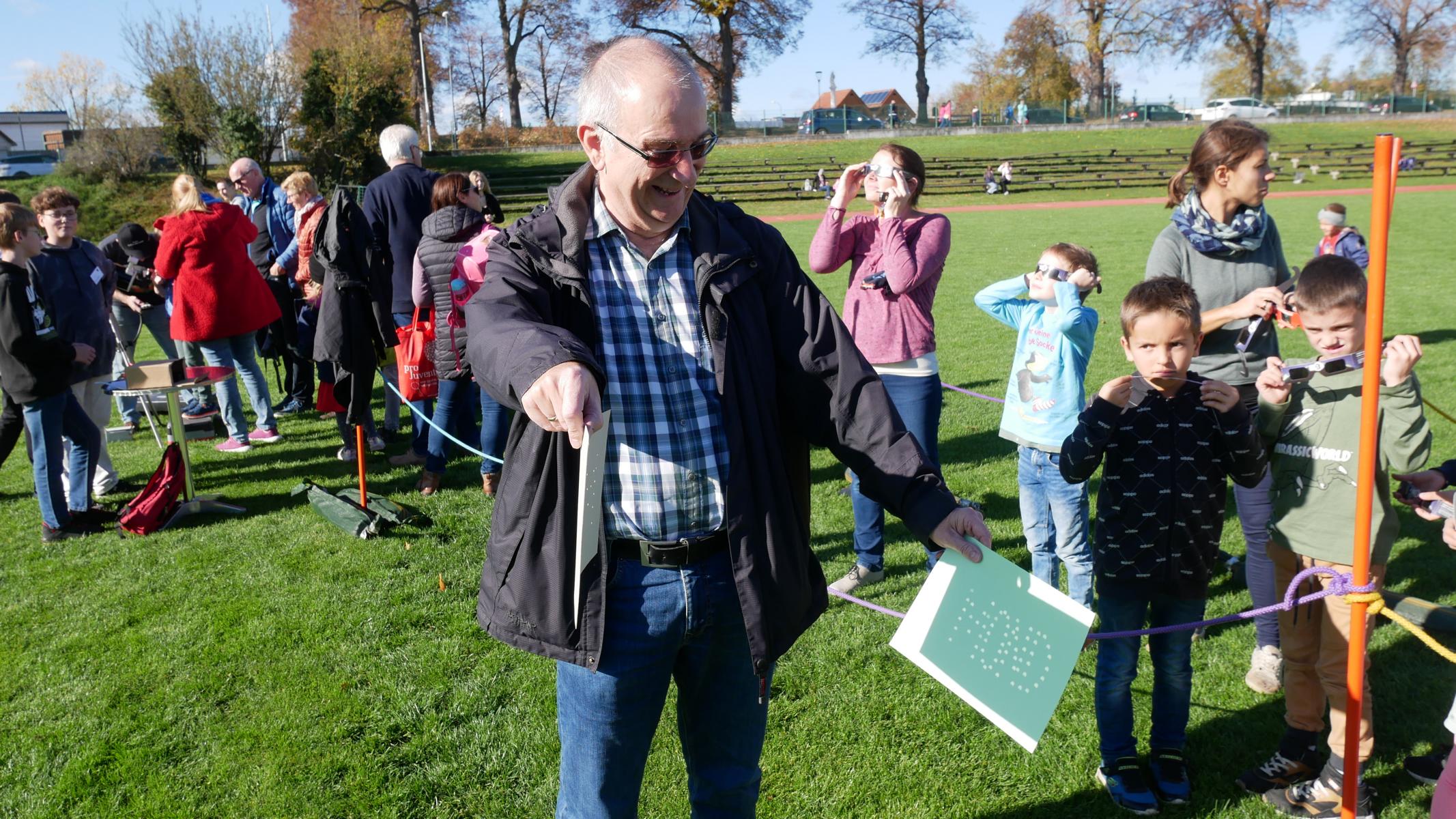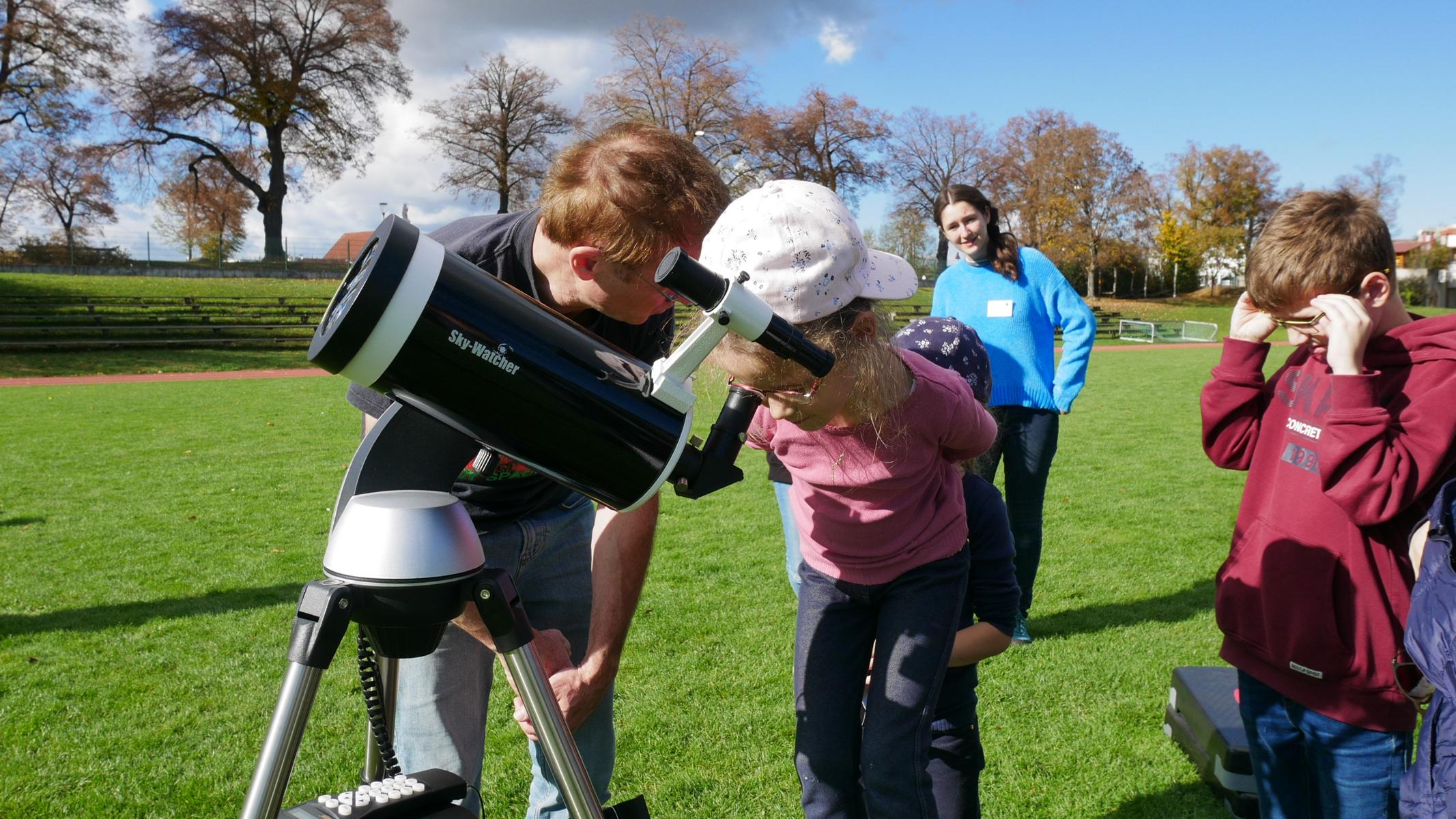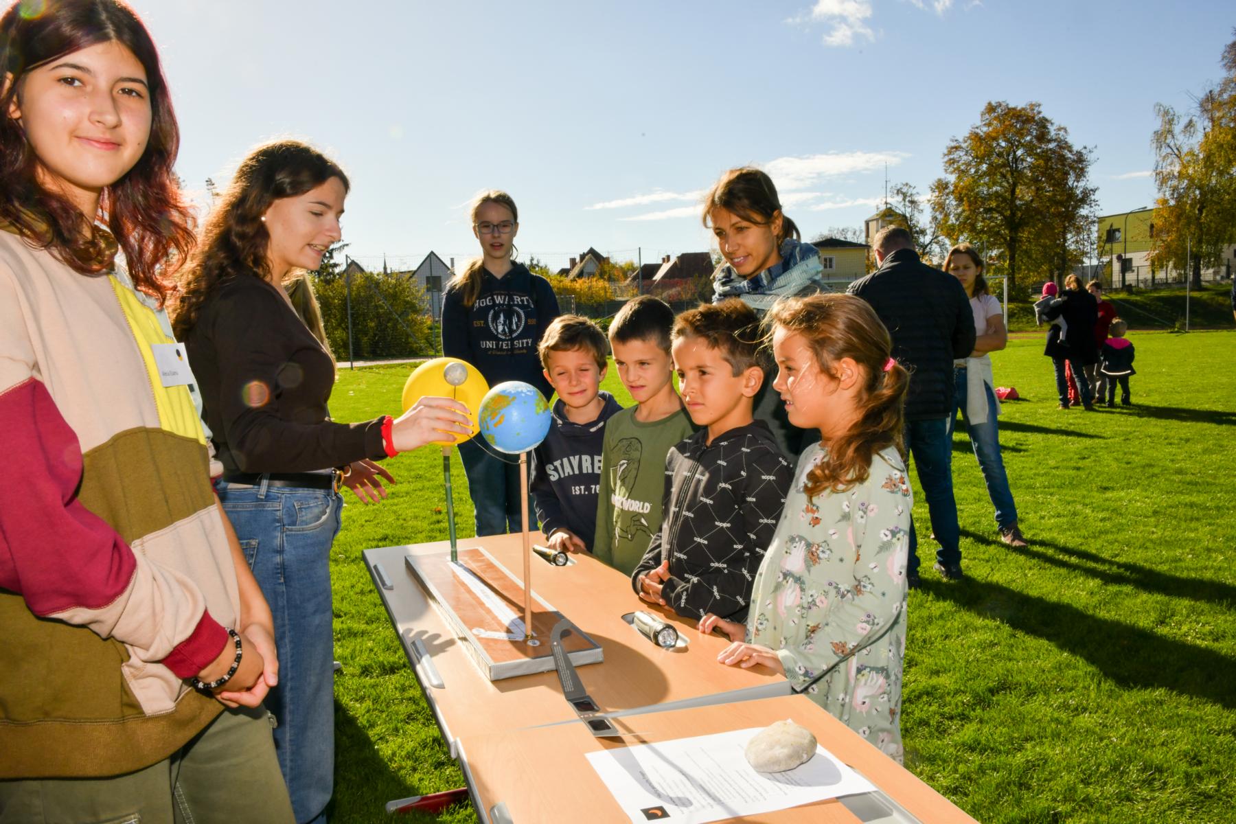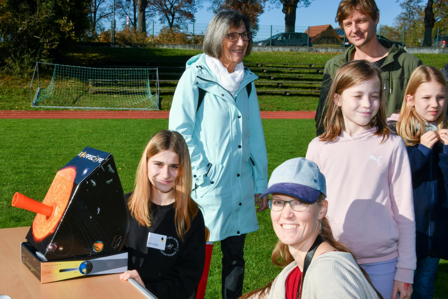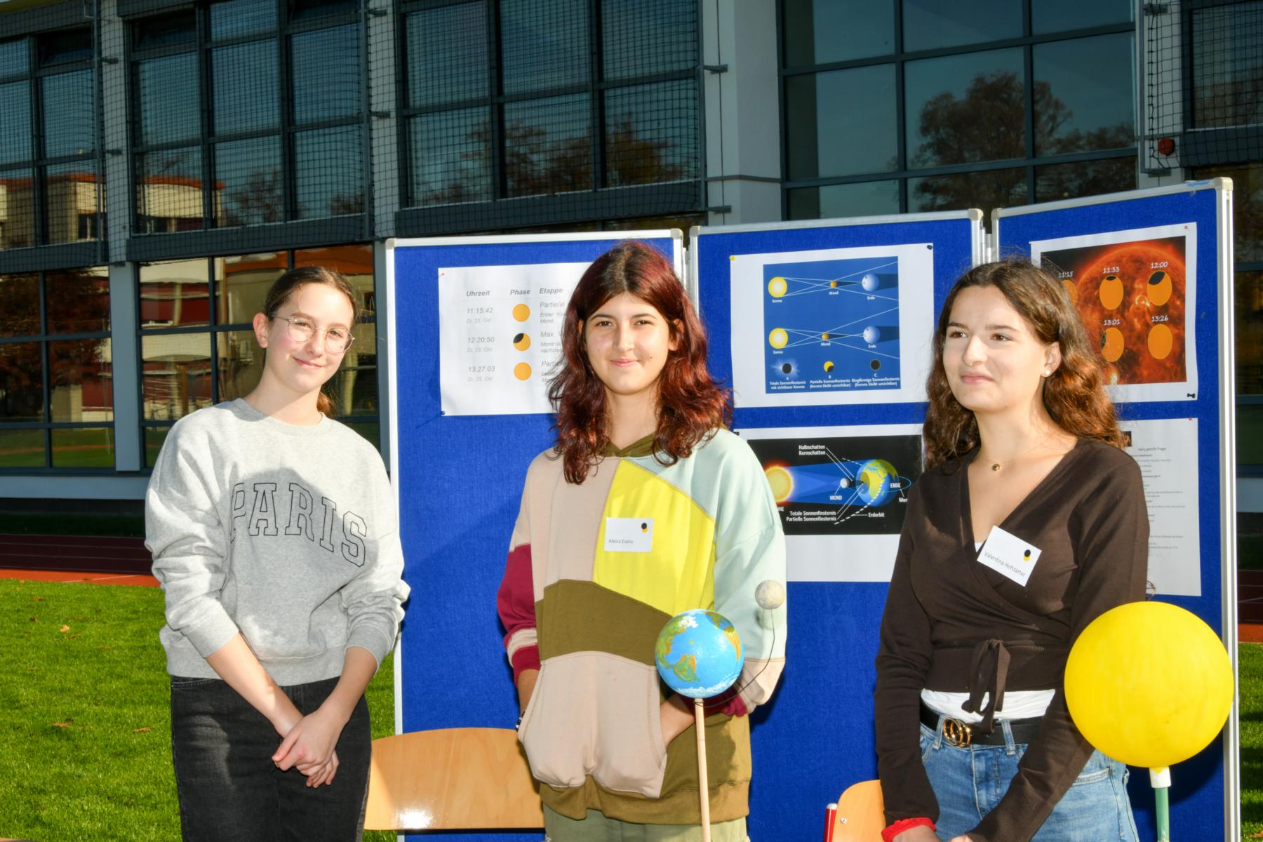 Die Sonnenfinsternisbeobachtung am BG Horn war ein voller Erfolg! 350 interessierte Besucher folgten bei perfektem Beobachtungswetter der Einladung des Gymnasiums, wobei zwei Drittel davon Kinder waren. Obwohl an diesem Tag das Gymnasium schulfrei hatte, meldeten sich 15 Schüler*innen und einige Lehrer*innen freiwillig, die Beobachtung mit Physiklehrerin Manuela Kopper zu organisieren.