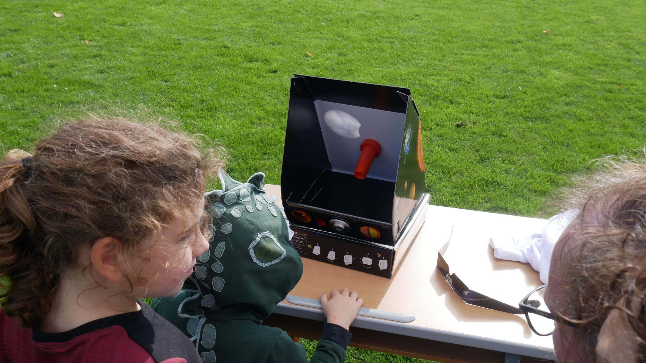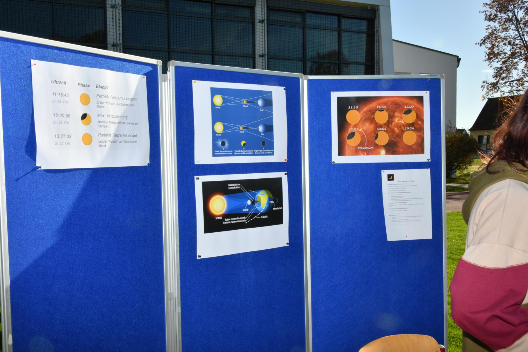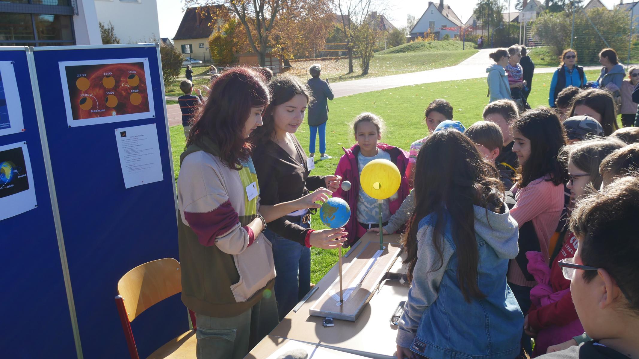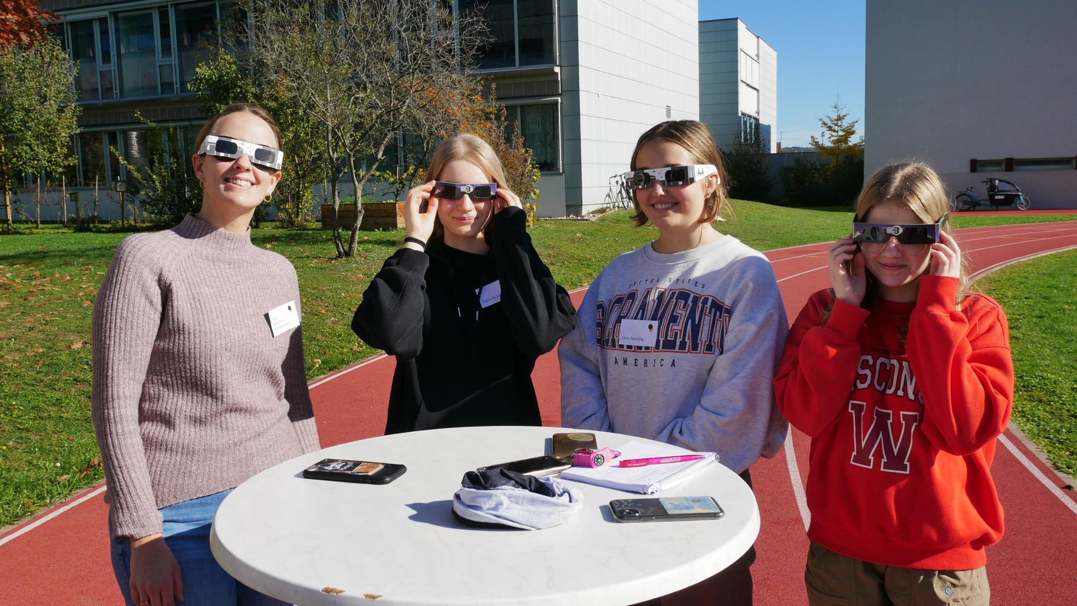 Beobachtet wurde mit dem Schulteleskop des Gymnasiums, zwei Solarscopes und vielen Sonnenfinsternisbrillen, die immer wieder eingesammelt und an die nächsten Besucher ausgeteilt wurden. Außerdem gabs einen „Erklärtisch“, an dem Schülerinnen anhand eines Modells erklärten, wie eine Sonnenfinsternis zustande kommt. Vor allem für die Jüngsten war der Maltisch ein Highlight, bei denen sie geschminkt wurden und von zwei Schülerinnen des BG Horn entworfene Ausmalbilder bemalen durften.