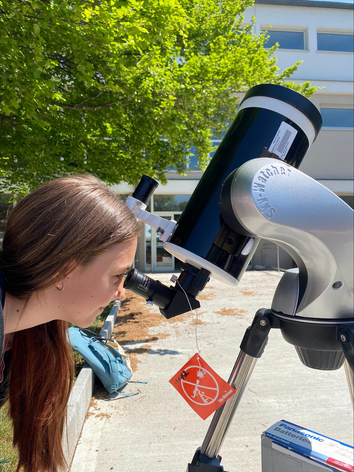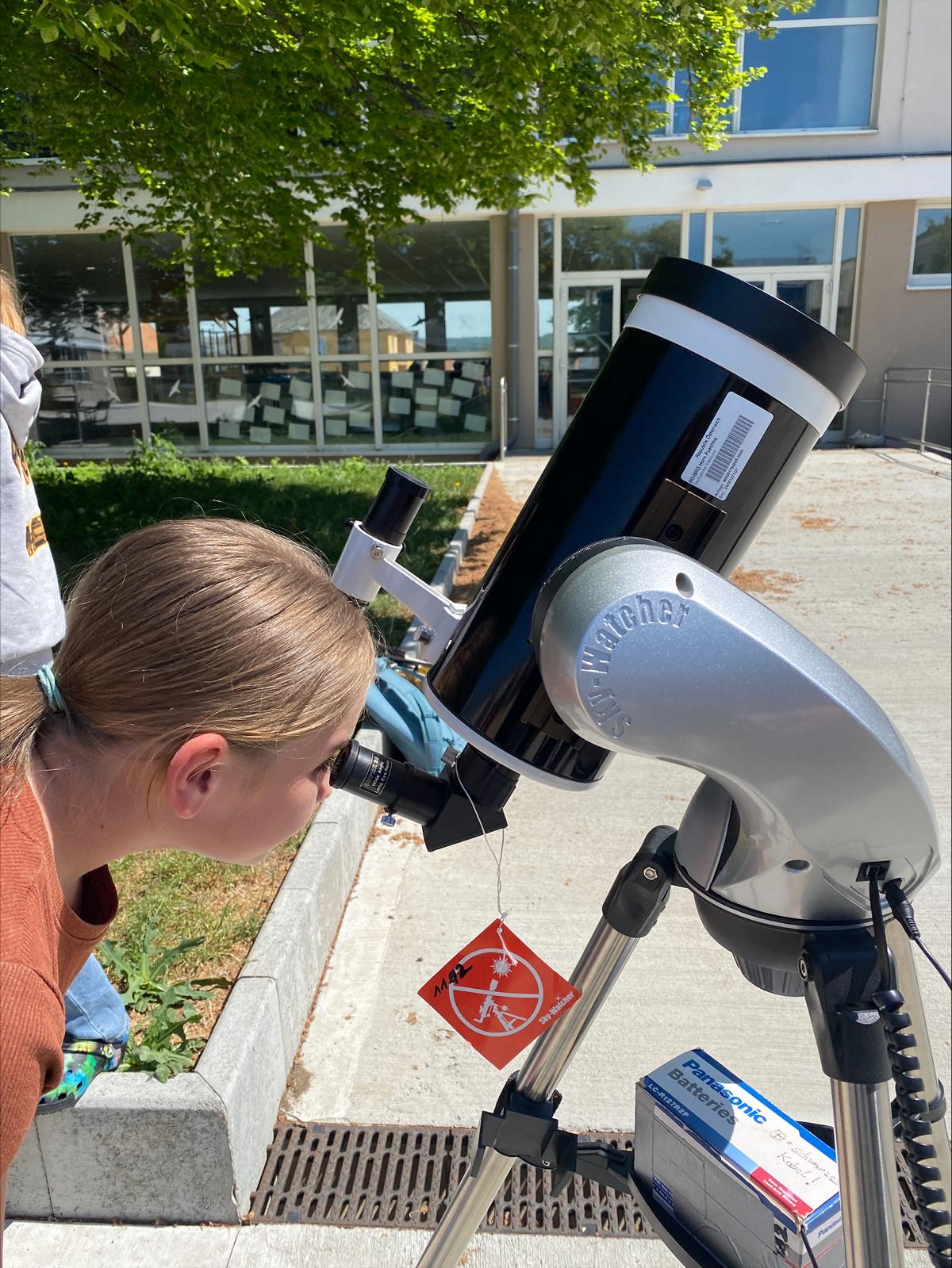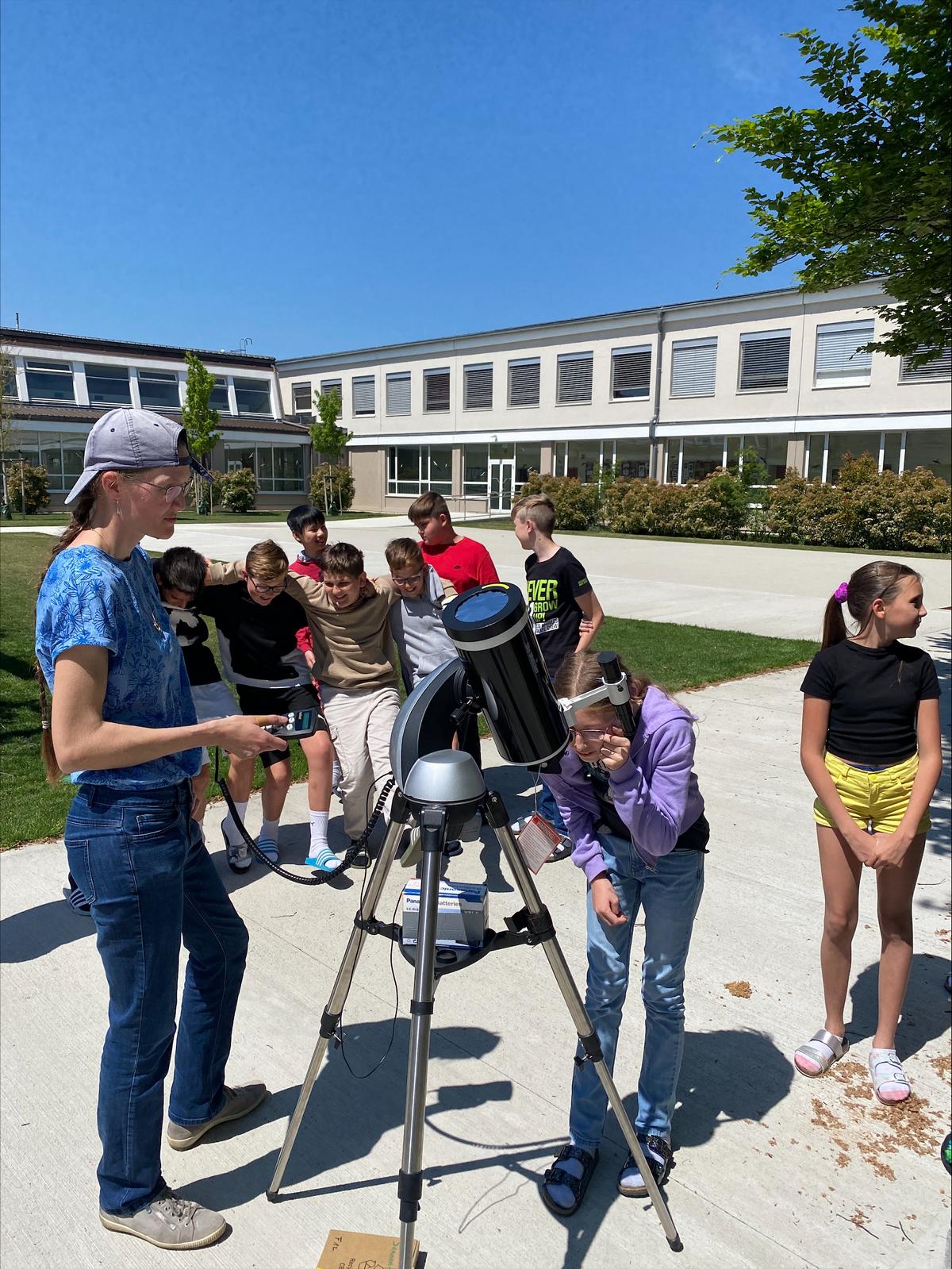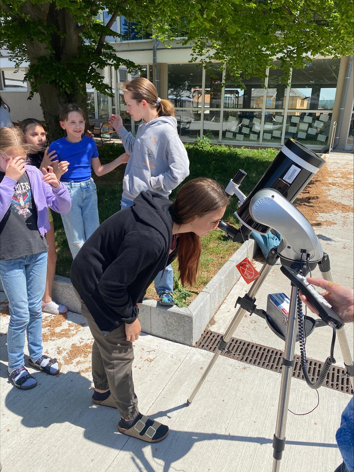 Vor einigen Tagen konnten viele Menschen in Österreich Polarlichter beobachten. Das liegt an der zurzeit verstärkten Aktivität der Sonne, die alle elf Jahre besonders viele Sonnenstürme aussendet. Auch viele unserer Schüler kamen mit wunderschönen Fotos der beobachteten Polarlichter in den Unterricht um sie den Lehrer:innen zu zeigen. Da lag es nahe, auch unser Schulteleskop im Hof aufzustellen und den Jugendlichen zu zeigen, wo die Sonnenstürme entstehen. In den Phasen erhöhter Aktivität sind nämlich auf der Sonne besonders viele Sonnenflecken zu sehen. An diesen Stellen ist die Sonne kühler, was sich in der dunkleren Färbung zeigt.